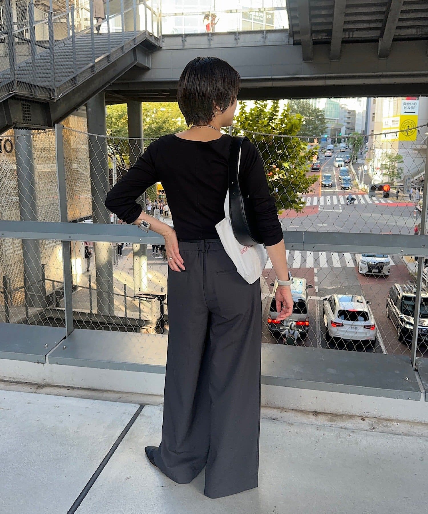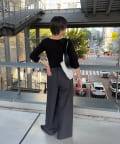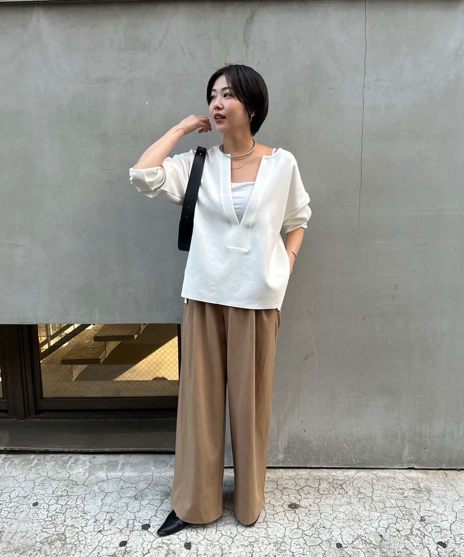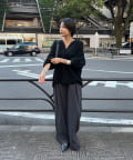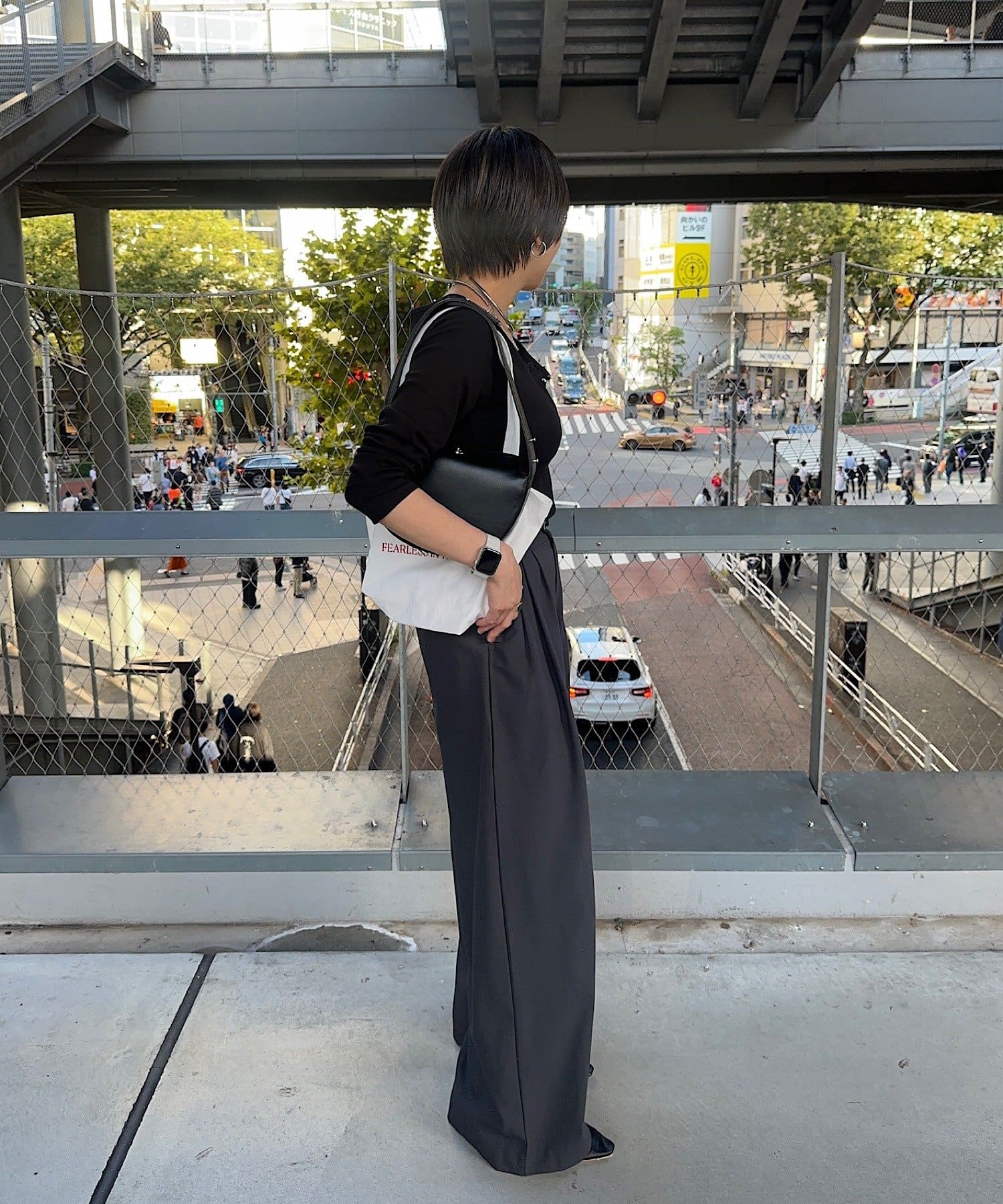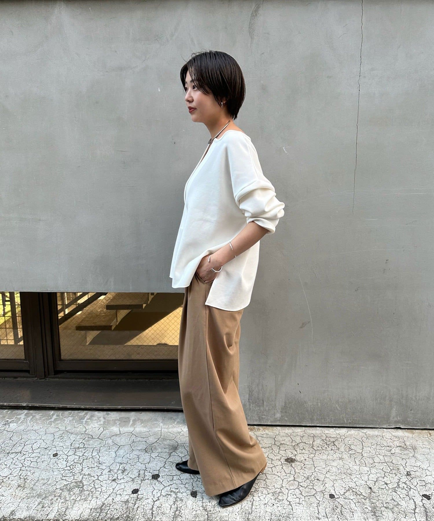 上品な落ち感の素材は腰回りをすっきりと、さらに全体のシルエットを綺麗に見せてくれます。