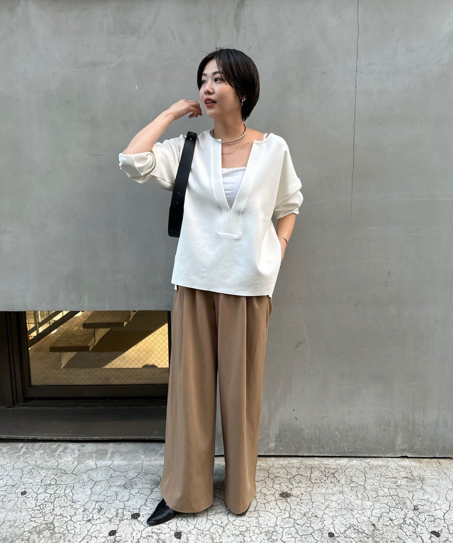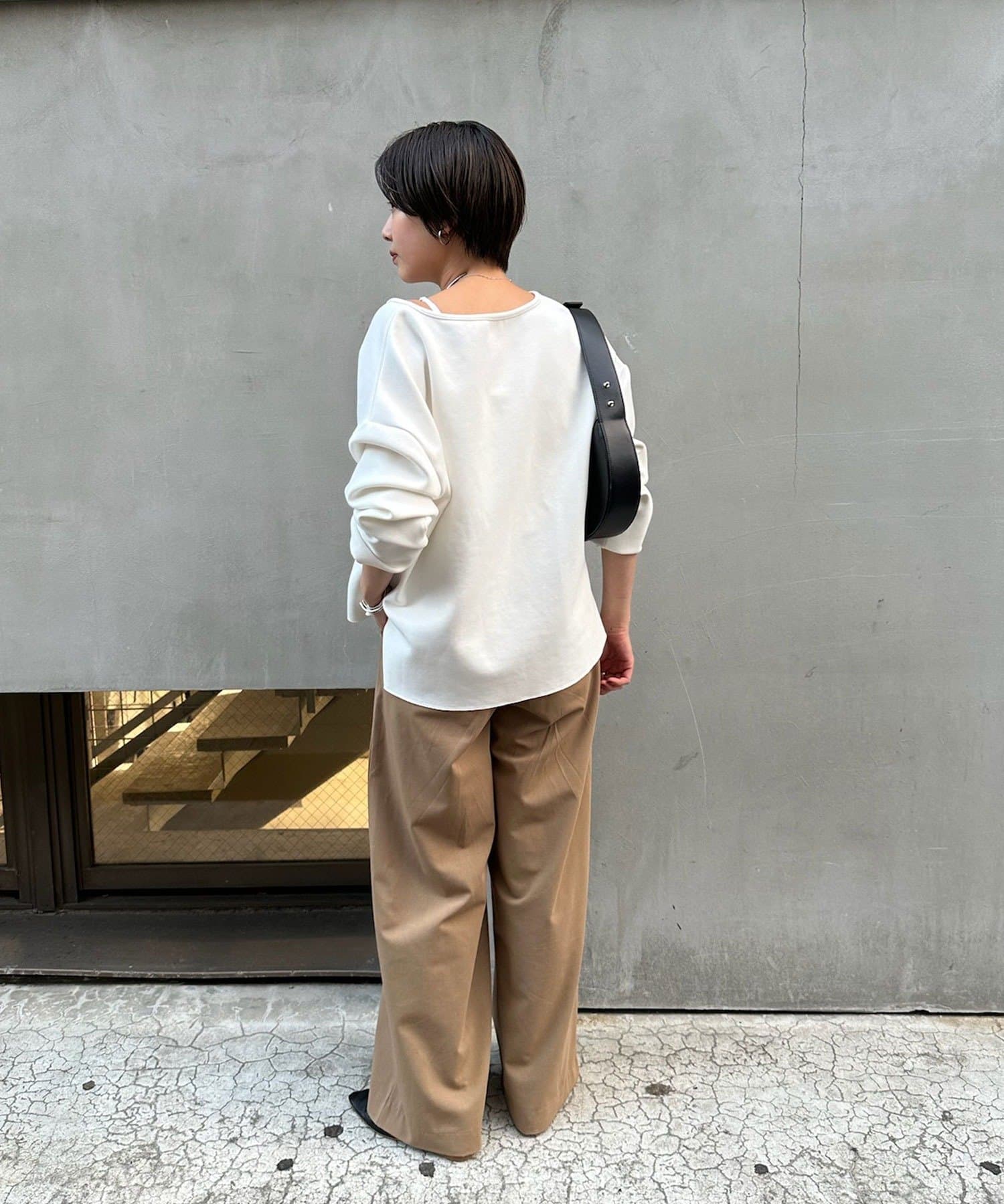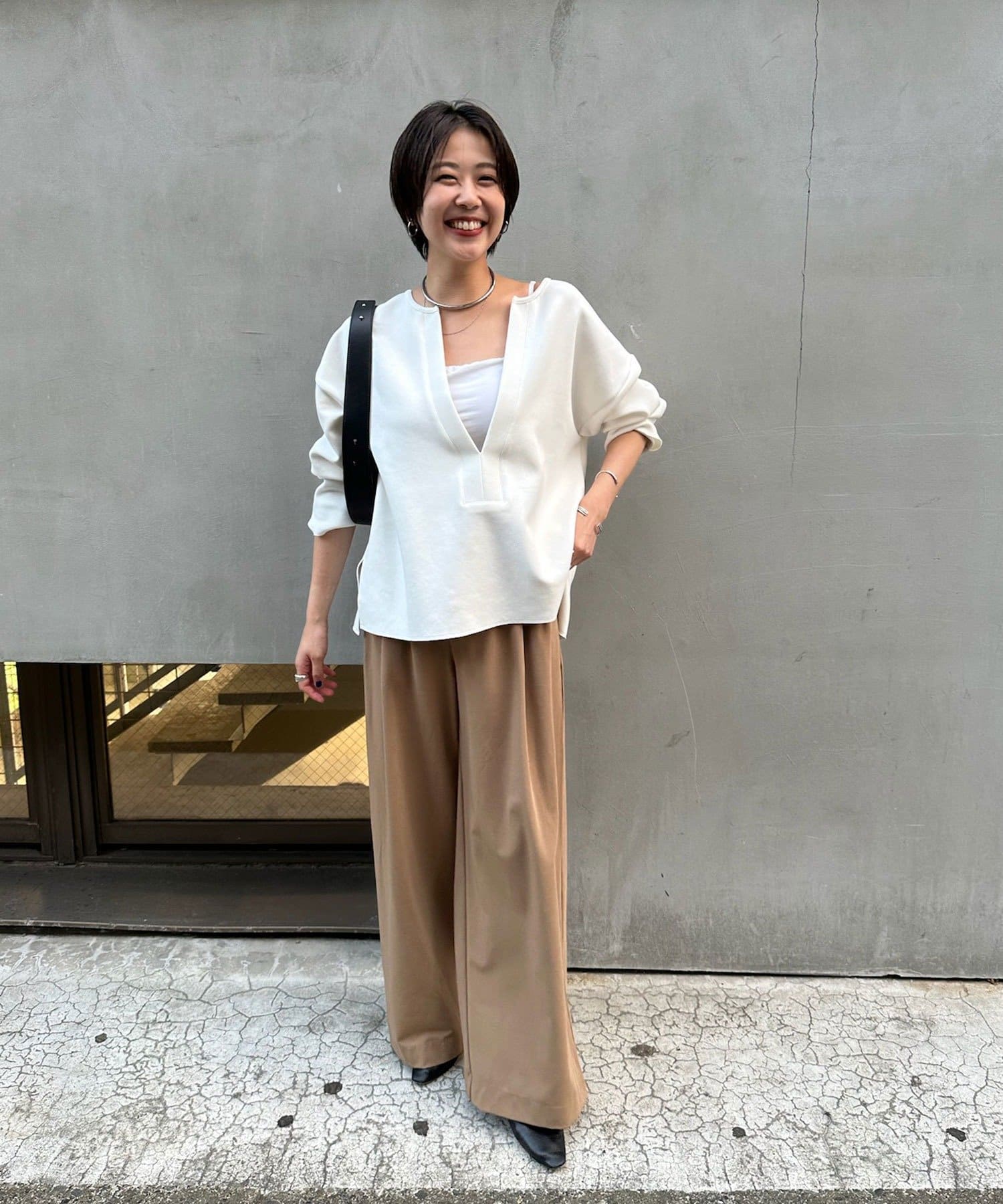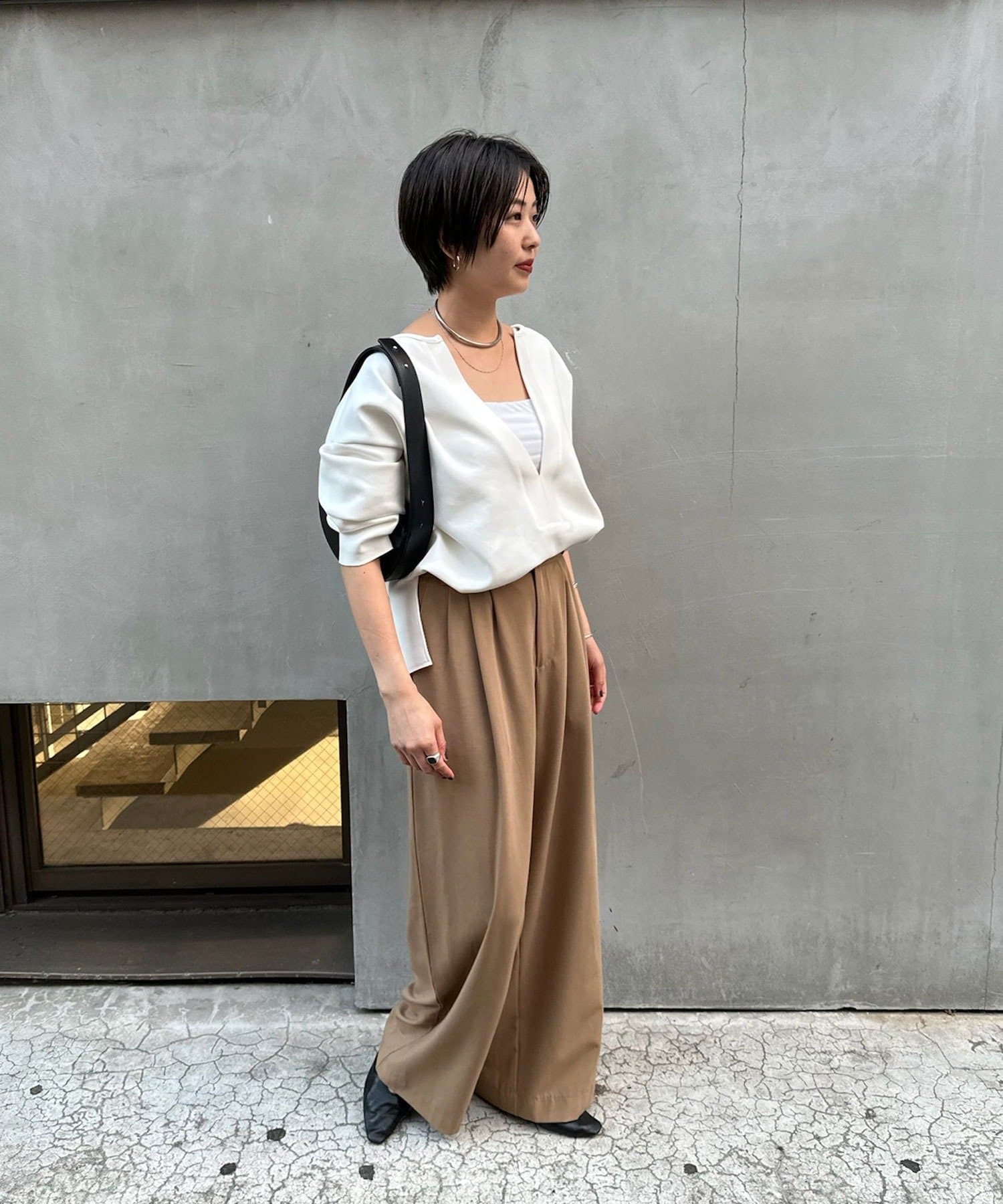 上品な落ち感の素材は腰回りをすっきりと、さらに全体のシルエットを綺麗に見せてくれます。