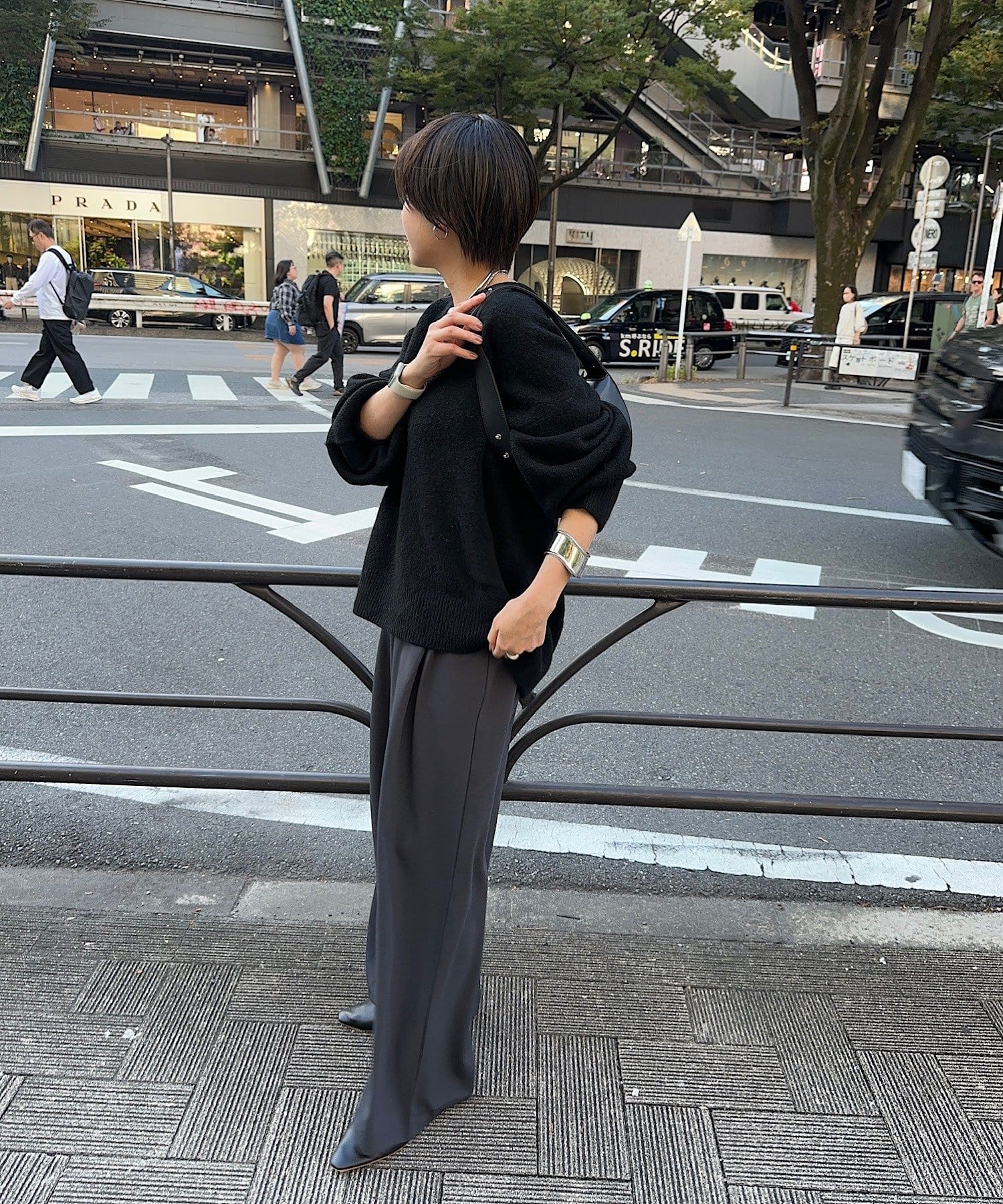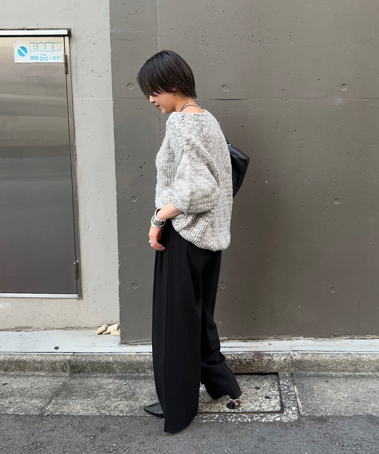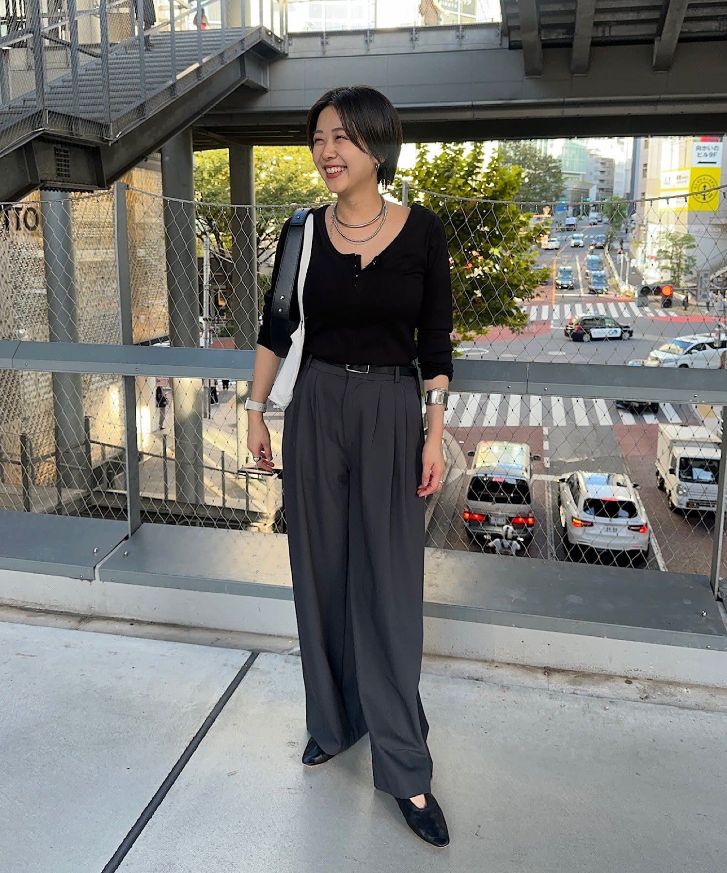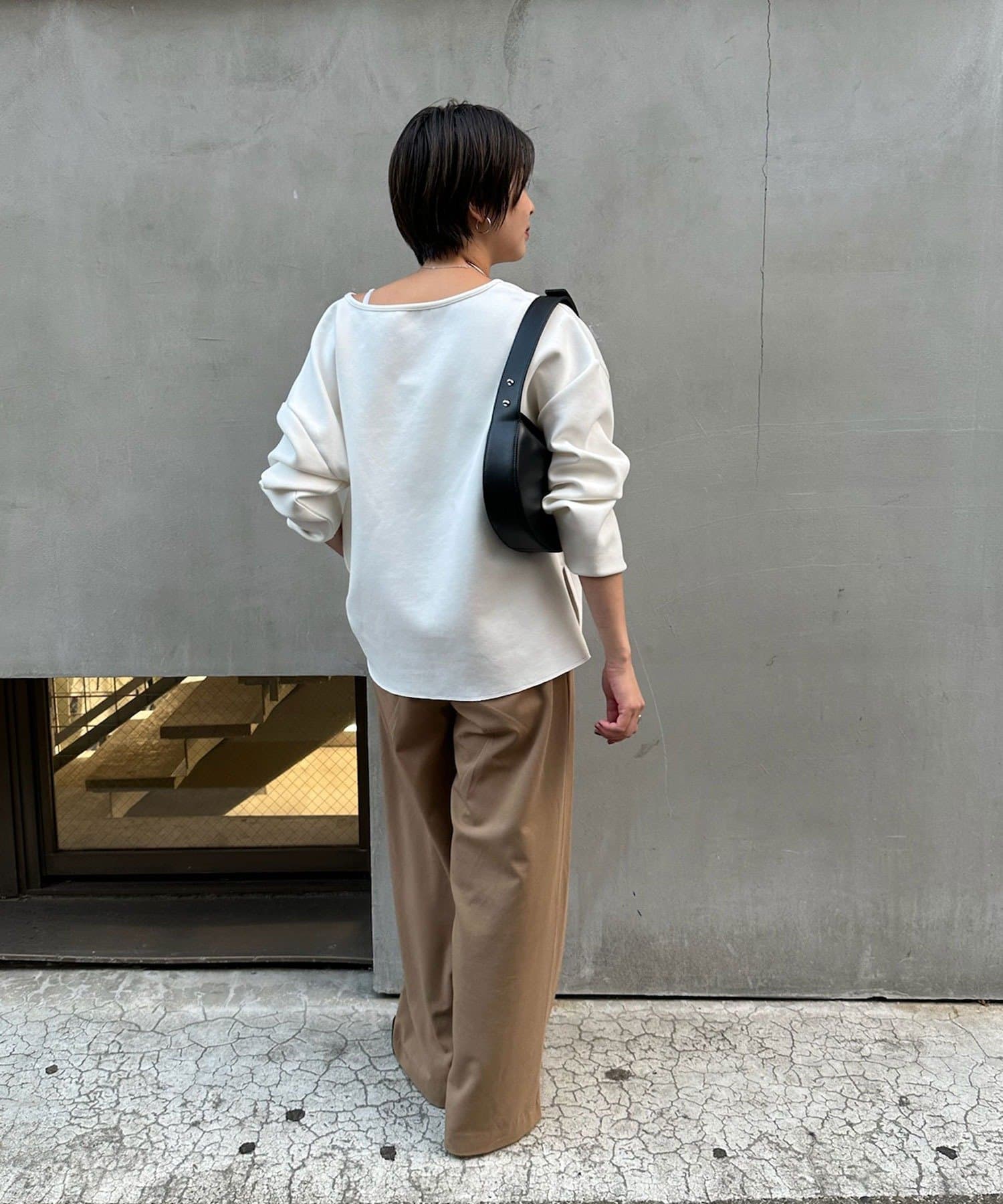 上品な落ち感の素材は腰回りをすっきりと、さらに全体のシルエットを綺麗に見せてくれます。