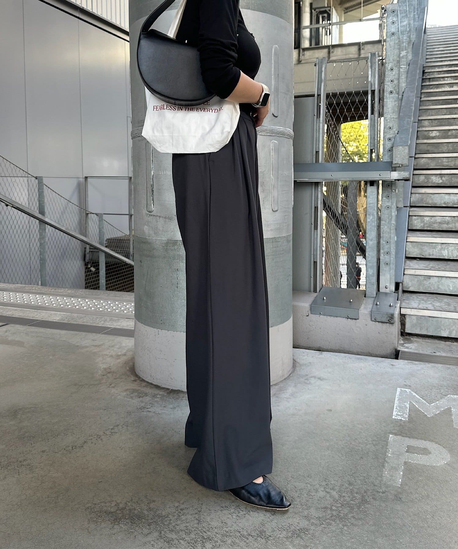 フロントのタックで腰回りや脚のラインを拾わず、スッキリとしたコーディネートが仕上がります。