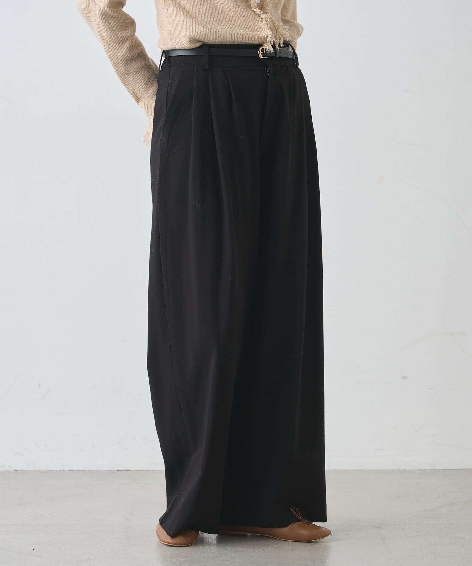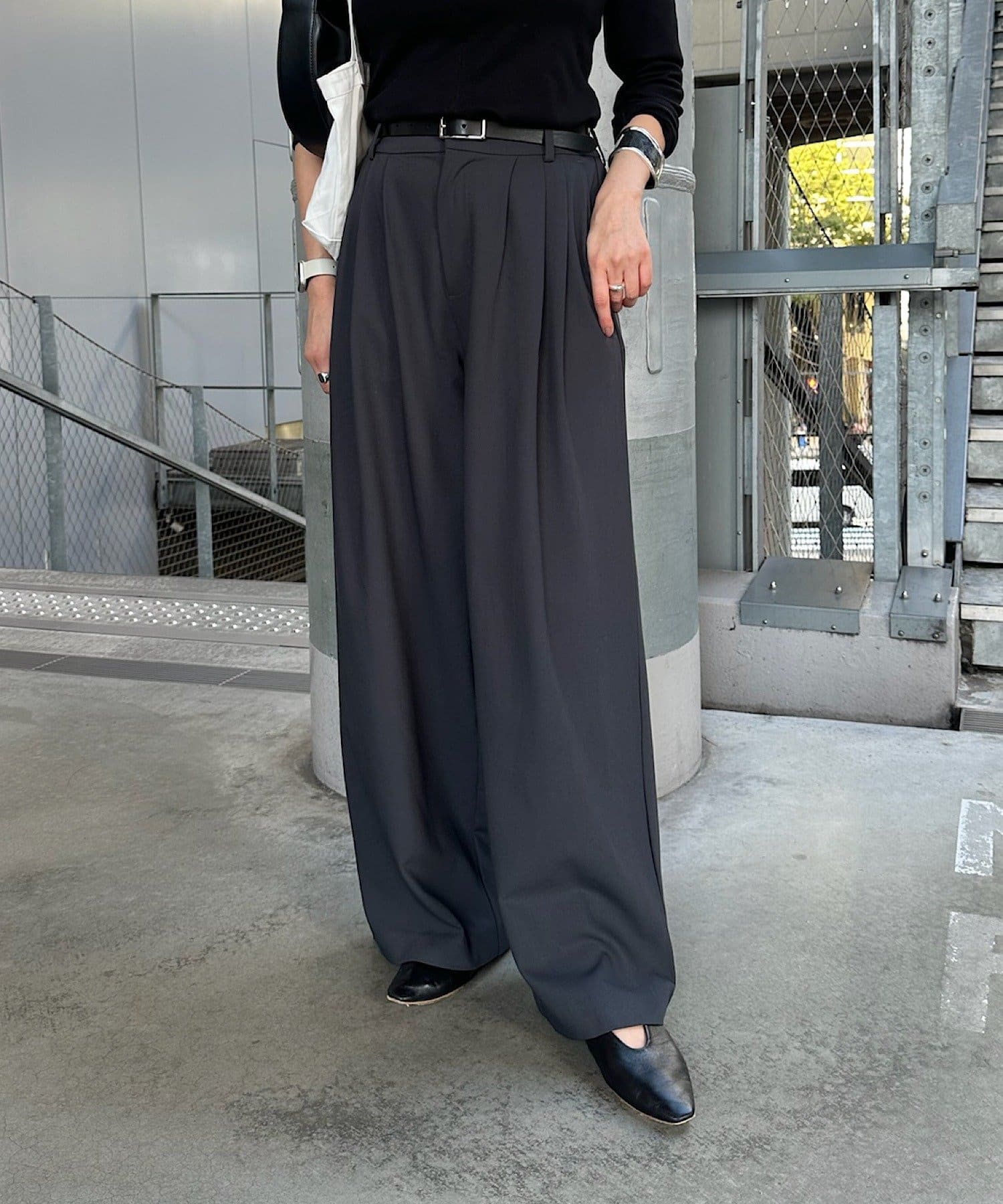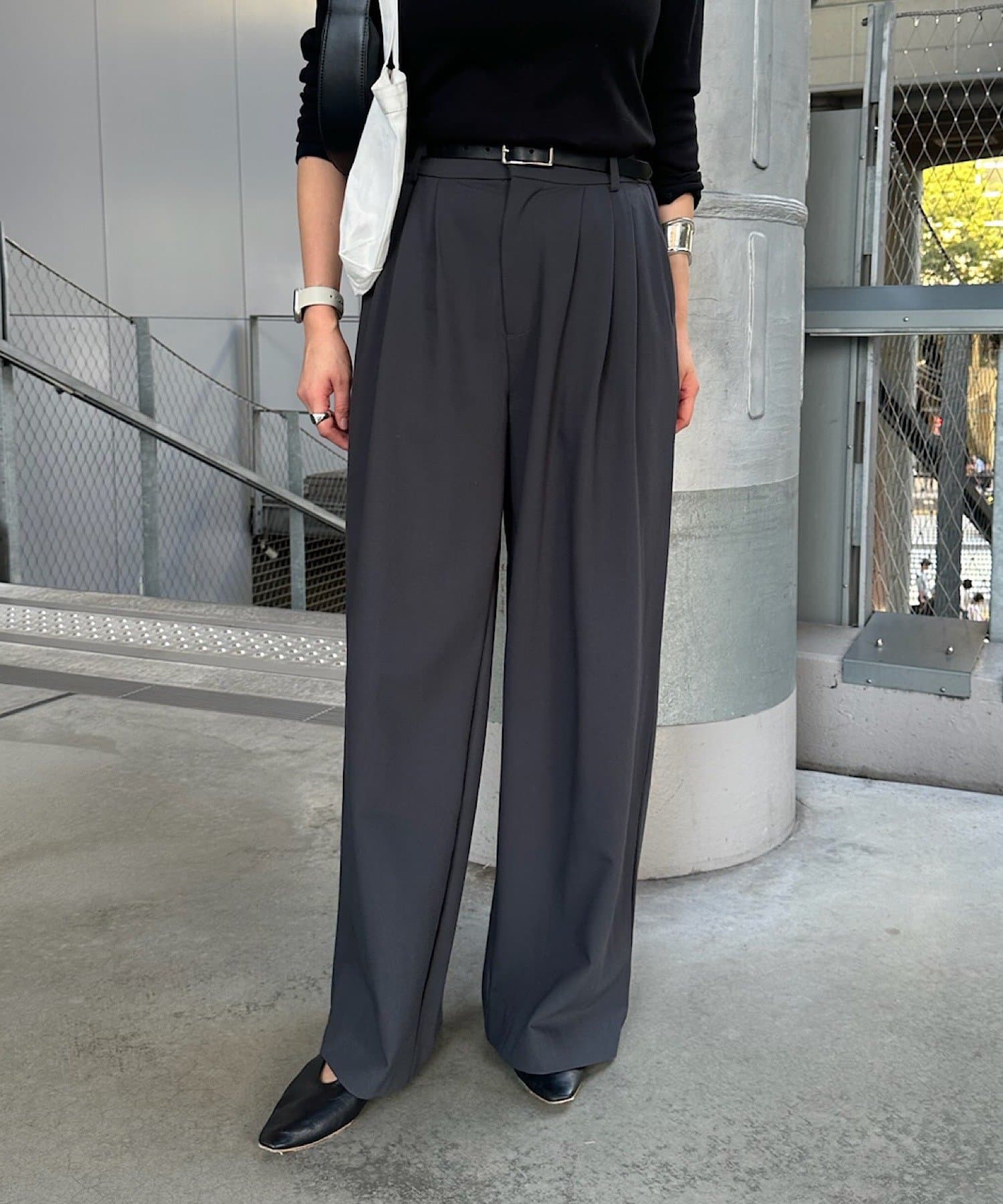 腰回りをしっかりカバー。美脚効果抜群のタックパンツ。