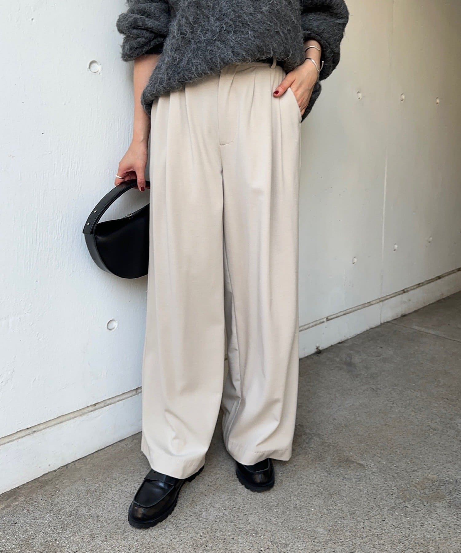 腰回りをしっかりカバー。美脚効果抜群のタックパンツ。