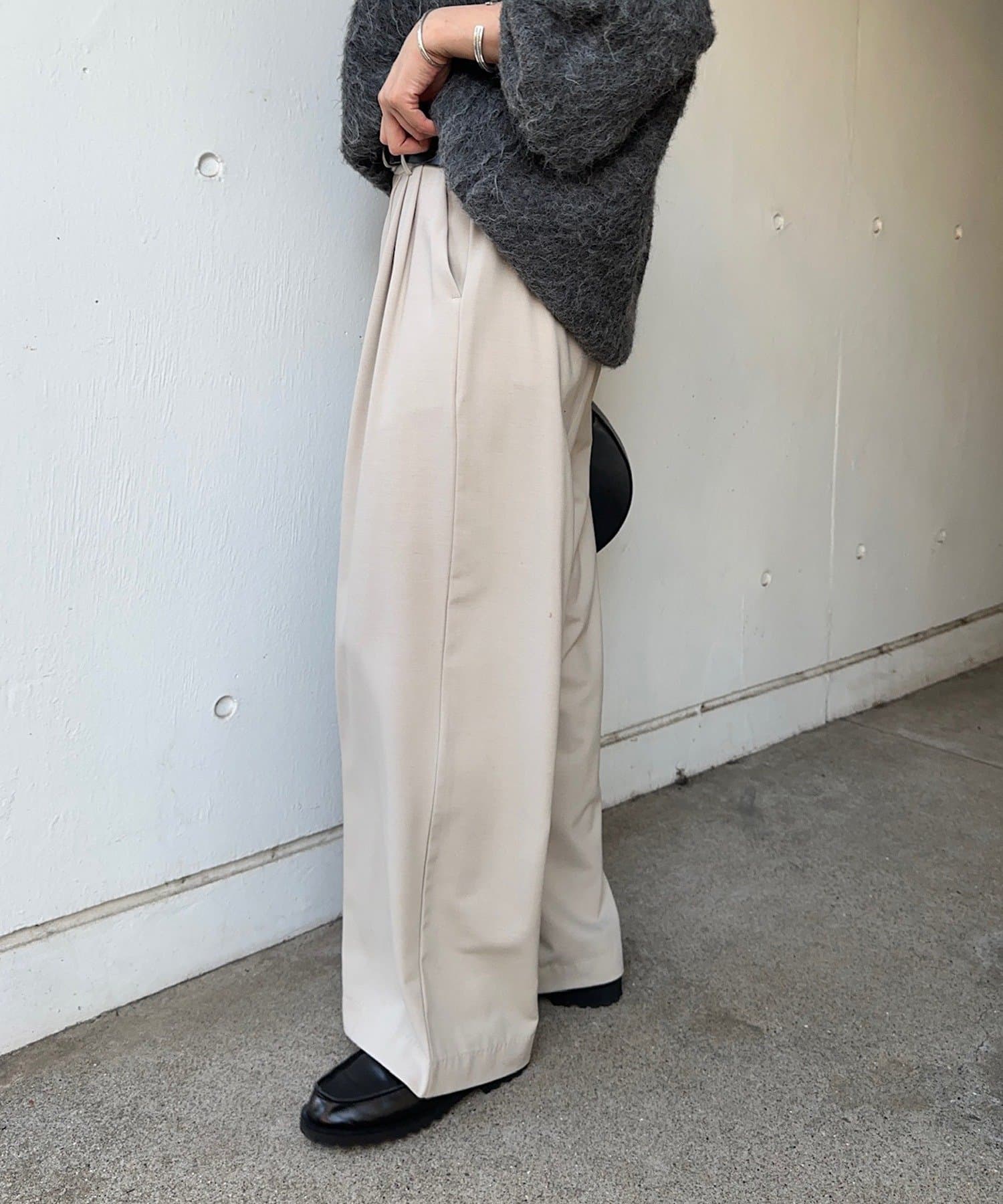 ・上品な落ち感の素材は腰回りをすっきりと、さらに全体のシルエットを綺麗に見せてくれます。