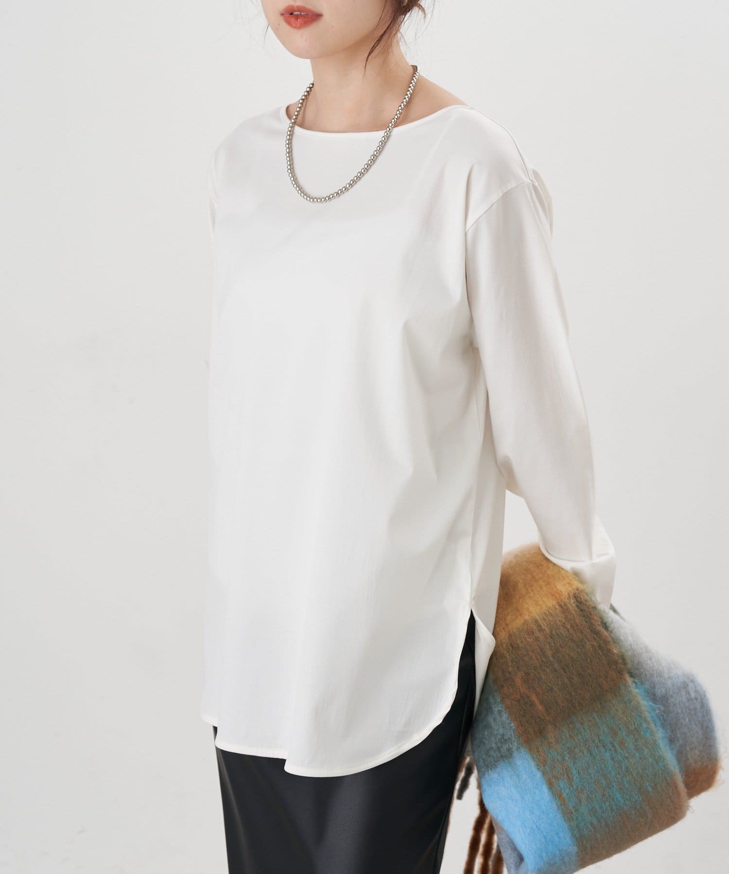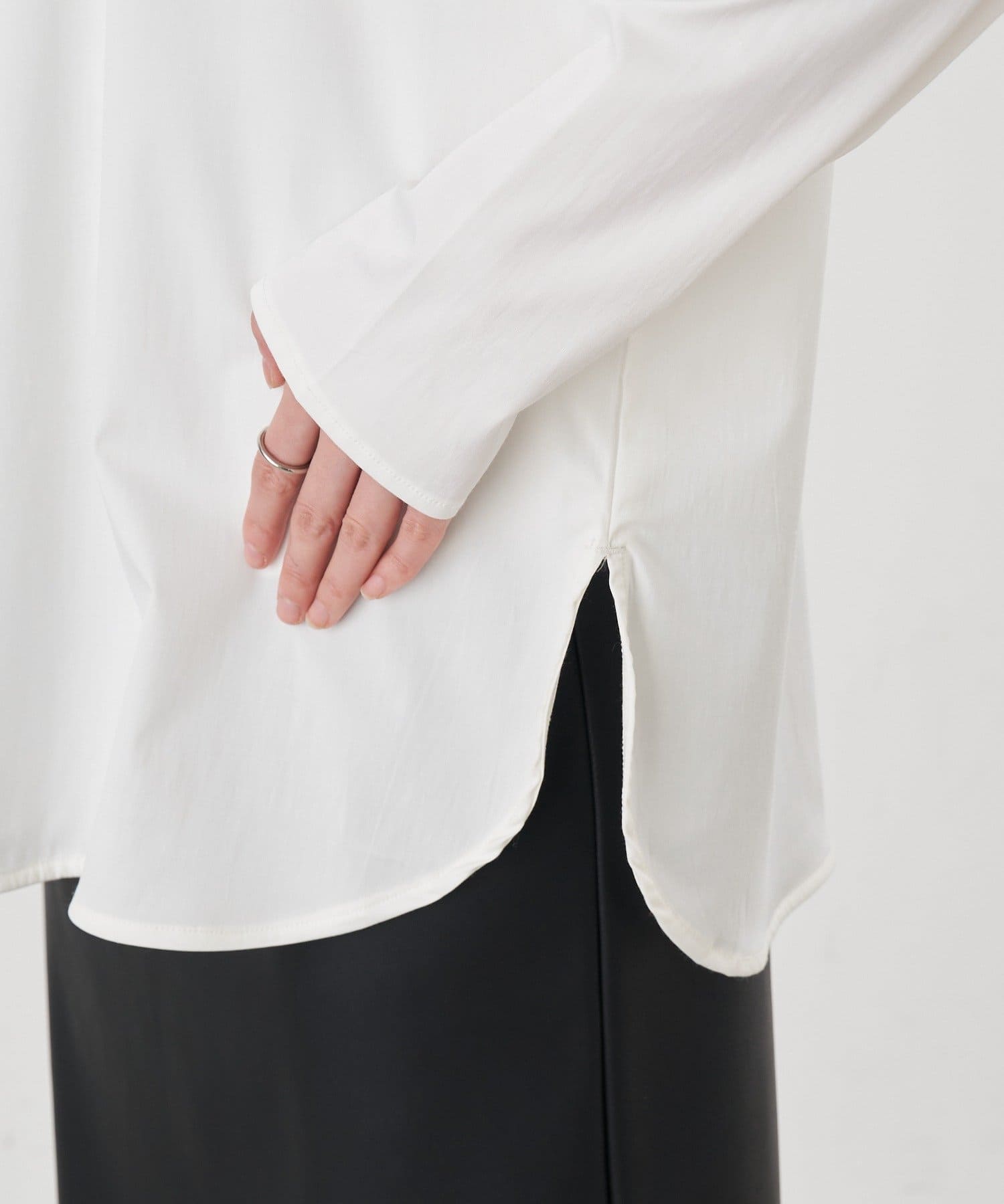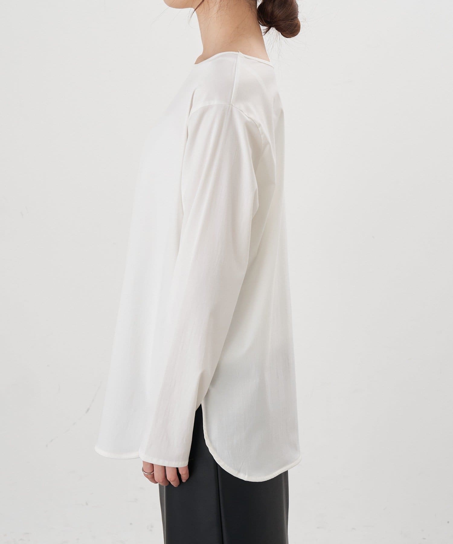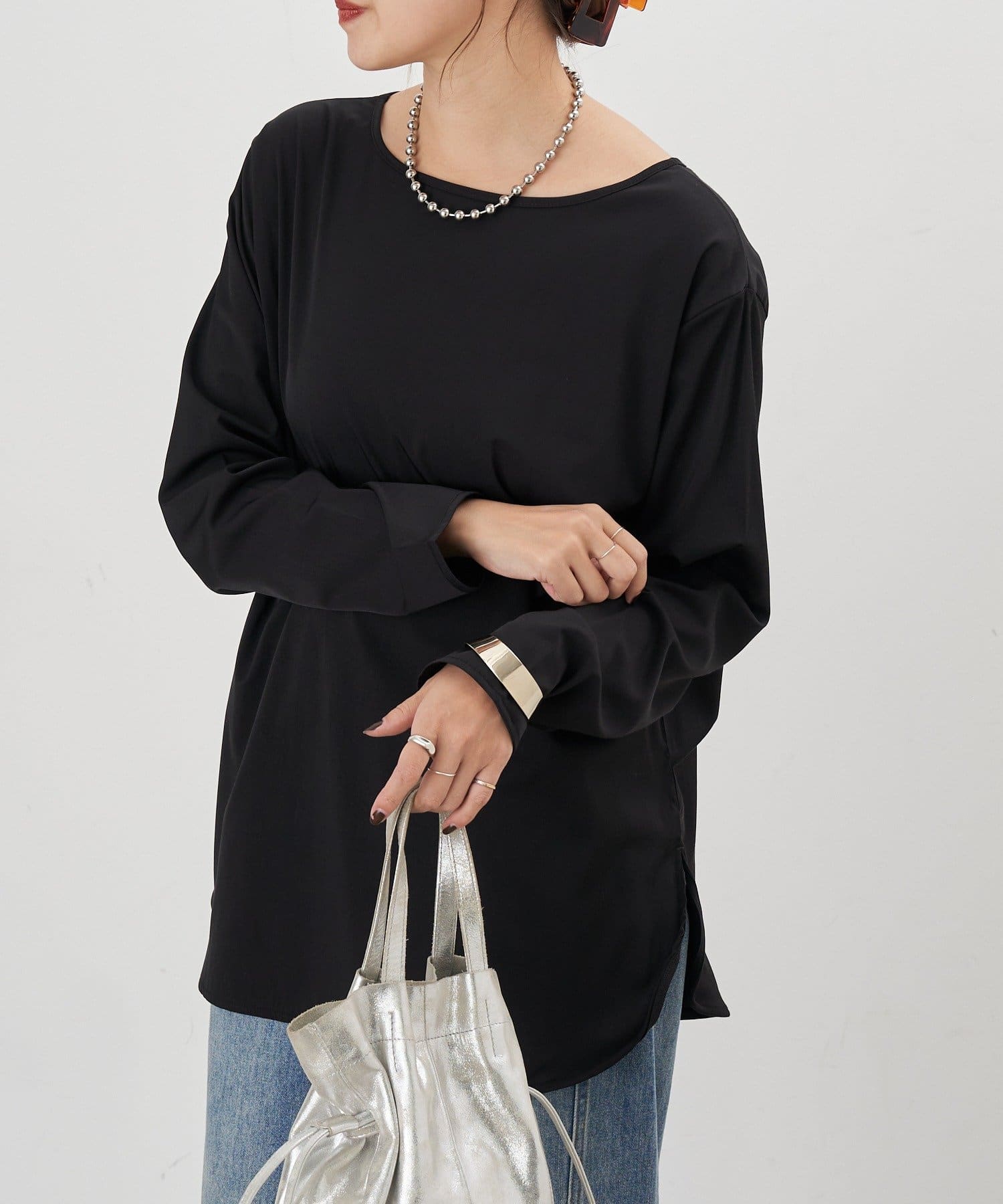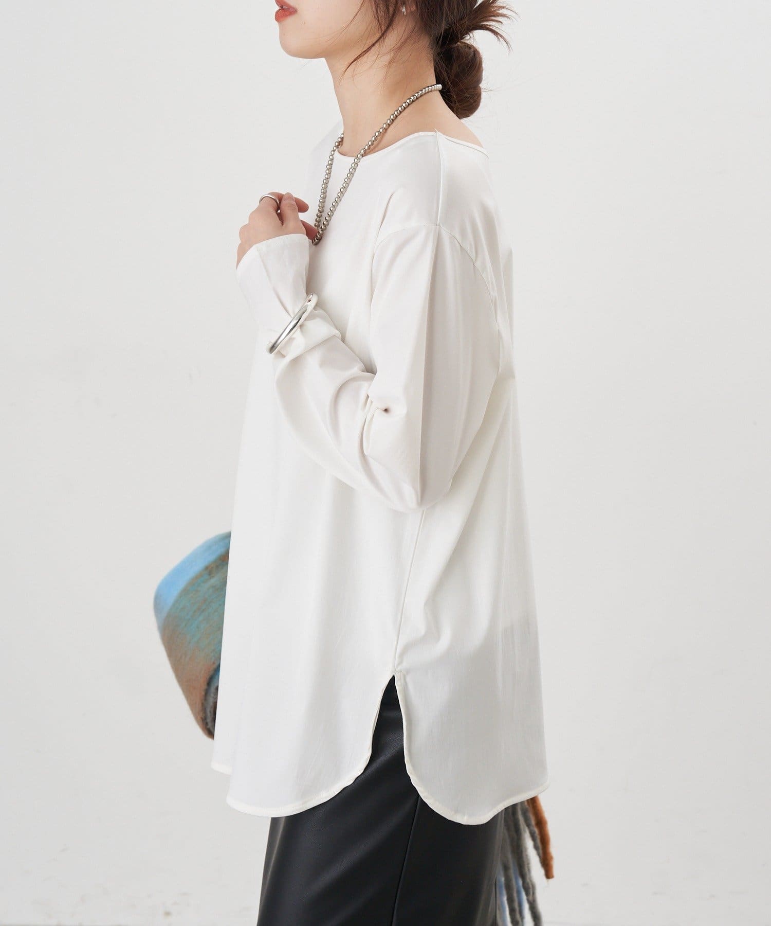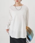 やや長めなストレートの袖に、裾をラウンドさせたシルエットが一枚でもサマになるデザイン。