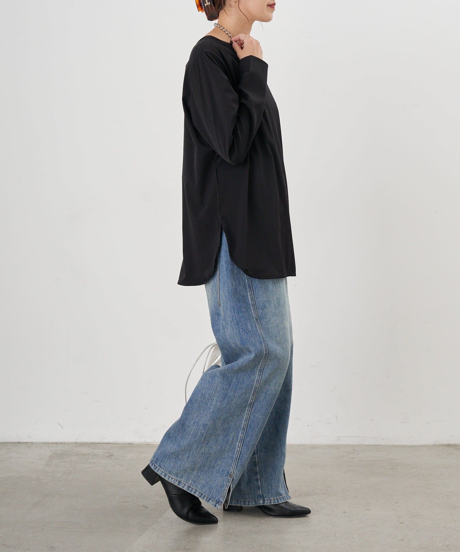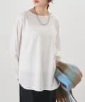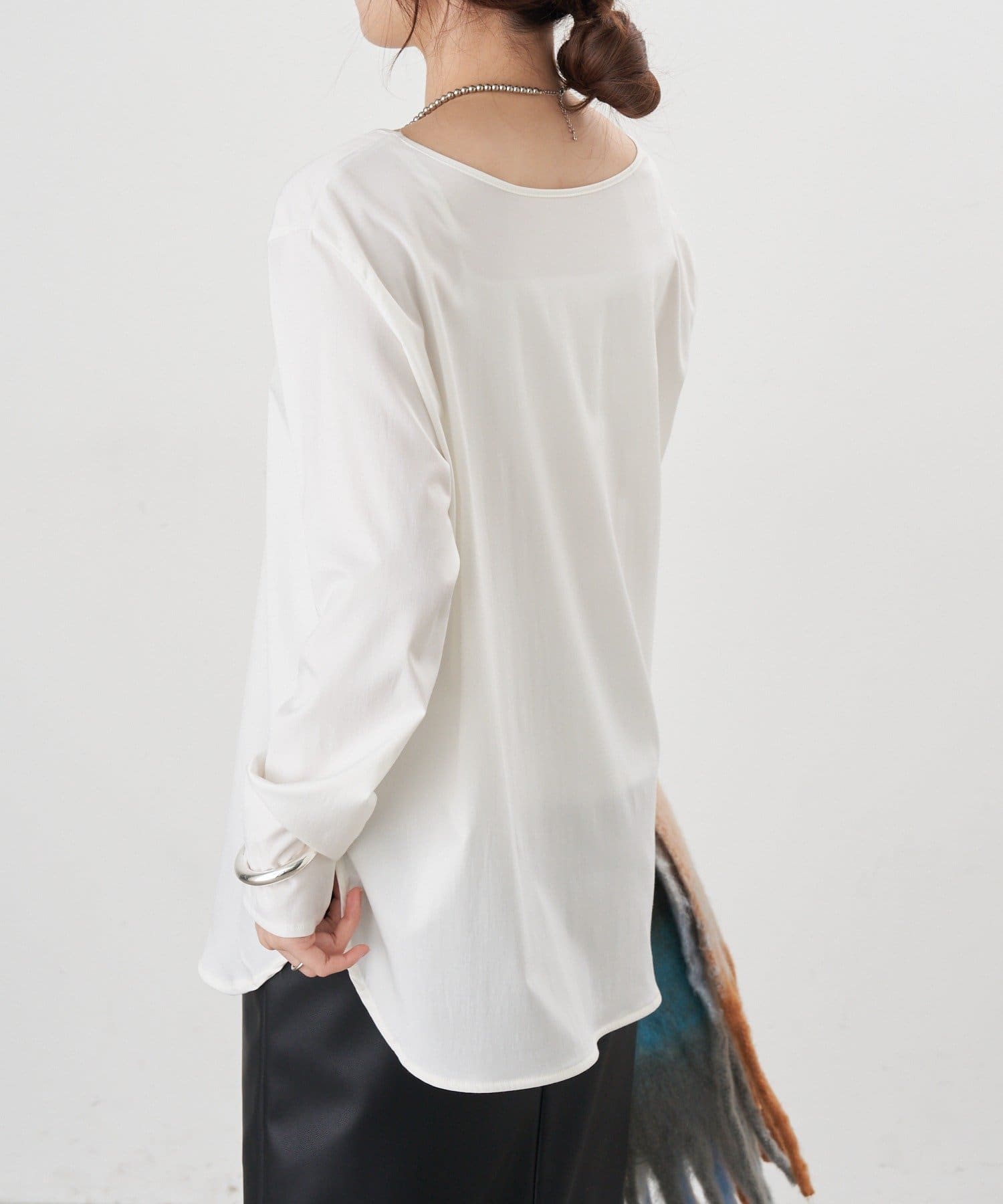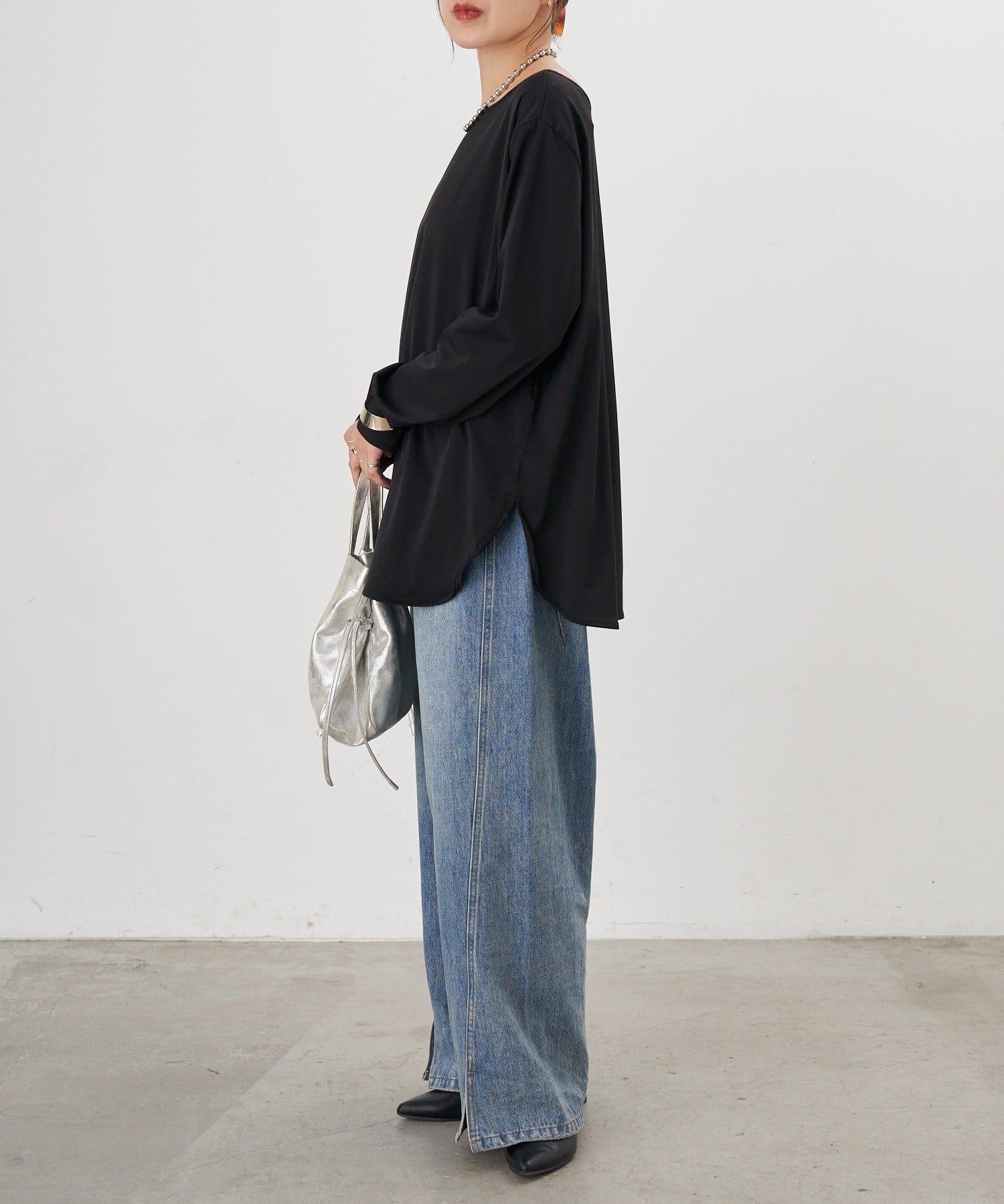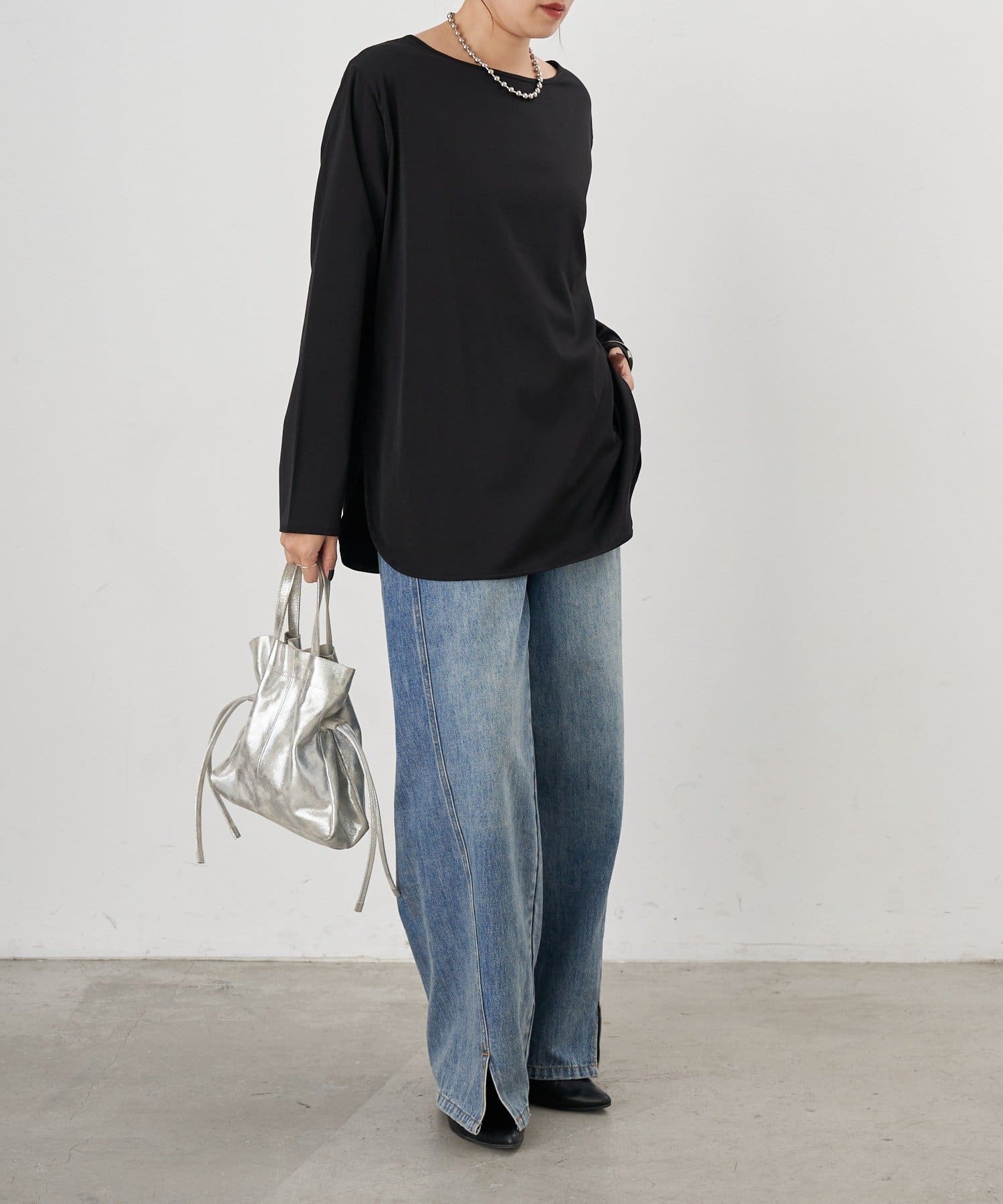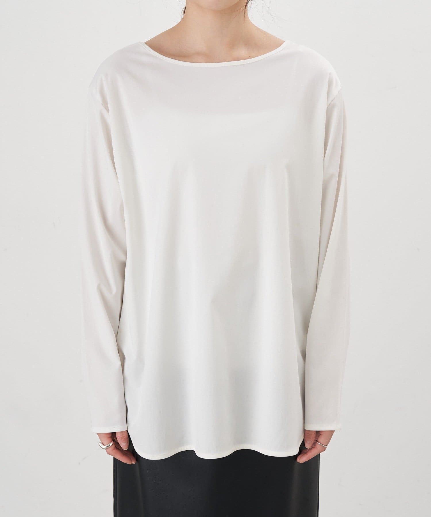 やや長めなストレートの袖に、裾をラウンドさせたシルエットが一枚でもサマになるデザイン。