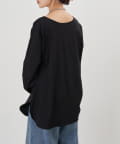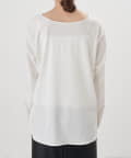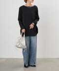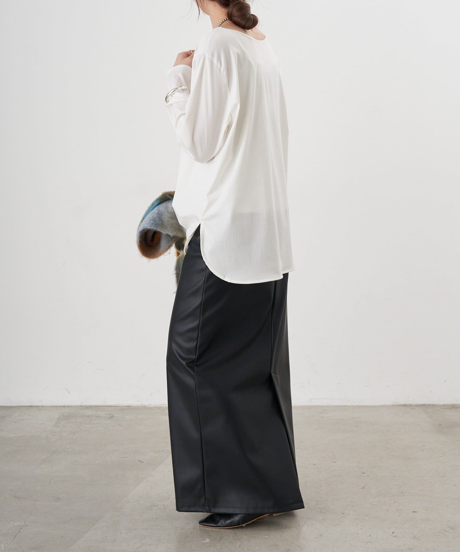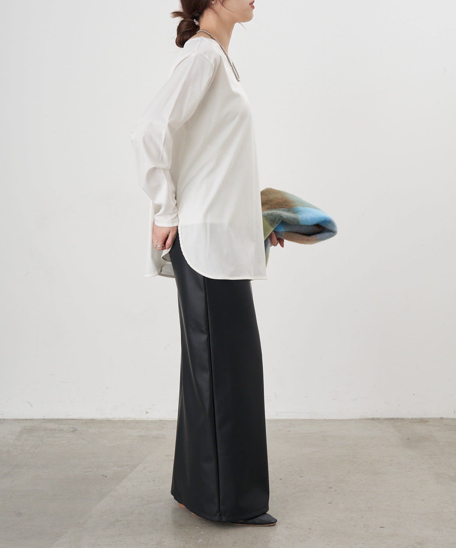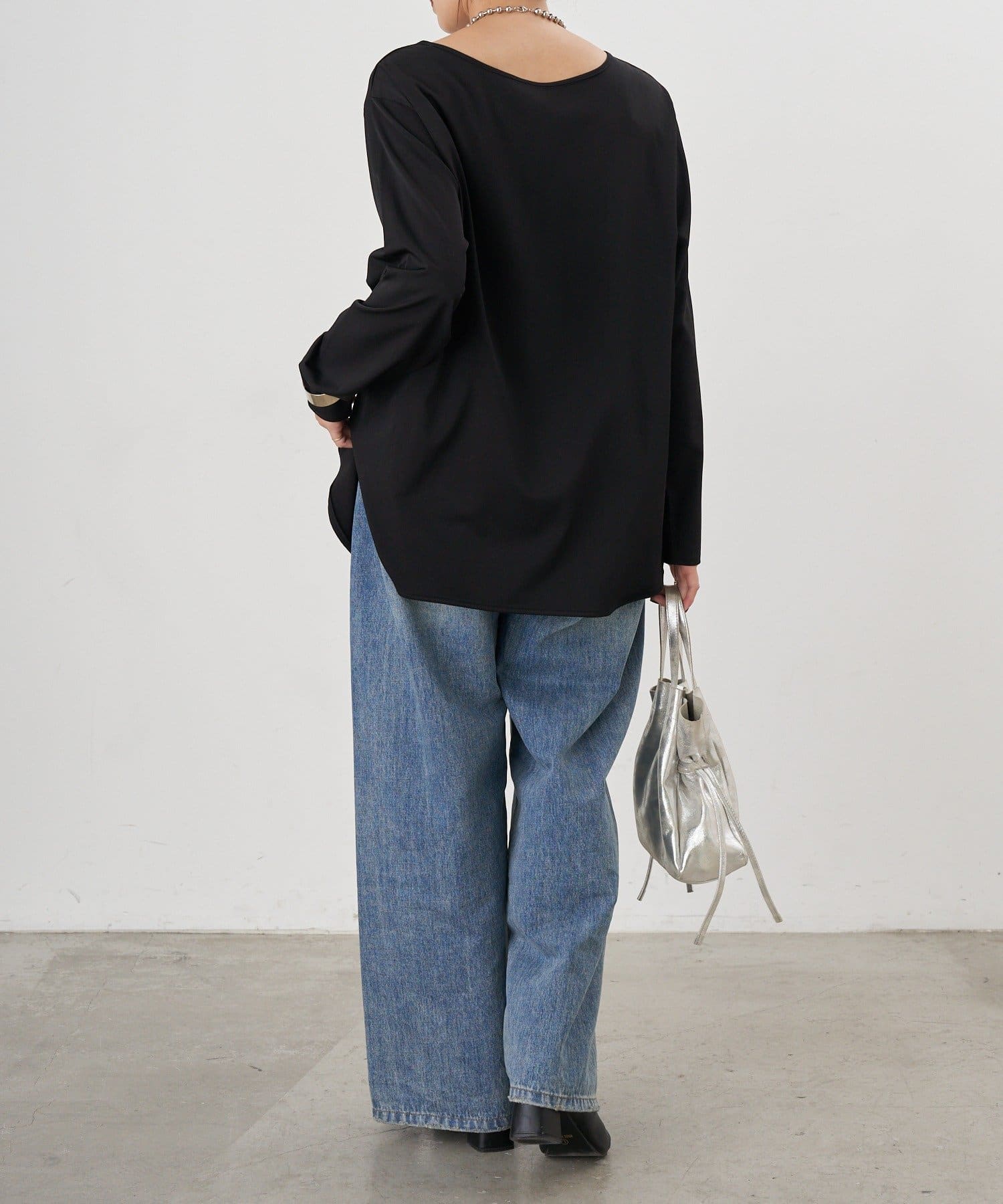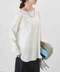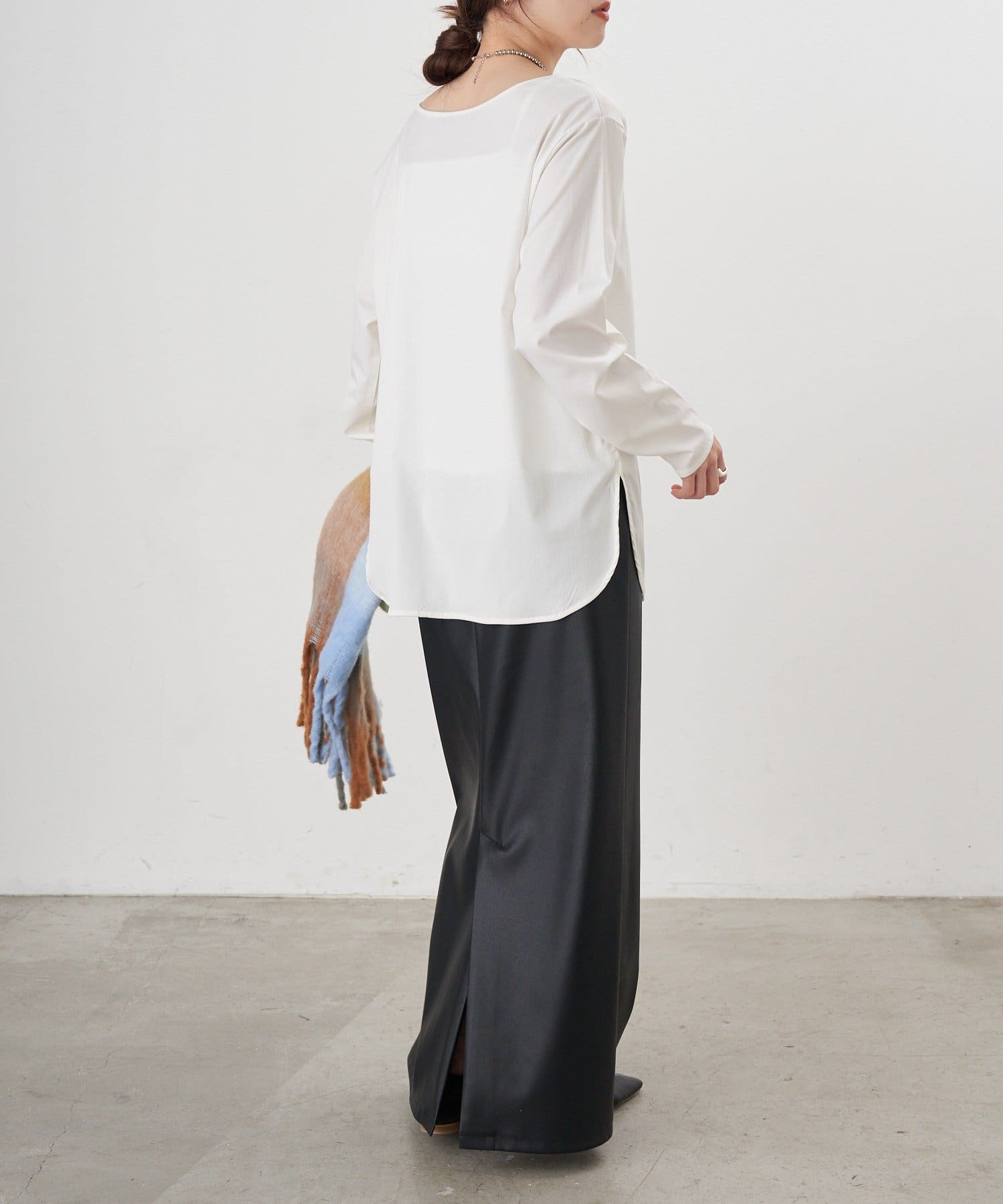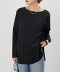 やや長めなストレートの袖に、裾をラウンドさせたシルエットが一枚でもサマになるデザイン。