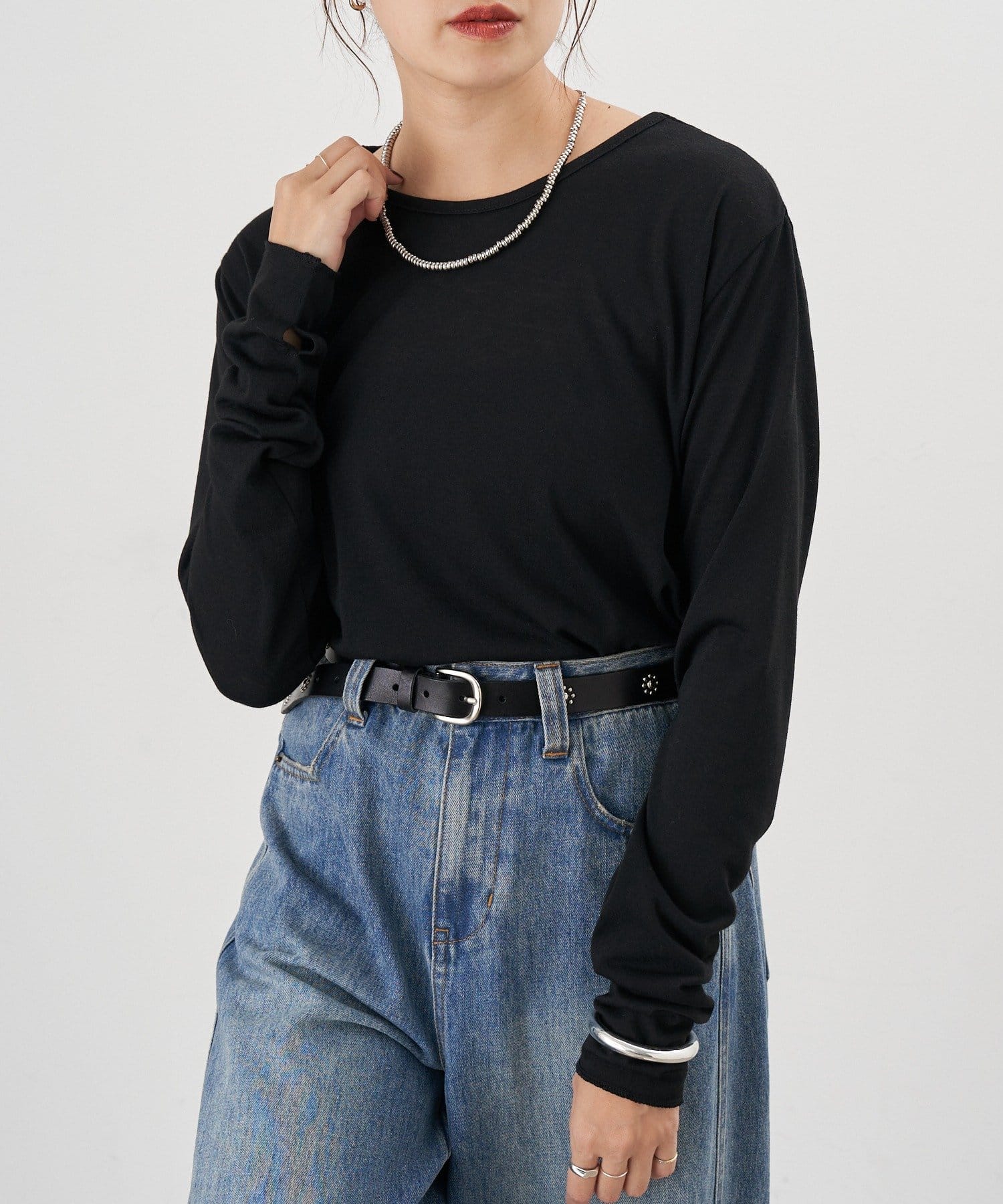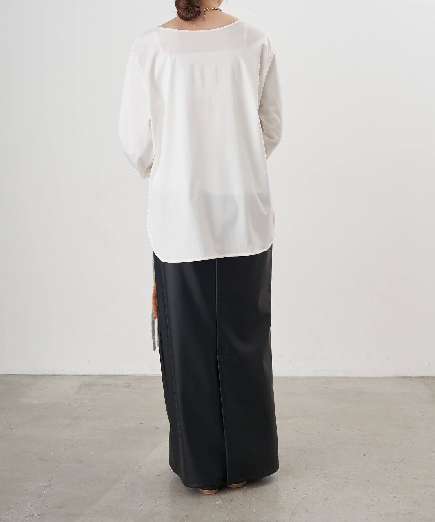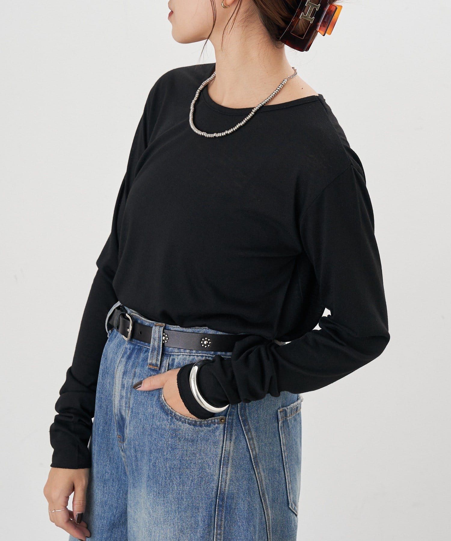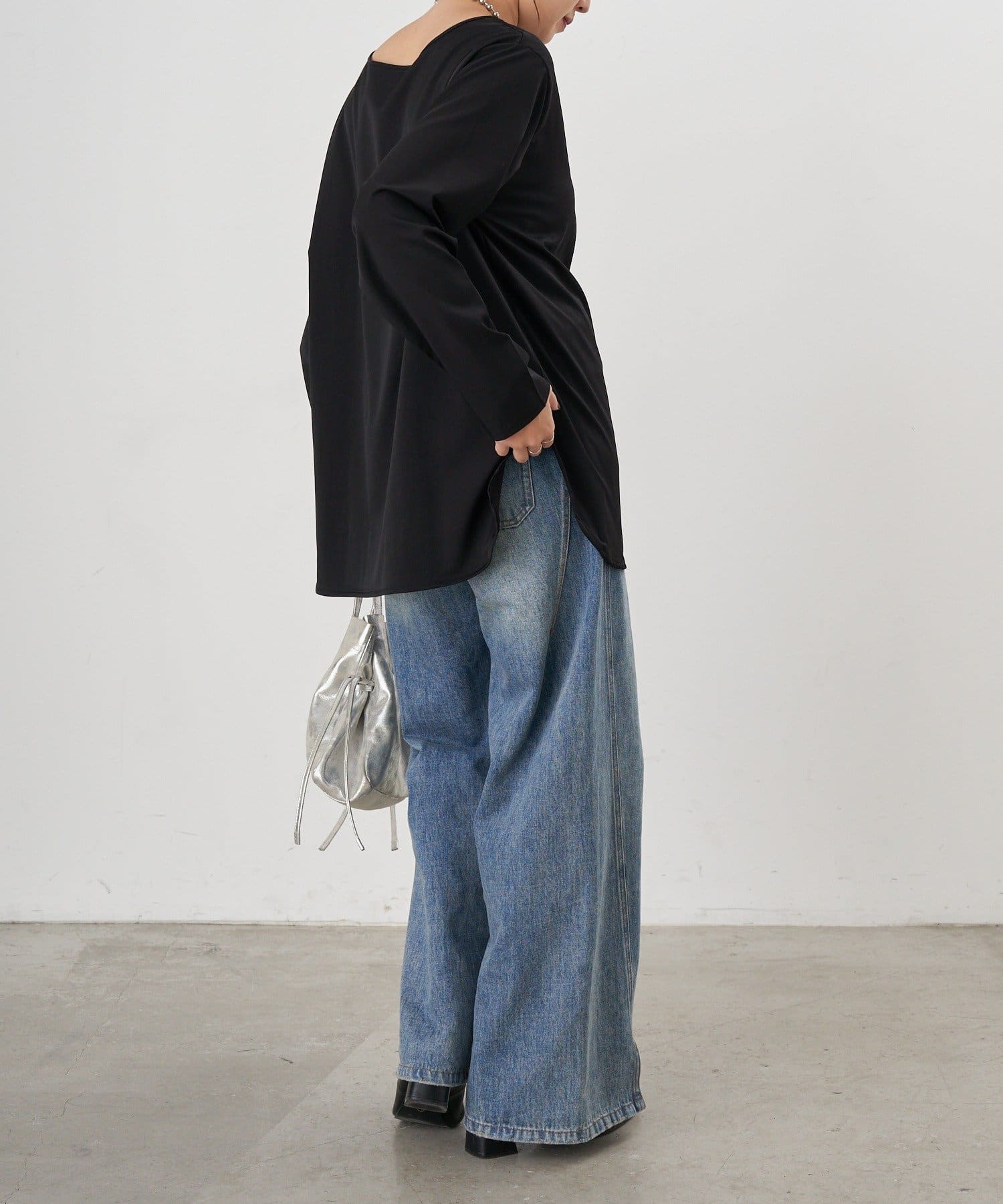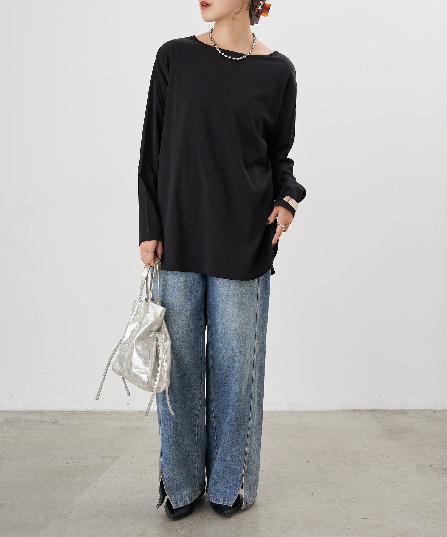 やや長めなストレートの袖に、裾をラウンドさせたシルエットが一枚でもサマになるデザイン。