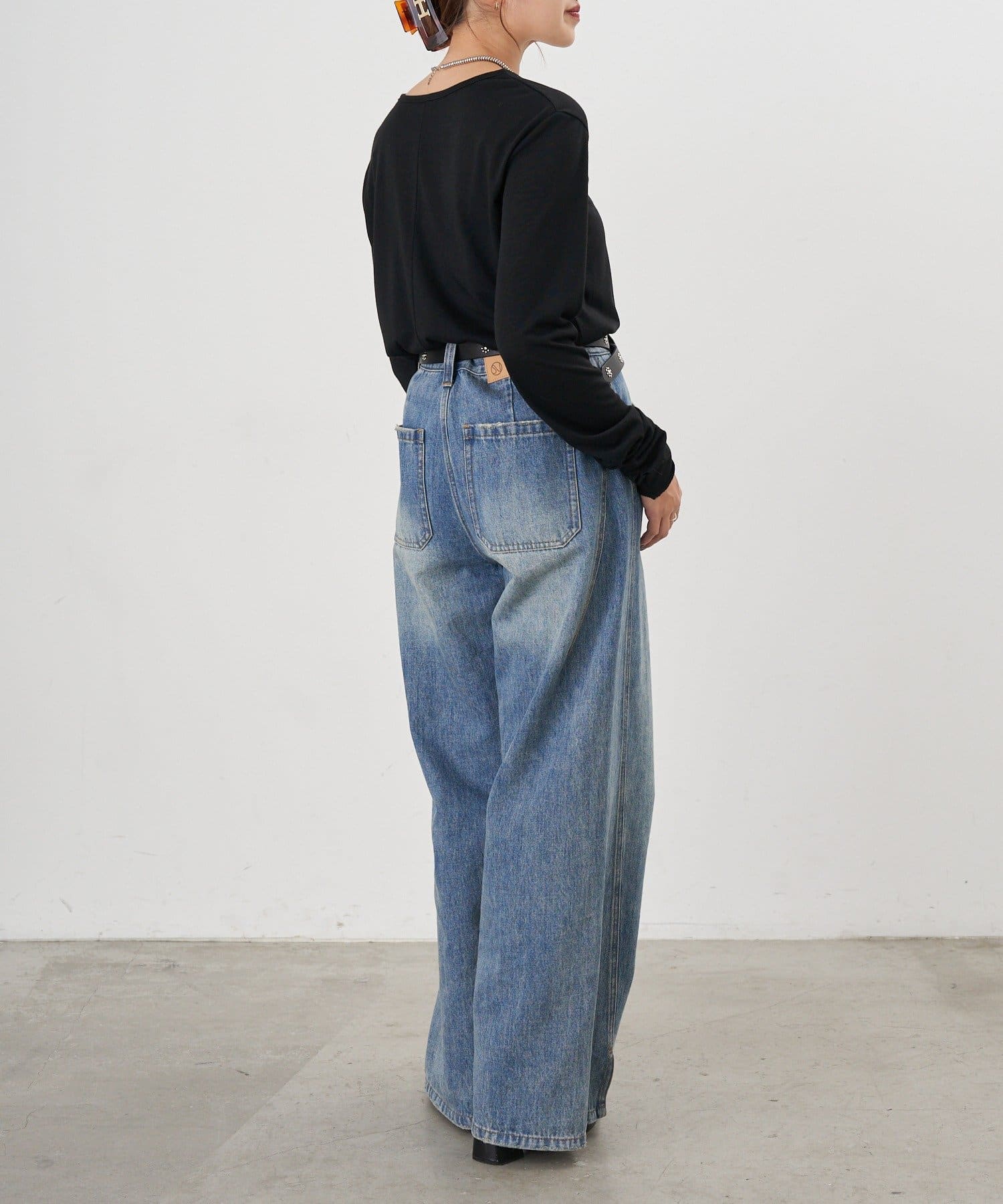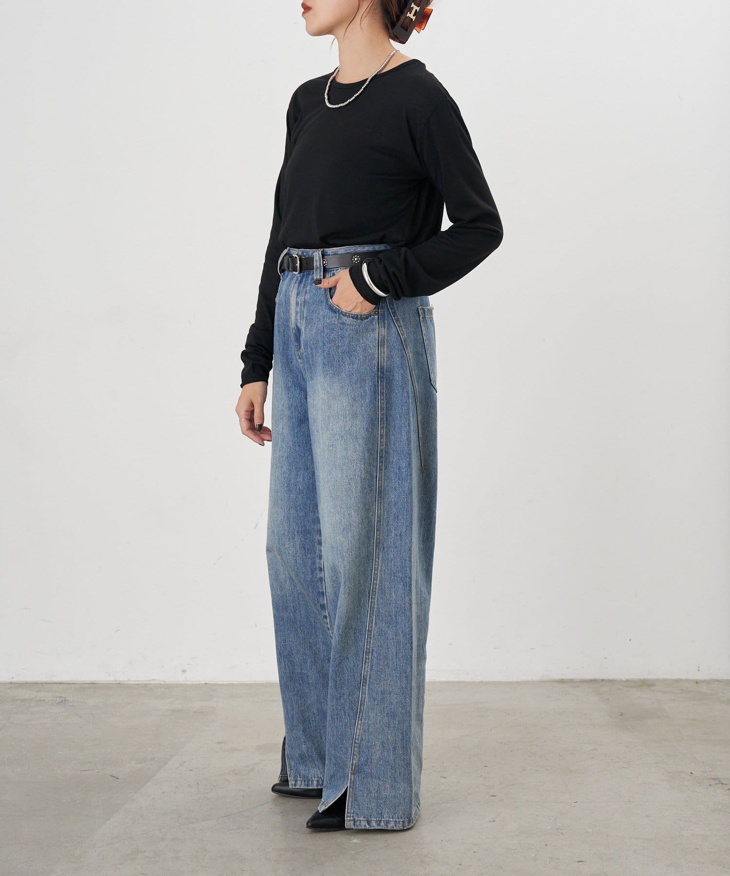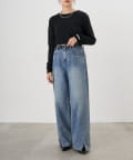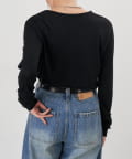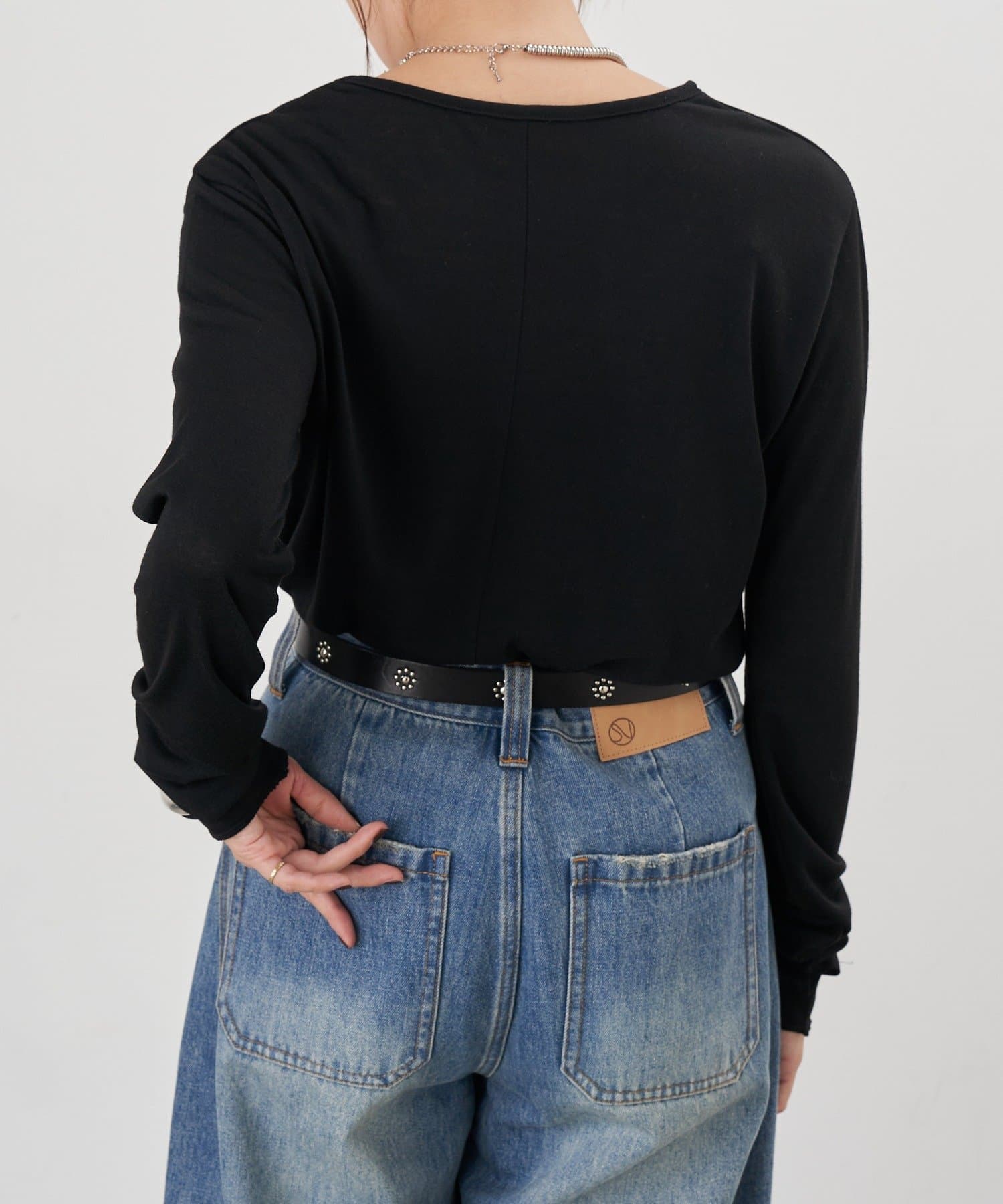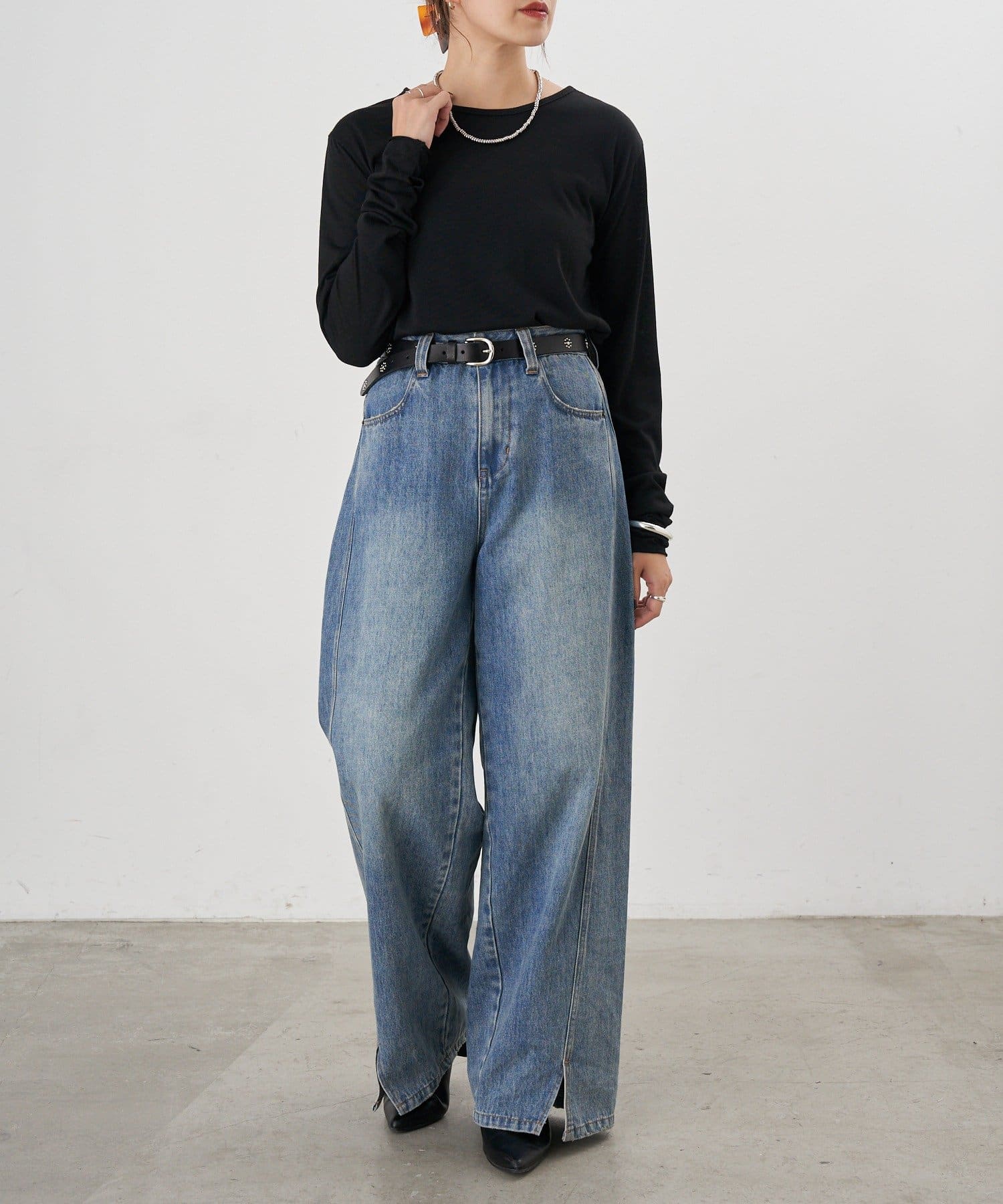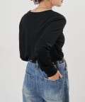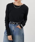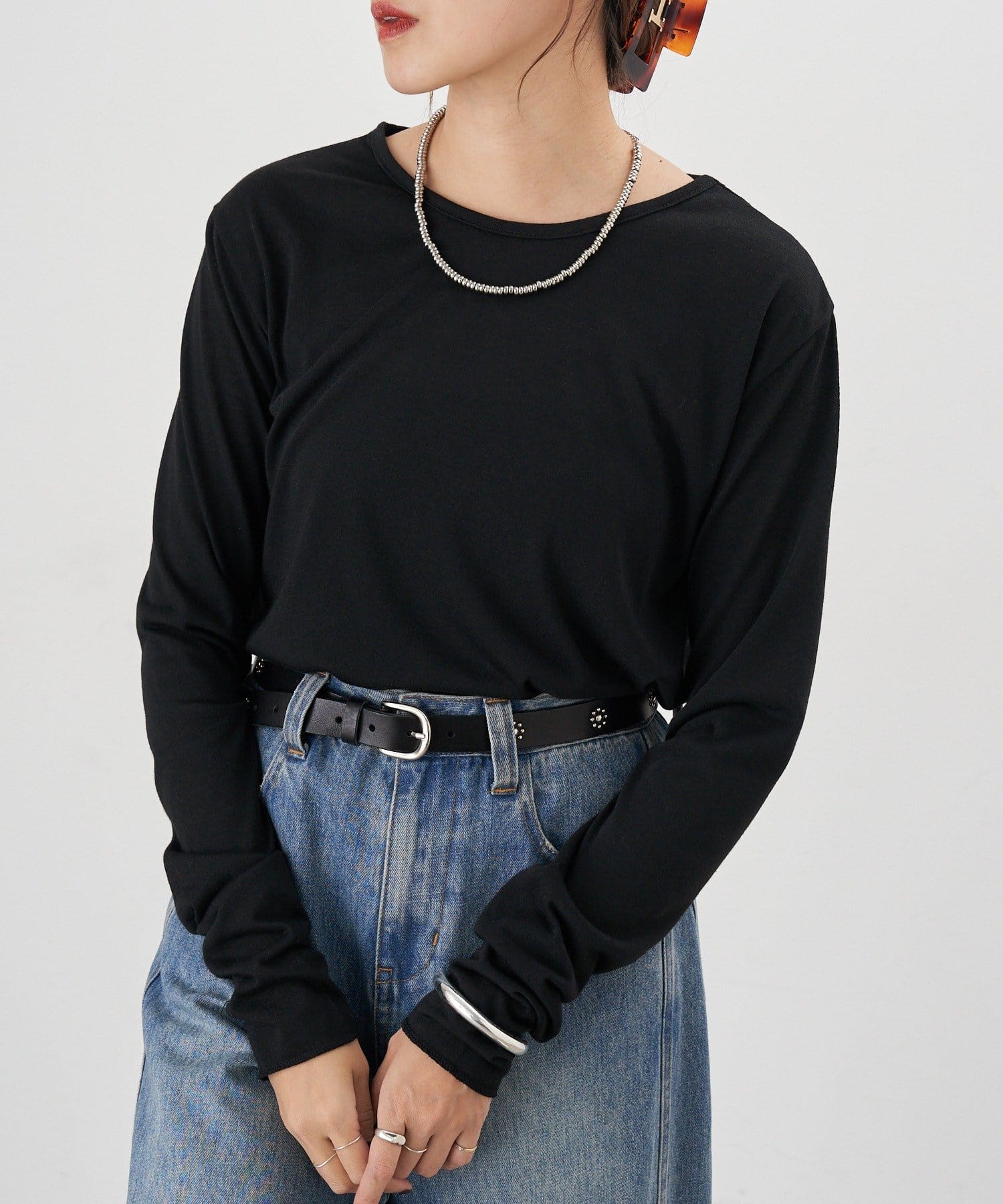 やや長めなストレートの袖に、裾をラウンドさせたシルエットが一枚でもサマになるデザイン。