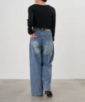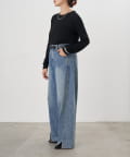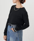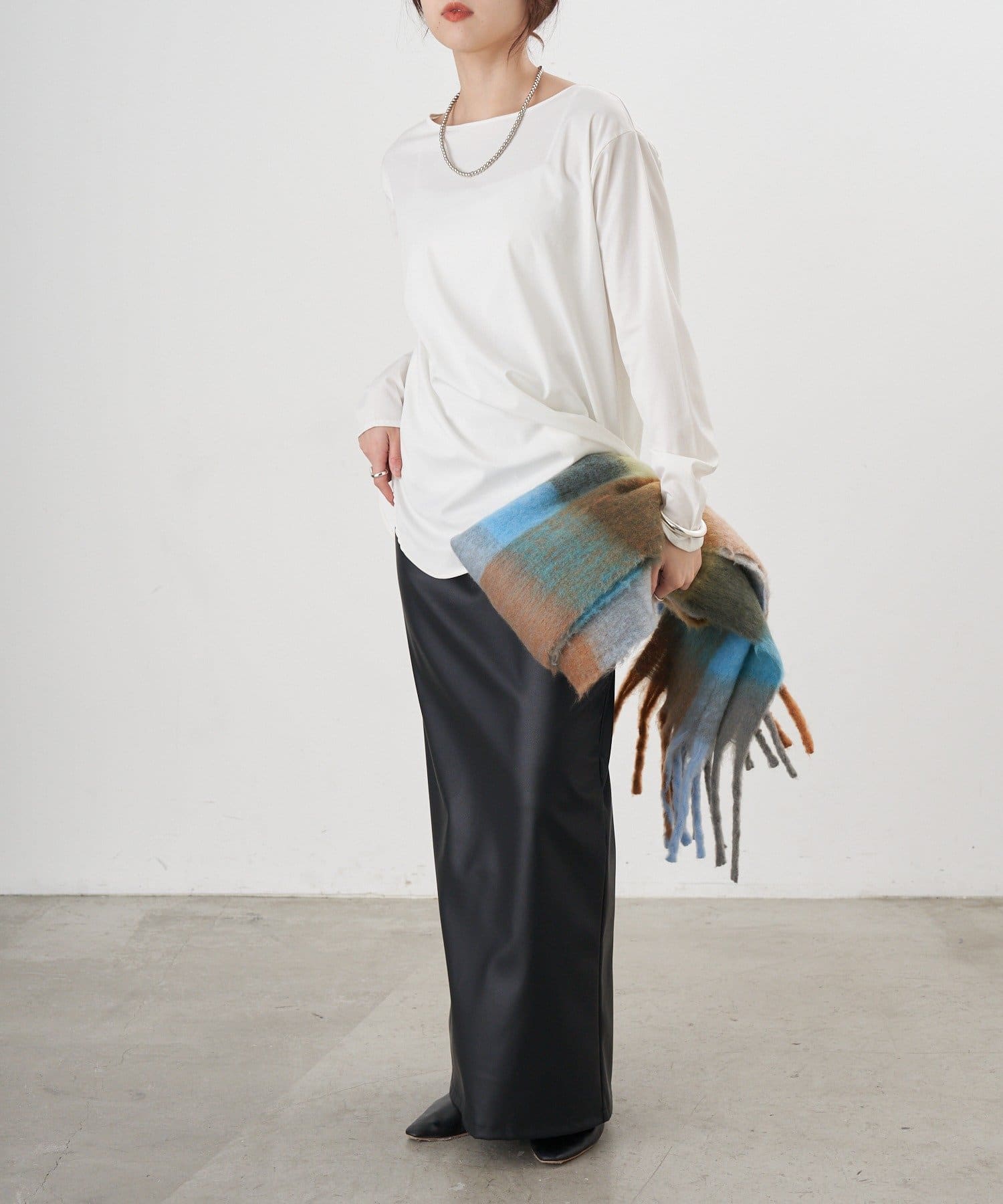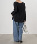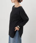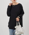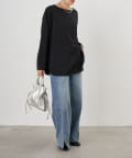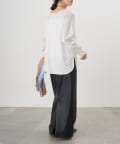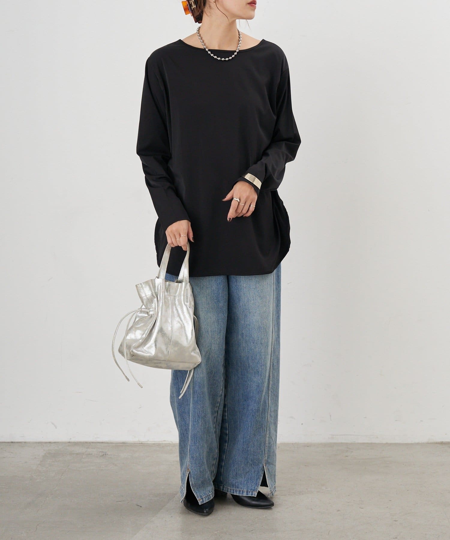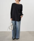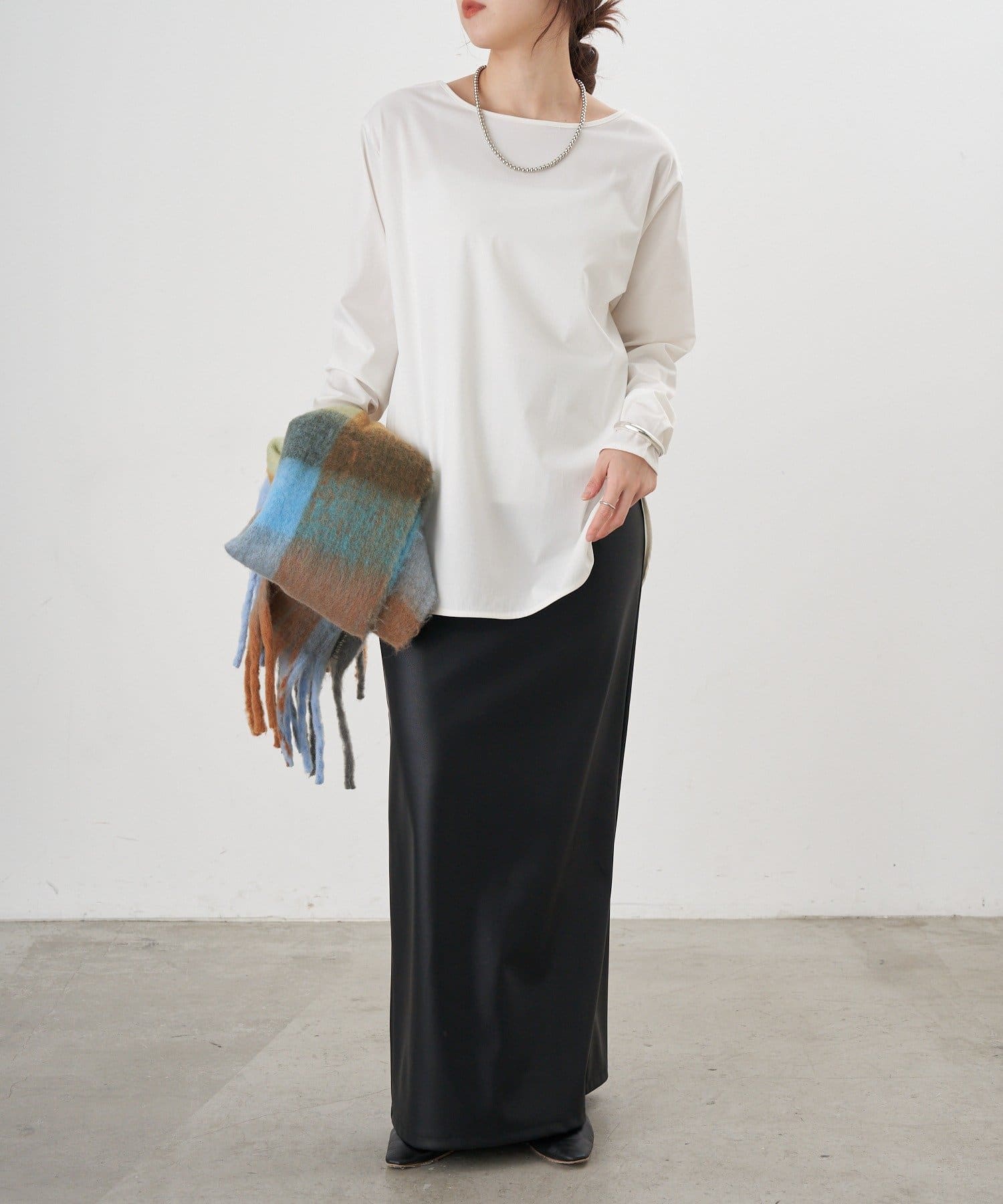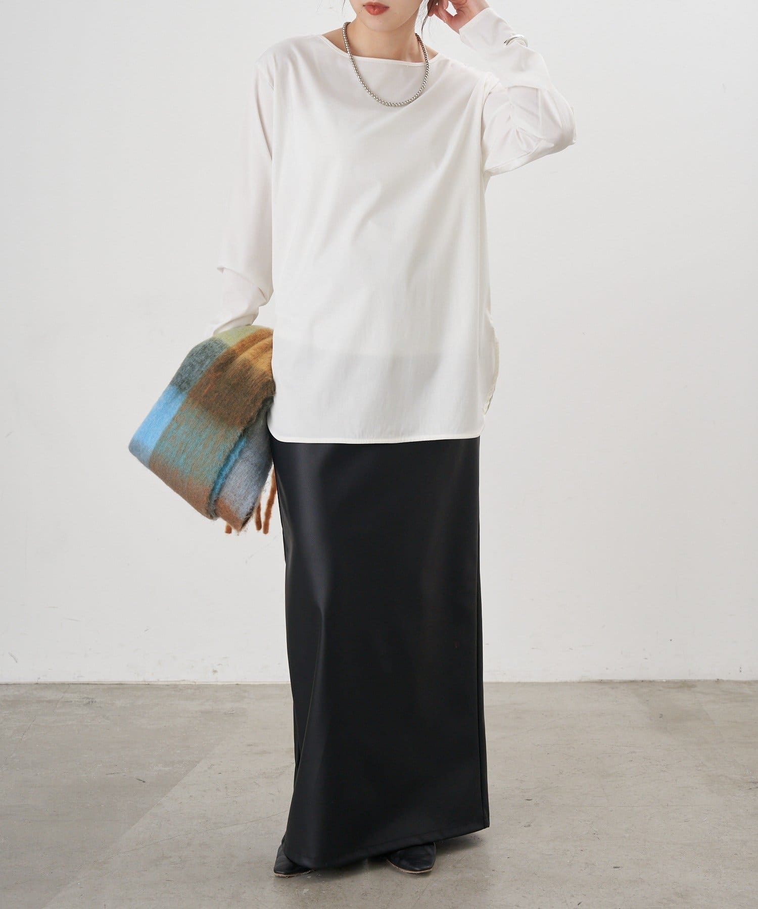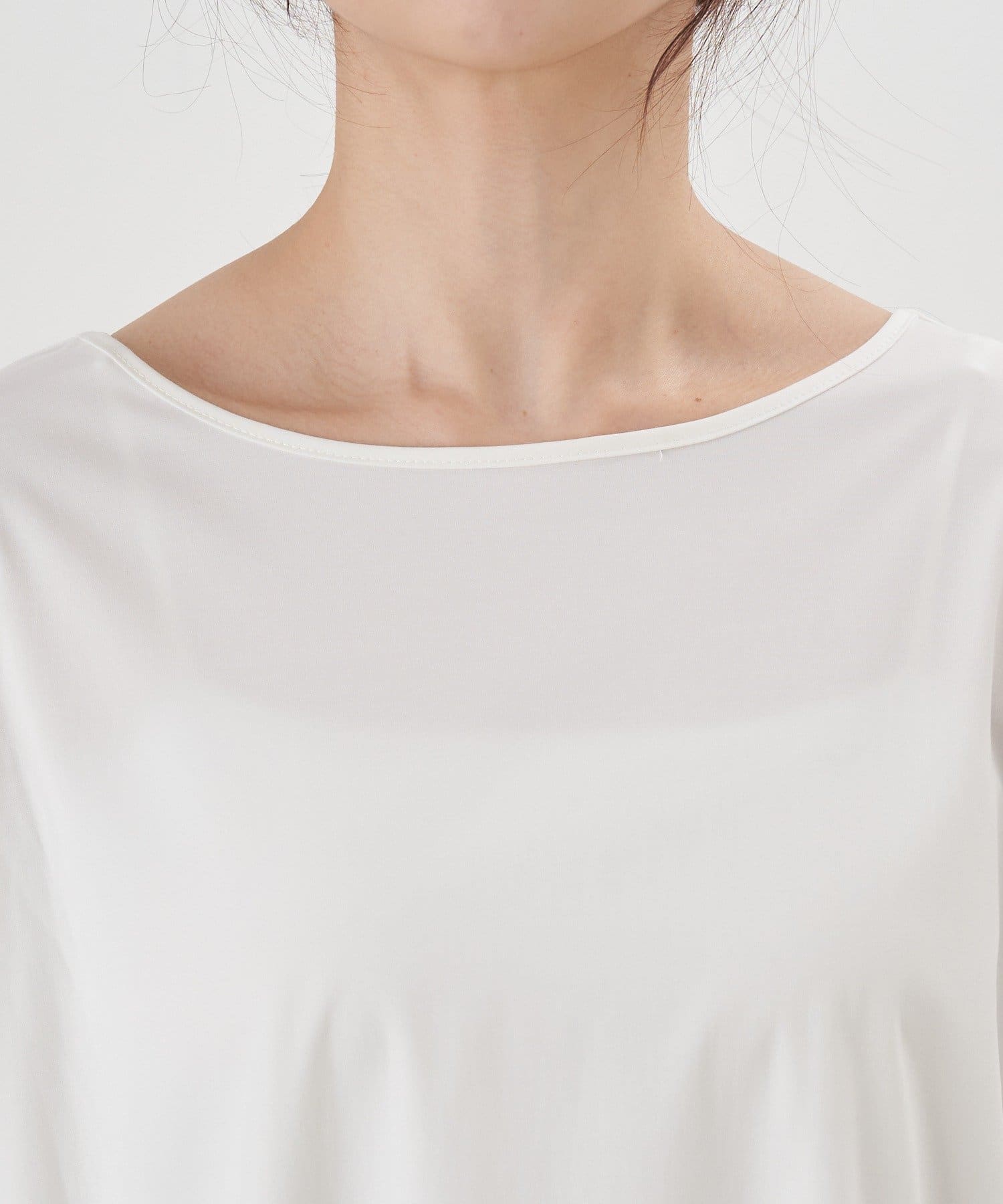 首元はデコルテのきれいに見える緩やかなボートネックで女性らしさをプラス。
