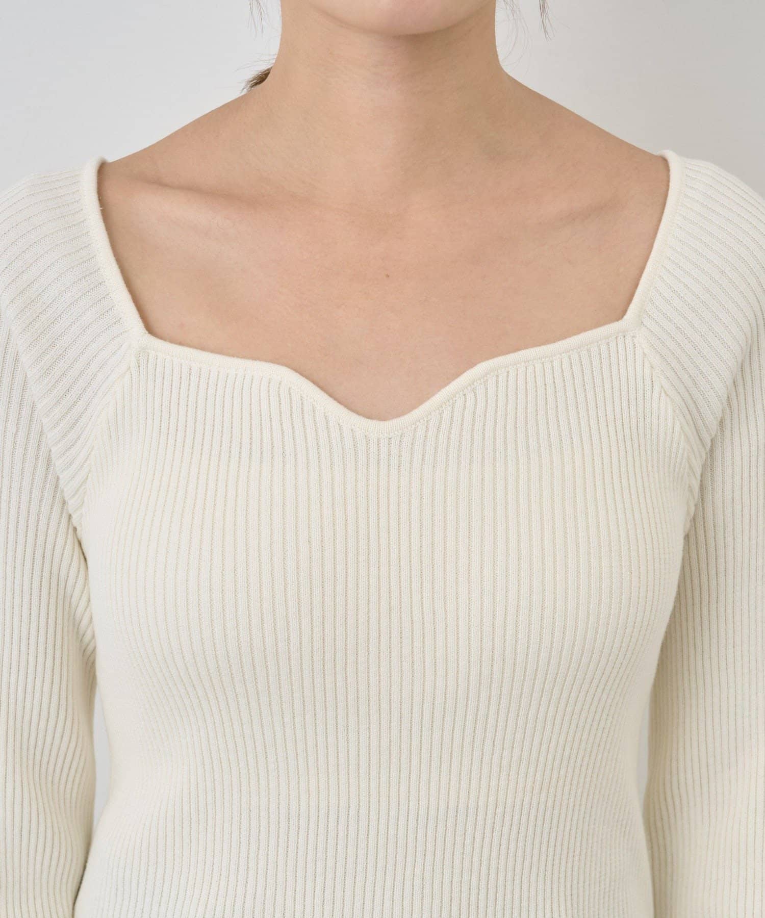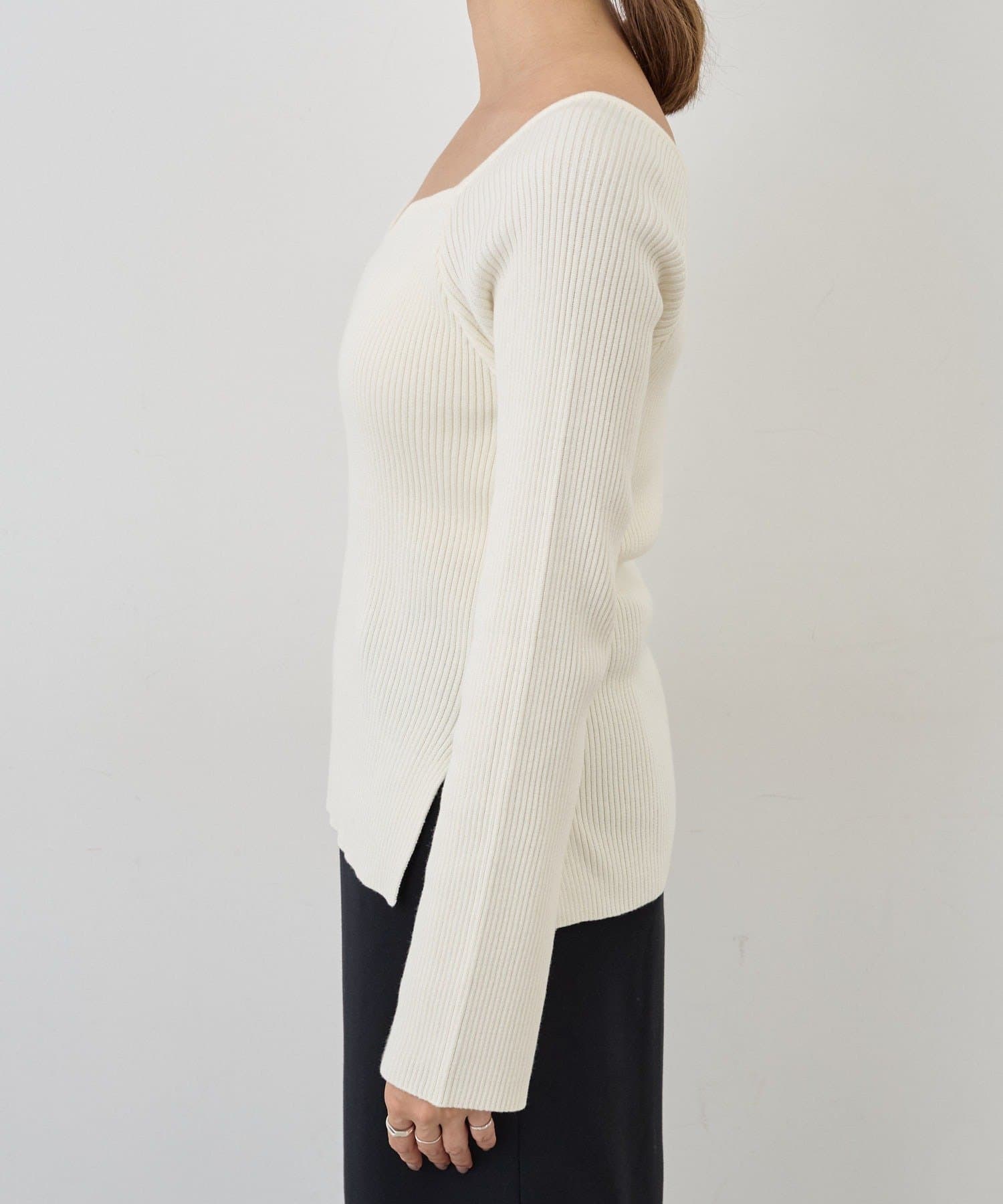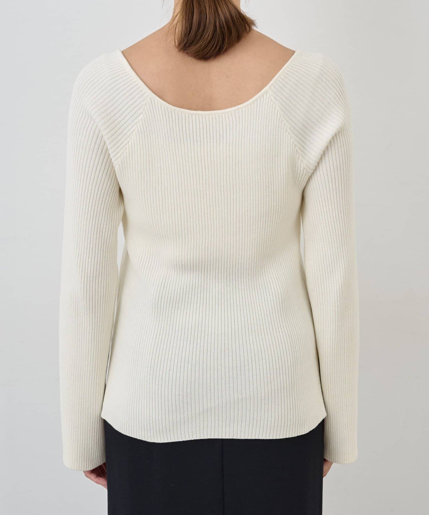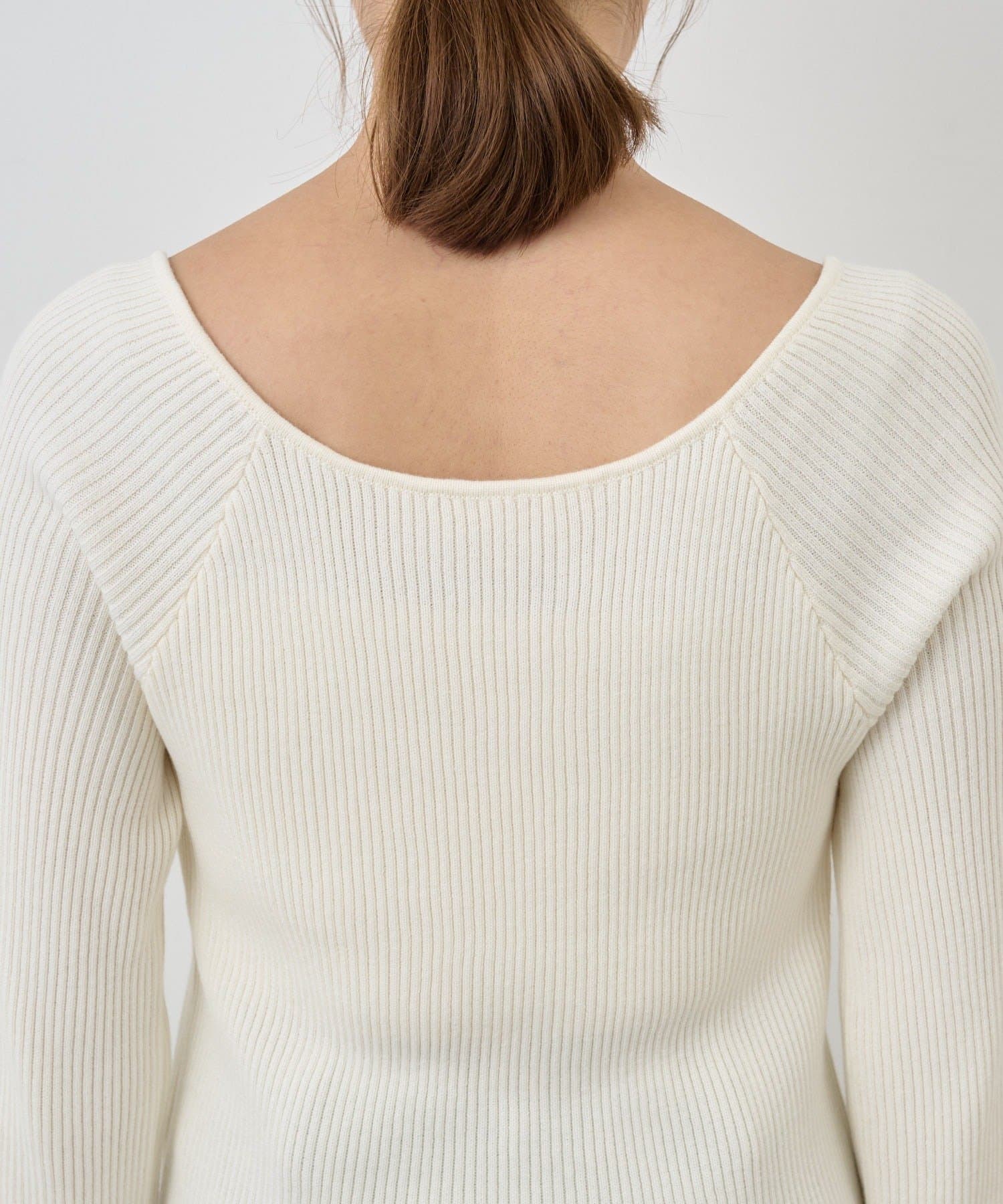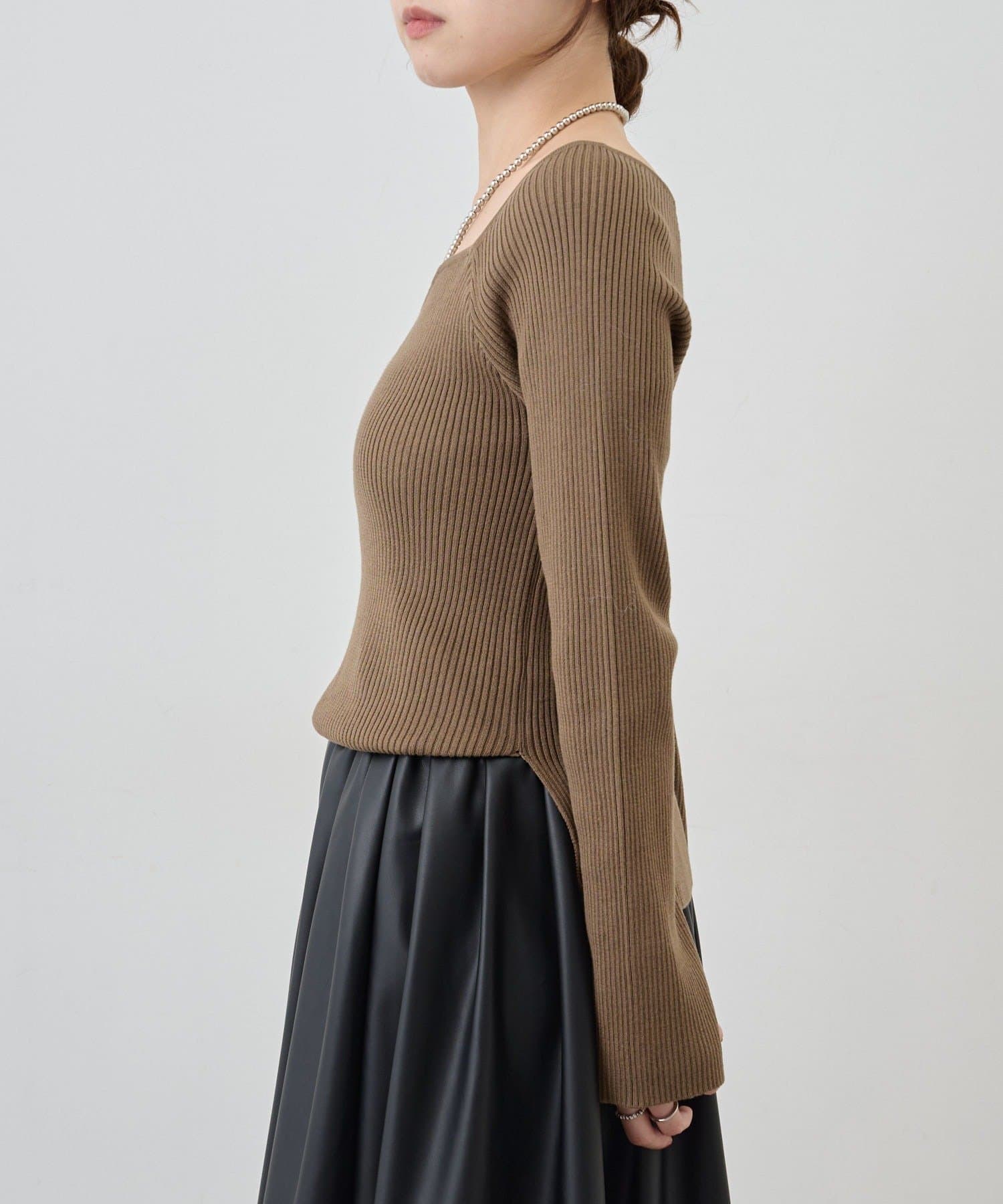 ニュアンスのある首元で、デコルテがきれいに見えるようにこだわったデザインのニット。