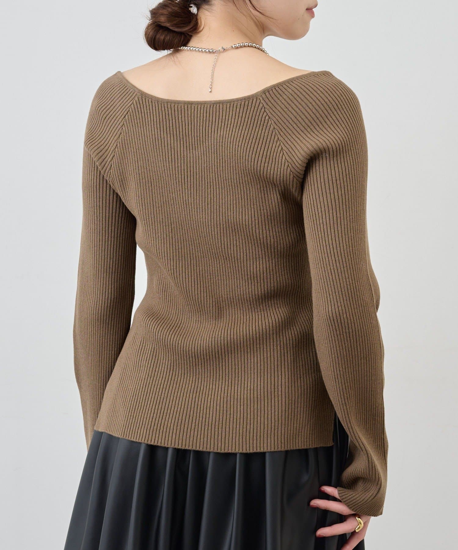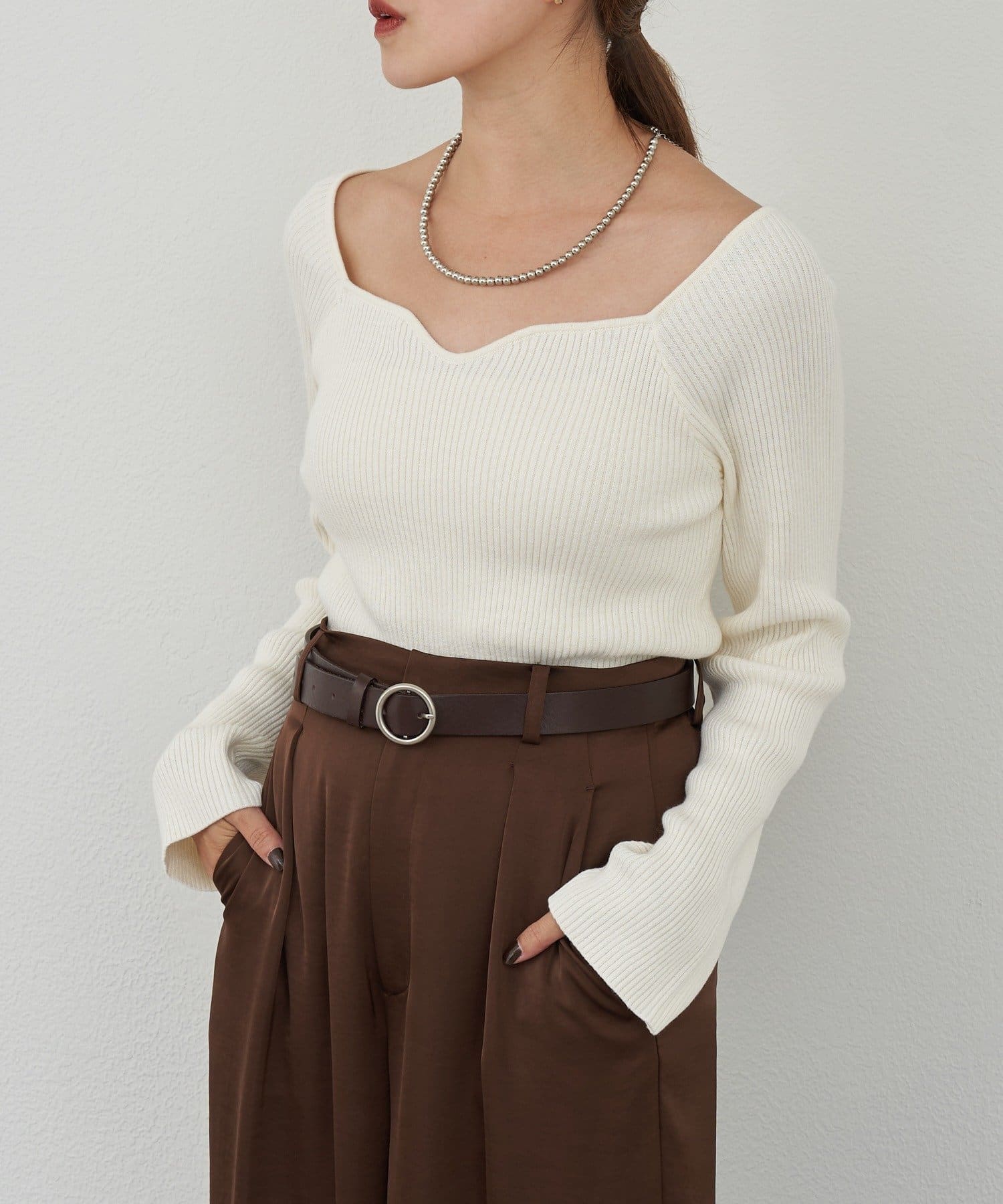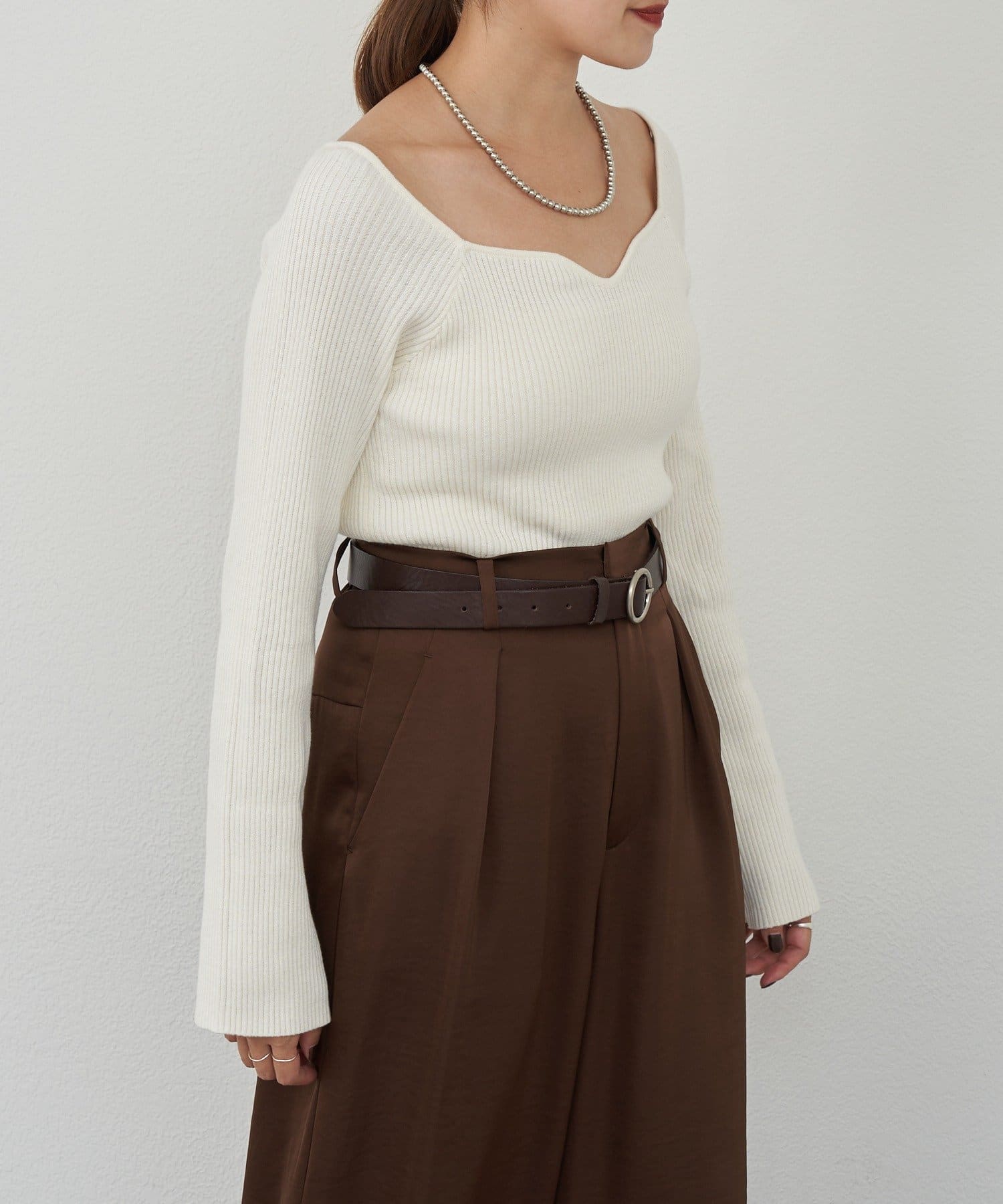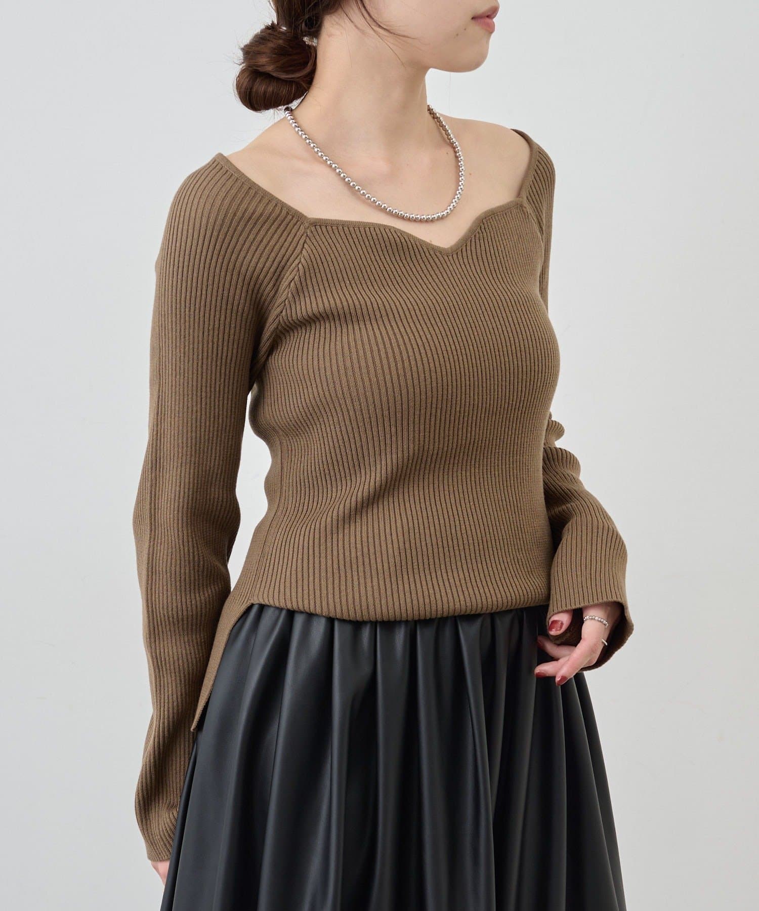 ニュアンスのある首元で、デコルテがきれいに見えるようにこだわったデザインのニット。