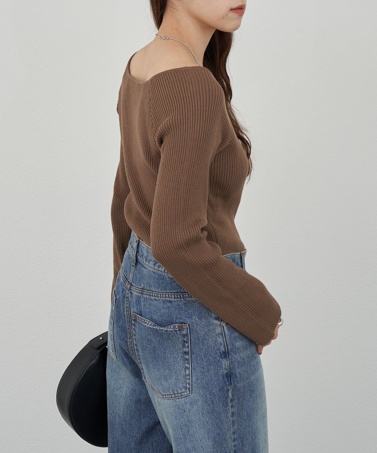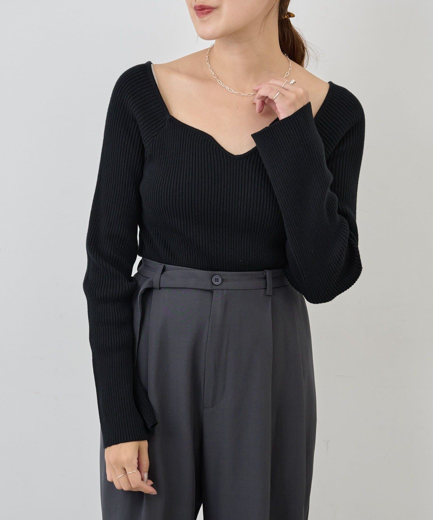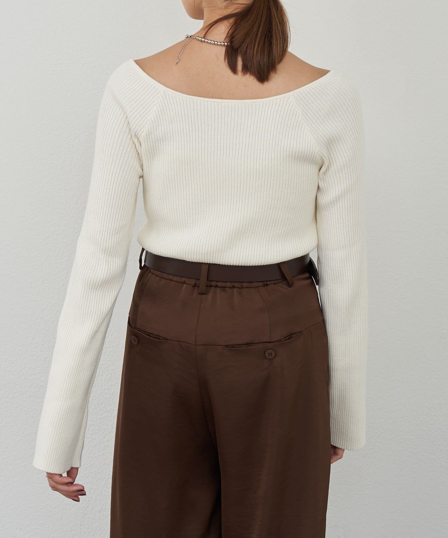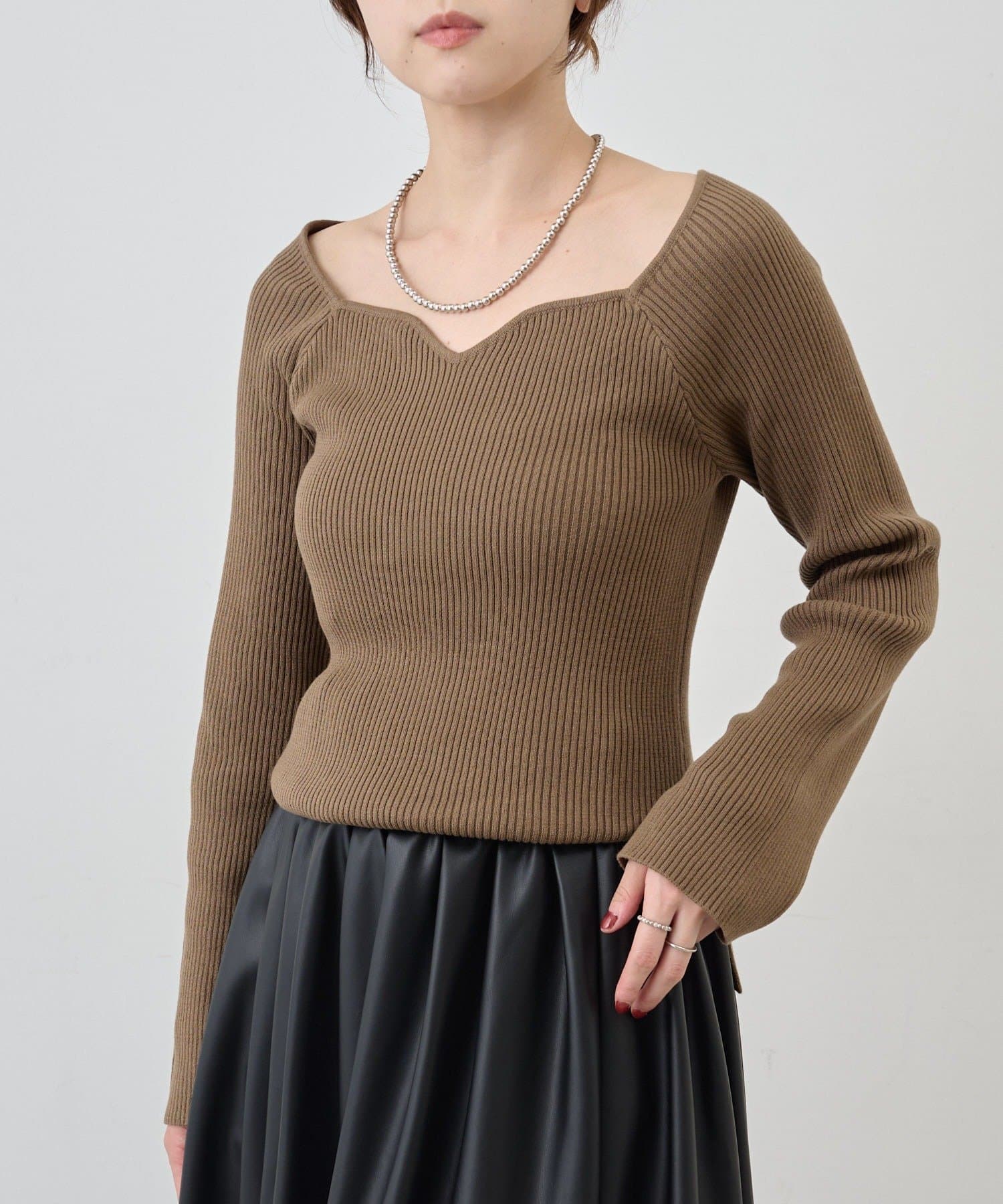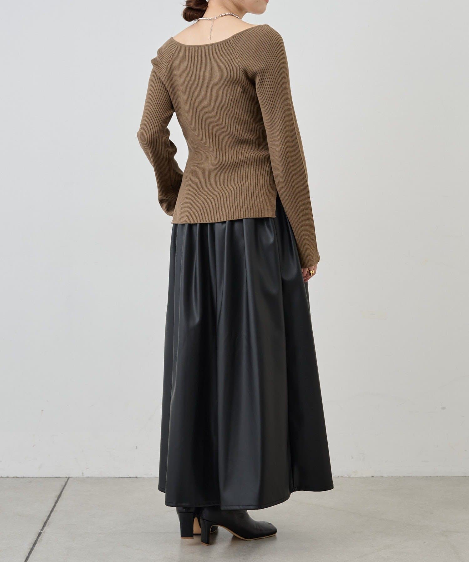 ニュアンスのある首元で、デコルテがきれいに見えるようにこだわったデザインのニット。