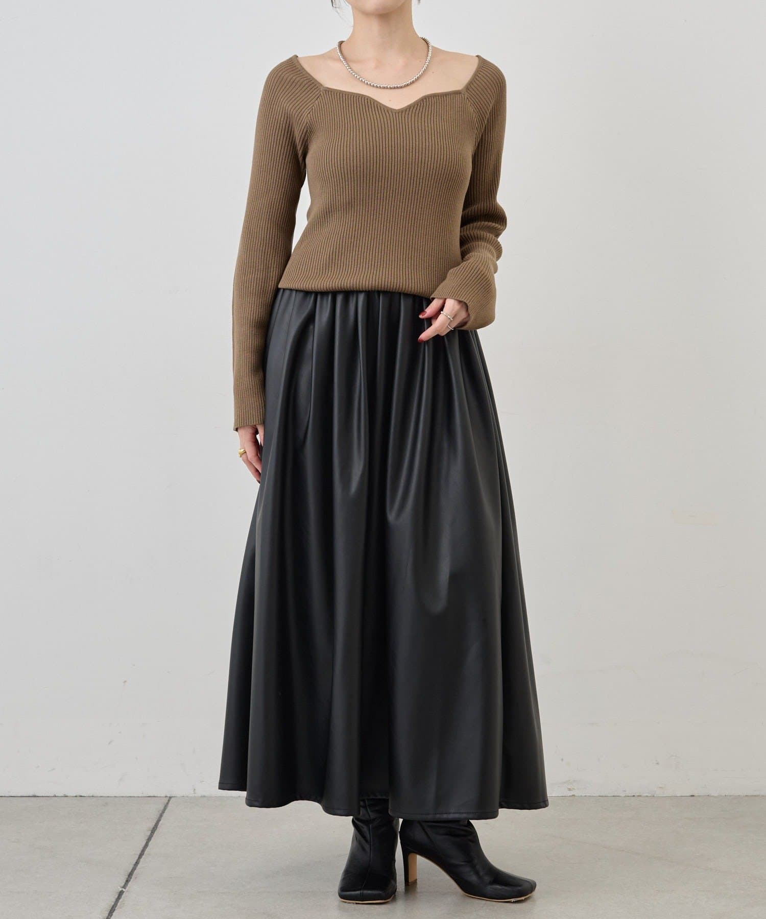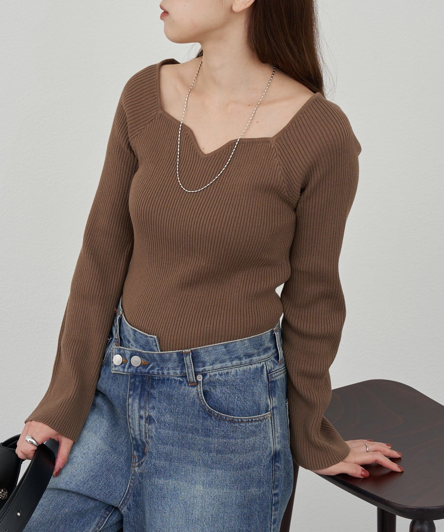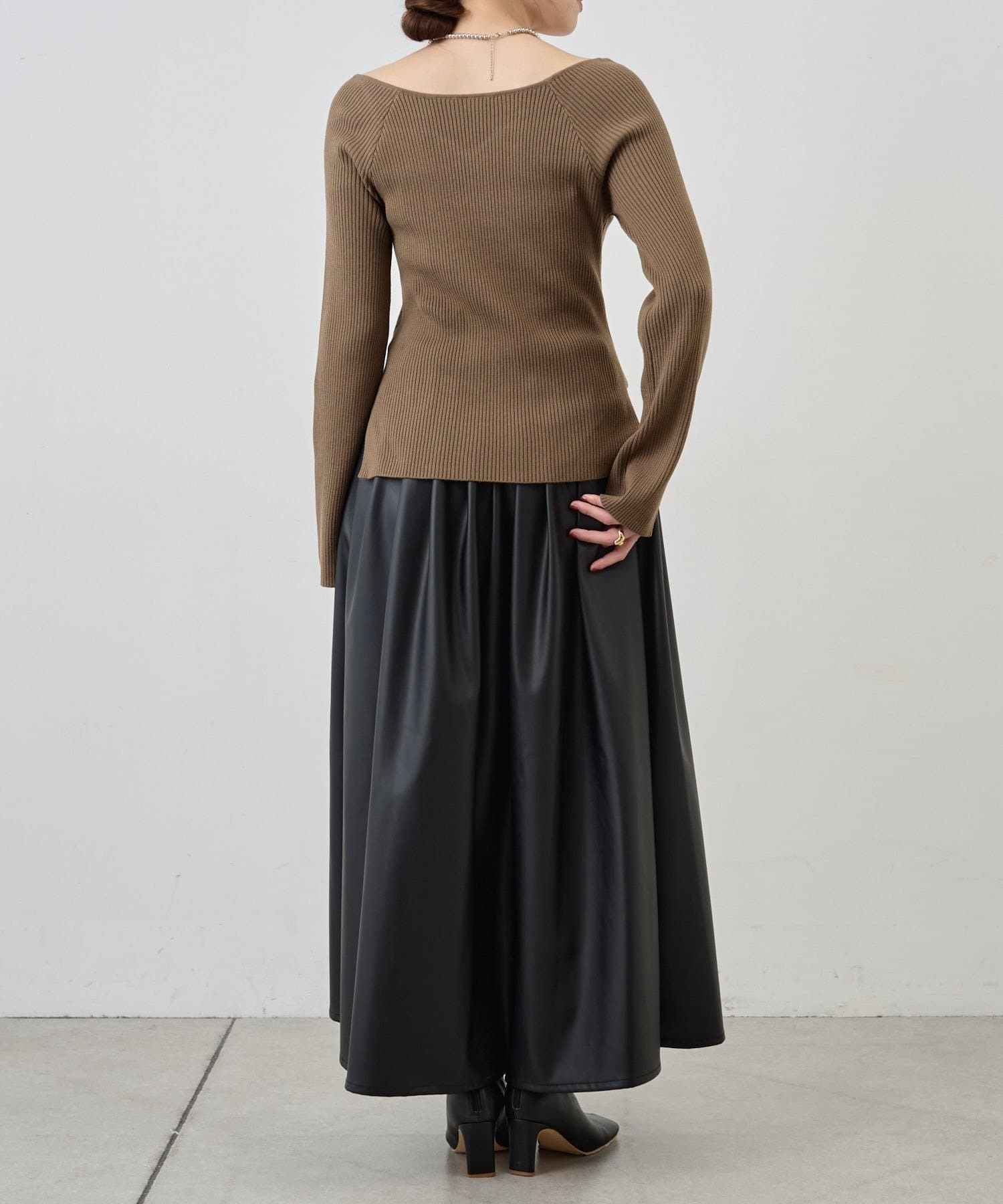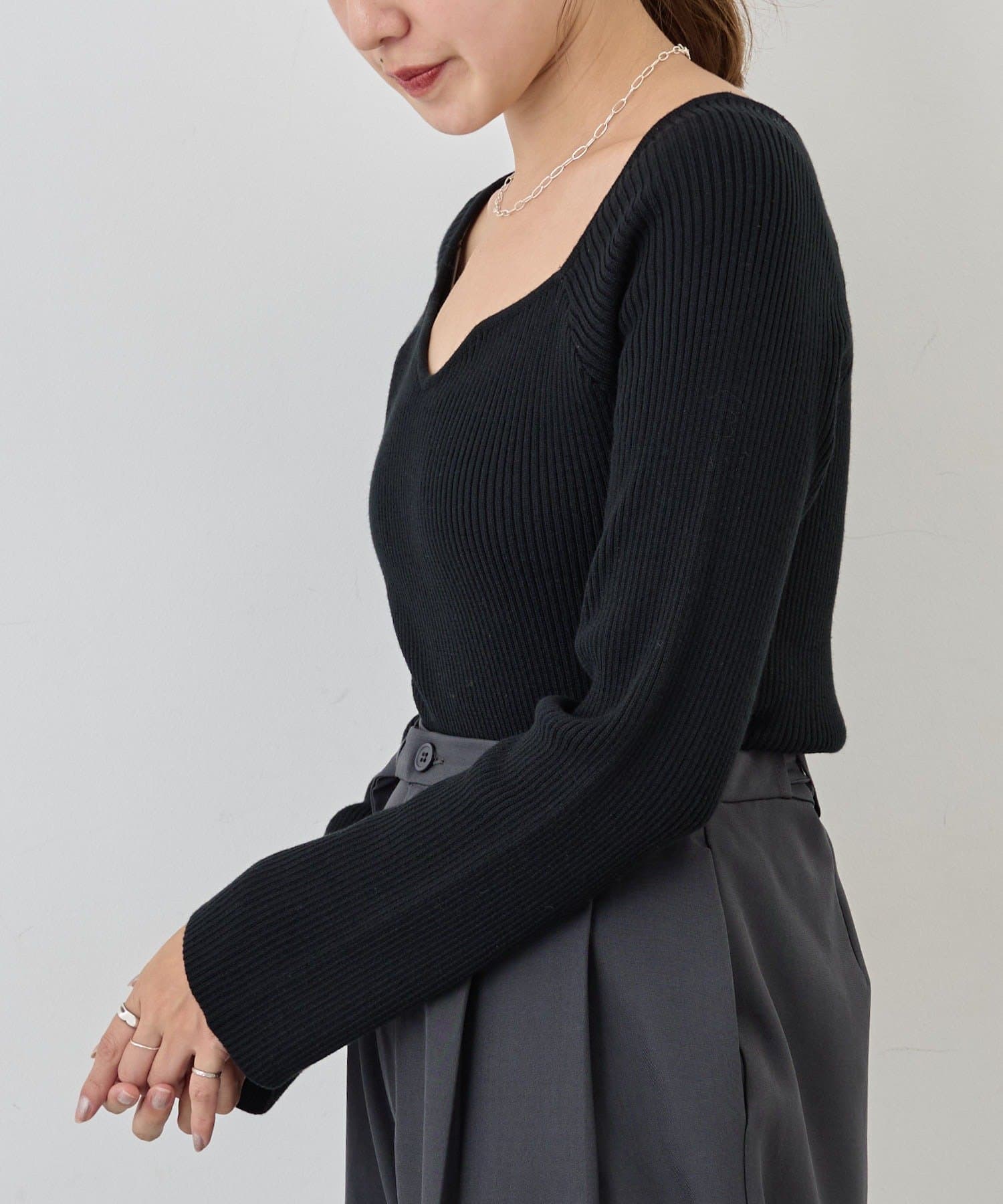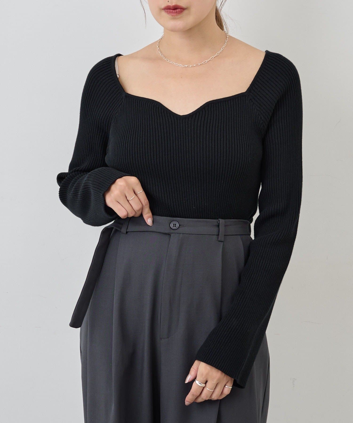 ニュアンスのある首元で、デコルテがきれいに見えるようにこだわったデザインのニット。