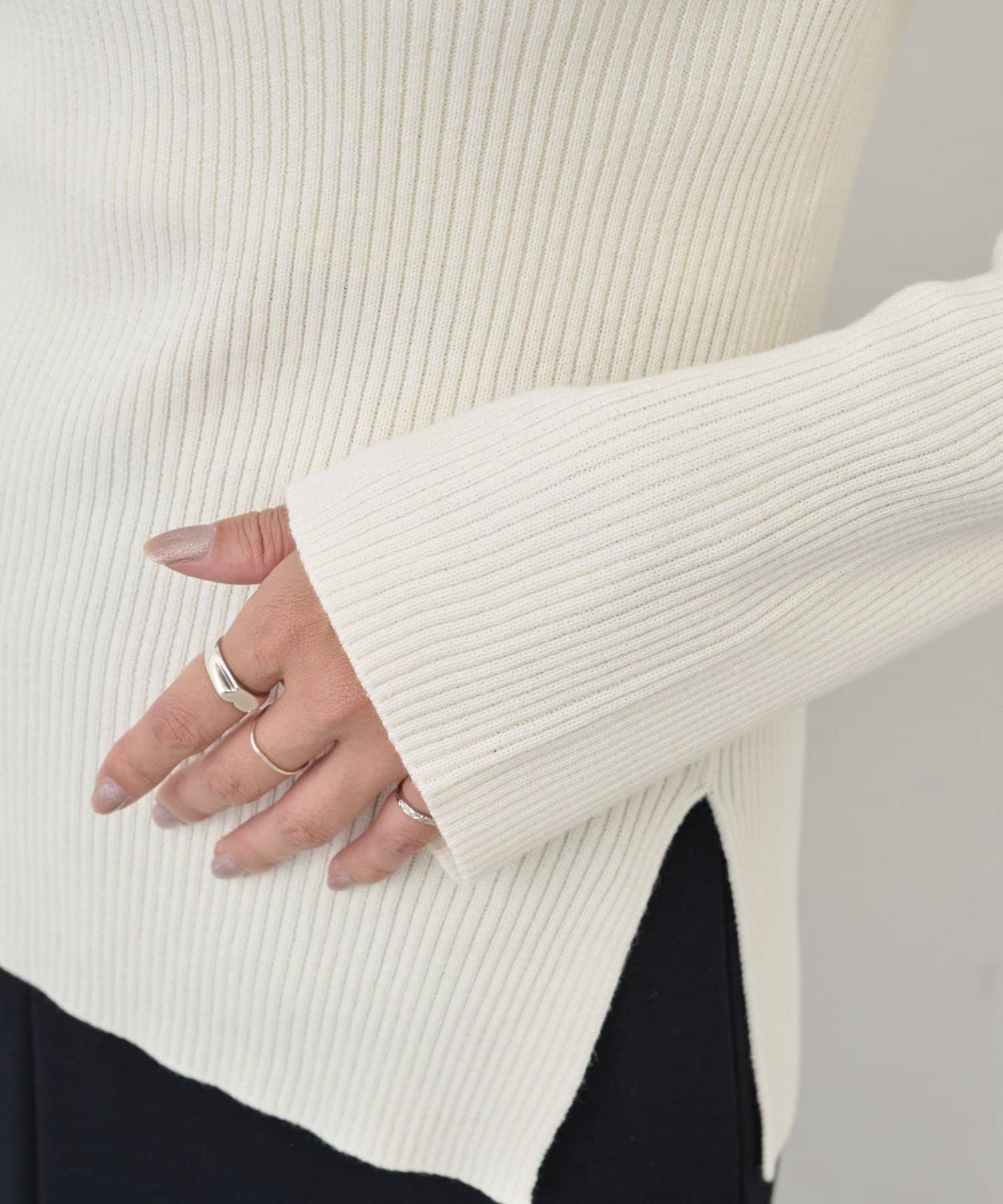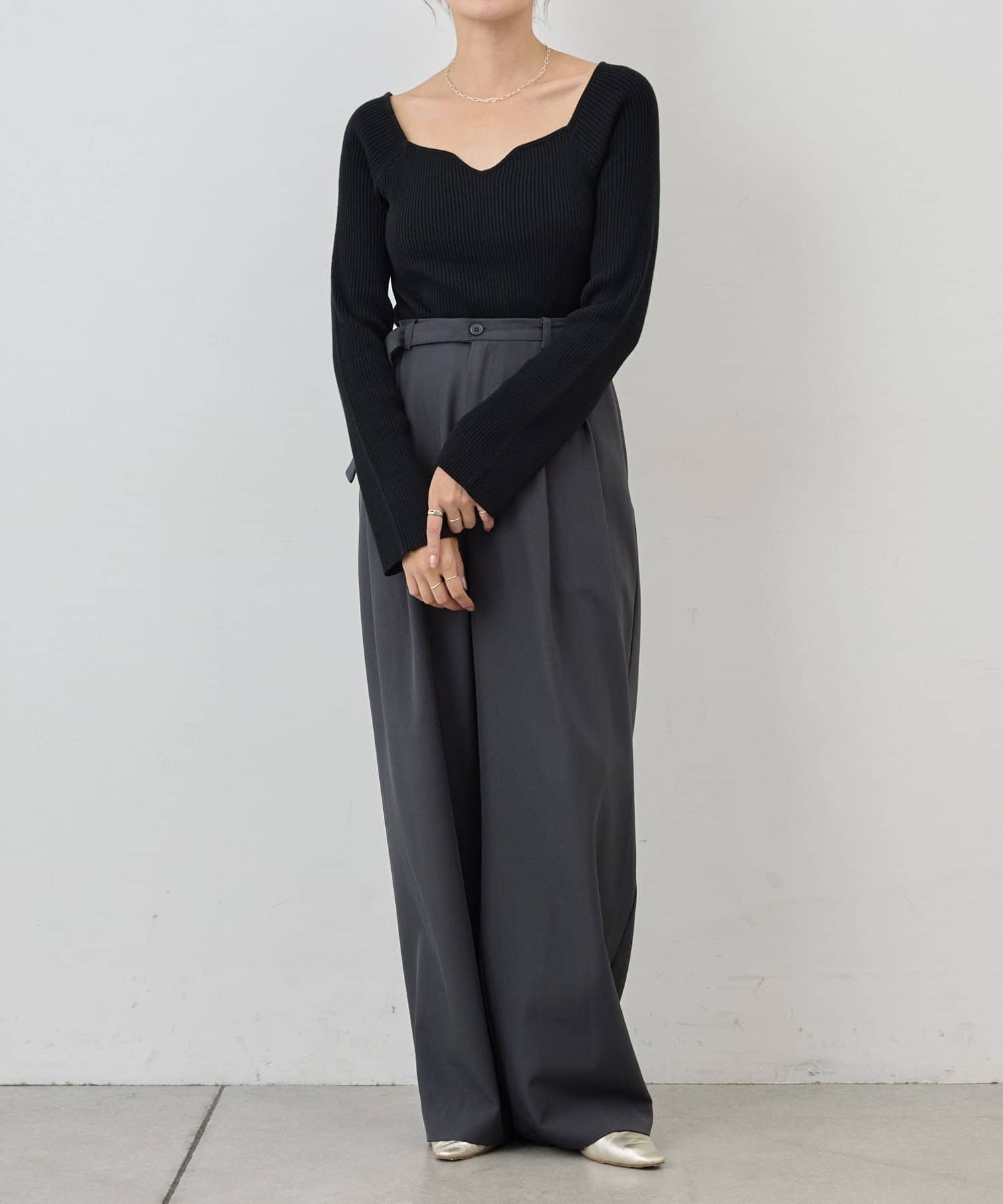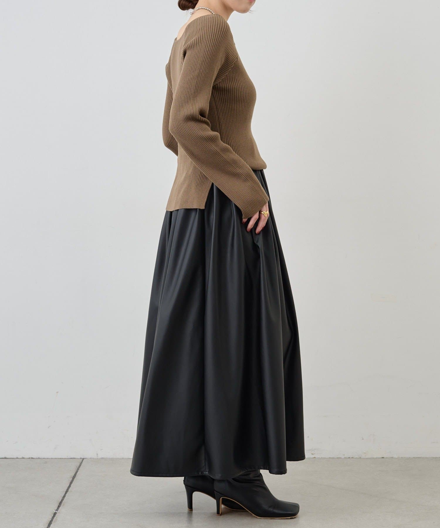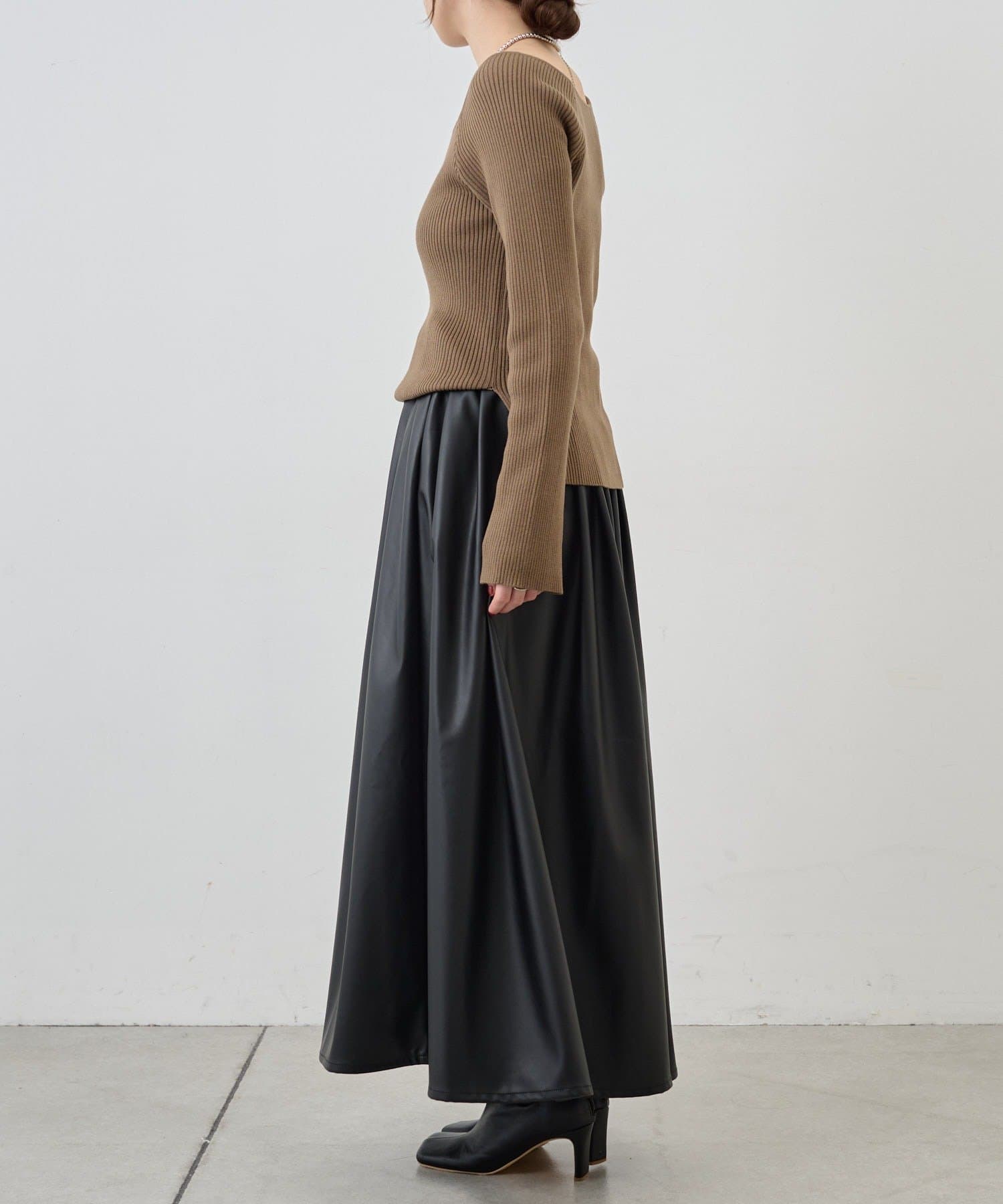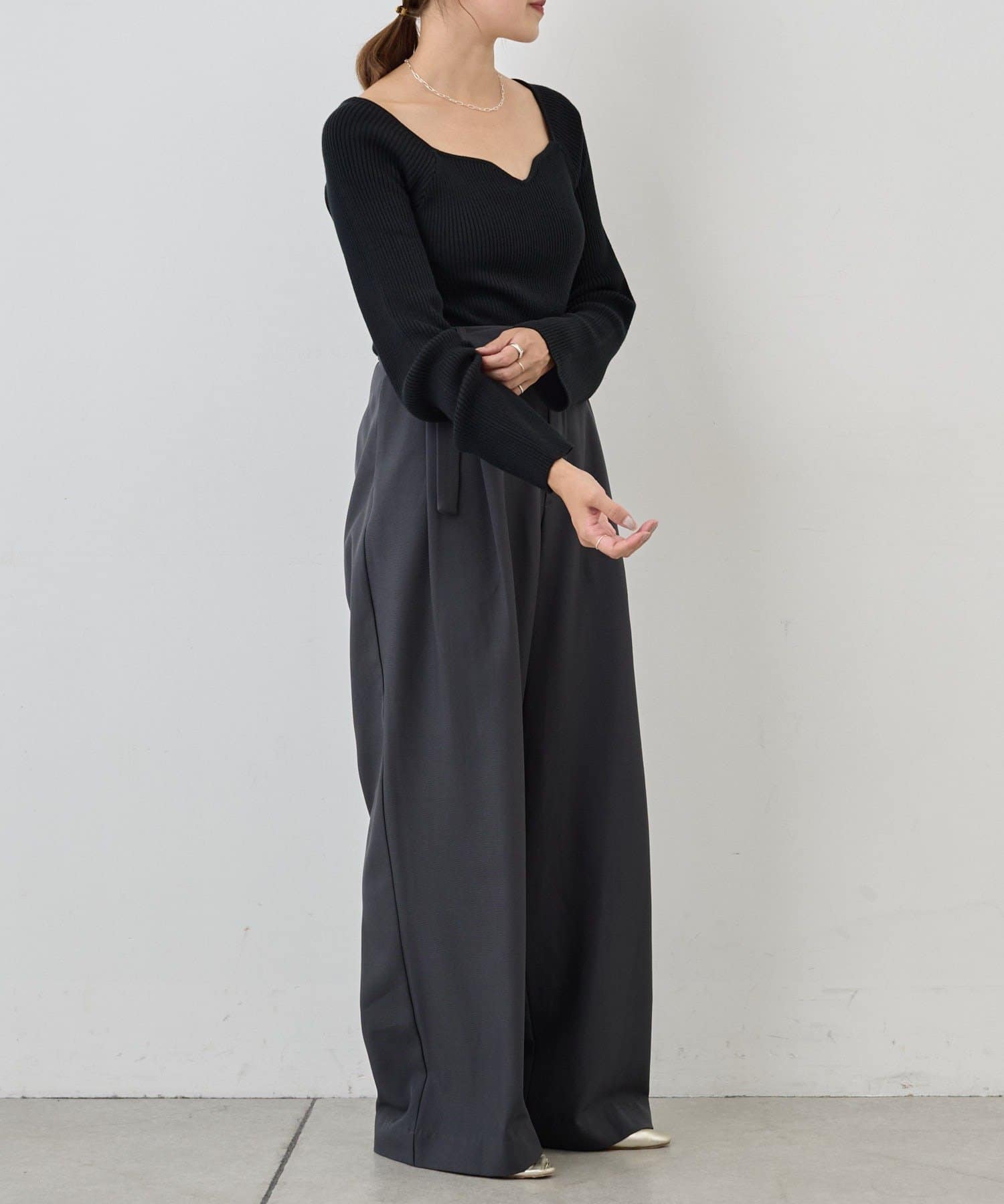 ニュアンスのある首元で、デコルテがきれいに見えるようにこだわったデザインのニット。