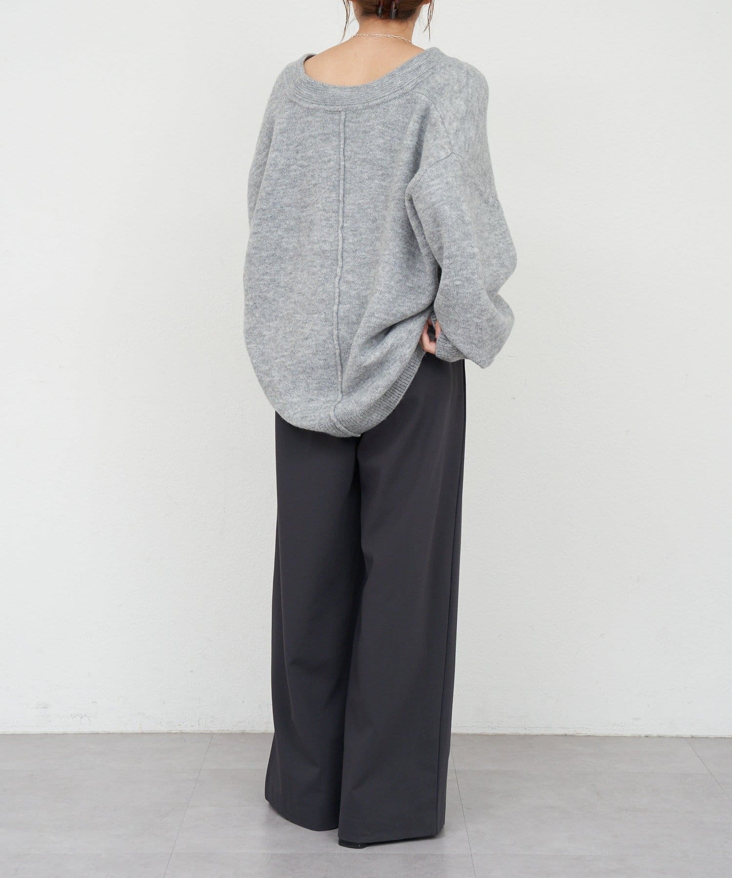 ・トレンドの深めのVネックは、ほんのりカーブで女性らしさをプラス。