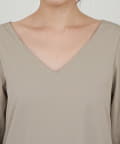 デコルテを美しく引き立てるVネックが、顔周りにほど良い抜け感を演出。
