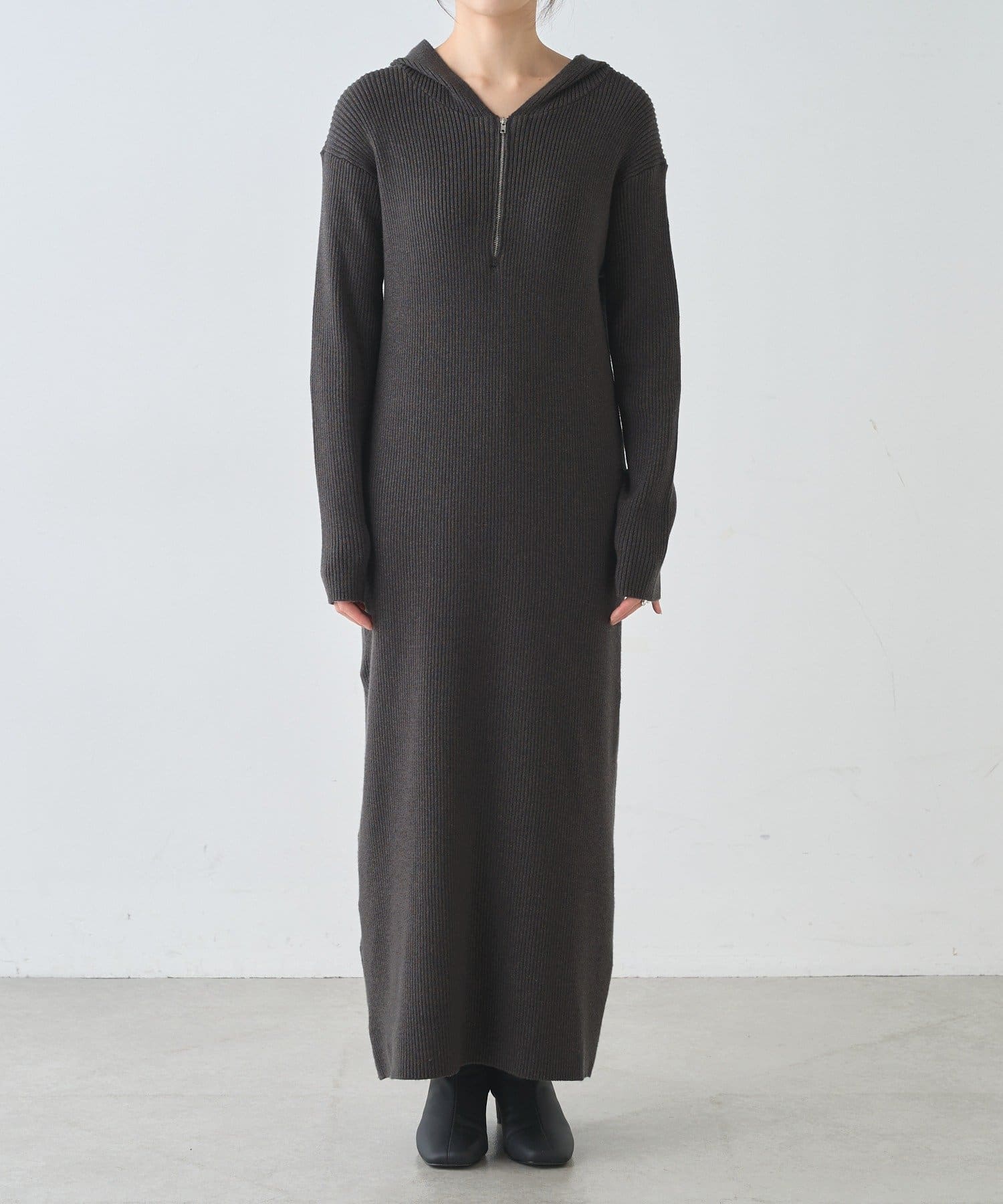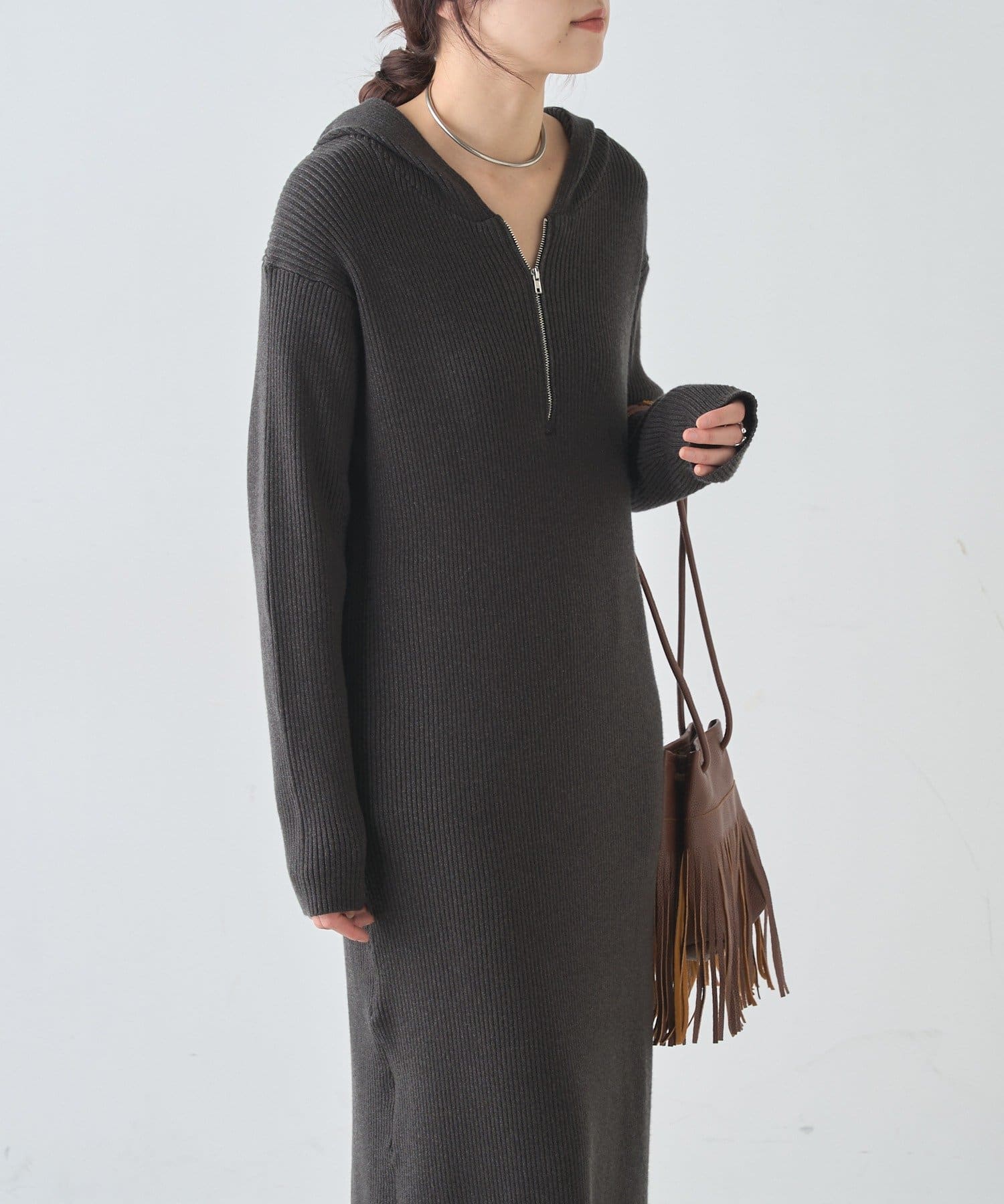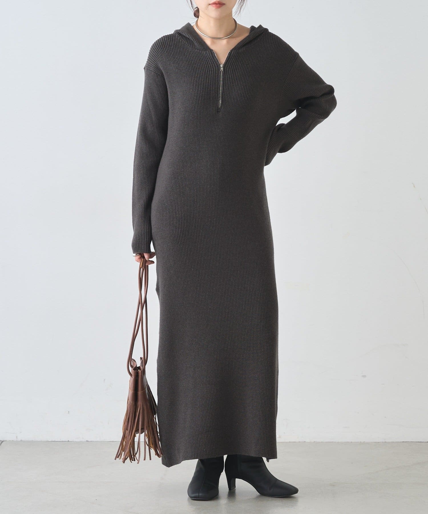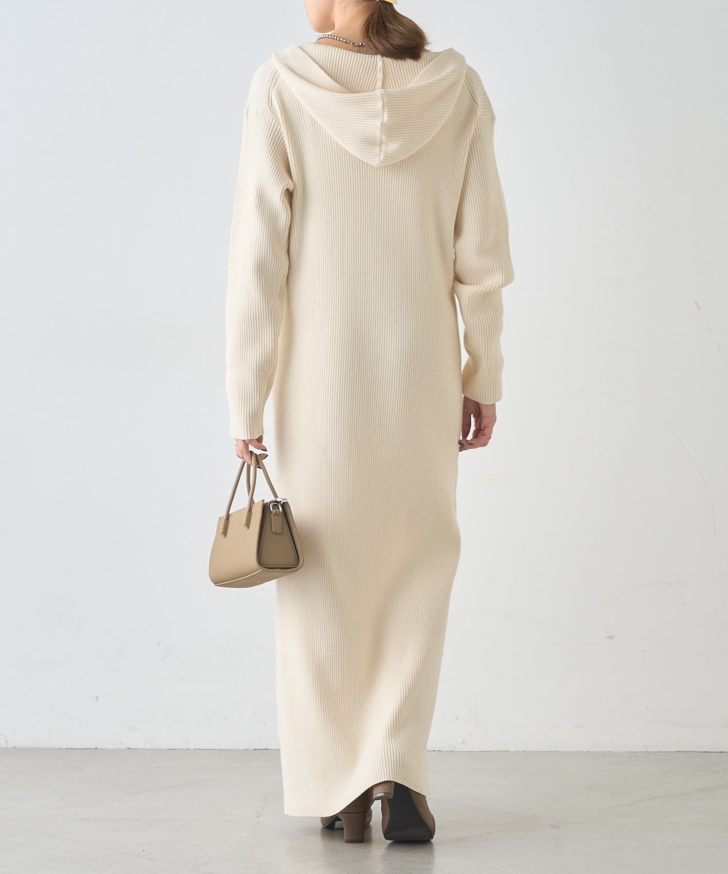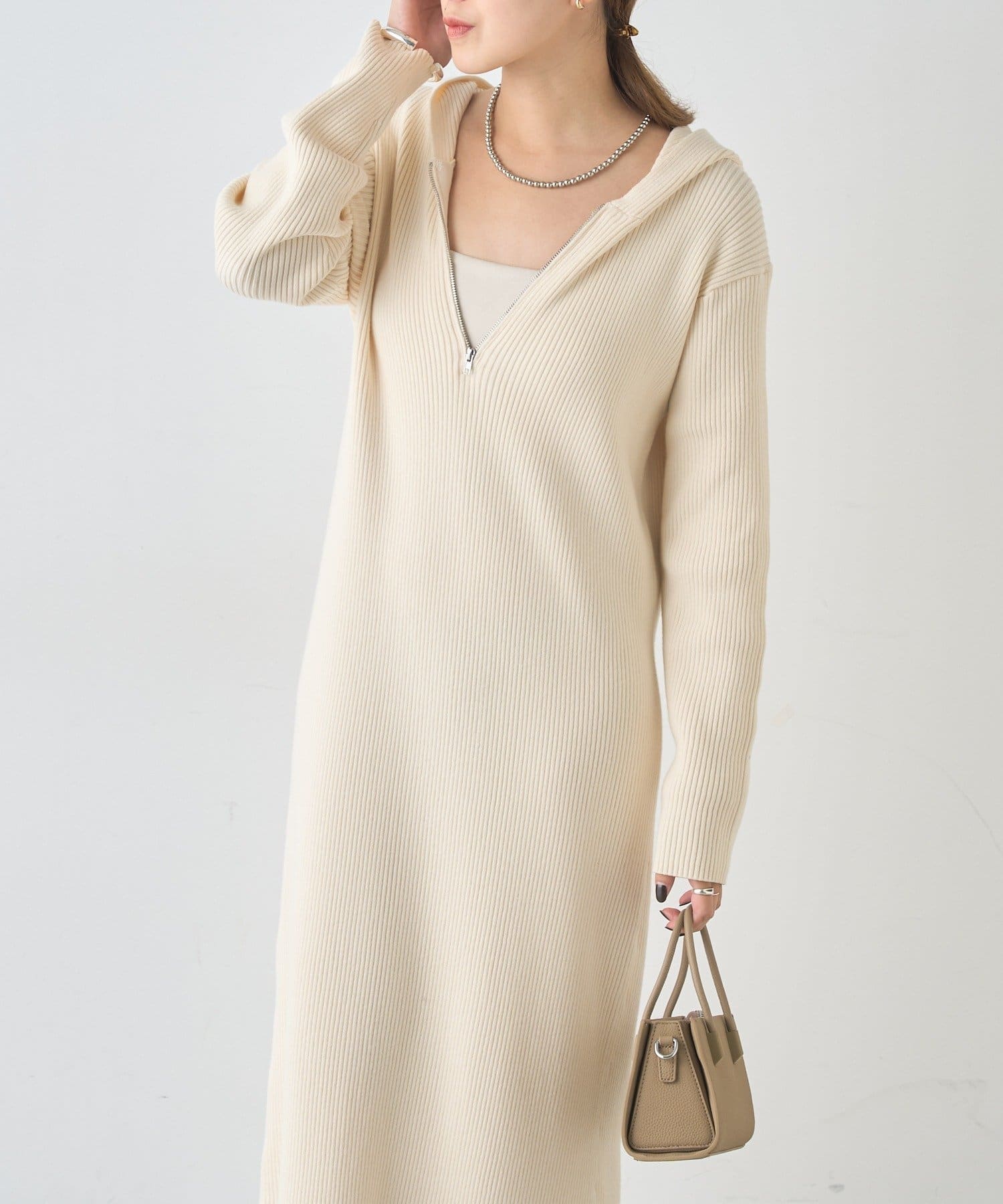カジュアルコーデにもピッタリ!フード付きリブニットワンピース