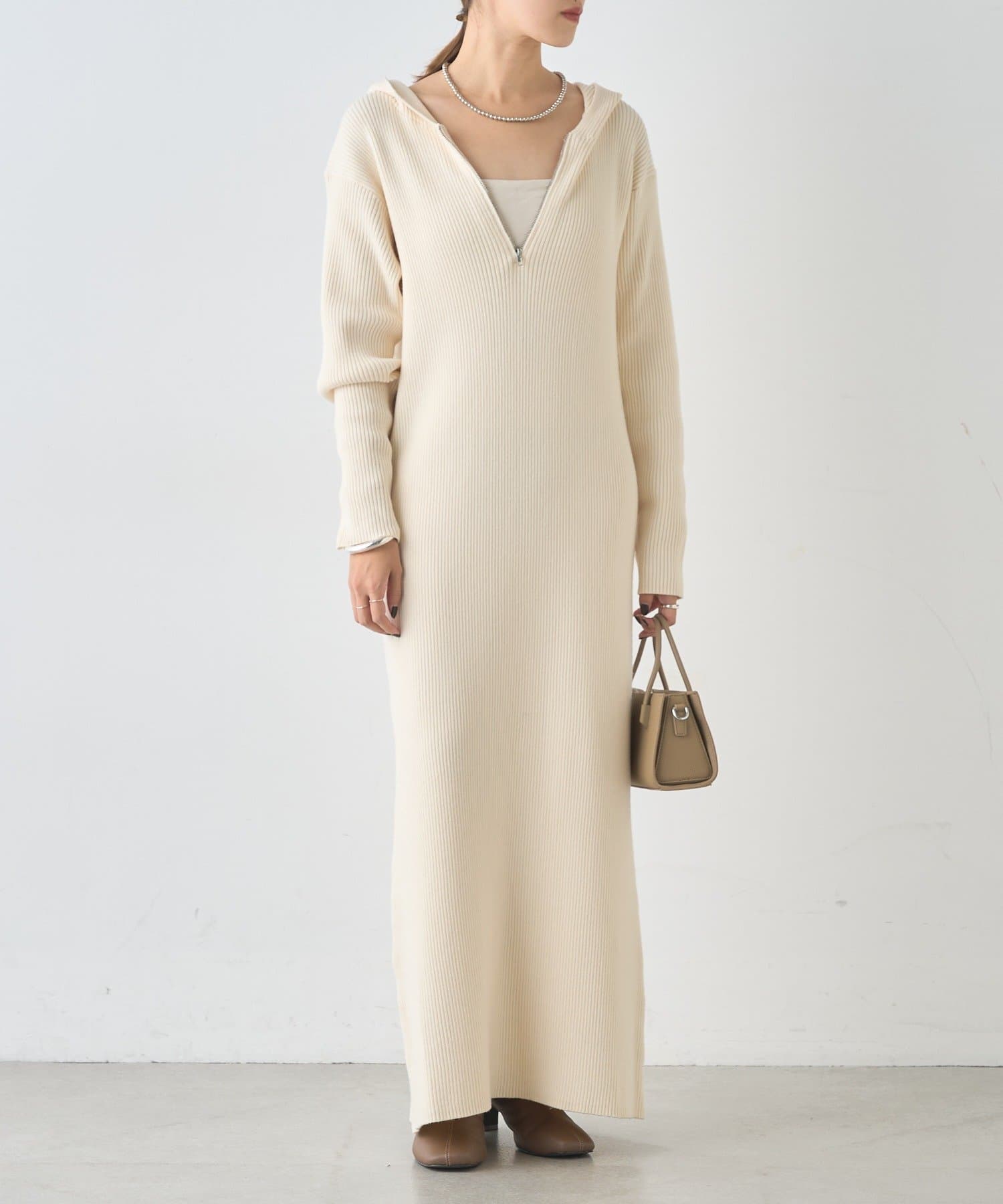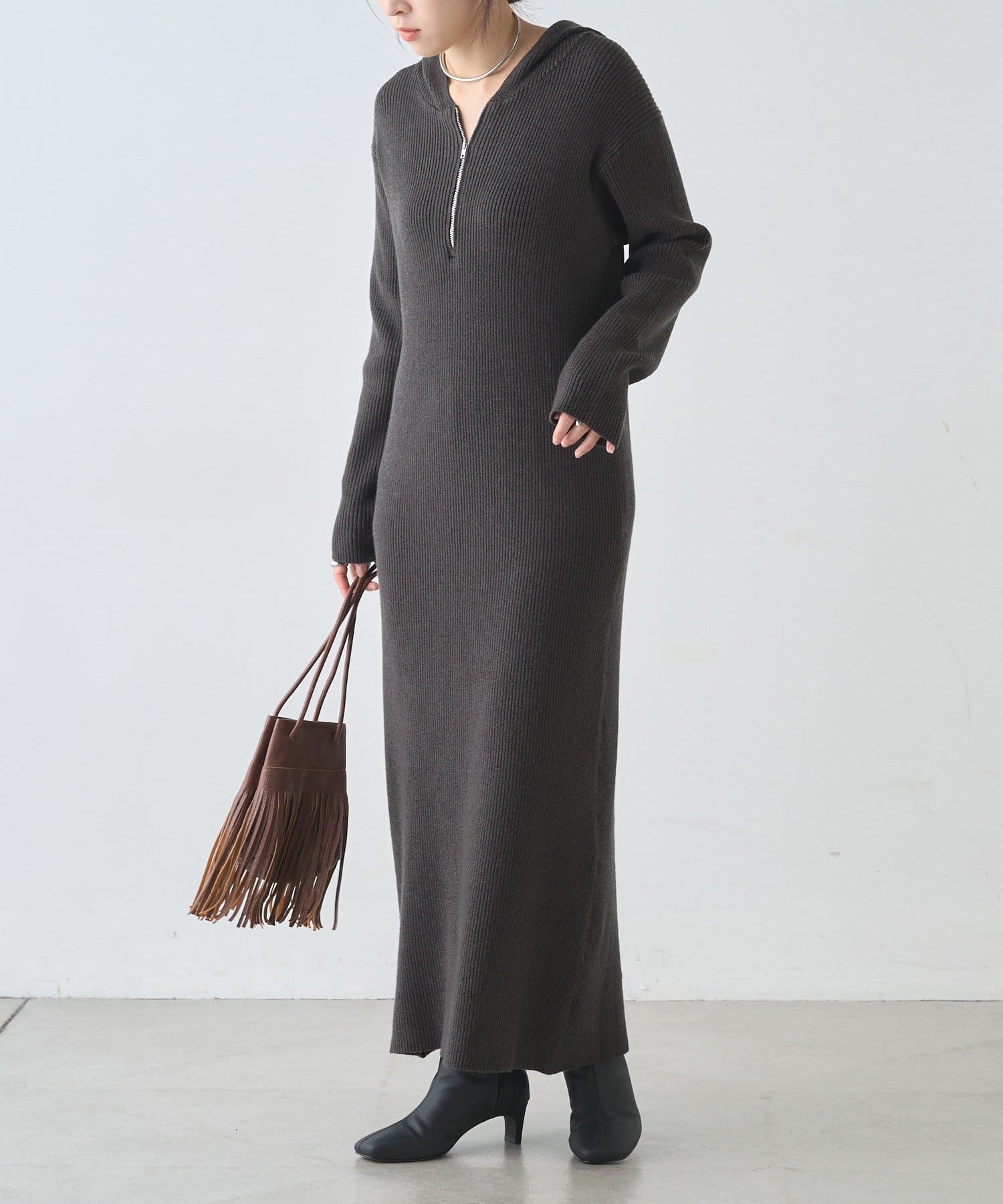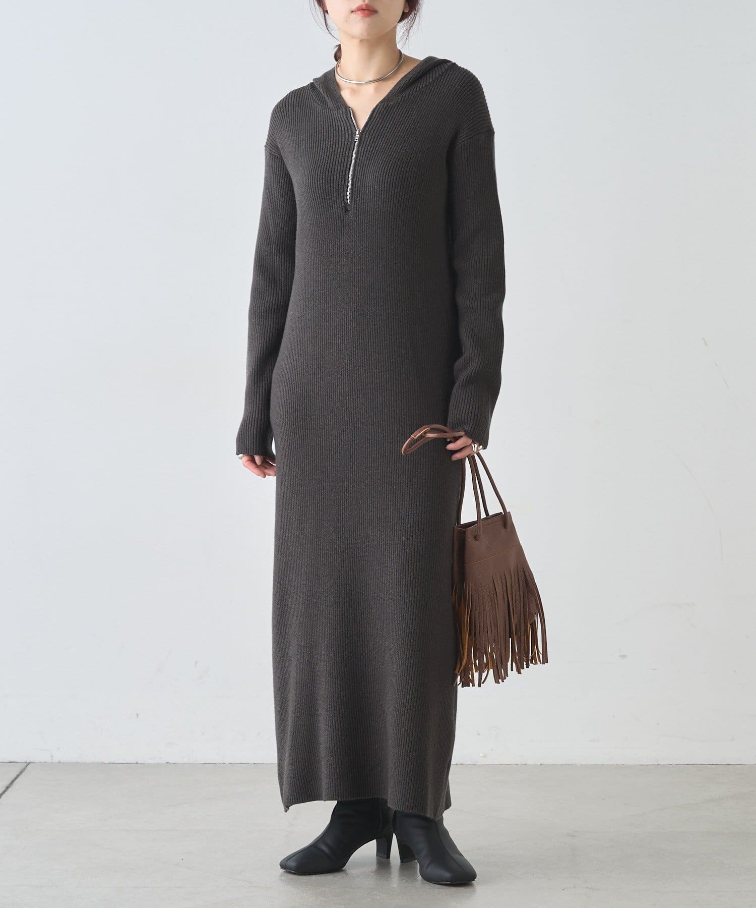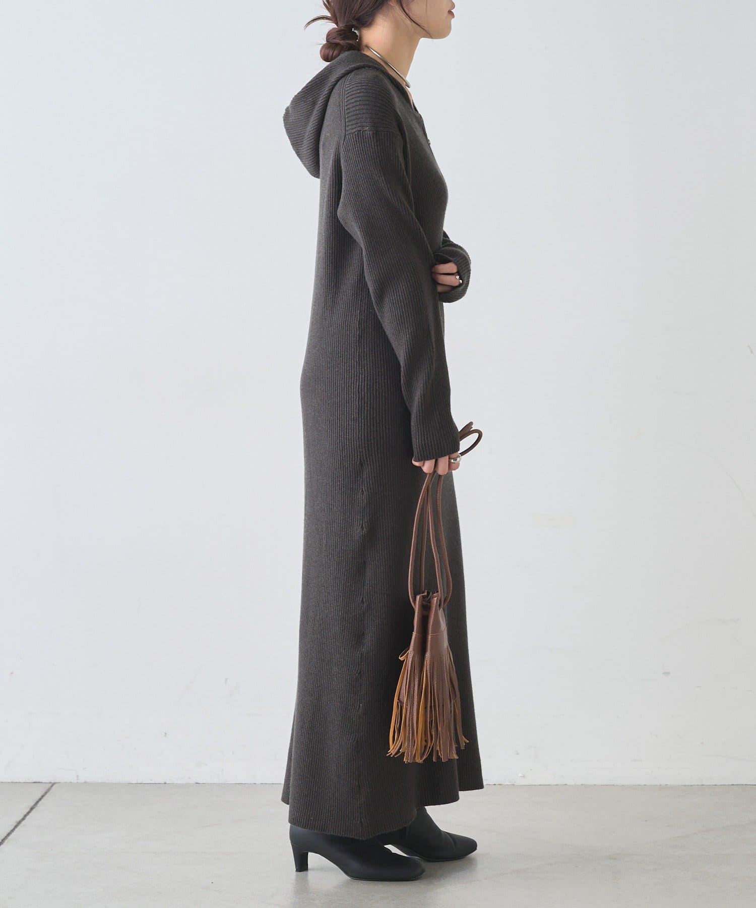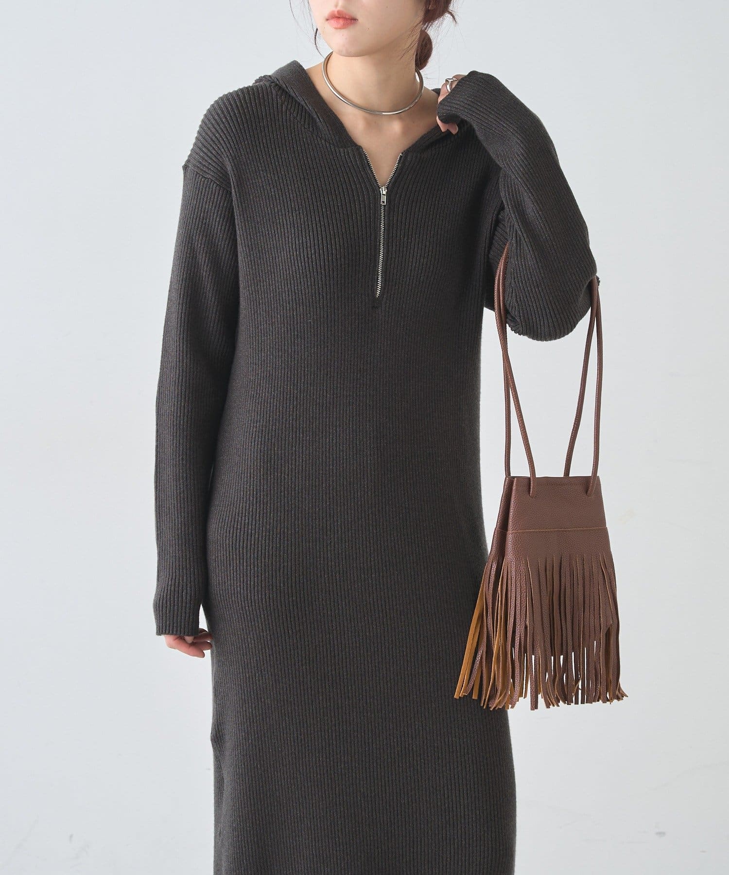 カジュアルコーデにもピッタリ!フード付きリブニットワンピース