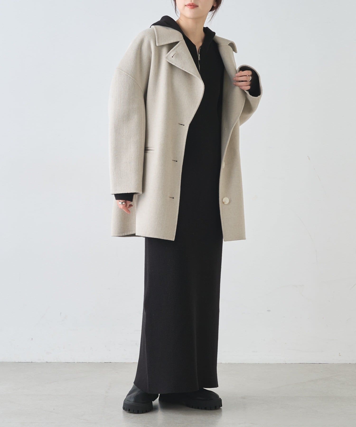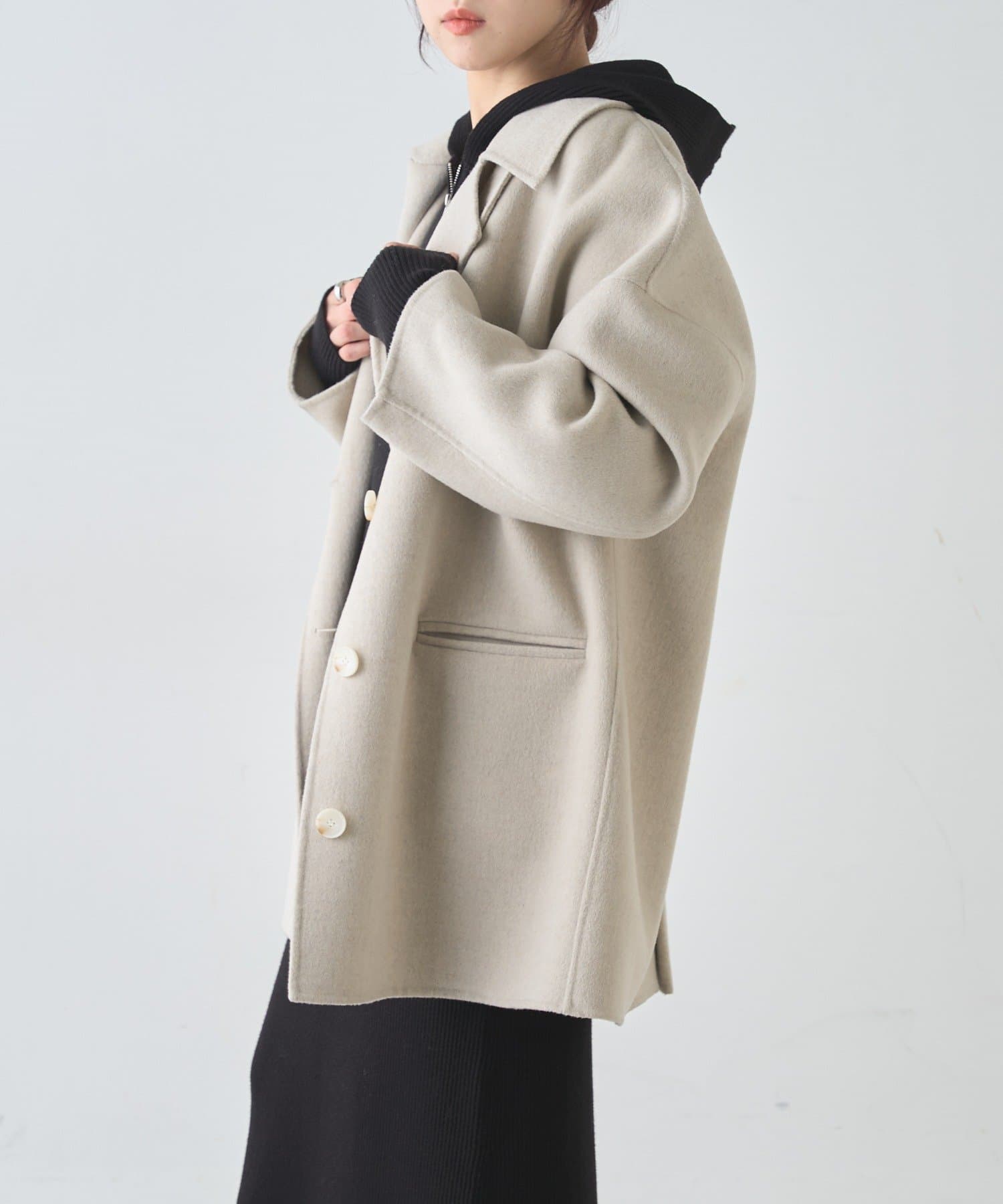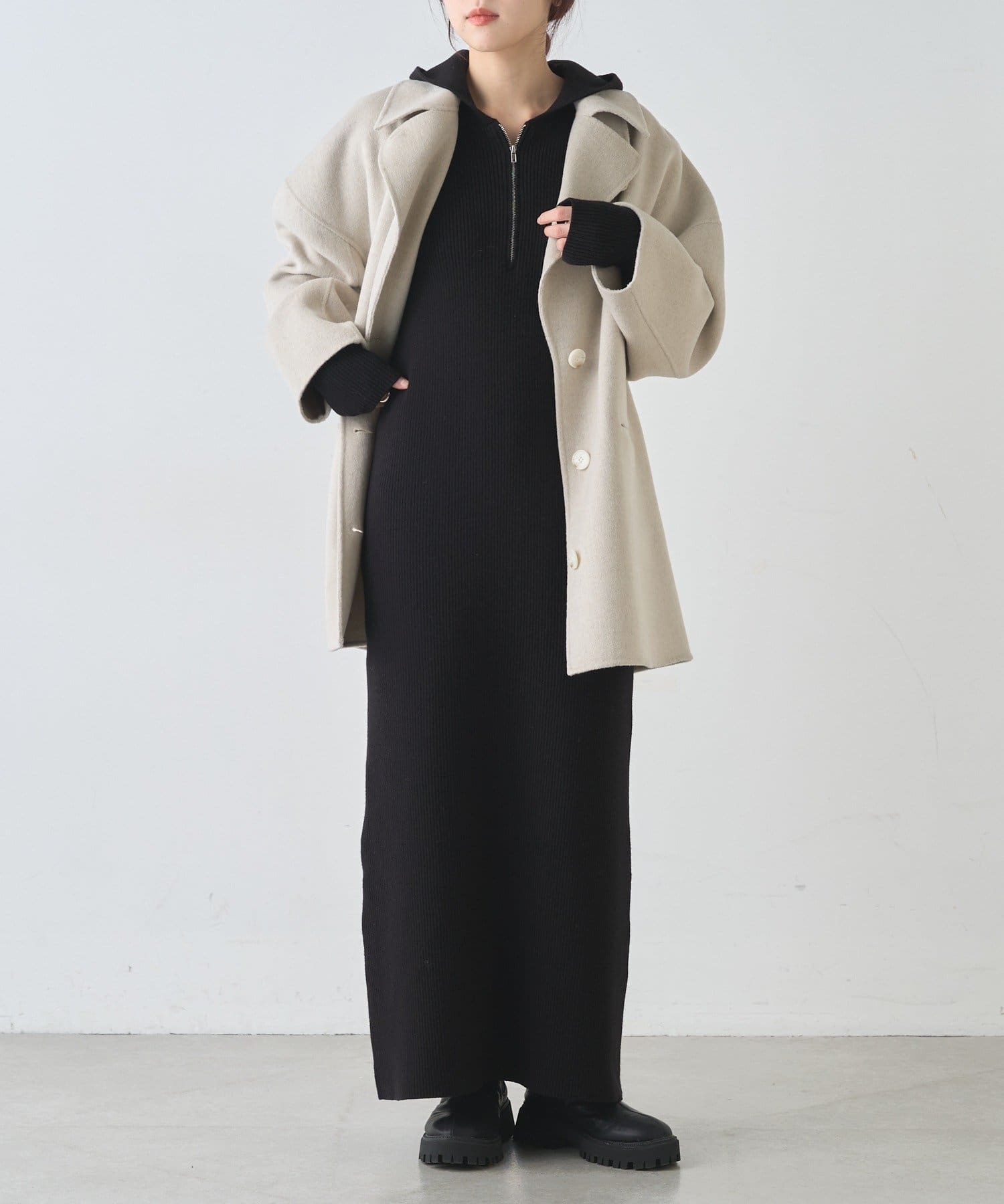 フード付きのデザインが程よいカジュアルさをプラスし、
