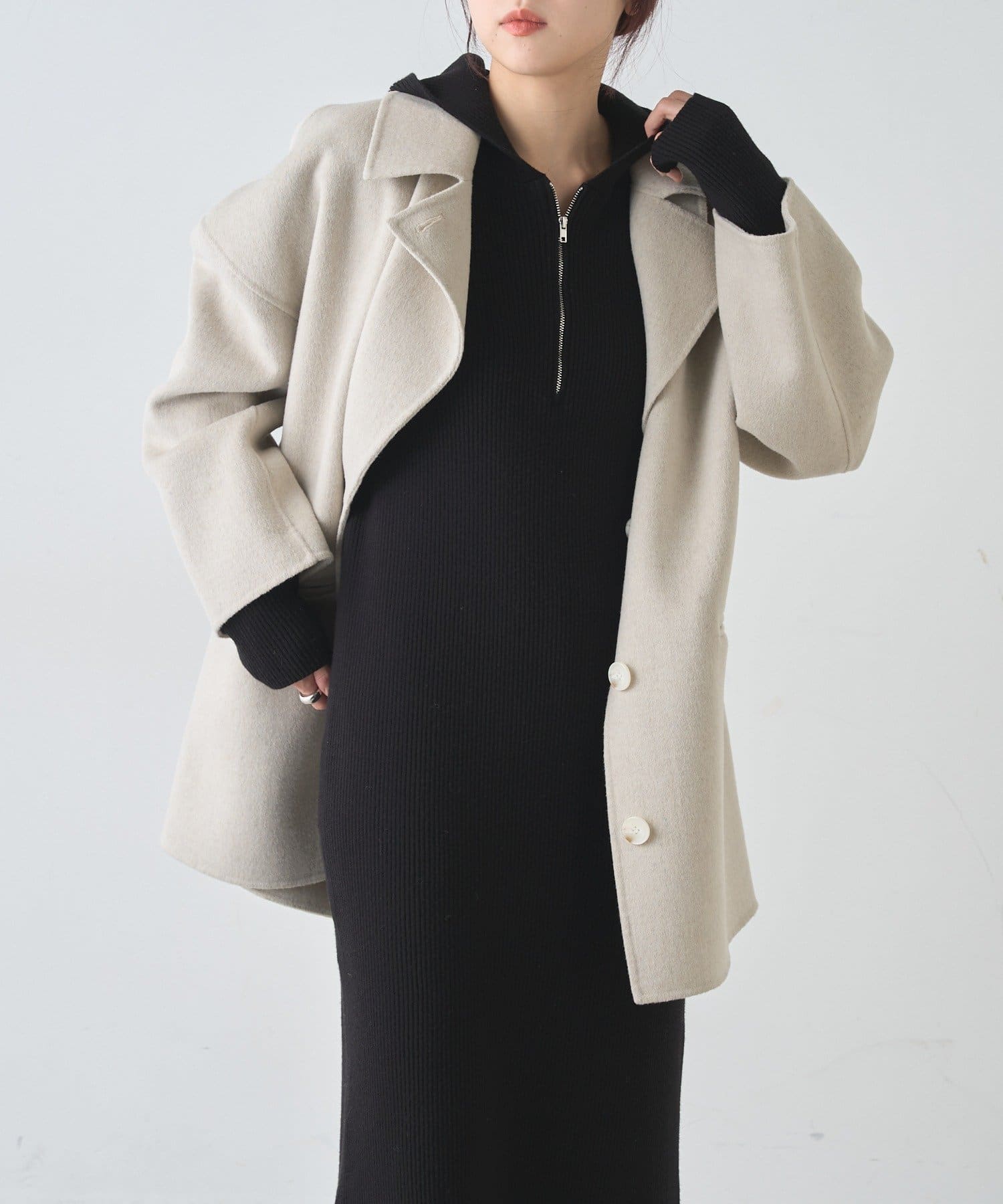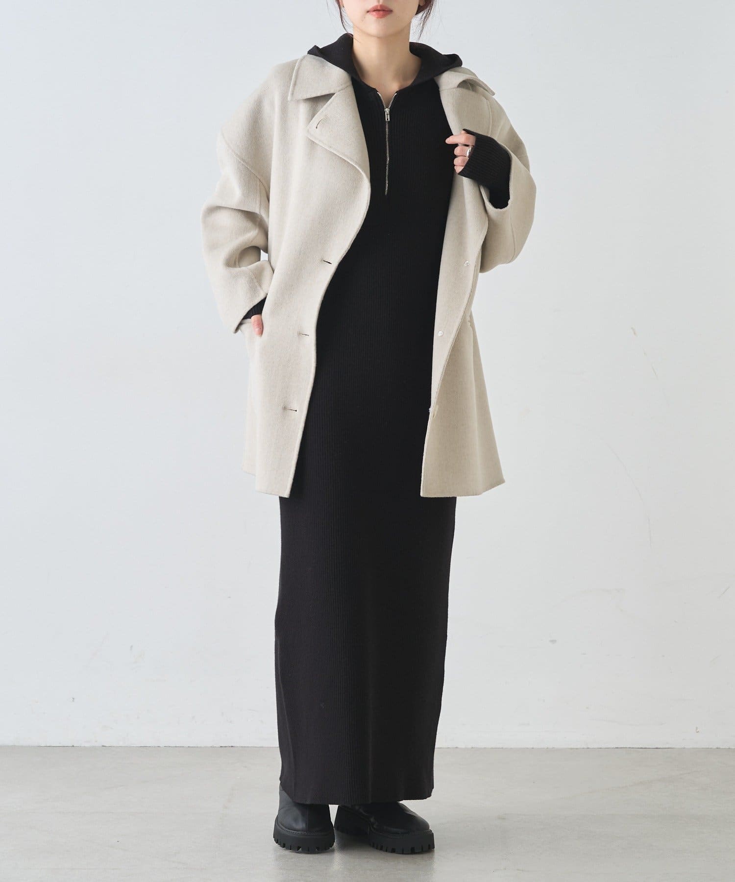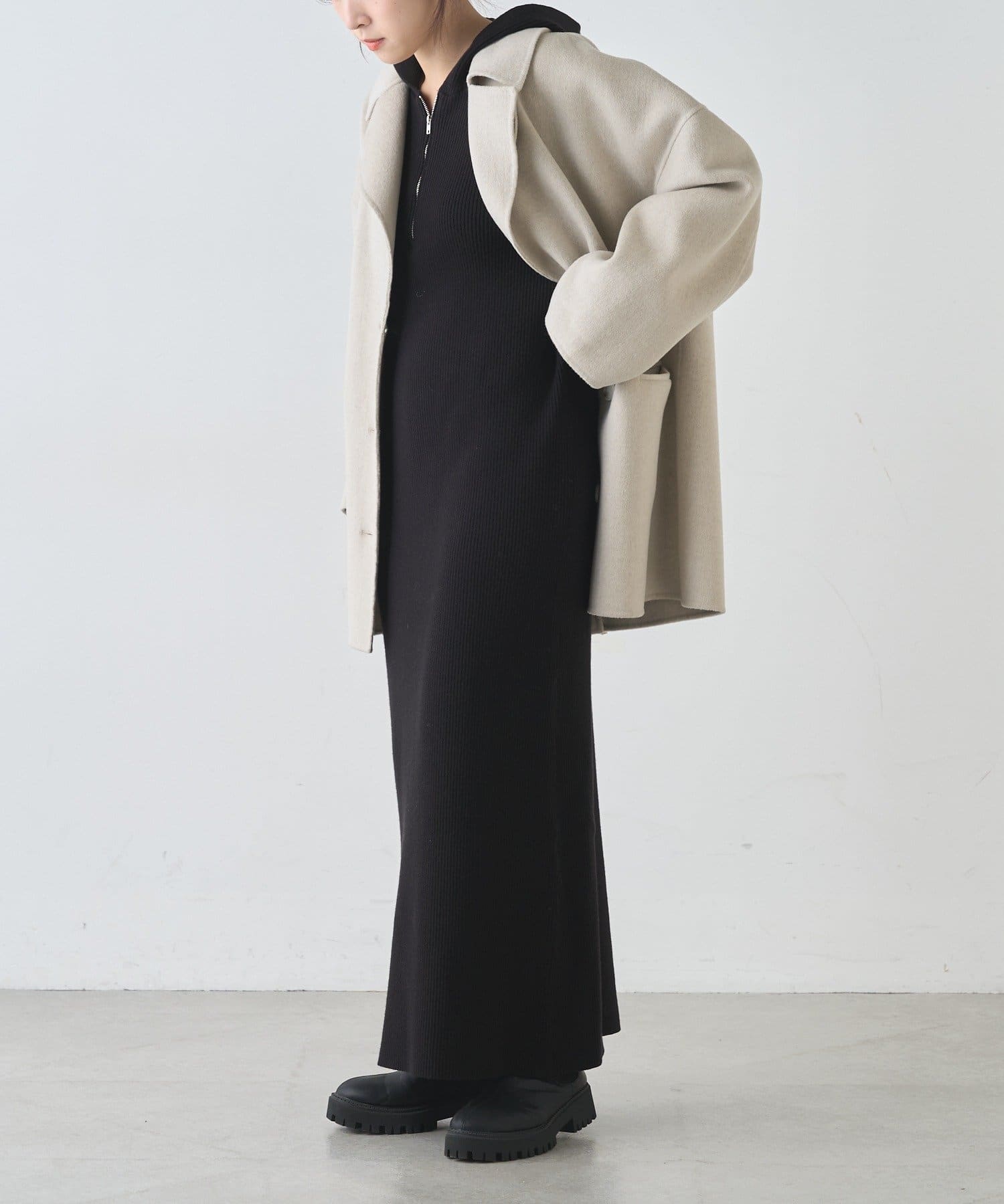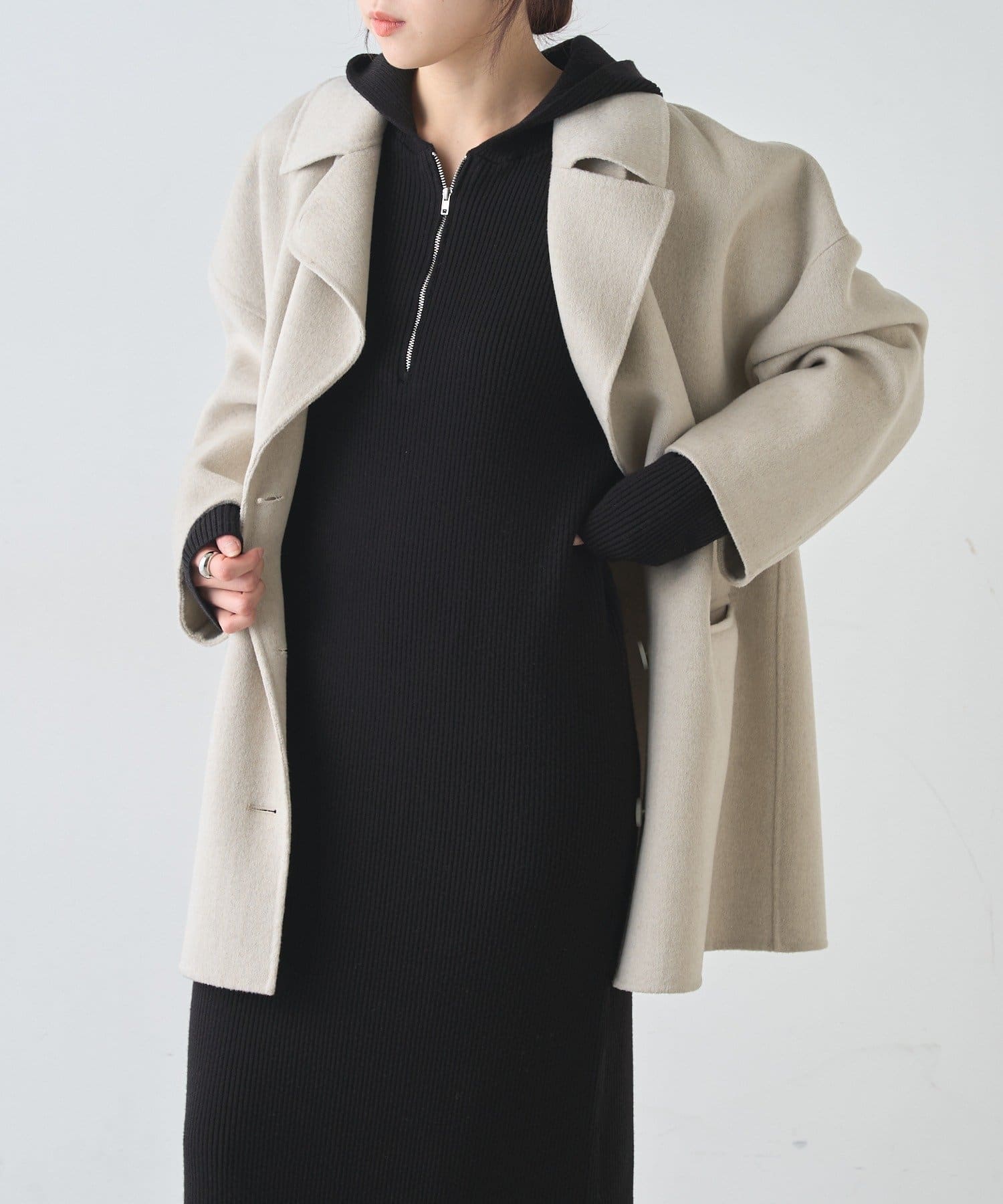 フード付きのデザインが程よいカジュアルさをプラスし、