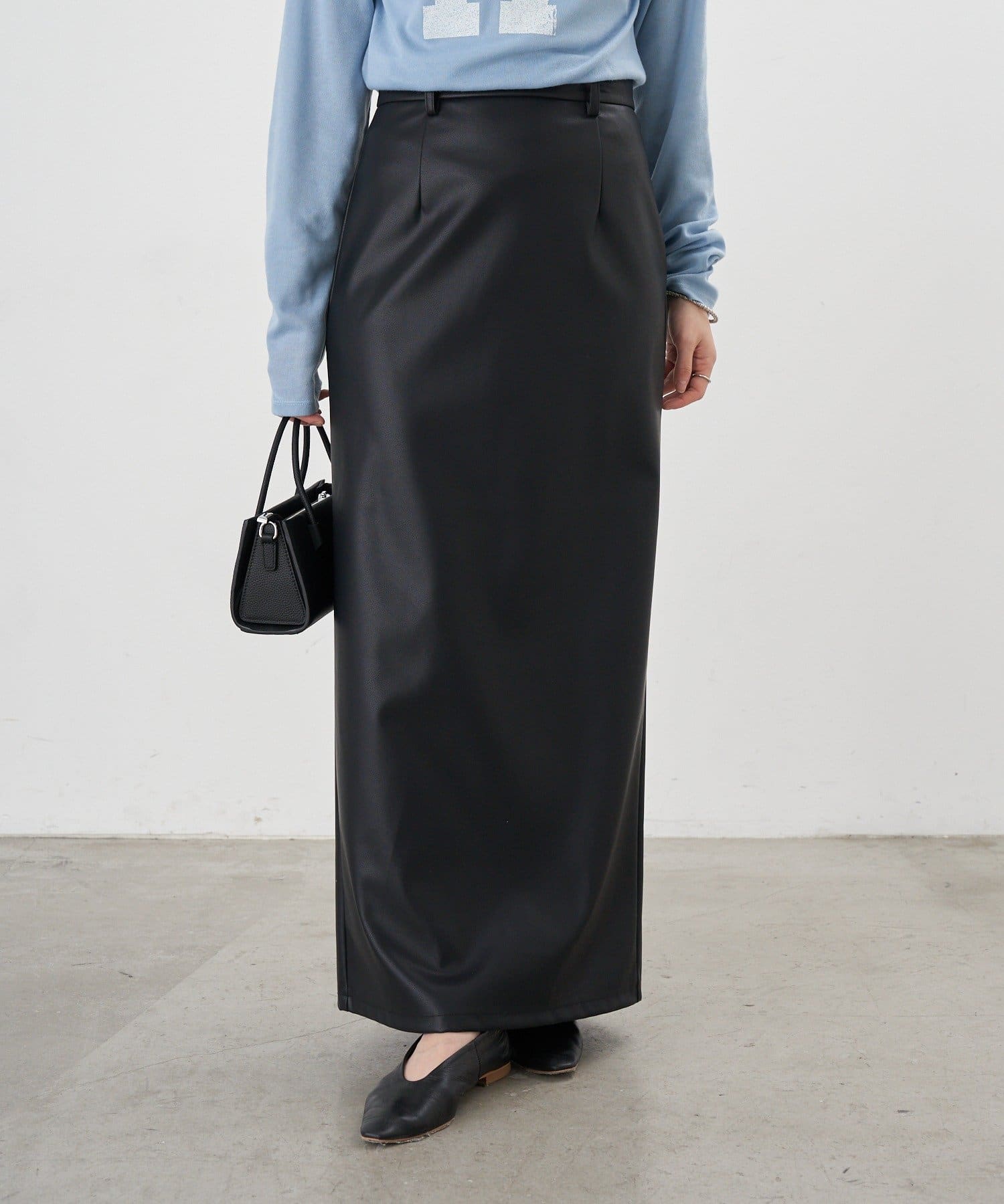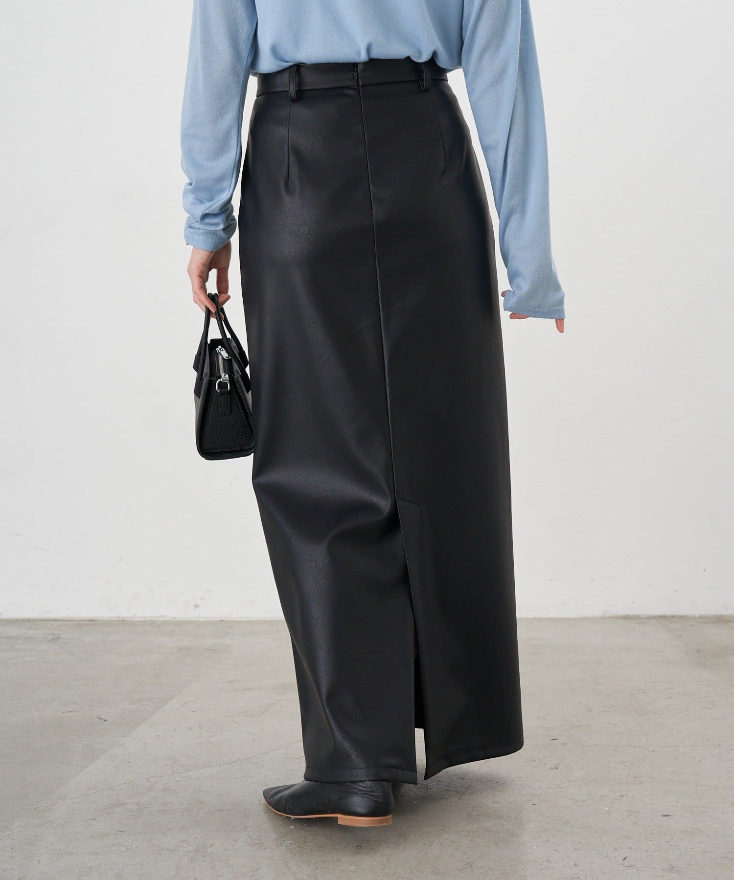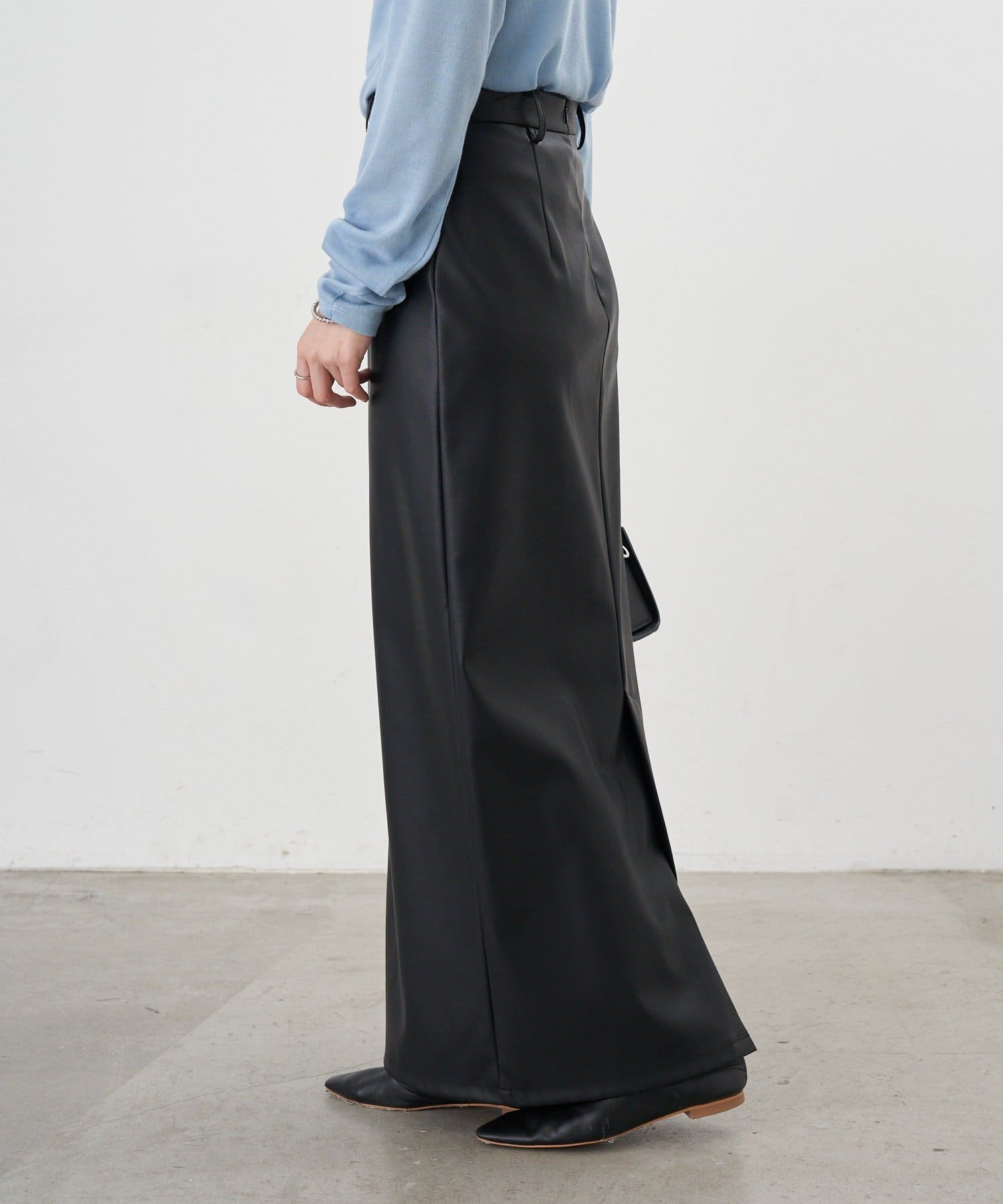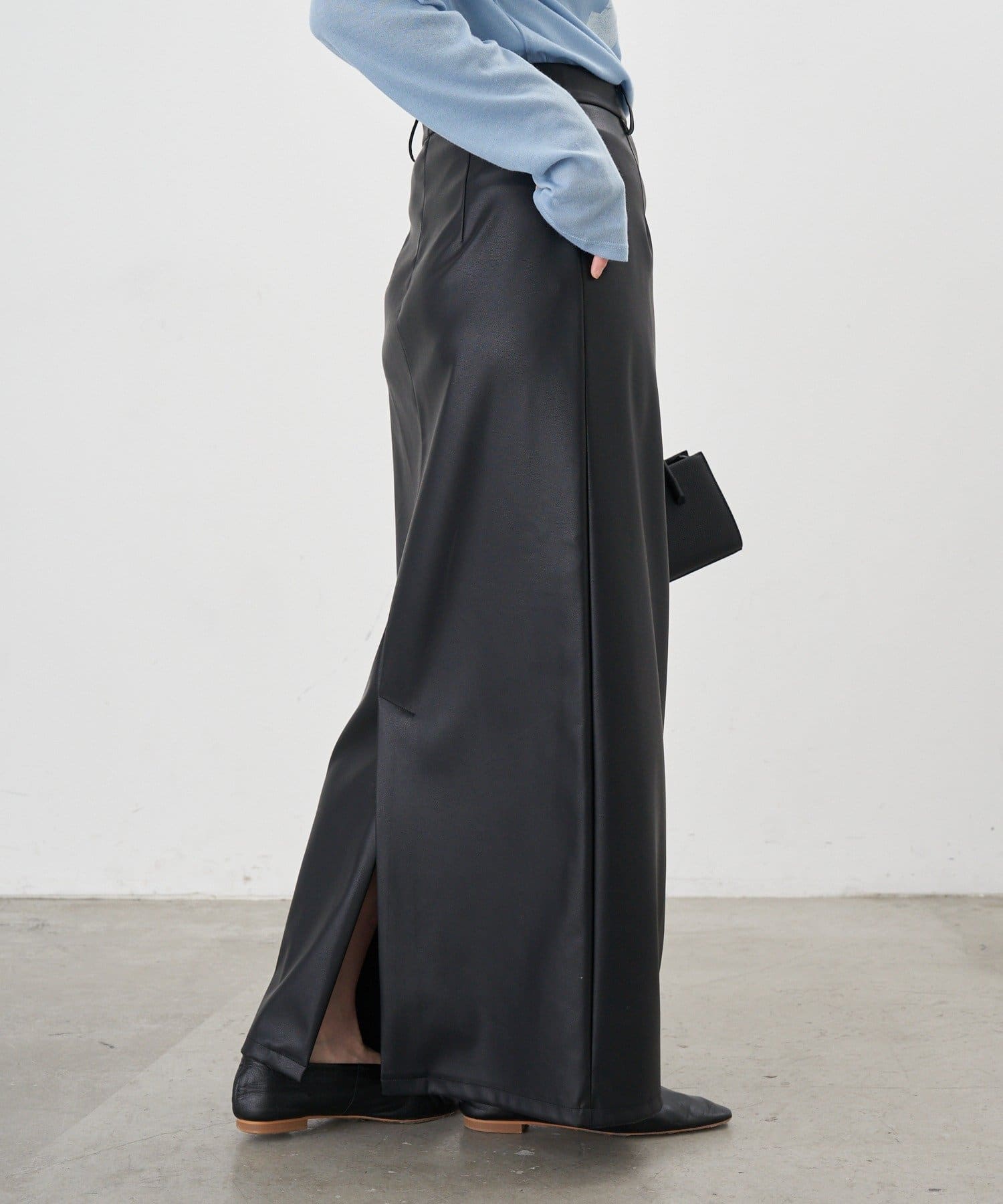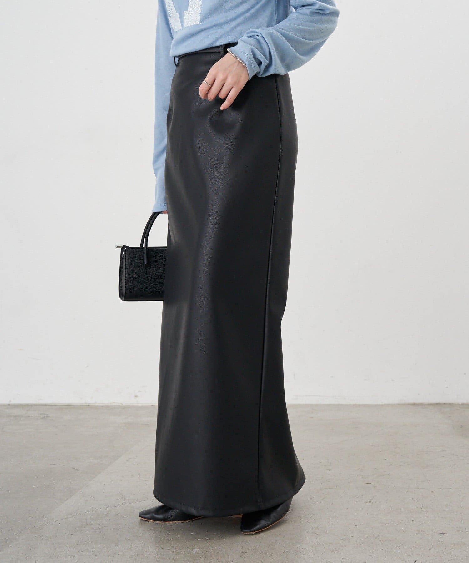 軽く柔らかなフェイクレザーで仕立てたマキシ丈のスカート。