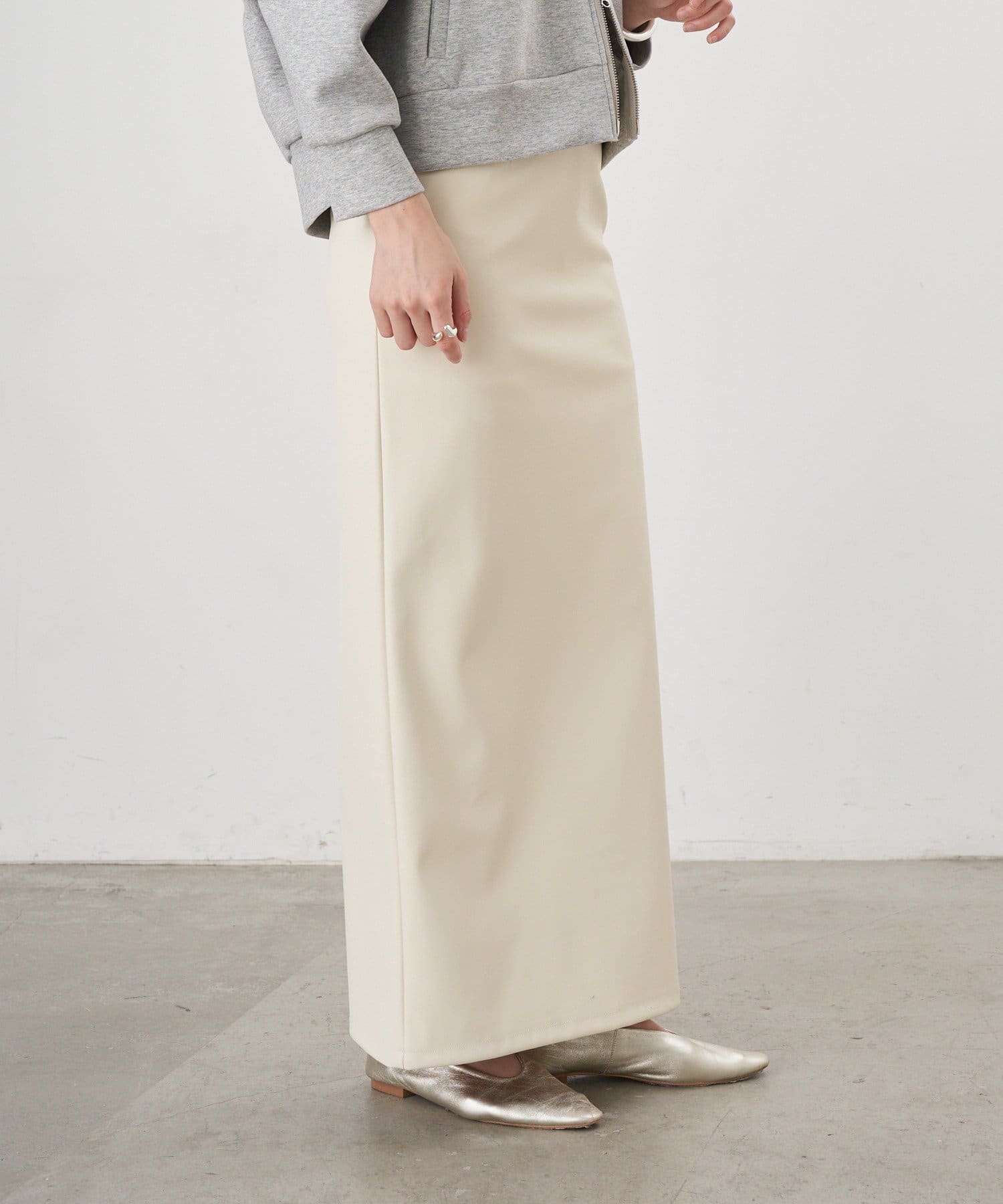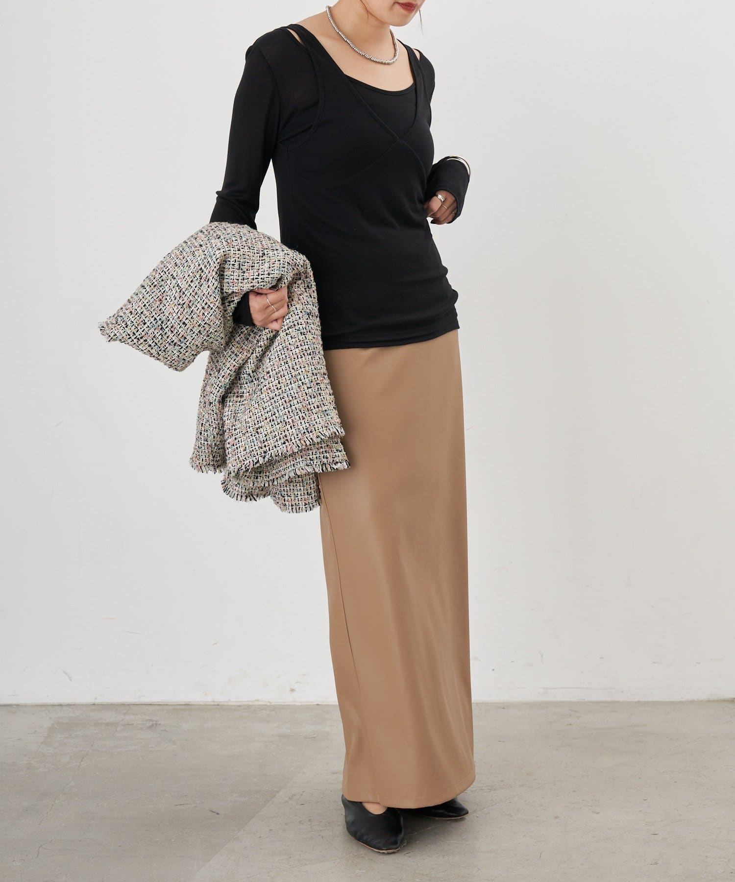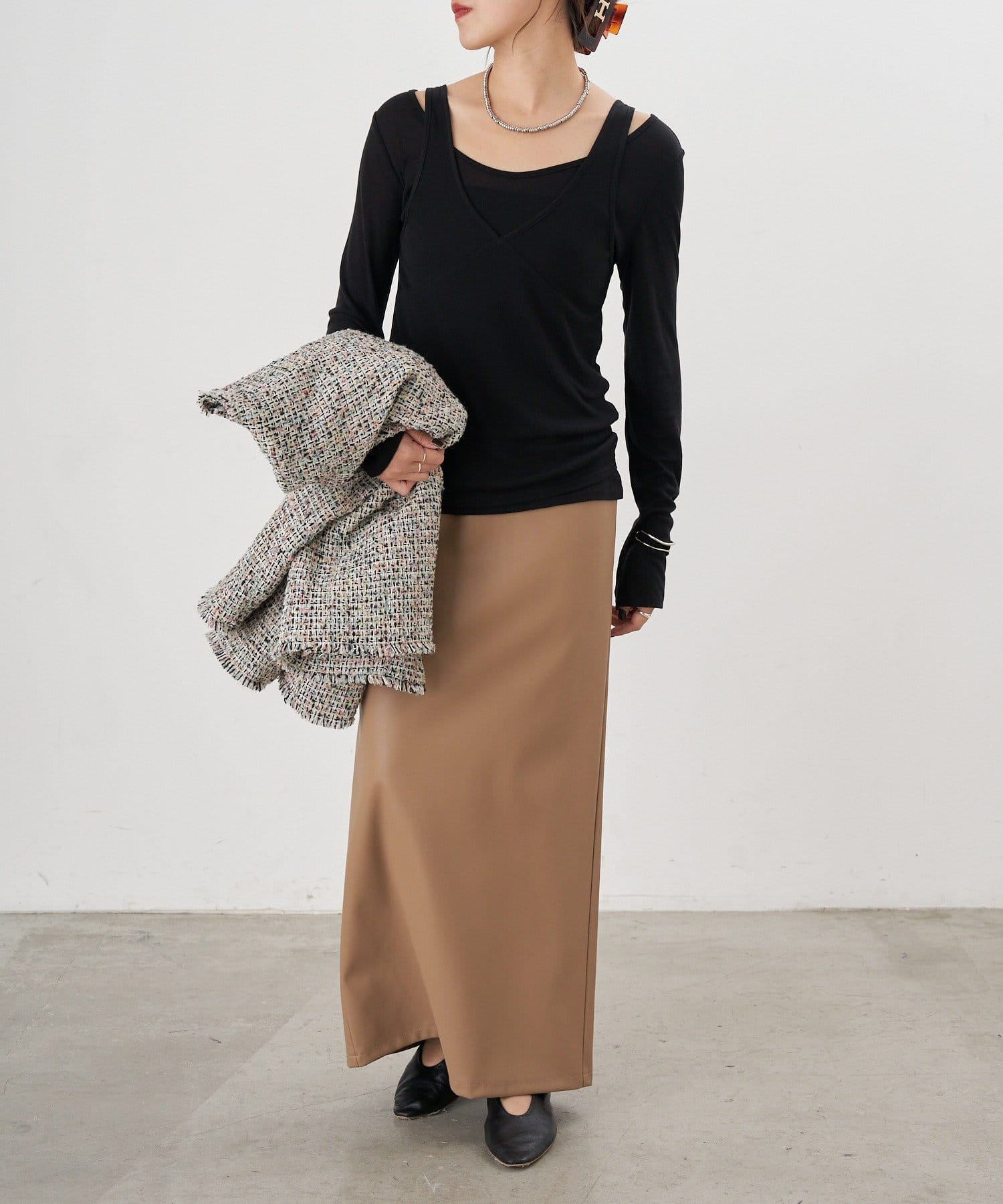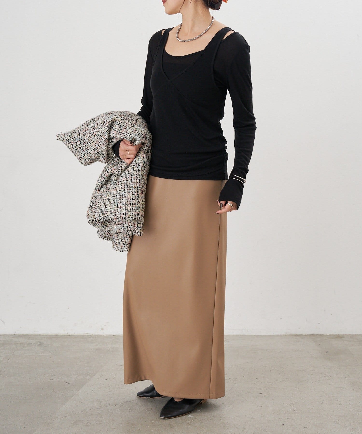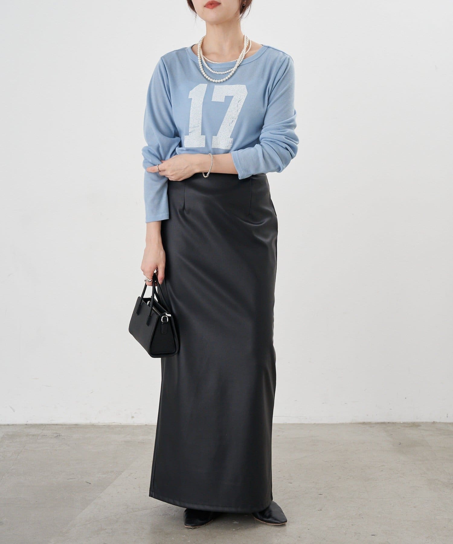 軽く柔らかなフェイクレザーで仕立てたマキシ丈のスカート。