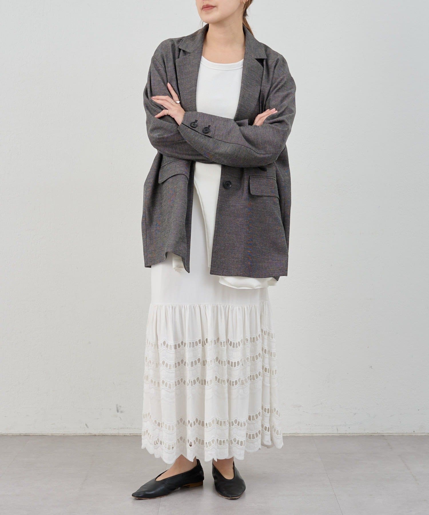 程よいフレアー感が動きに合わせてふわりと揺れて装いにやわらかさをプラスします。
