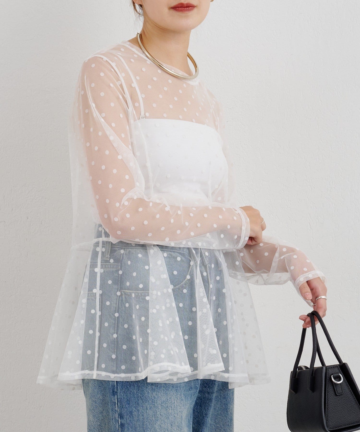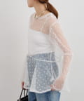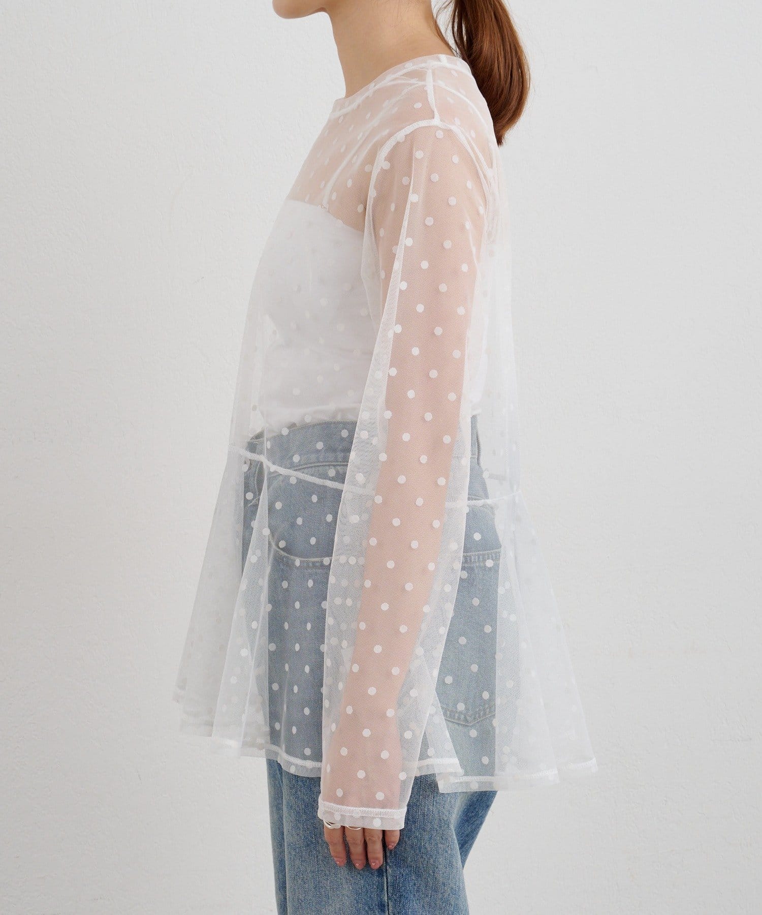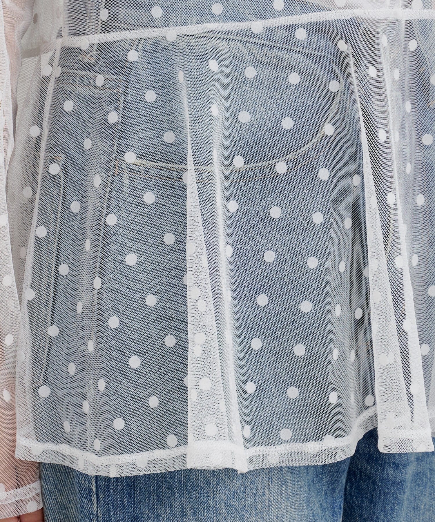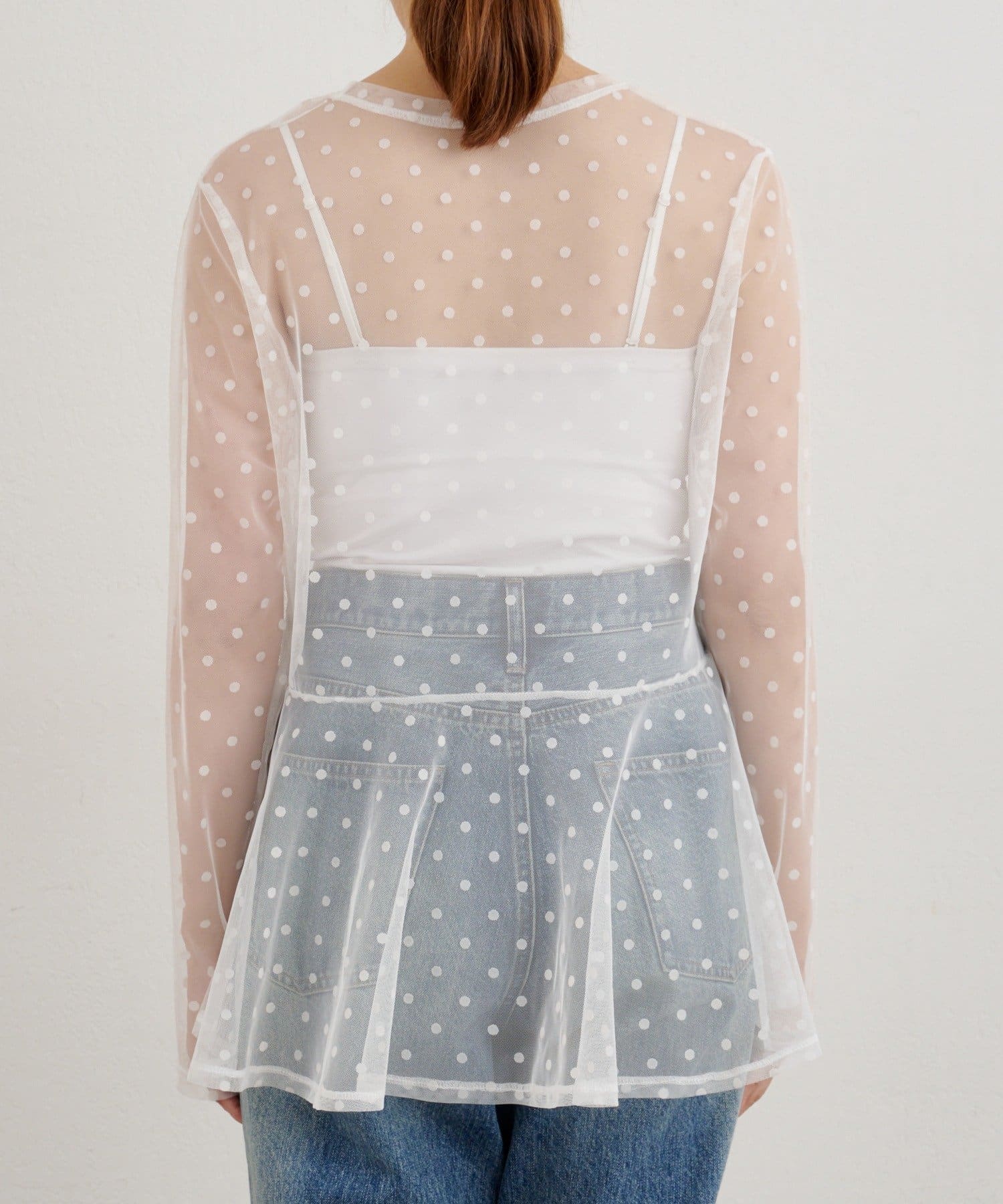 透け感のあるチュール素材にドットのフロッキープリントを施したブラウス。