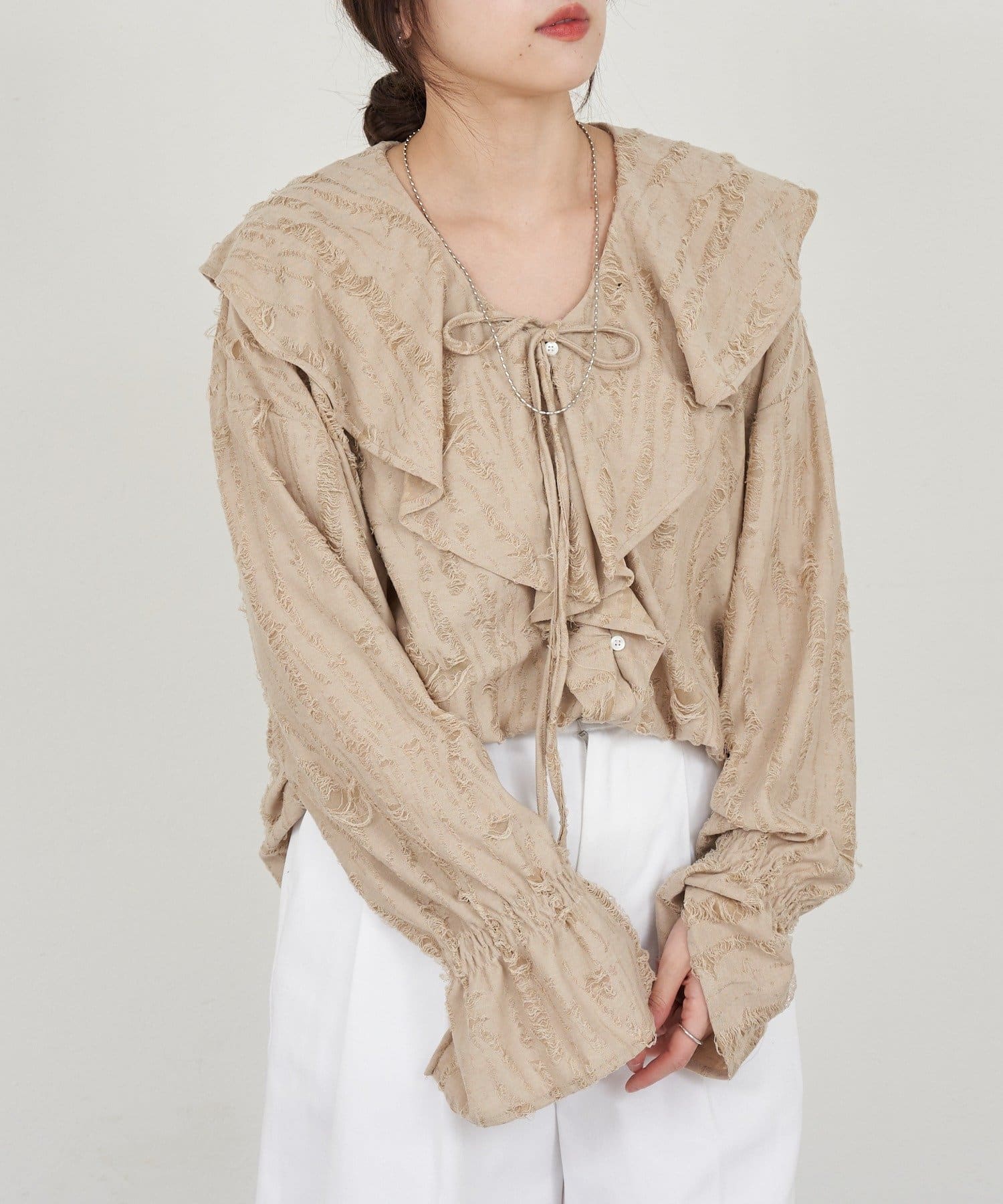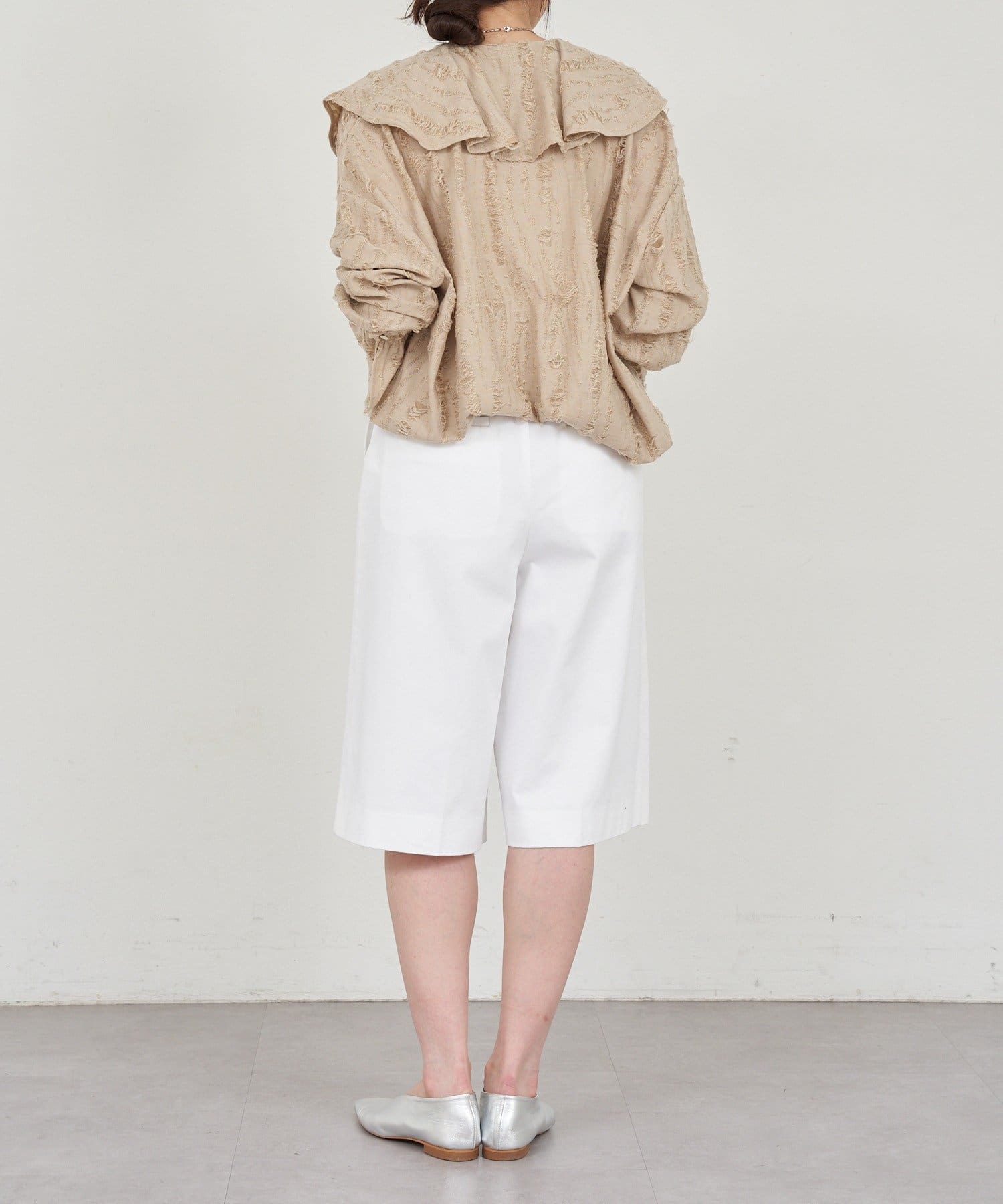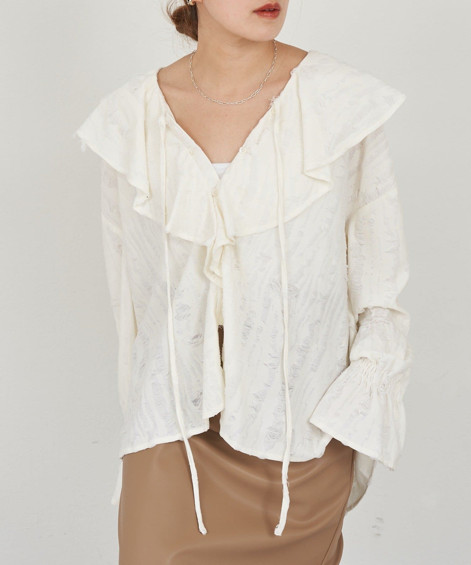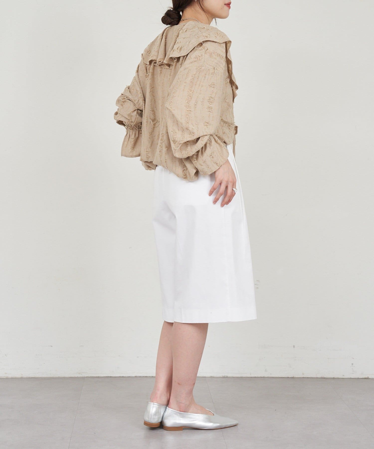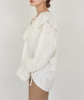 大きくデザインした印象的なフリルカラーがポイントのブラウス