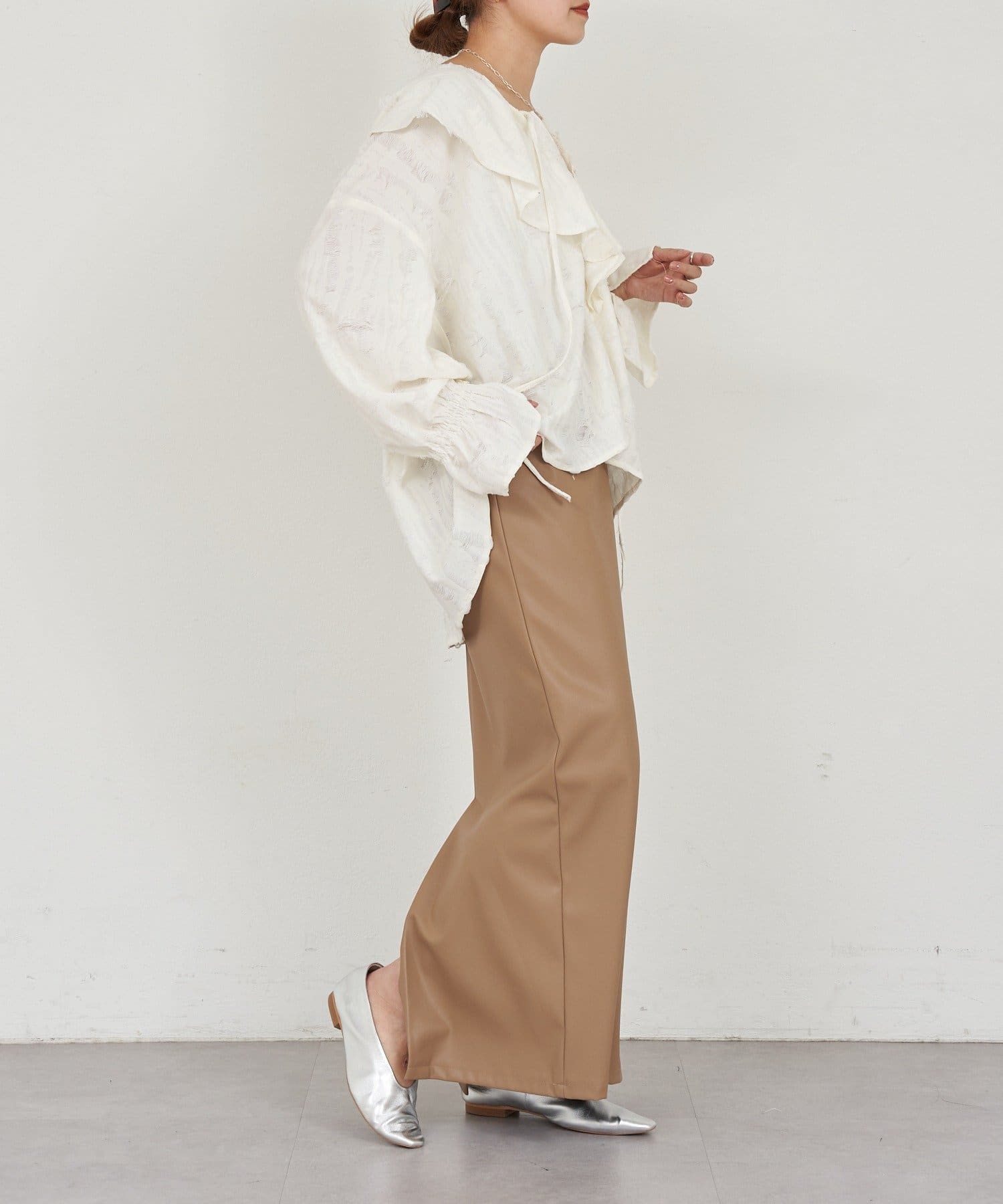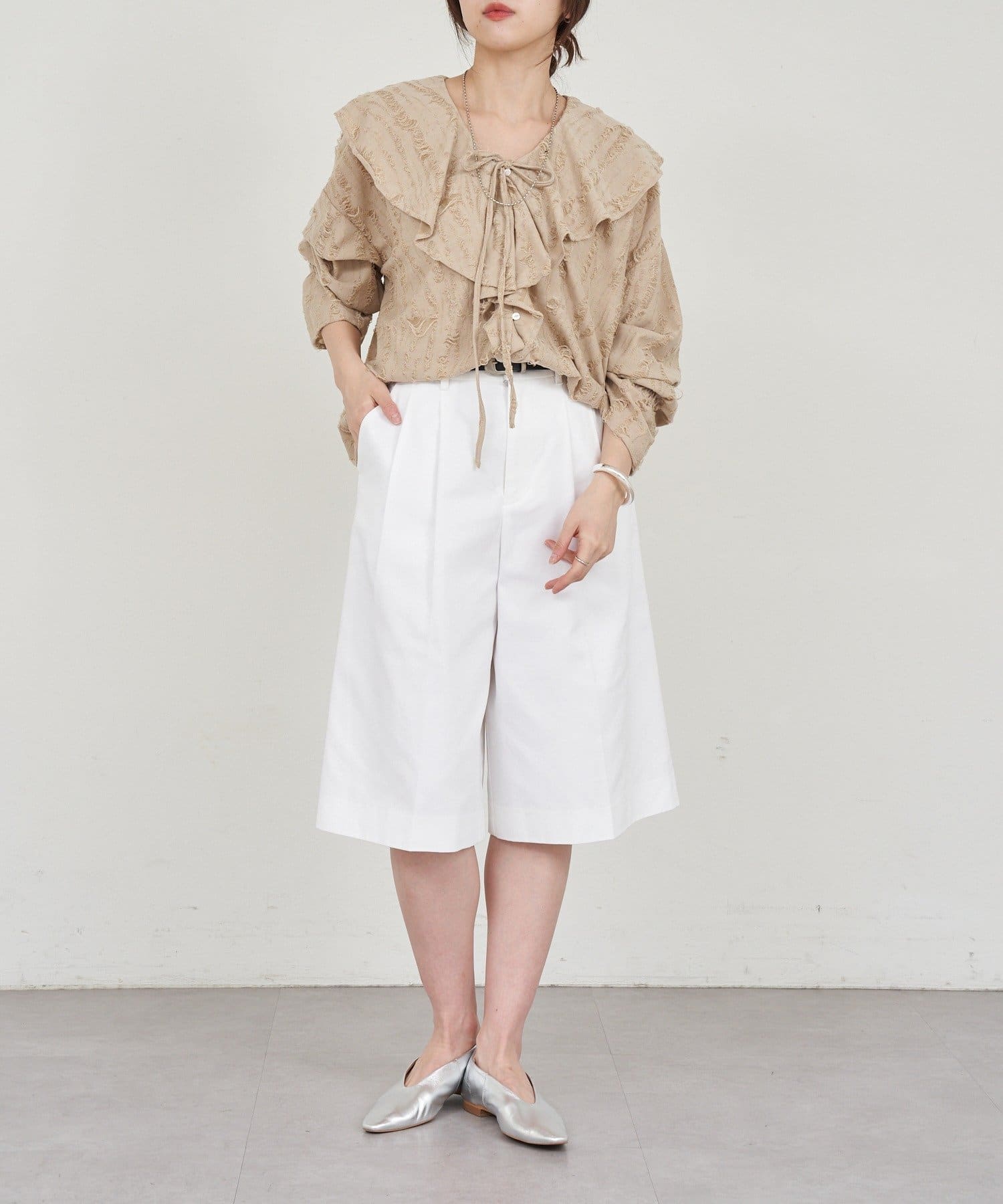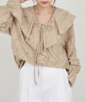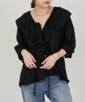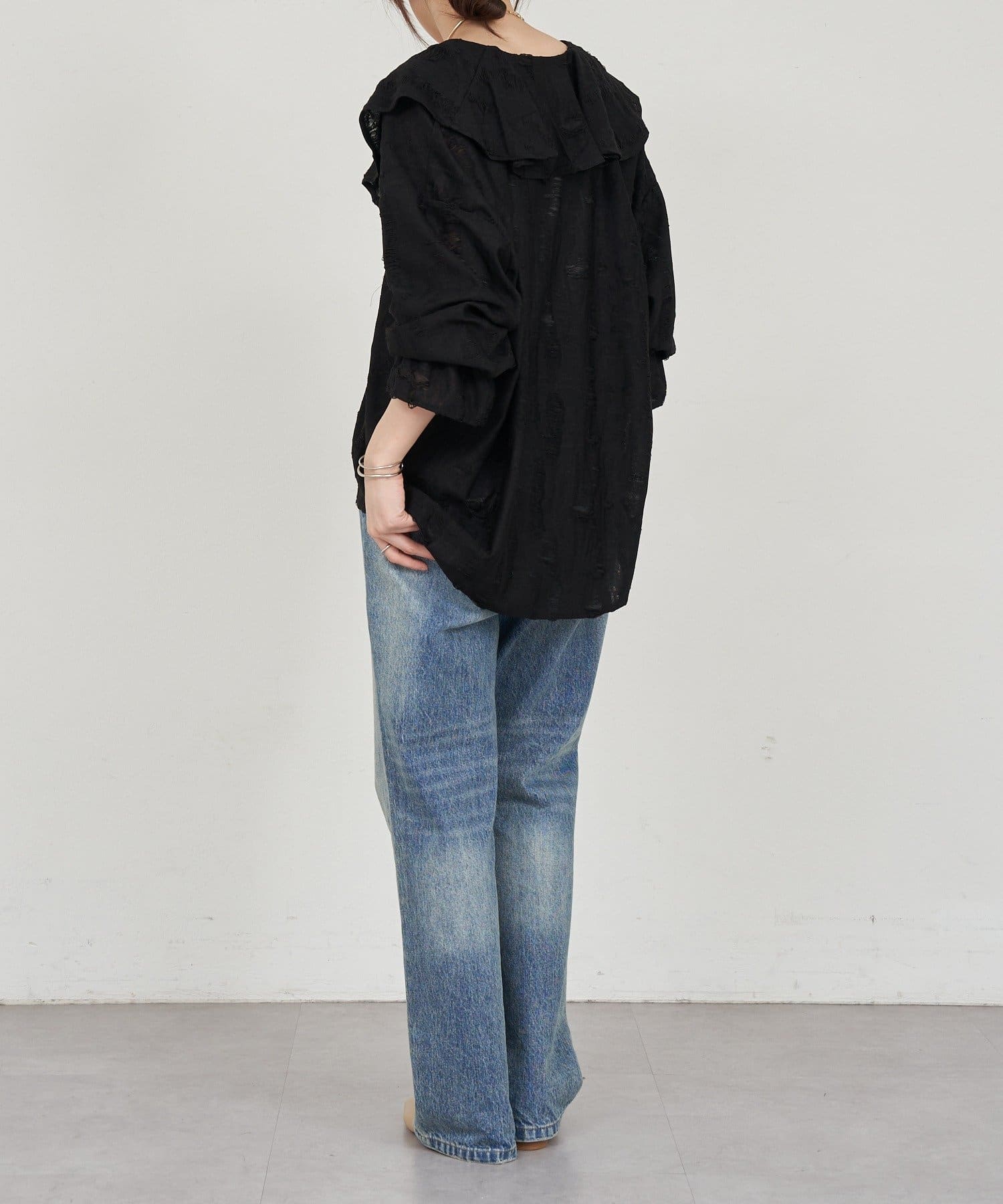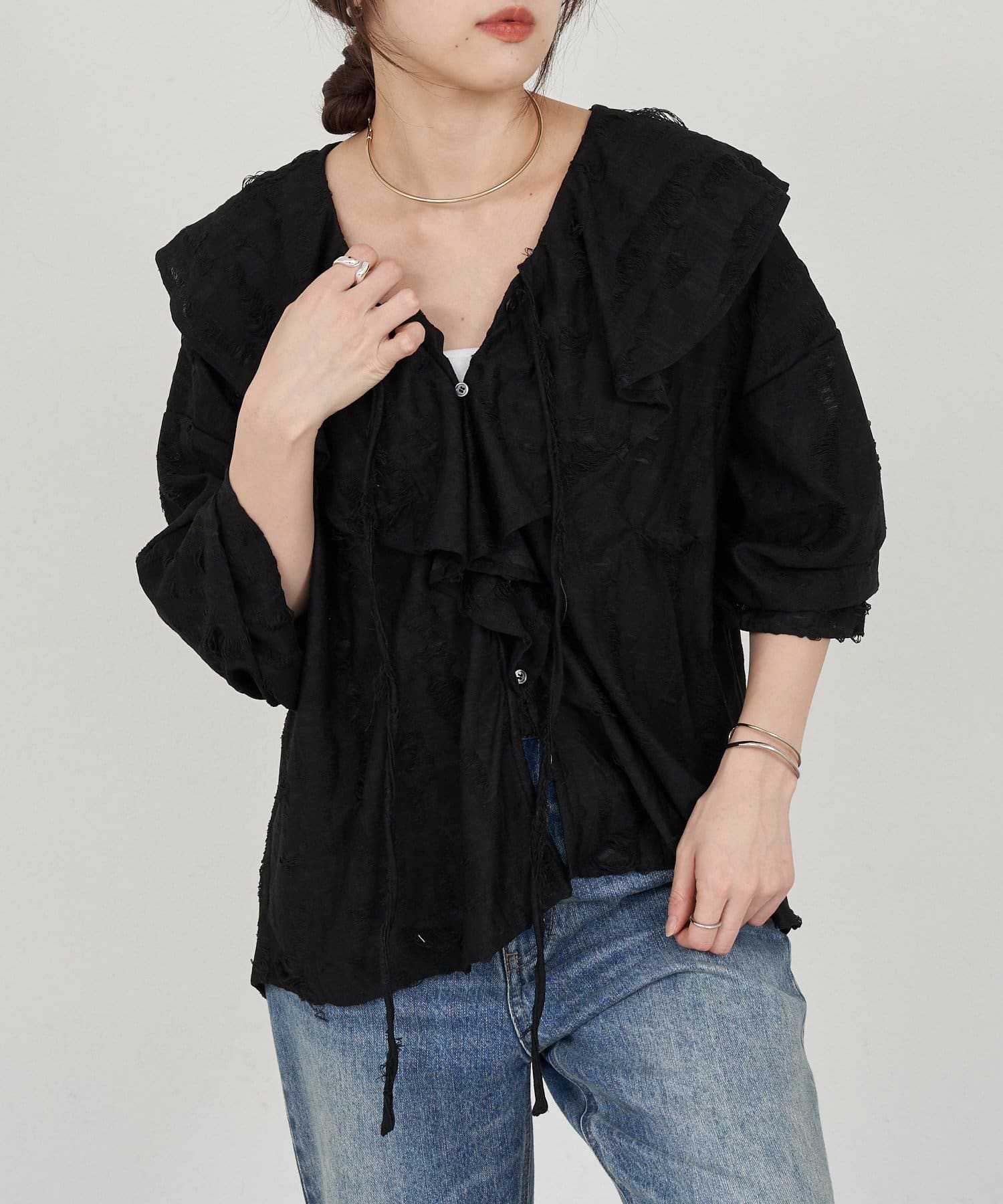 大きくデザインした印象的なフリルカラーがポイントのブラウス