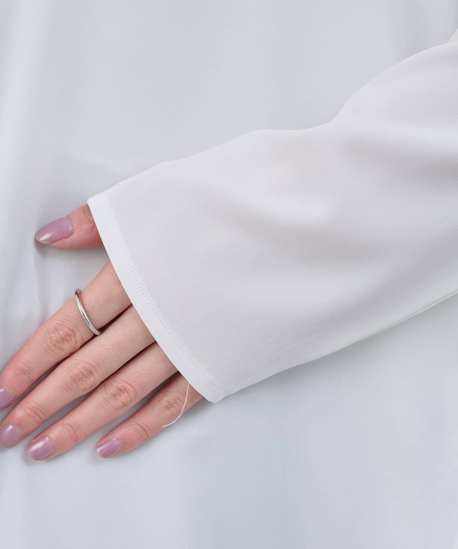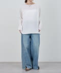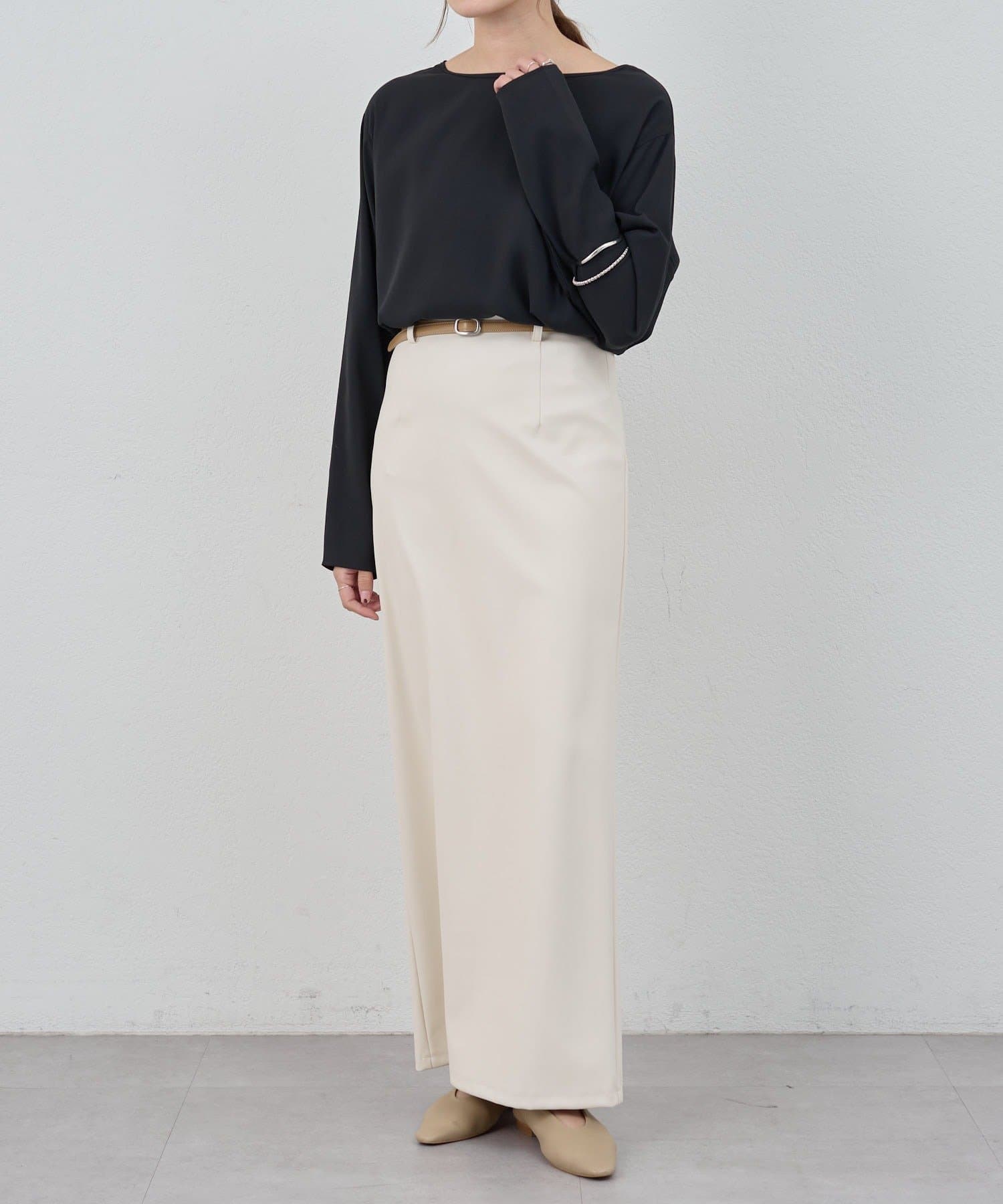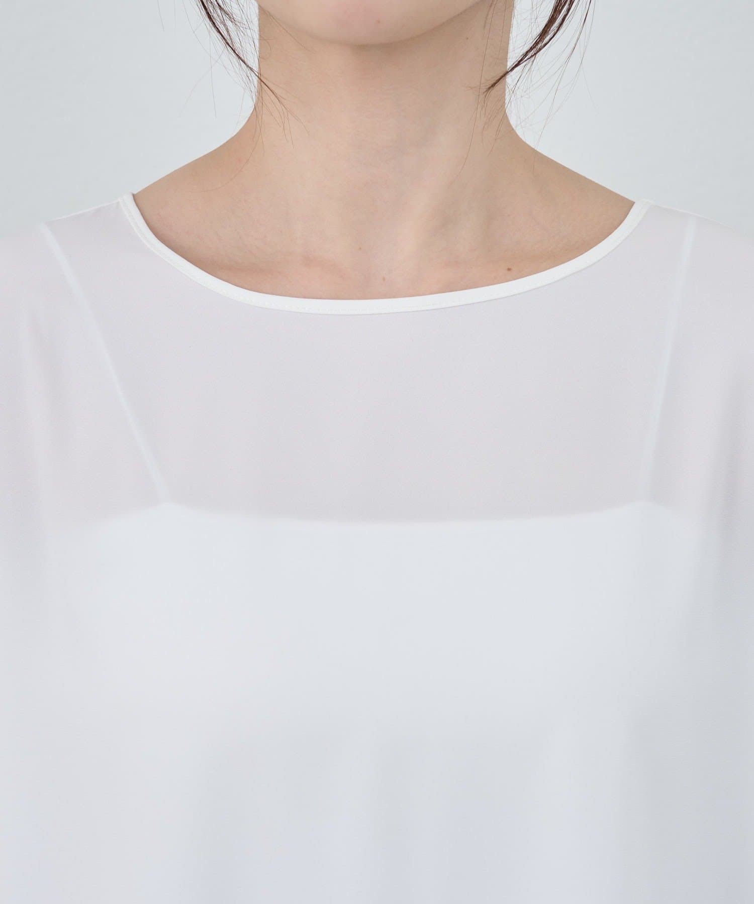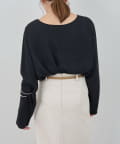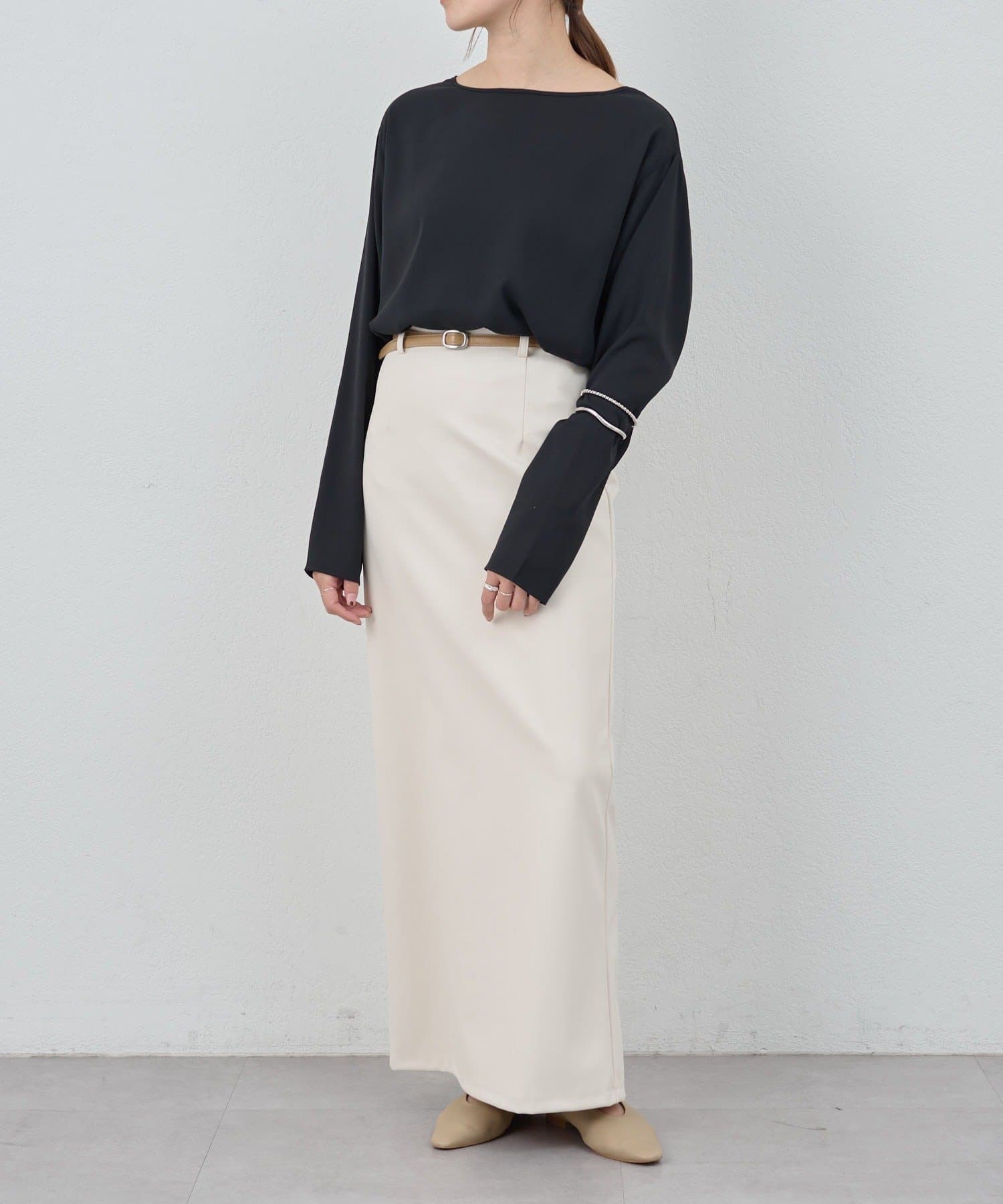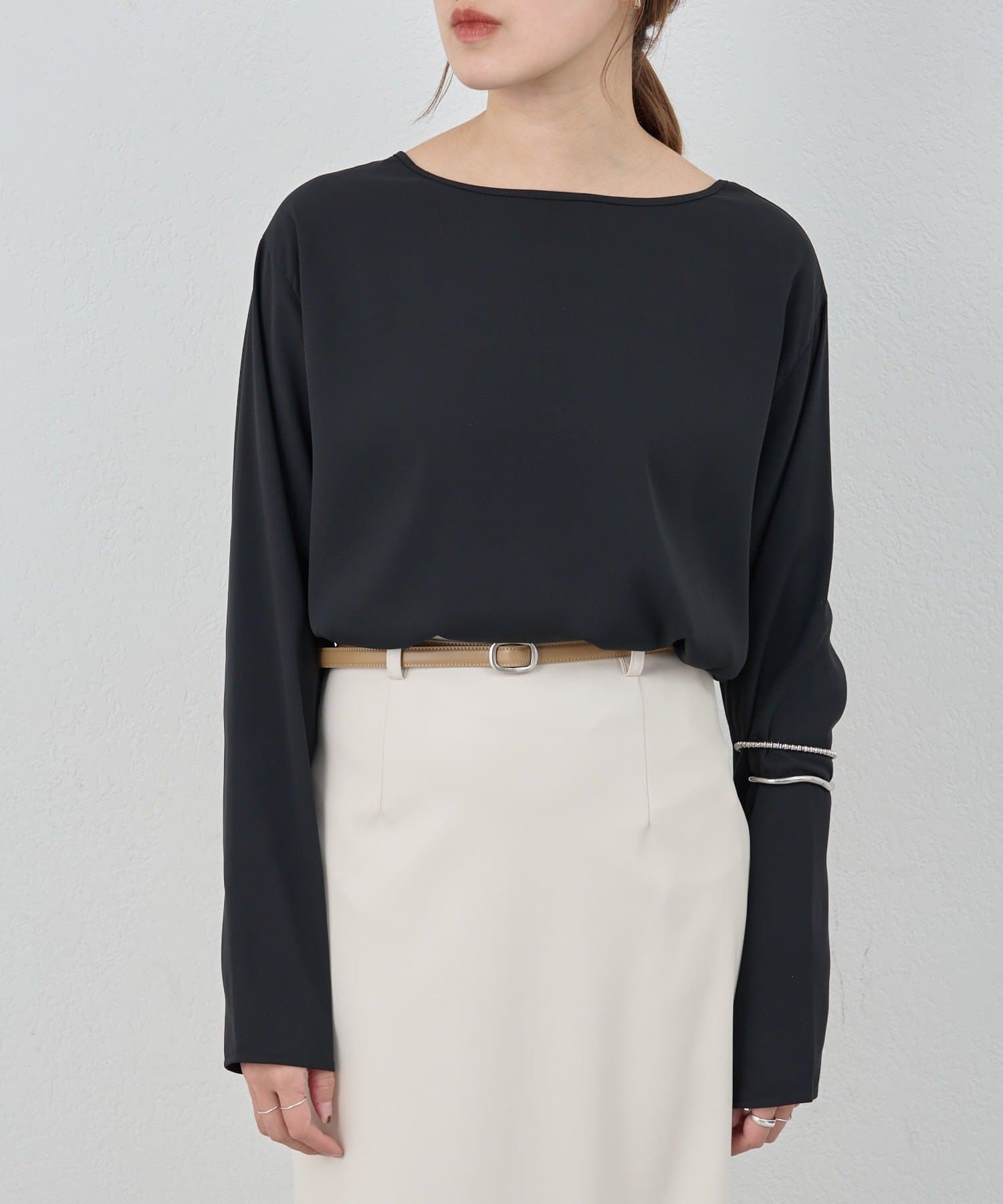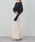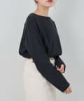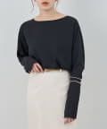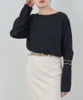 首元はデコルテのきれいに見える緩やかなボートネックで女性らしさをプラス。