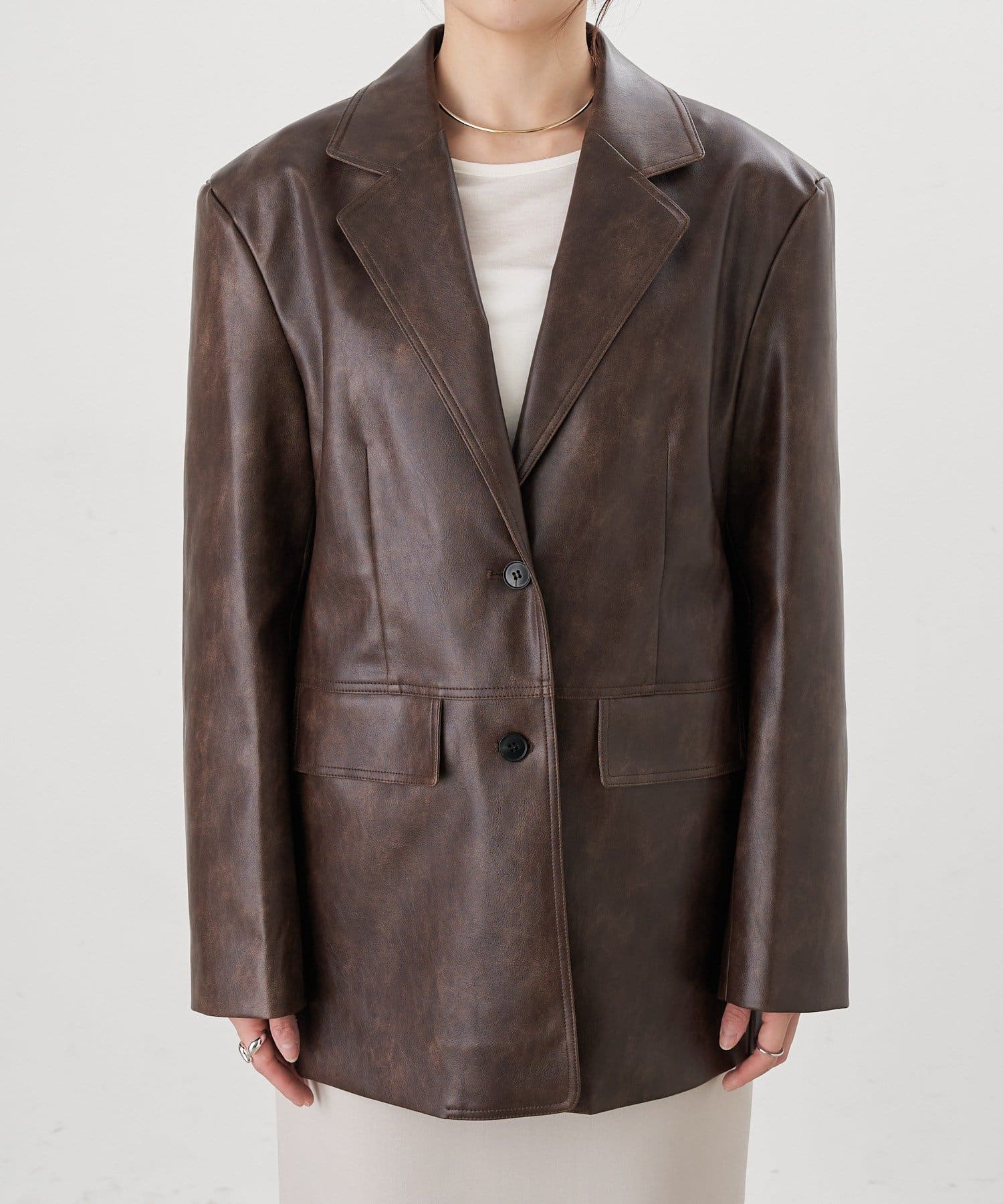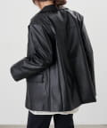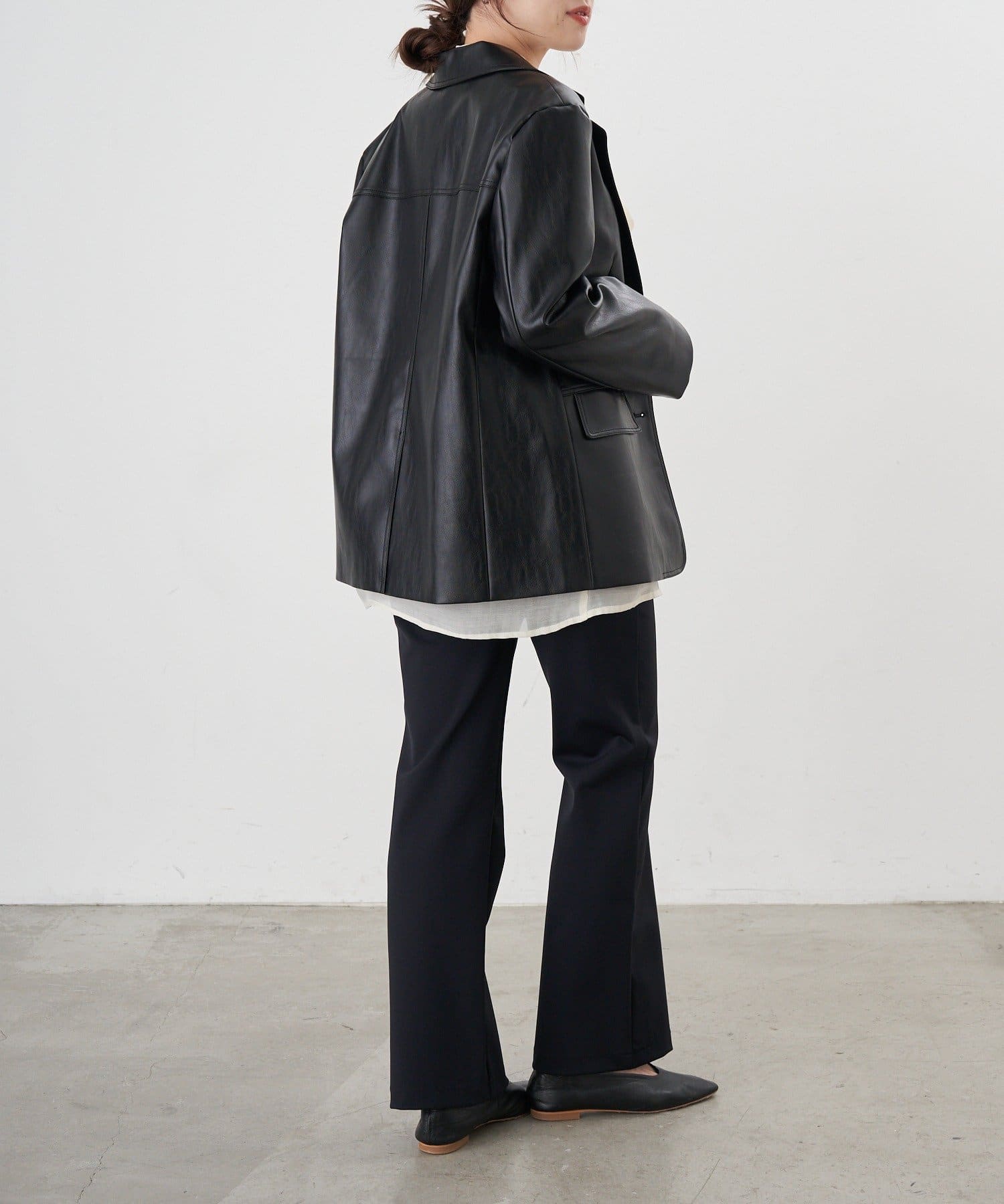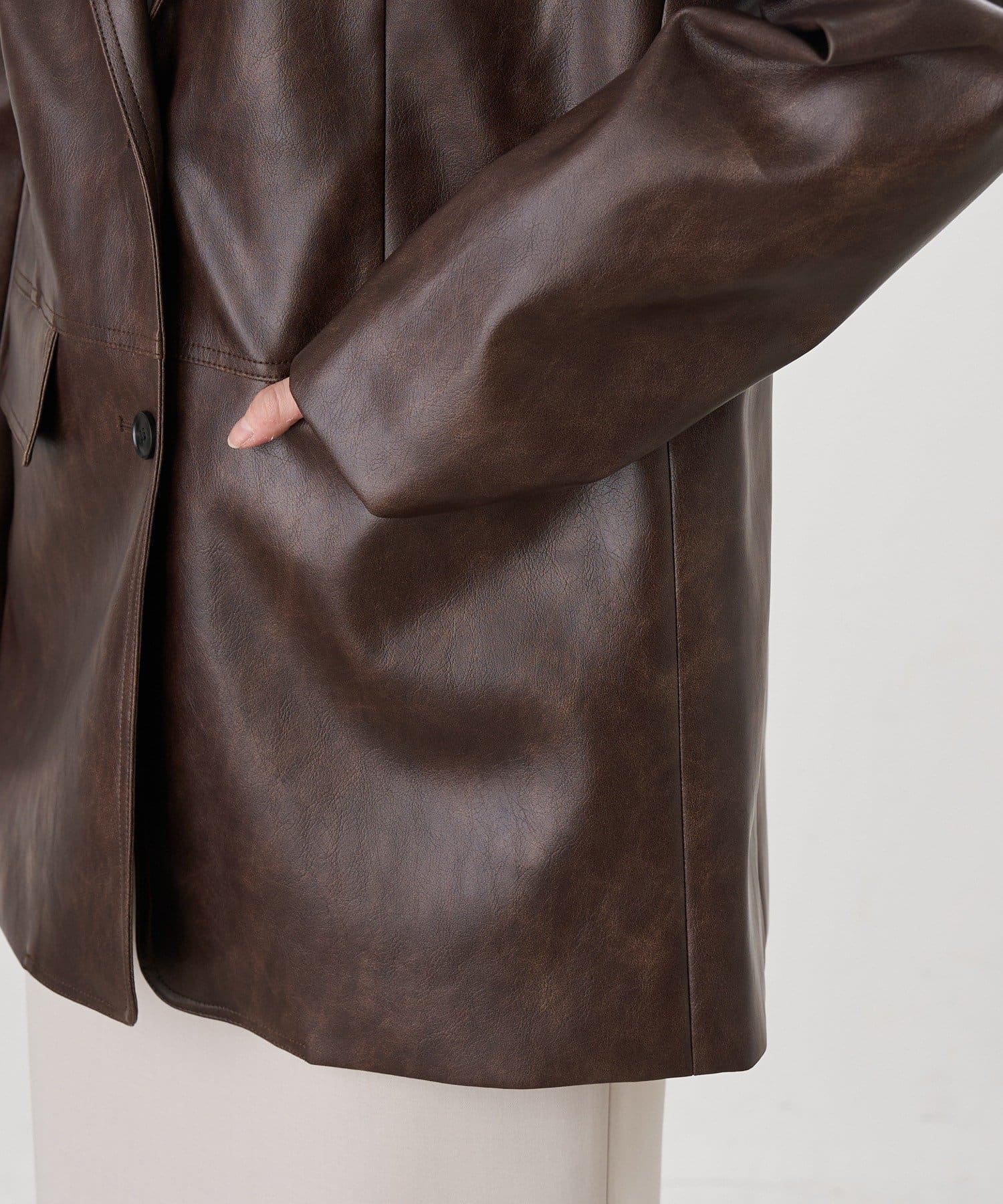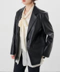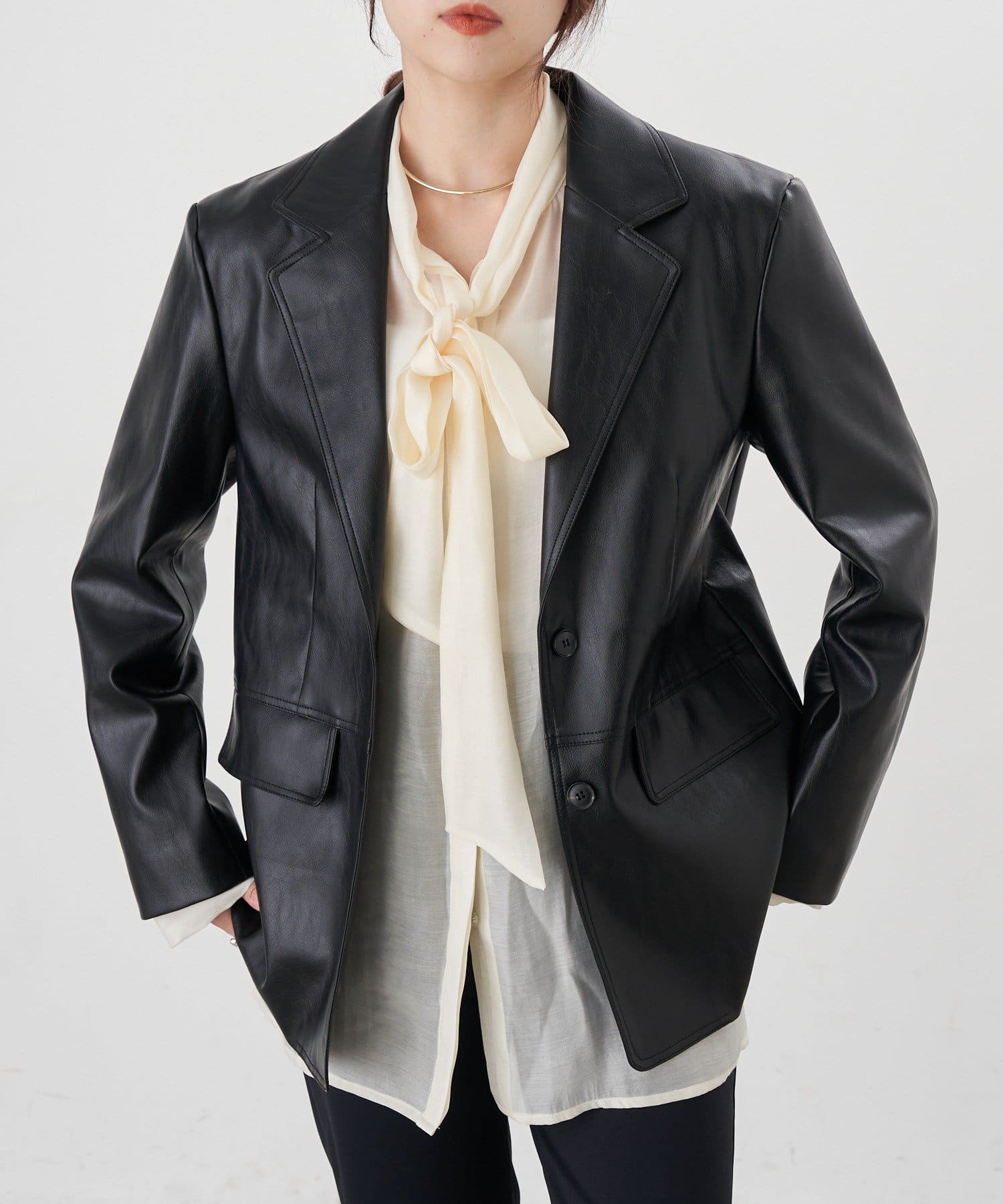 ・柔らかいフェイクレザーで仕上げたテーラードジャケットは今年らしいトレンドアイテム。