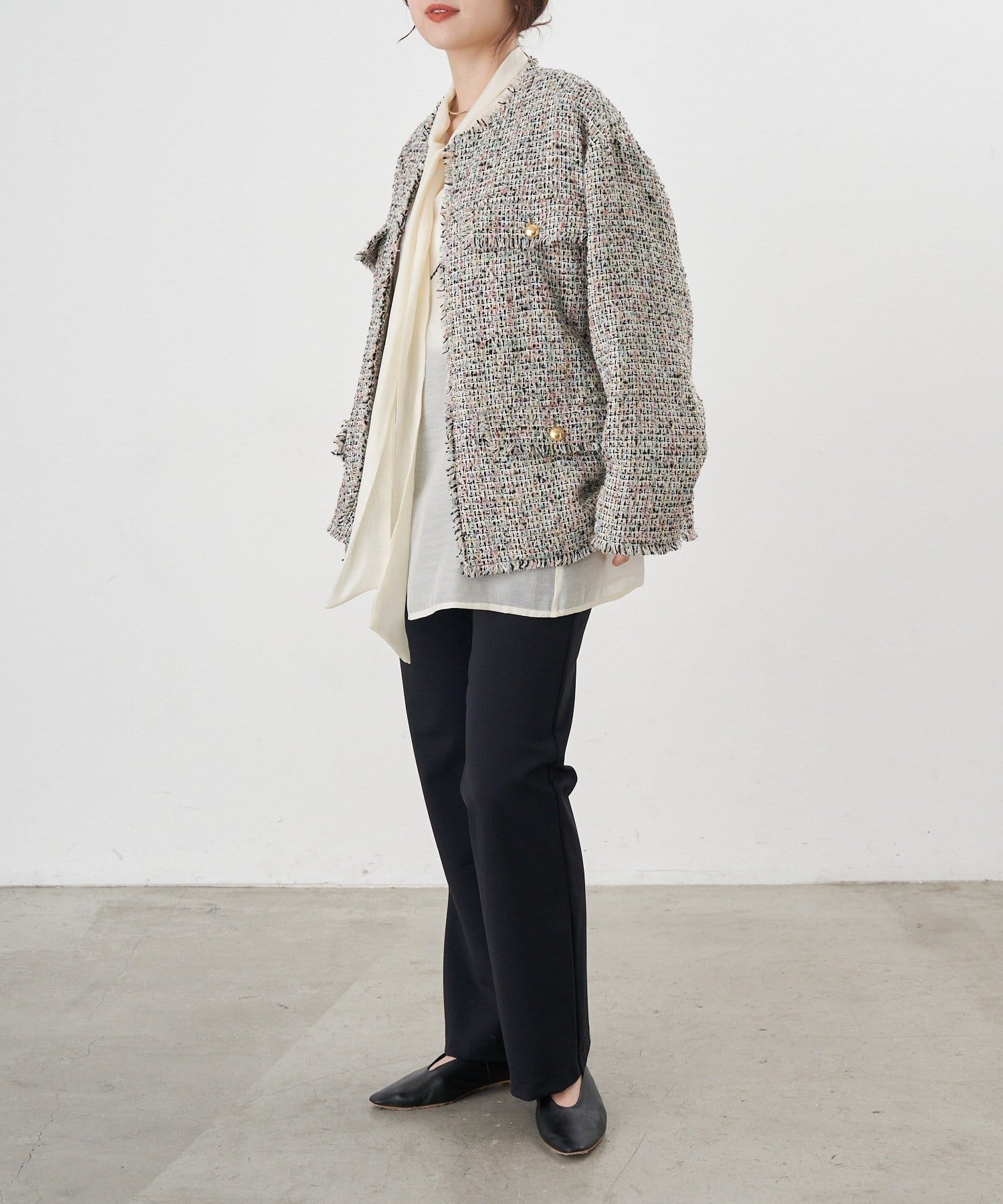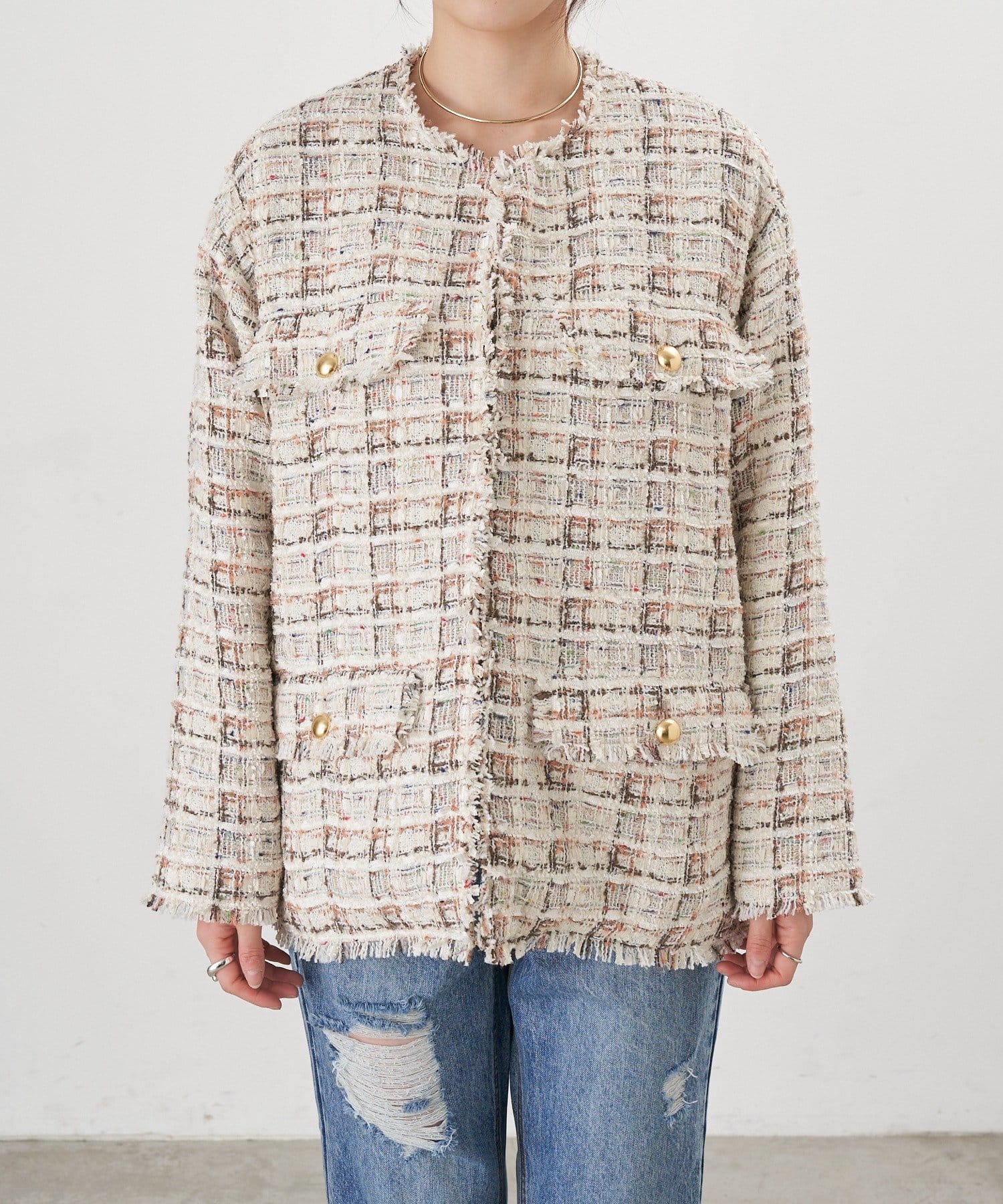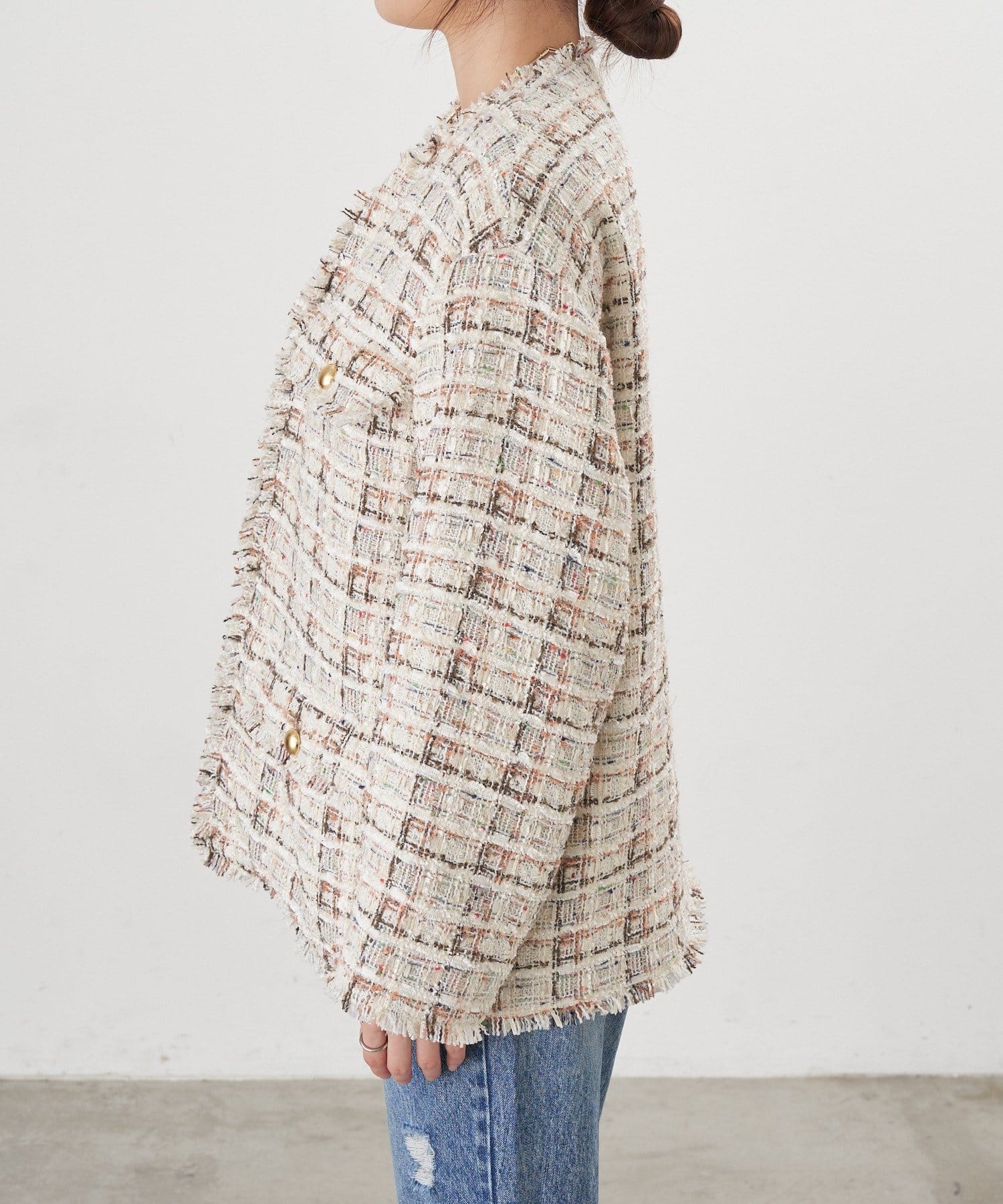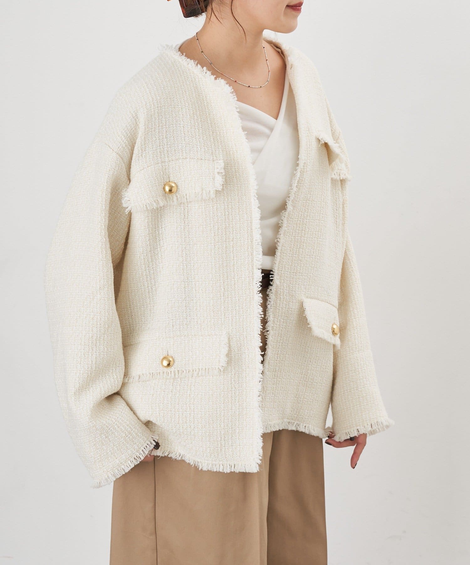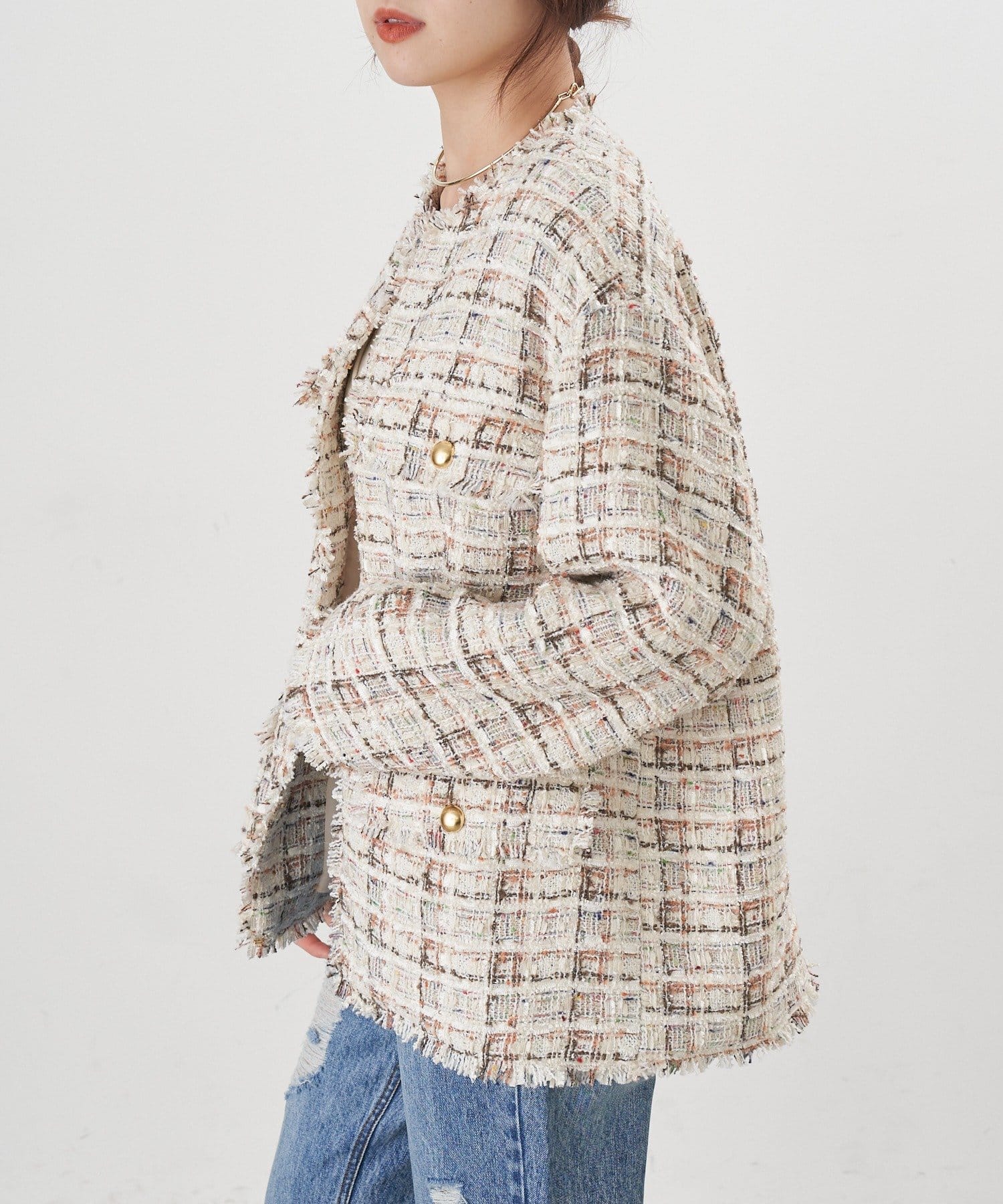 ツイード生地にゴールドボタンのアクセントをプラスしたノーカラーデザイン。