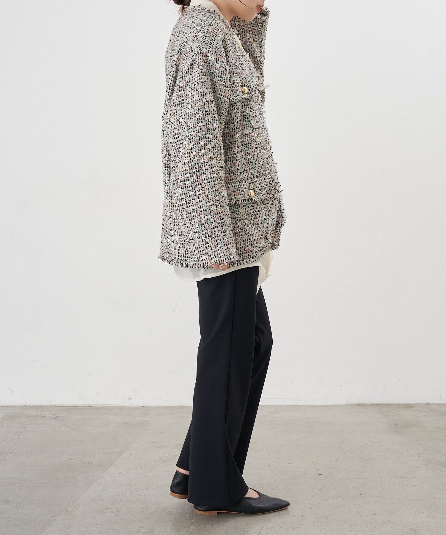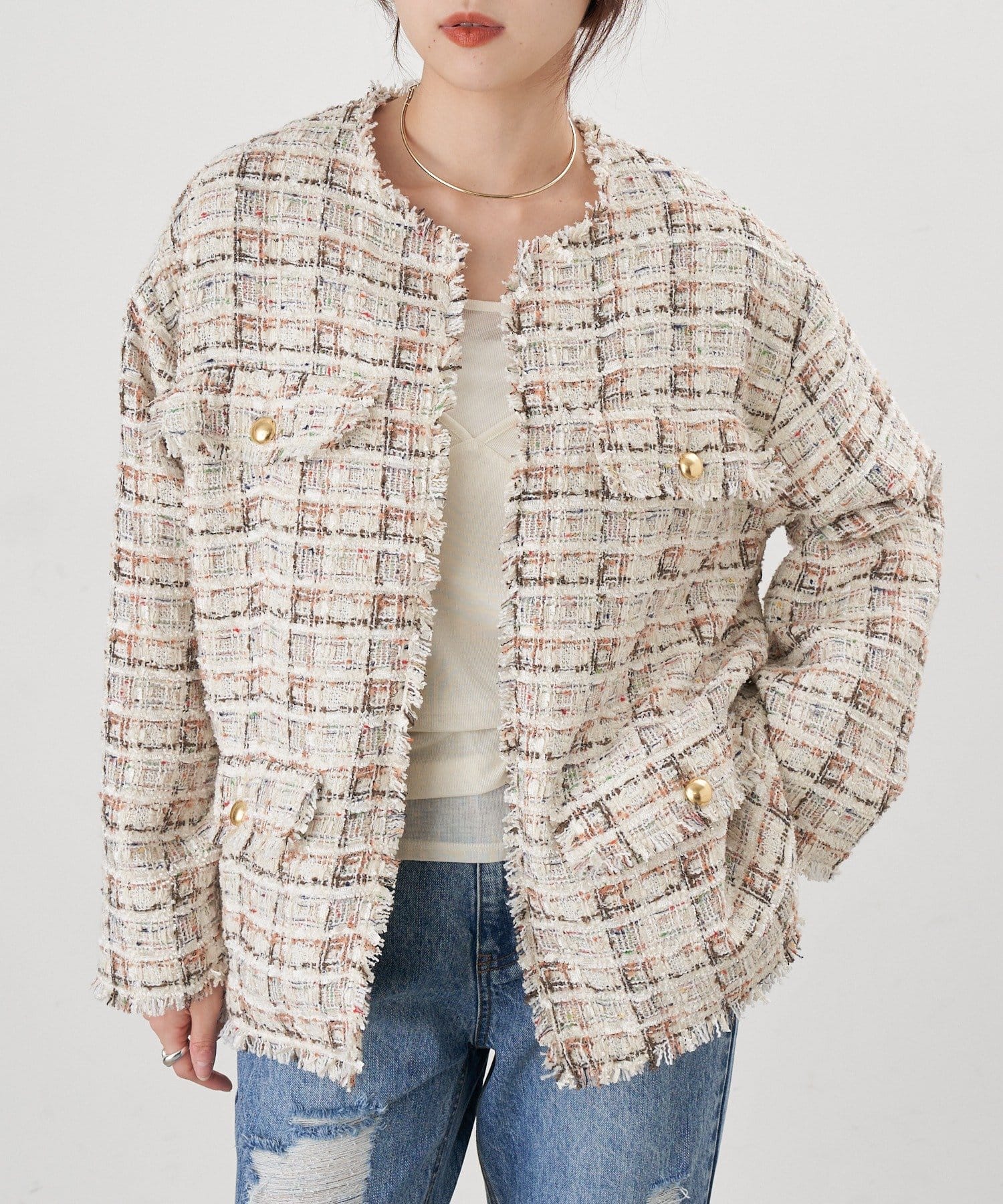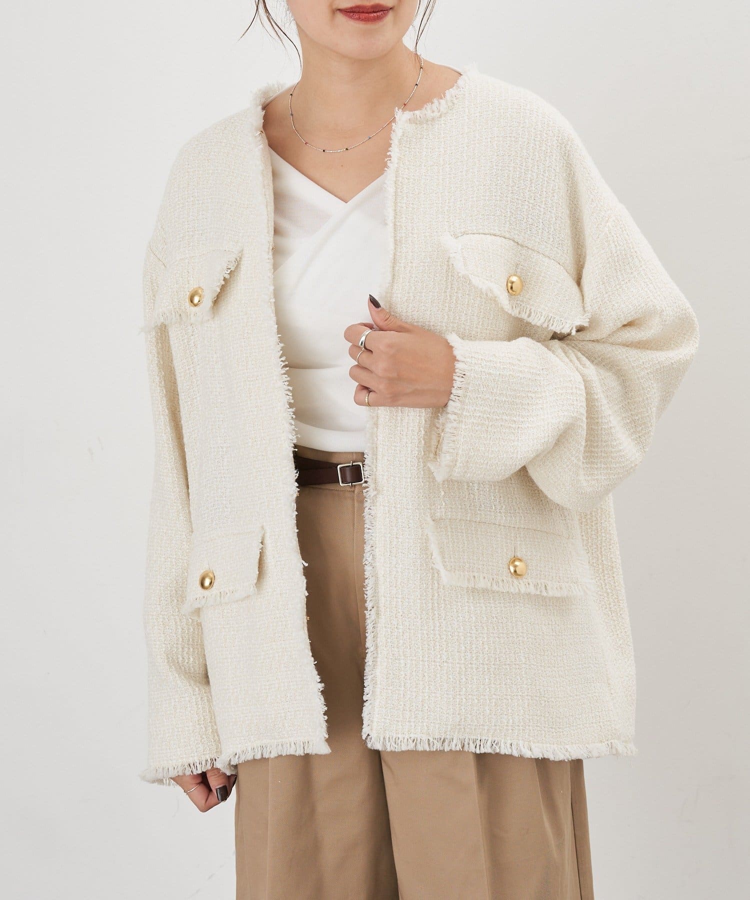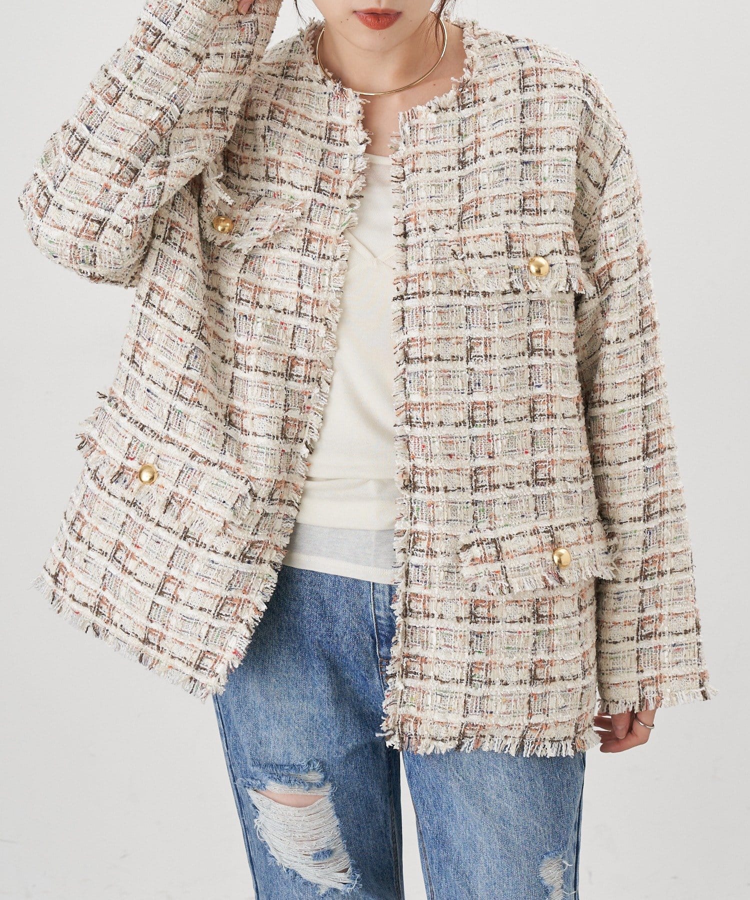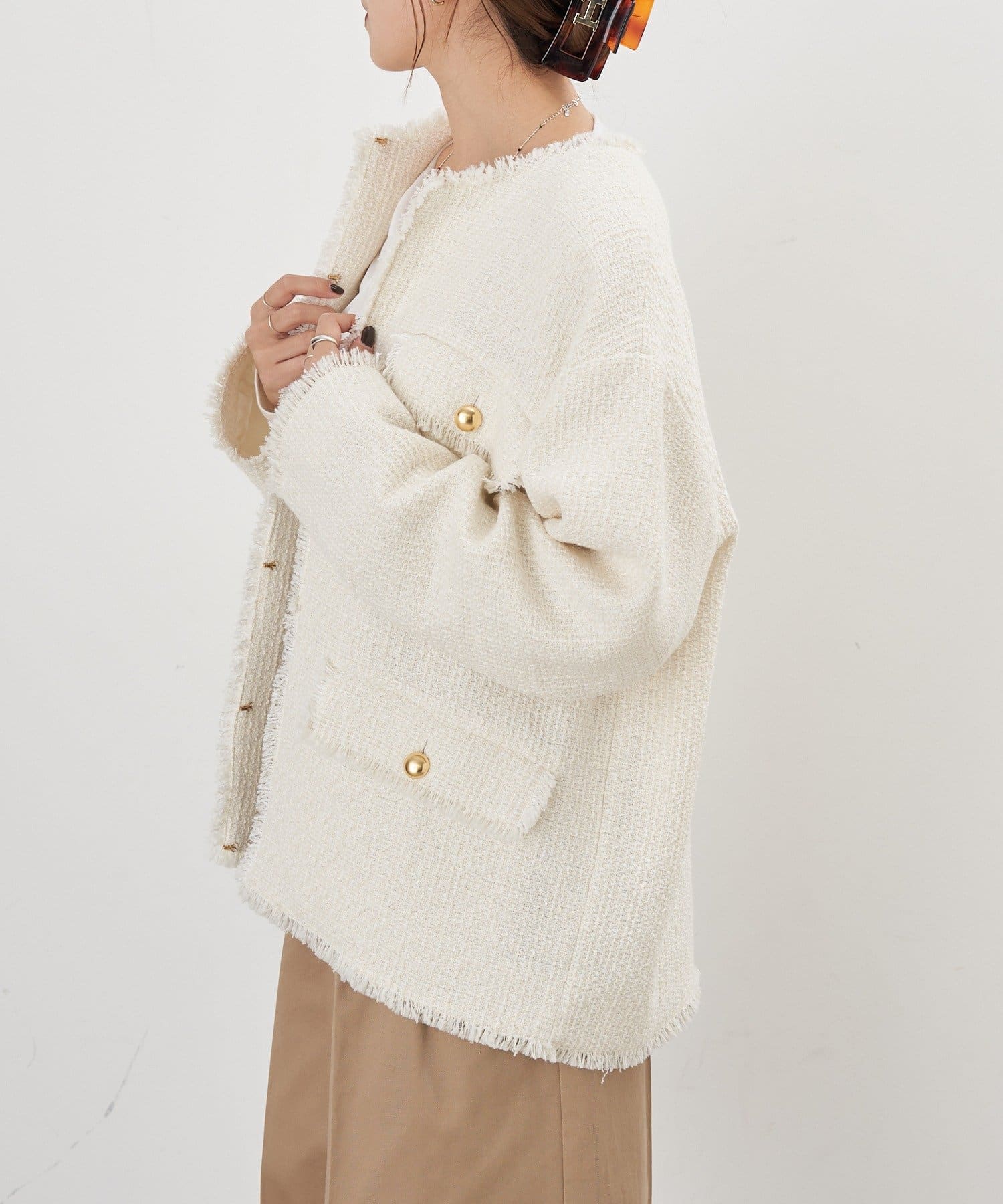 ツイード生地にゴールドボタンのアクセントをプラスしたノーカラーデザイン。