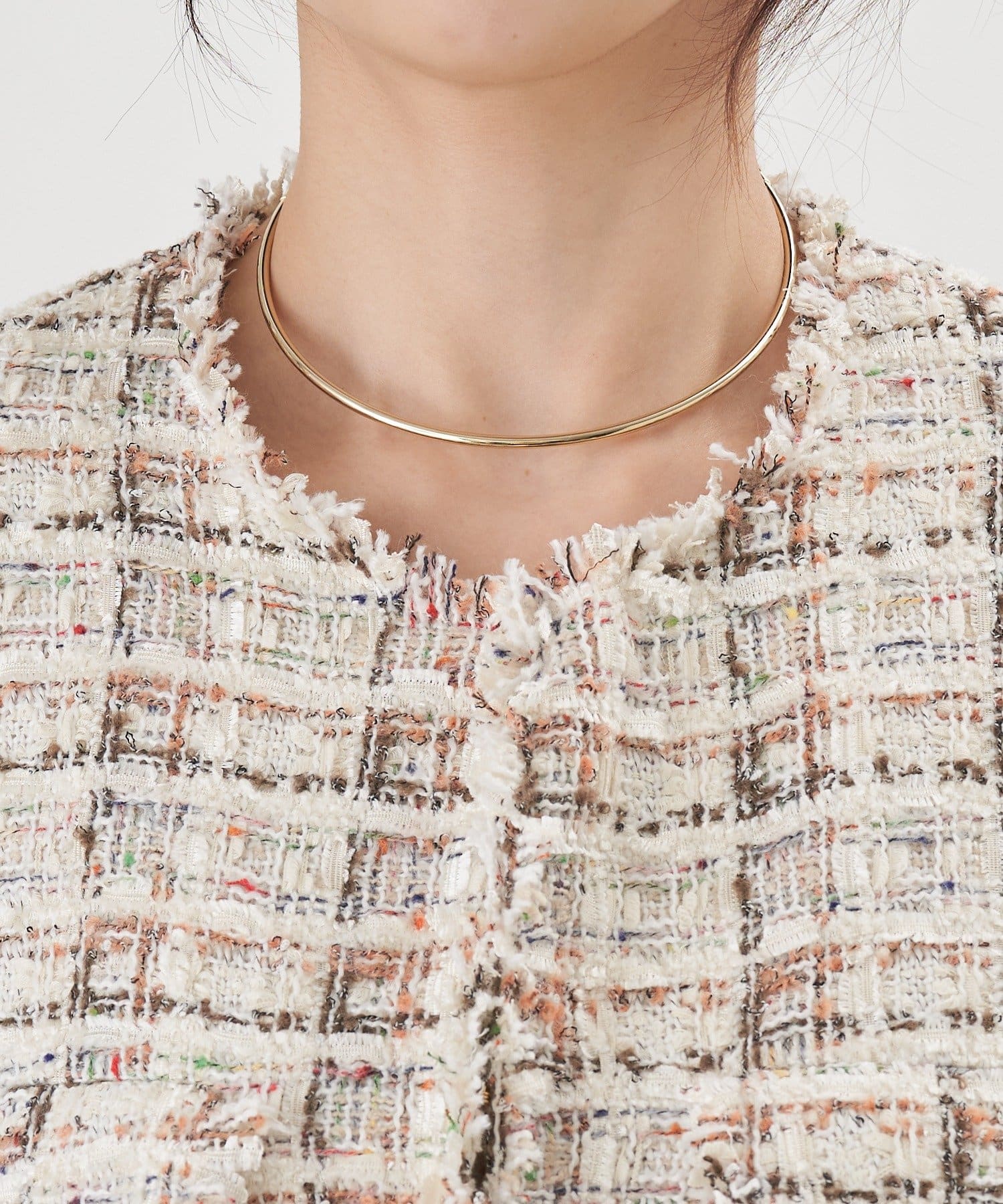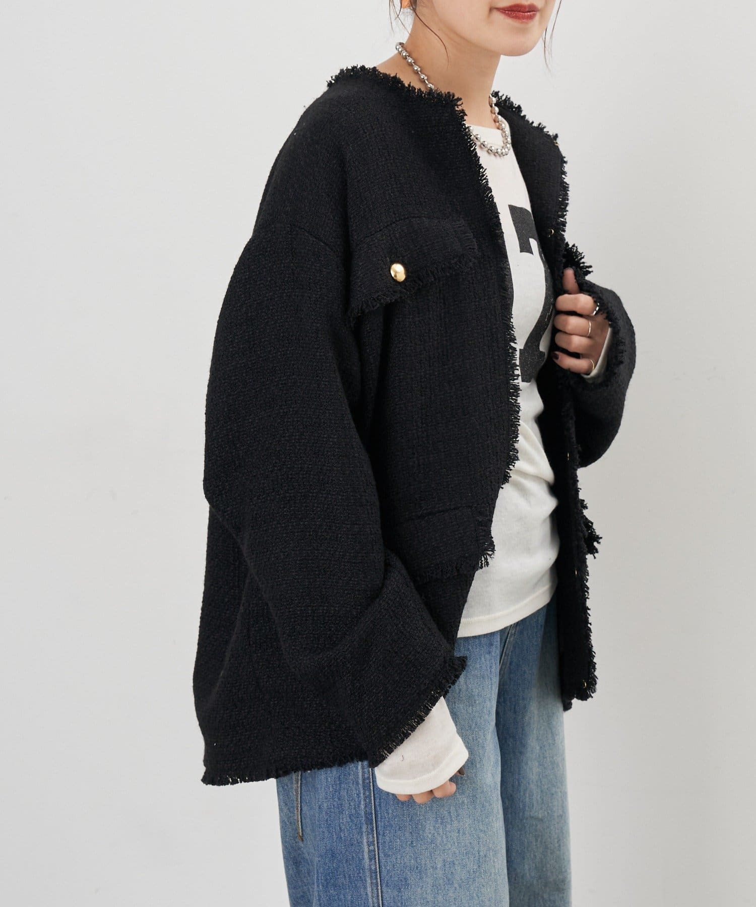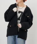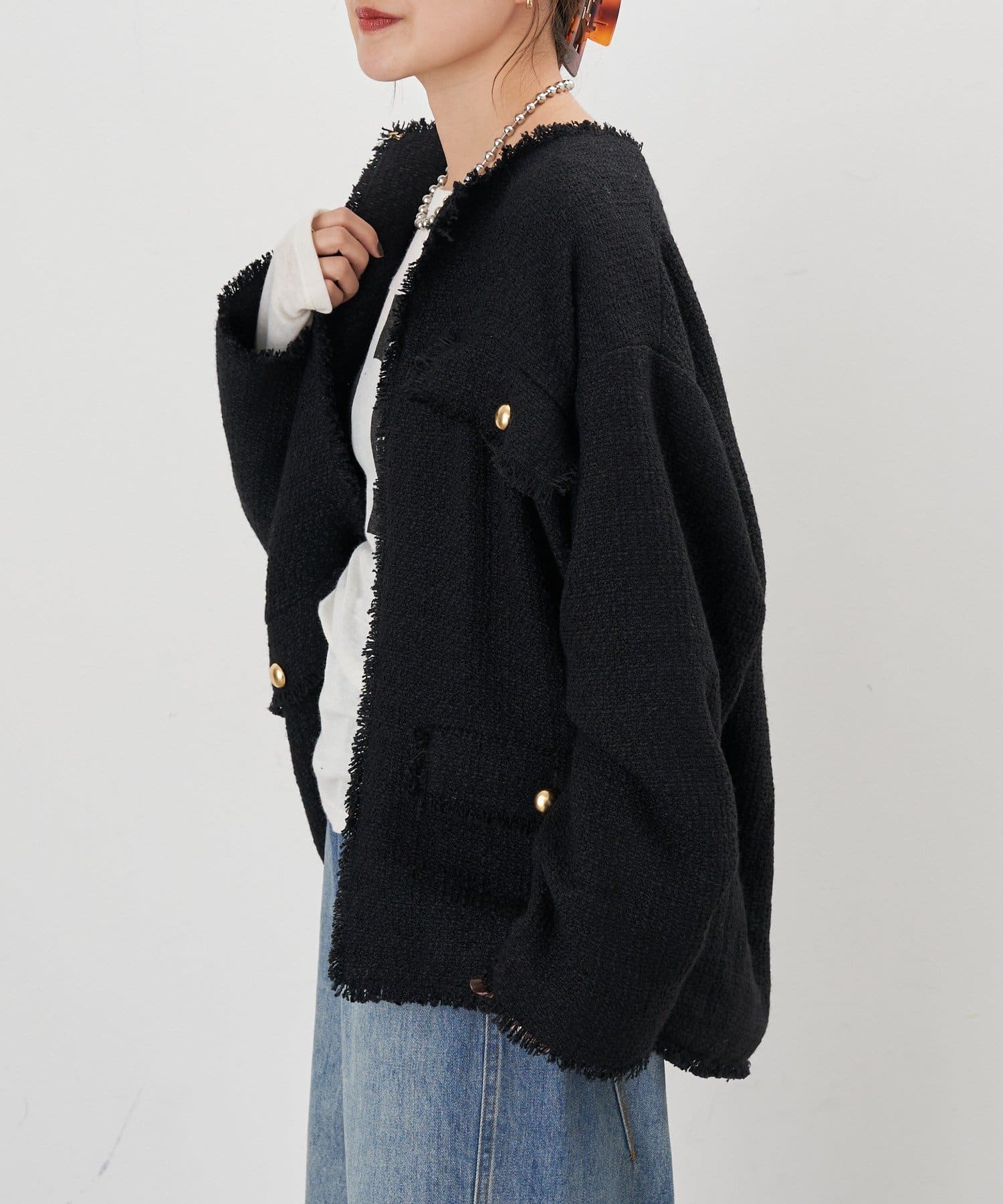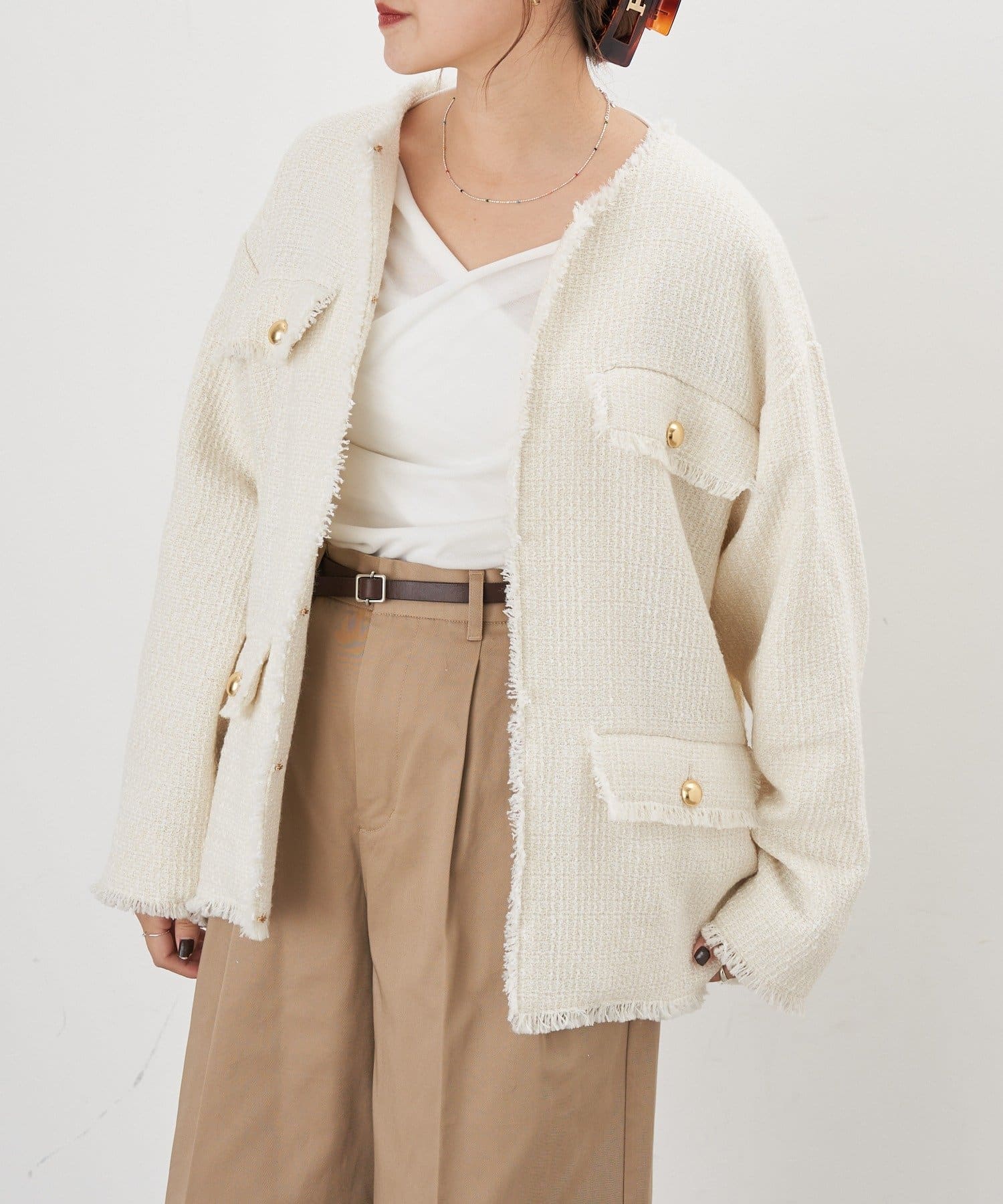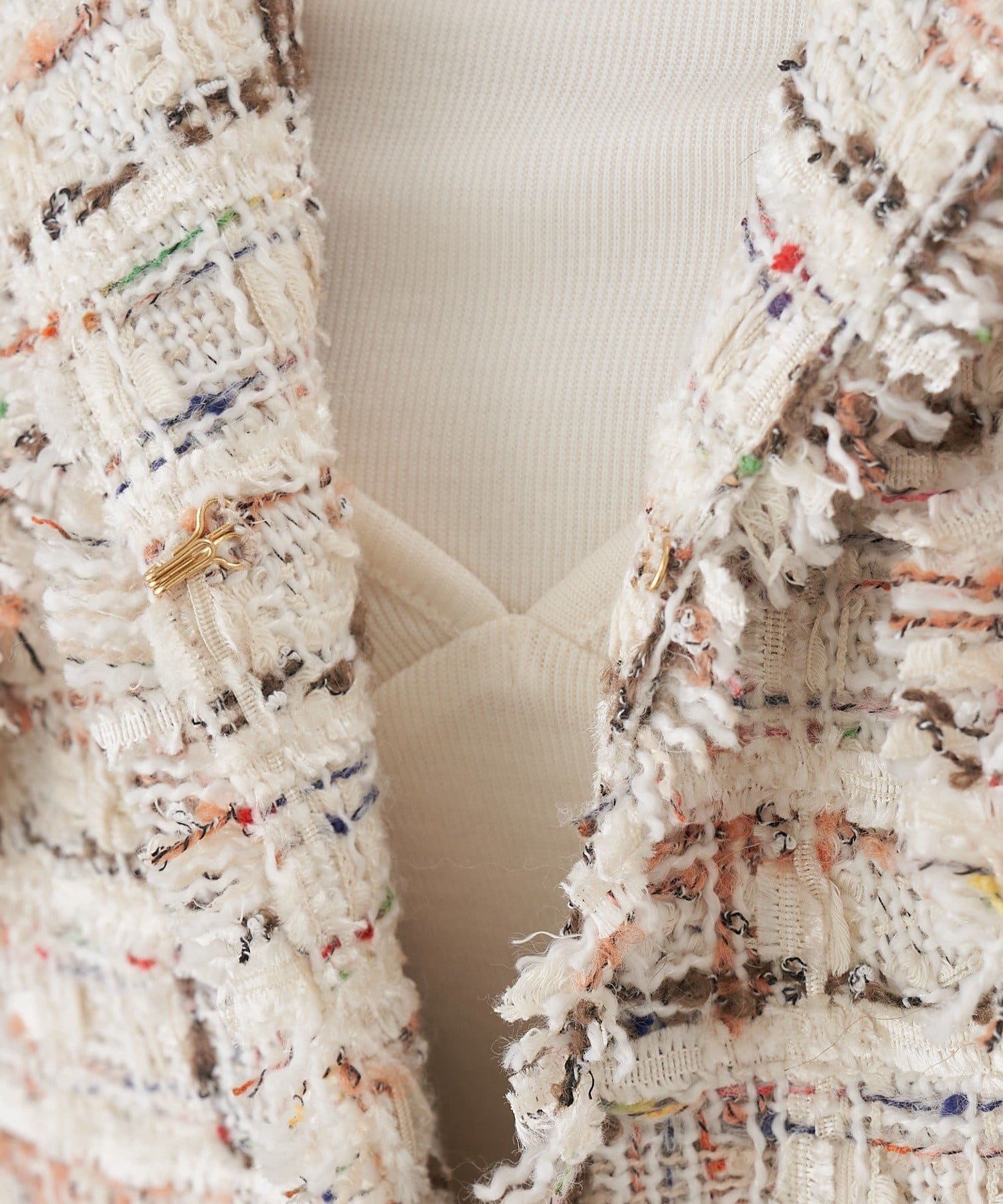 ツイード生地にゴールドボタンのアクセントをプラスしたノーカラーデザイン。
