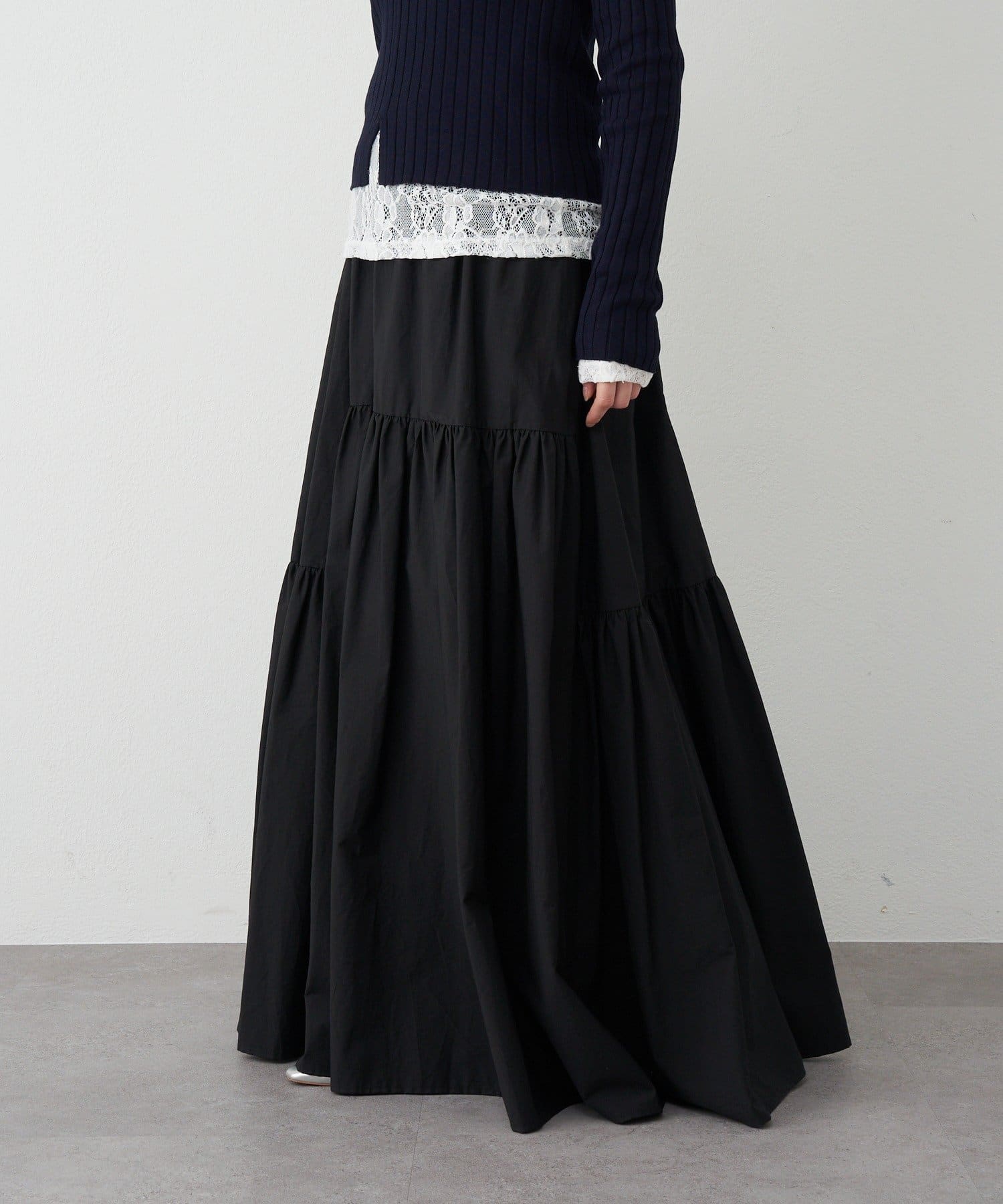 ハリ感のあるタフタ生地を使用したロングスカート。