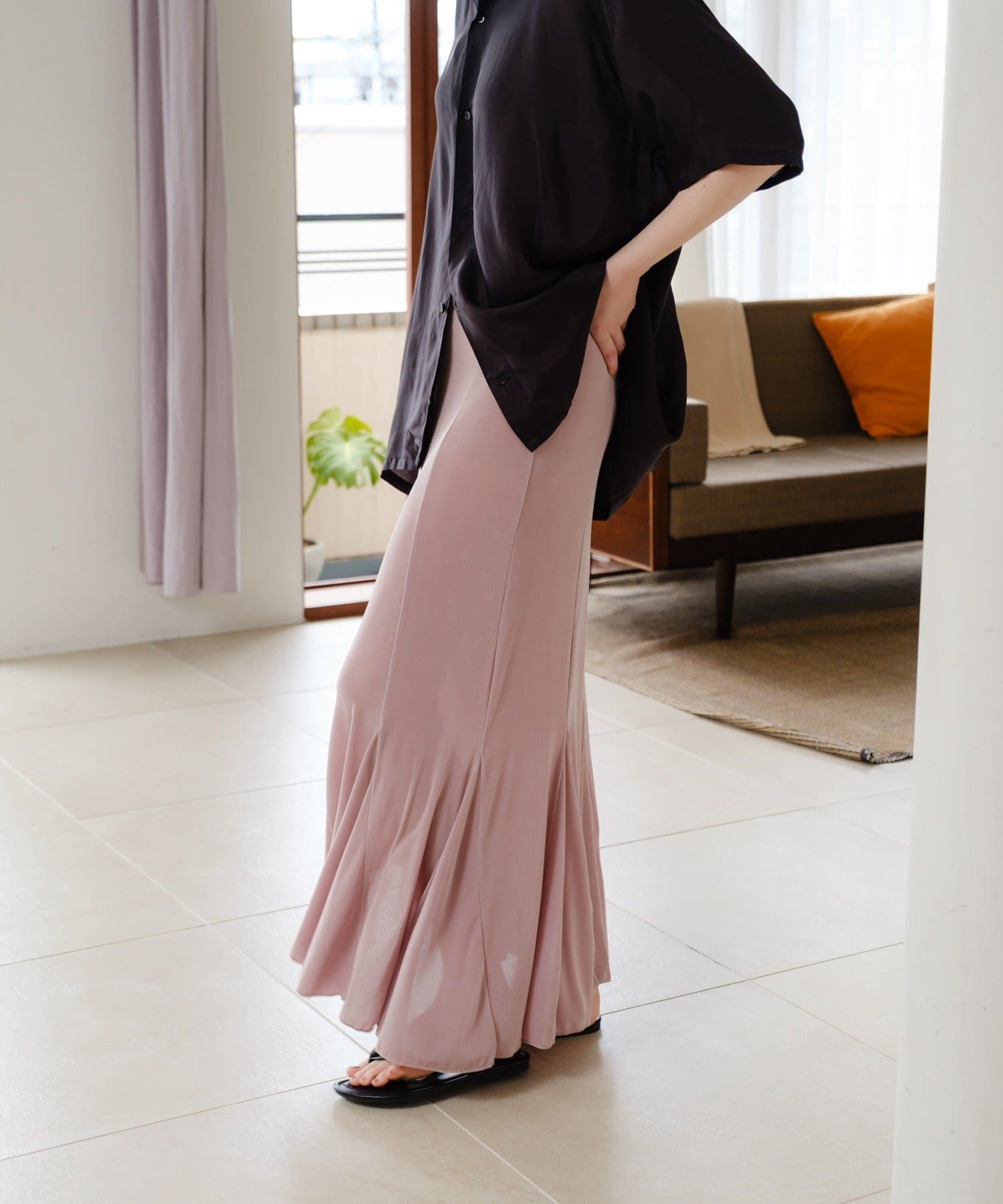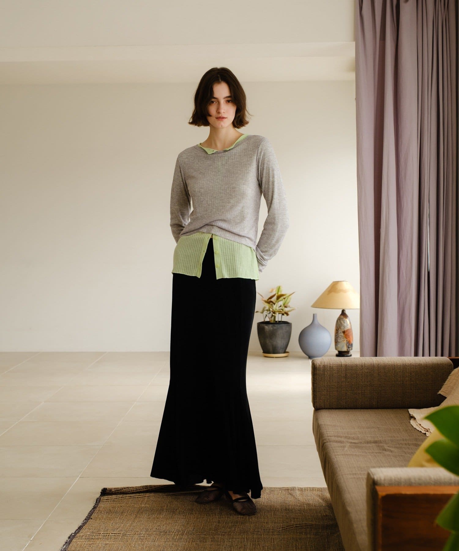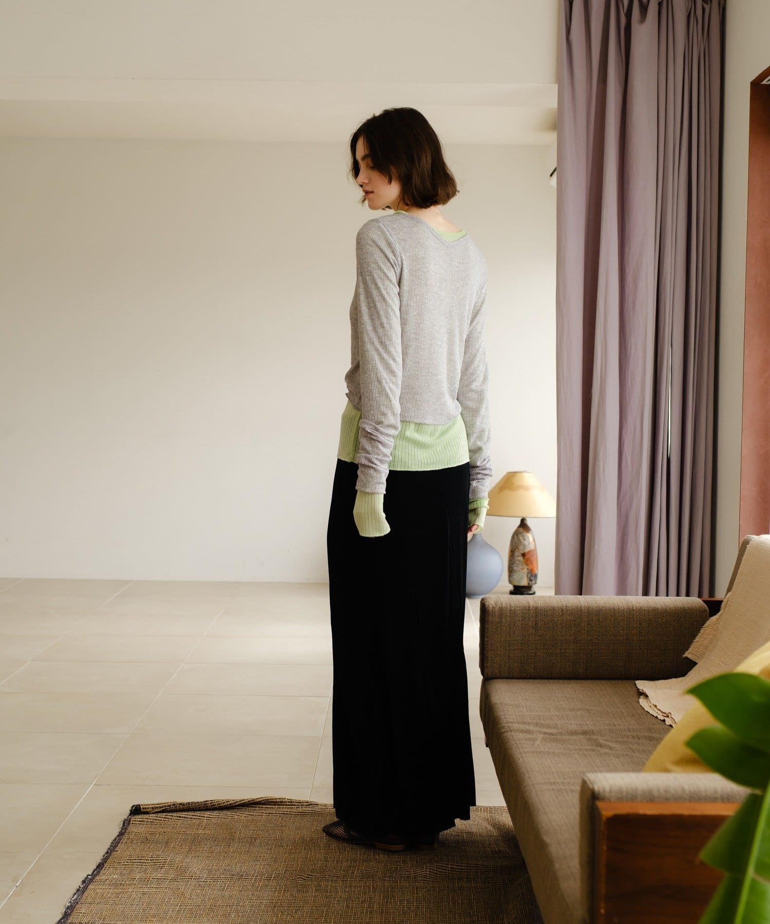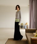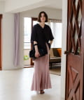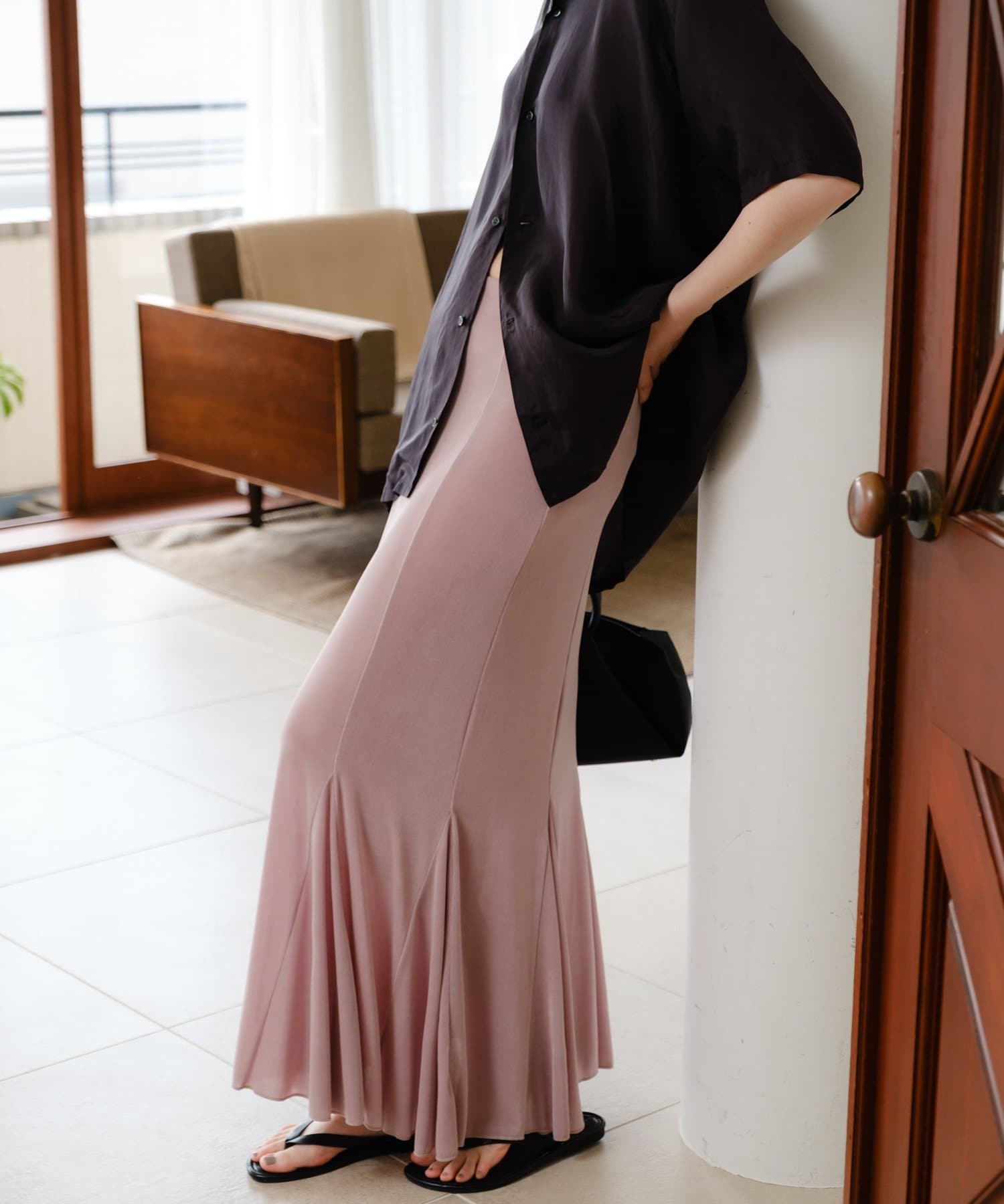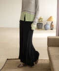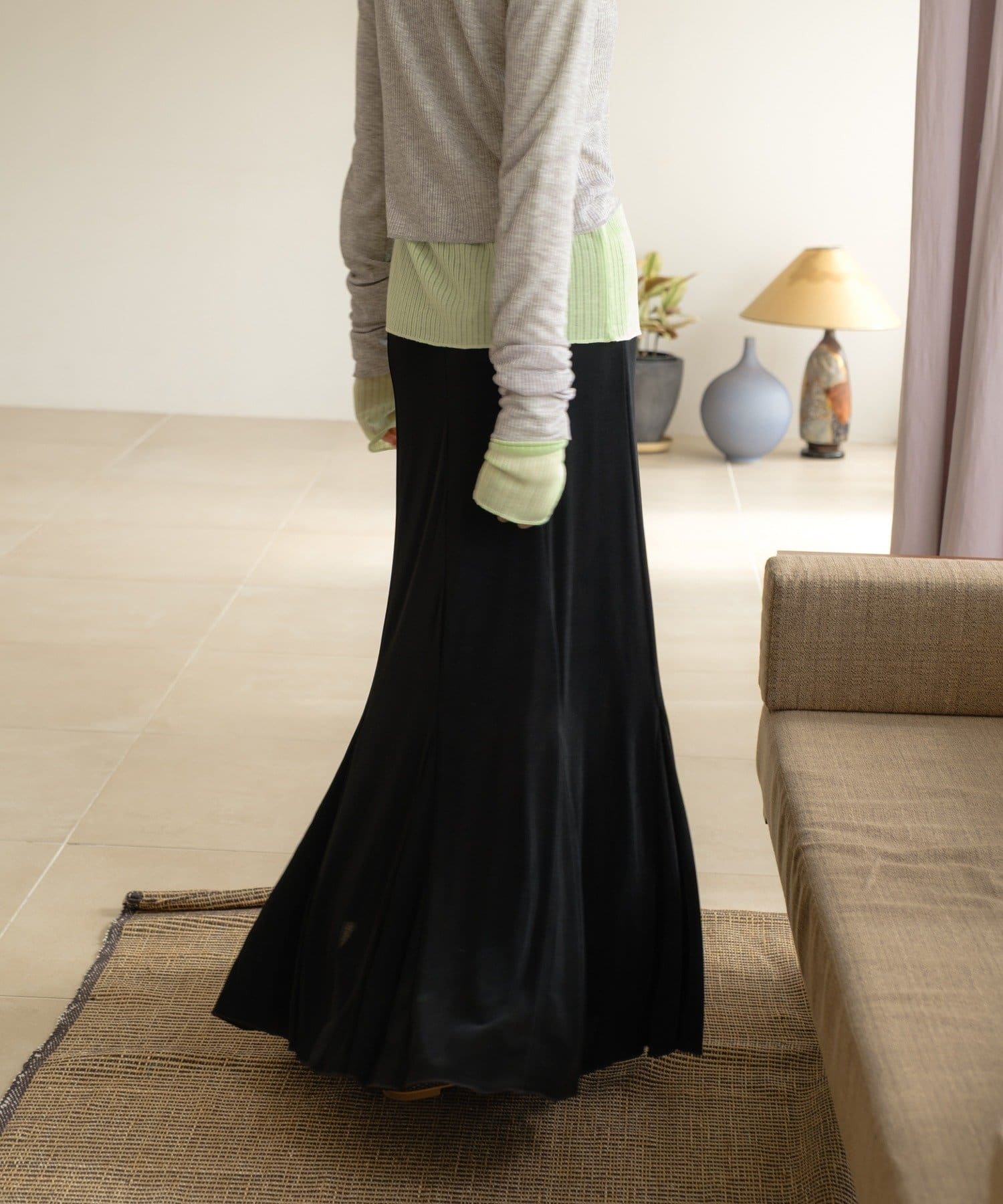伸縮性のあるシアーリブのカットソー生地を使用し、ハギをたっぷりと入れたイージーフレアースカートが登場。動く度にひらひらと美しく広がるシルエットと、ボディラインを補正してくれる程良いキックバックが魅力の一着です。アセテートの微光沢が美しく、デイリーユースはもちろん、オフィスやオケージョンシーンでも兼用でお召しいただけます。着用感は非常に快適で、ウエストもゴム使用で伸び感があるため、窮屈感なくシーズンを通して定番品として汎用性高くご着用いただけます。