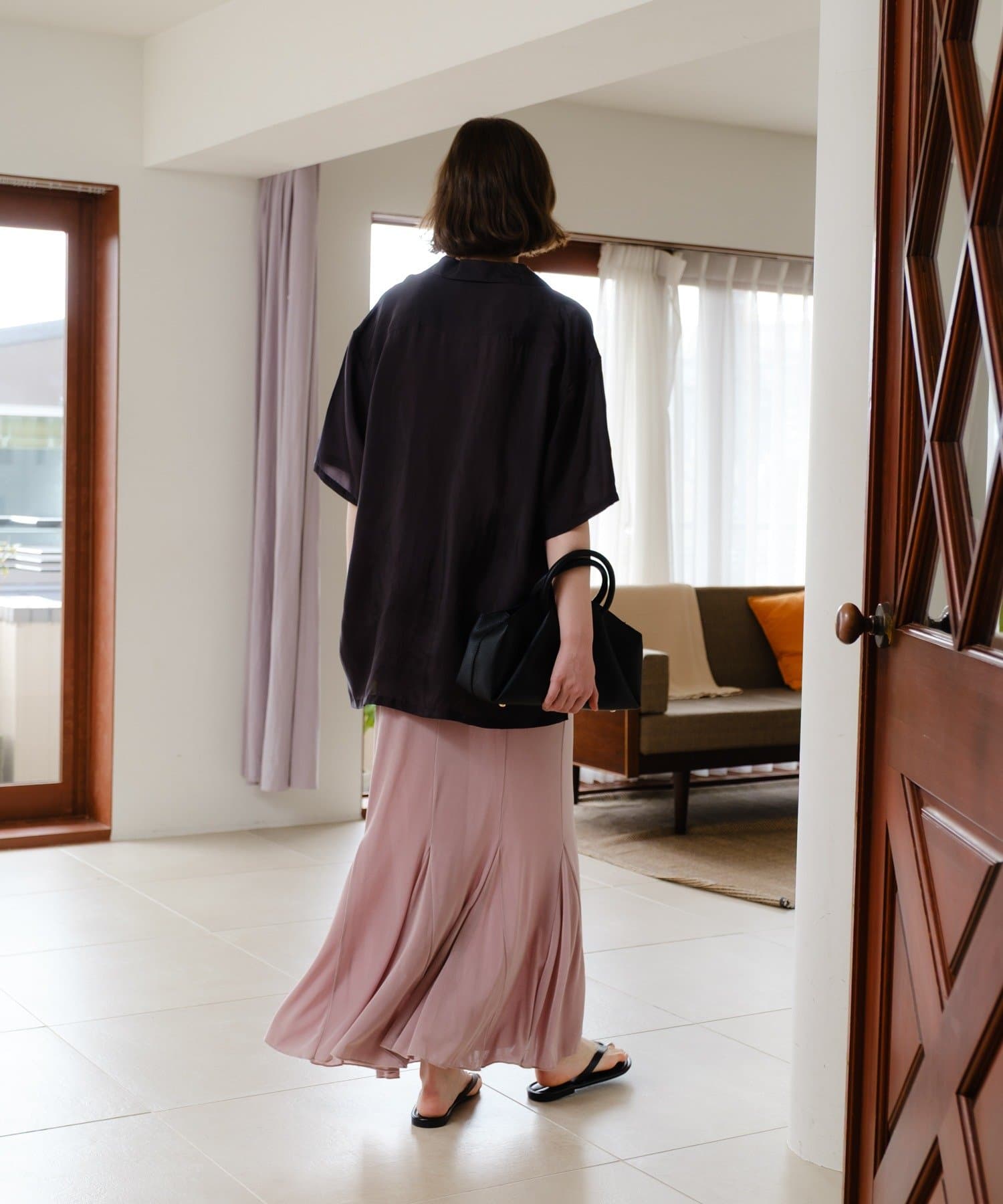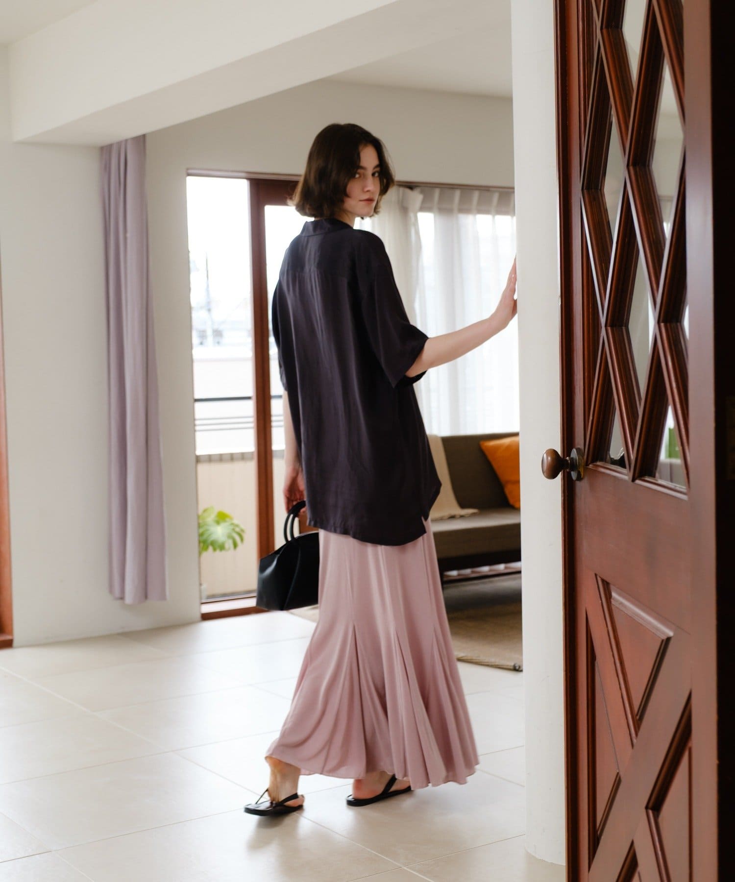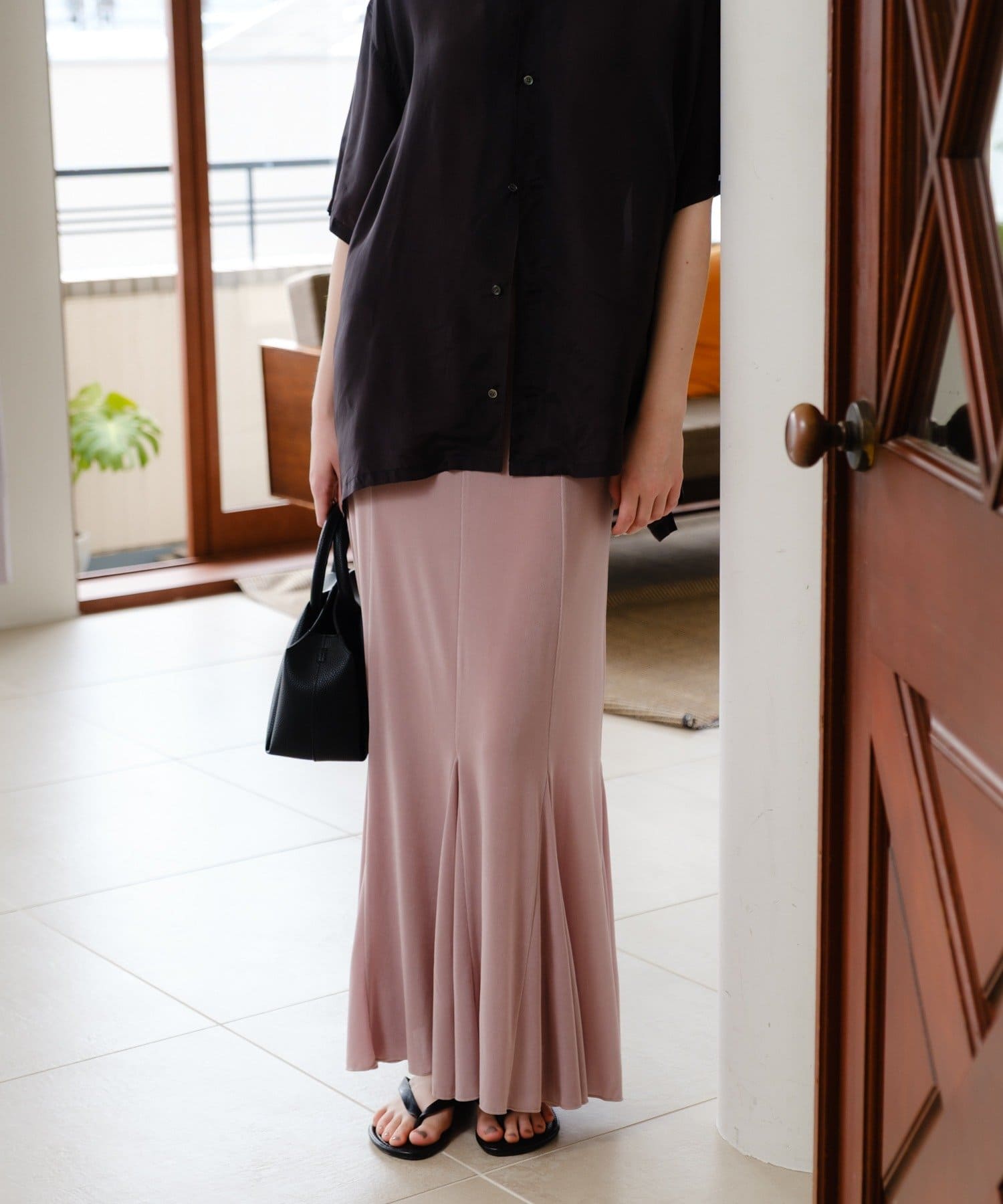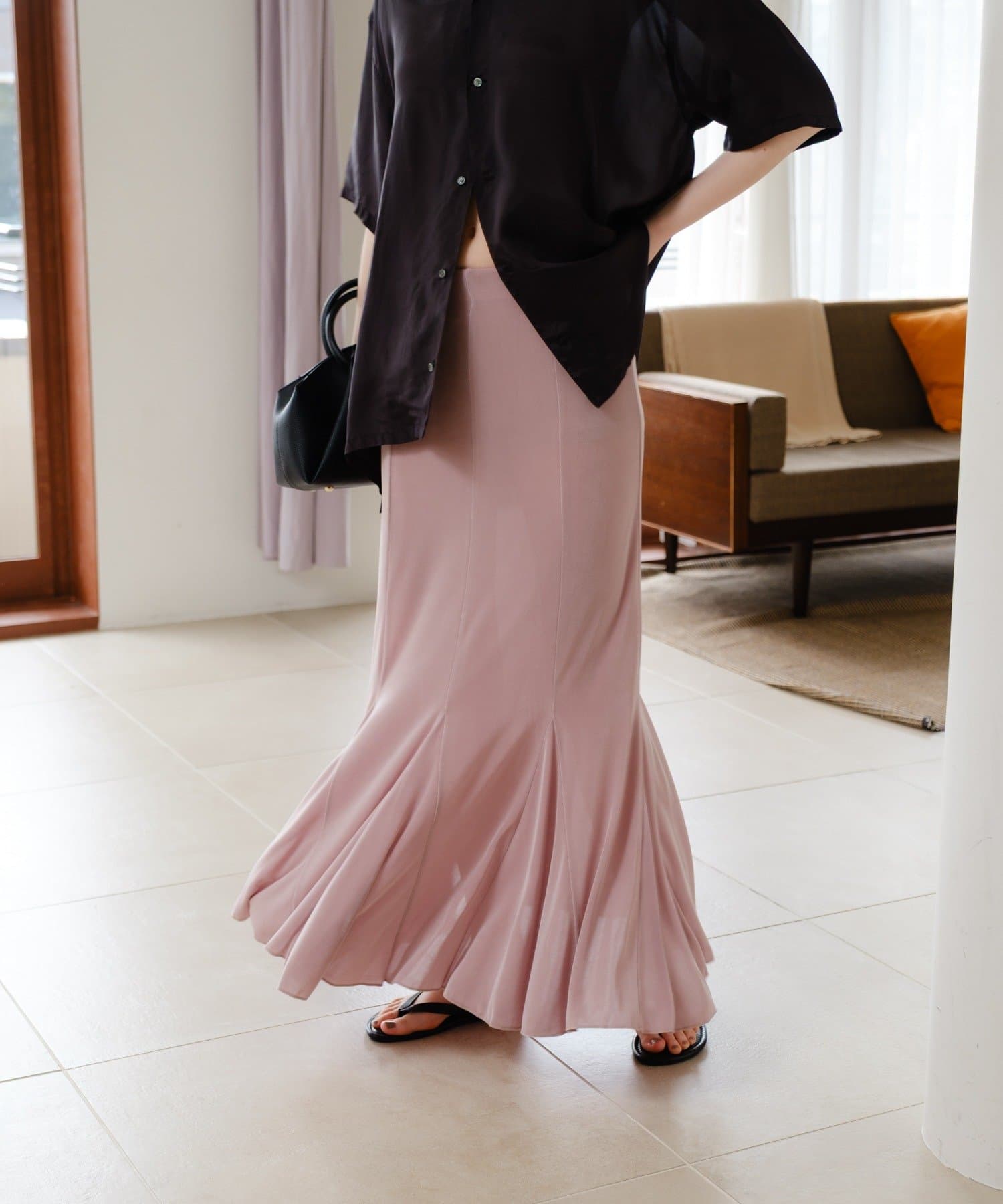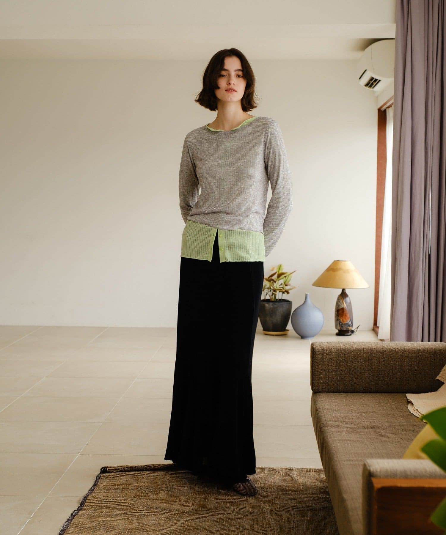 伸縮性のあるシアーリブのカットソー生地を使用し、ハギをたっぷりと入れたイージーフレアースカートが登場。動く度にひらひらと美しく広がるシルエットと、ボディラインを補正してくれる程良いキックバックが魅力の一着です。アセテートの微光沢が美しく、デイリーユースはもちろん、オフィスやオケージョンシーンでも兼用でお召しいただけます。着用感は非常に快適で、ウエストもゴム使用で伸び感があるため、窮屈感なくシーズンを通して定番品として汎用性高くご着用いただけます。