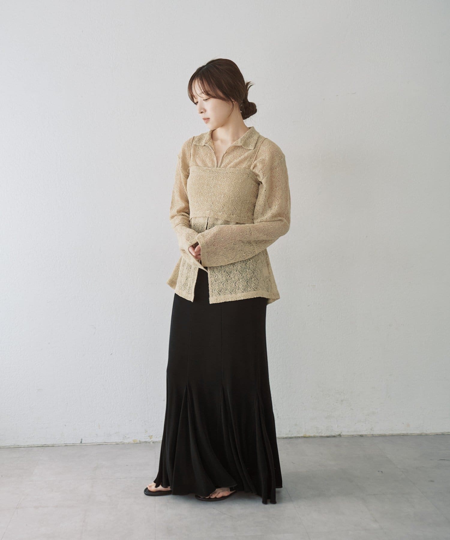 伸縮性のあるシアーリブのカットソー生地を使用し、ハギをたっぷりと入れたイージーフレアースカートが登場。動く度にひらひらと美しく広がるシルエットと、ボディラインを補正してくれる程良いキックバックが魅力の一着です。アセテートの微光沢が美しく、デイリーユースはもちろん、オフィスやオケージョンシーンでも兼用でお召しいただけます。着用感は非常に快適で、ウエストもゴム使用で伸び感があるため、窮屈感なくシーズンを通して定番品として汎用性高くご着用いただけます。