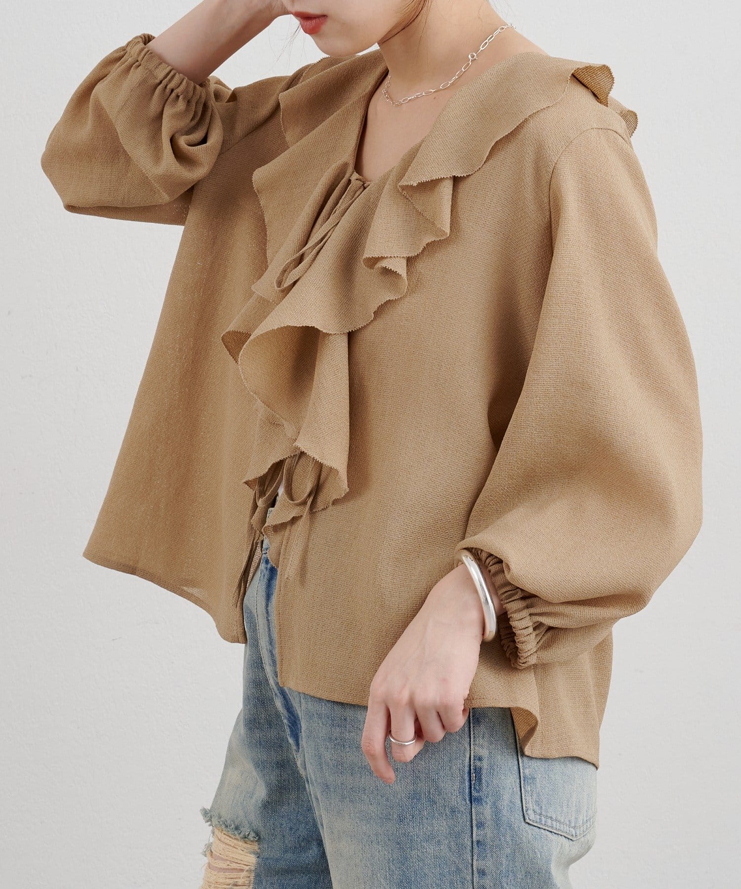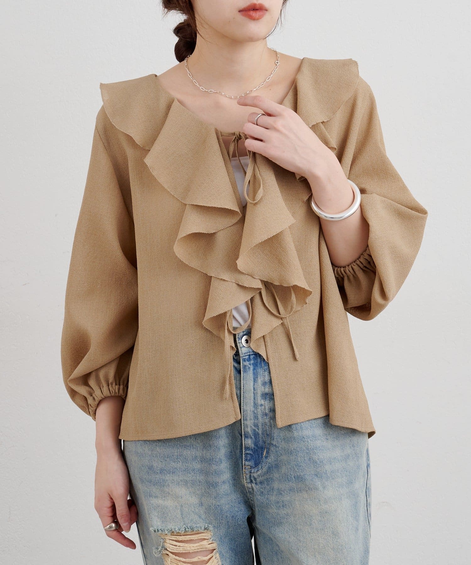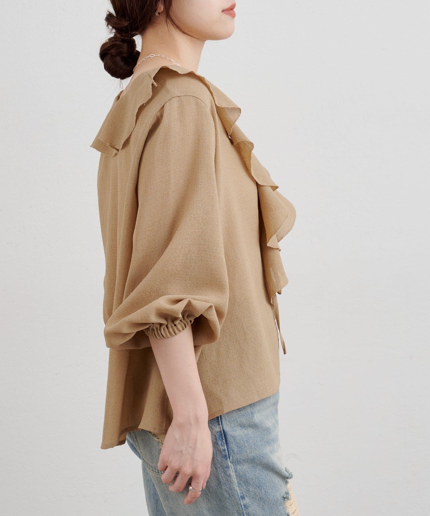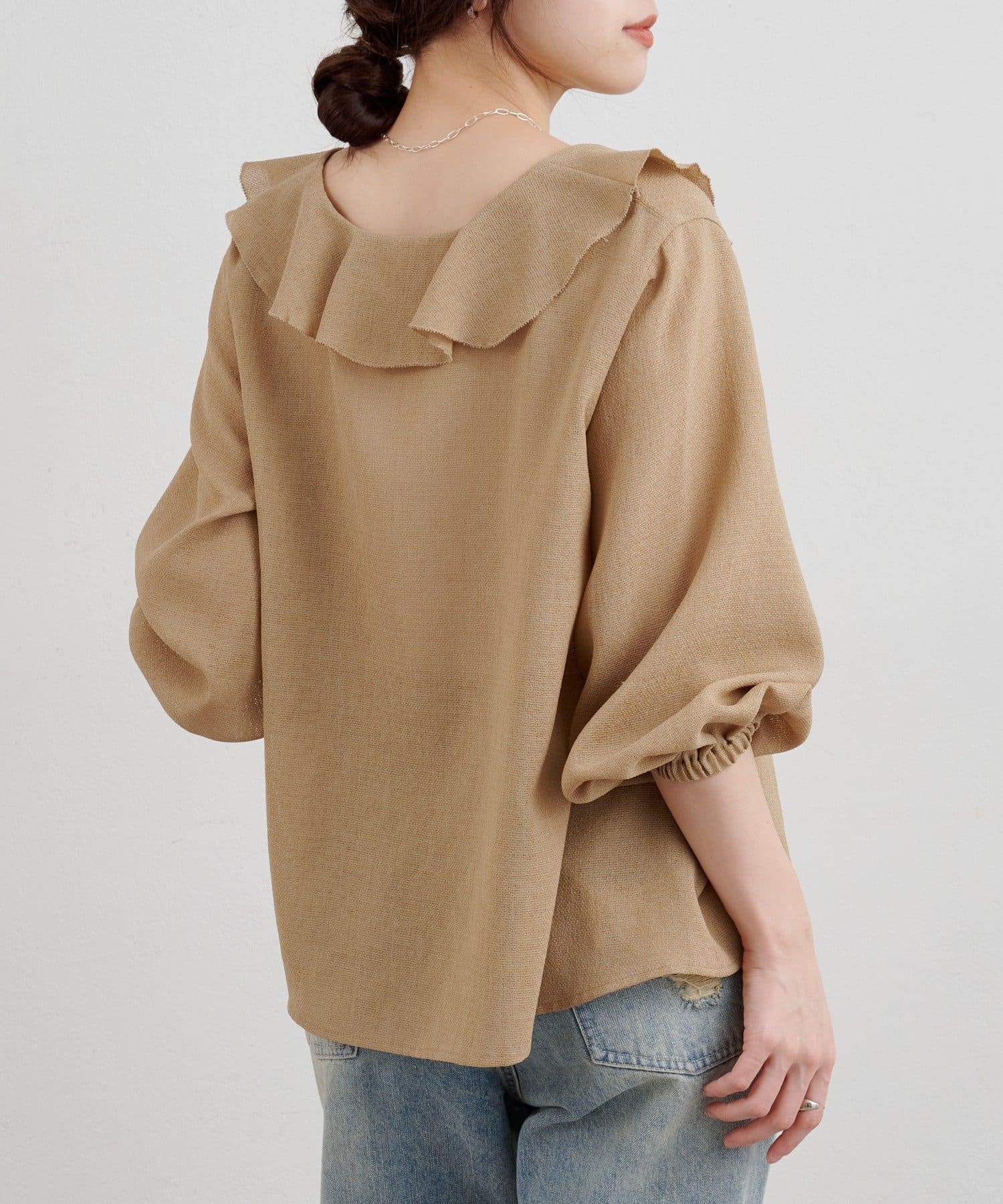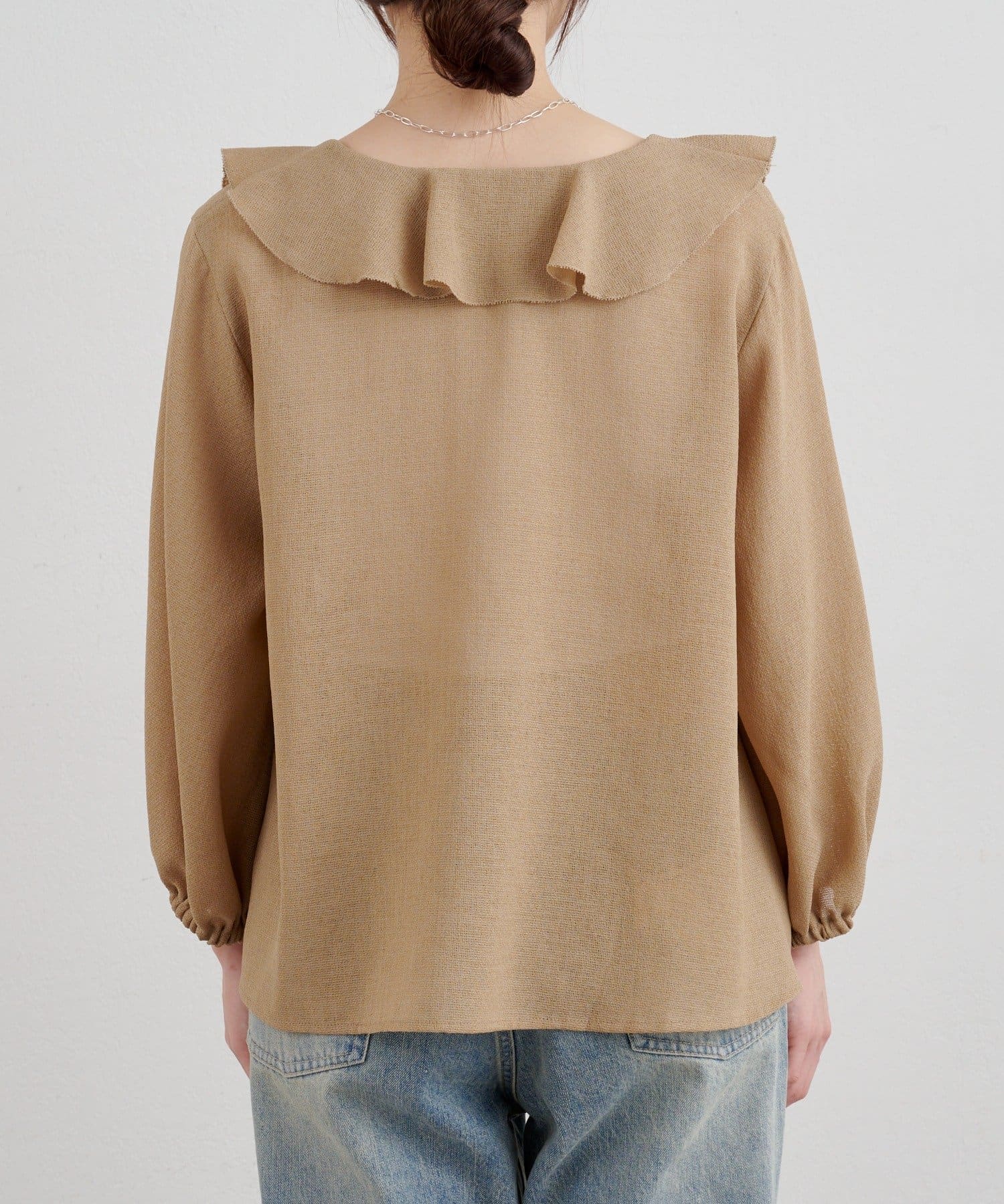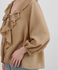 大きくデザインした印象的なフリルカラーがポイントのブラウス