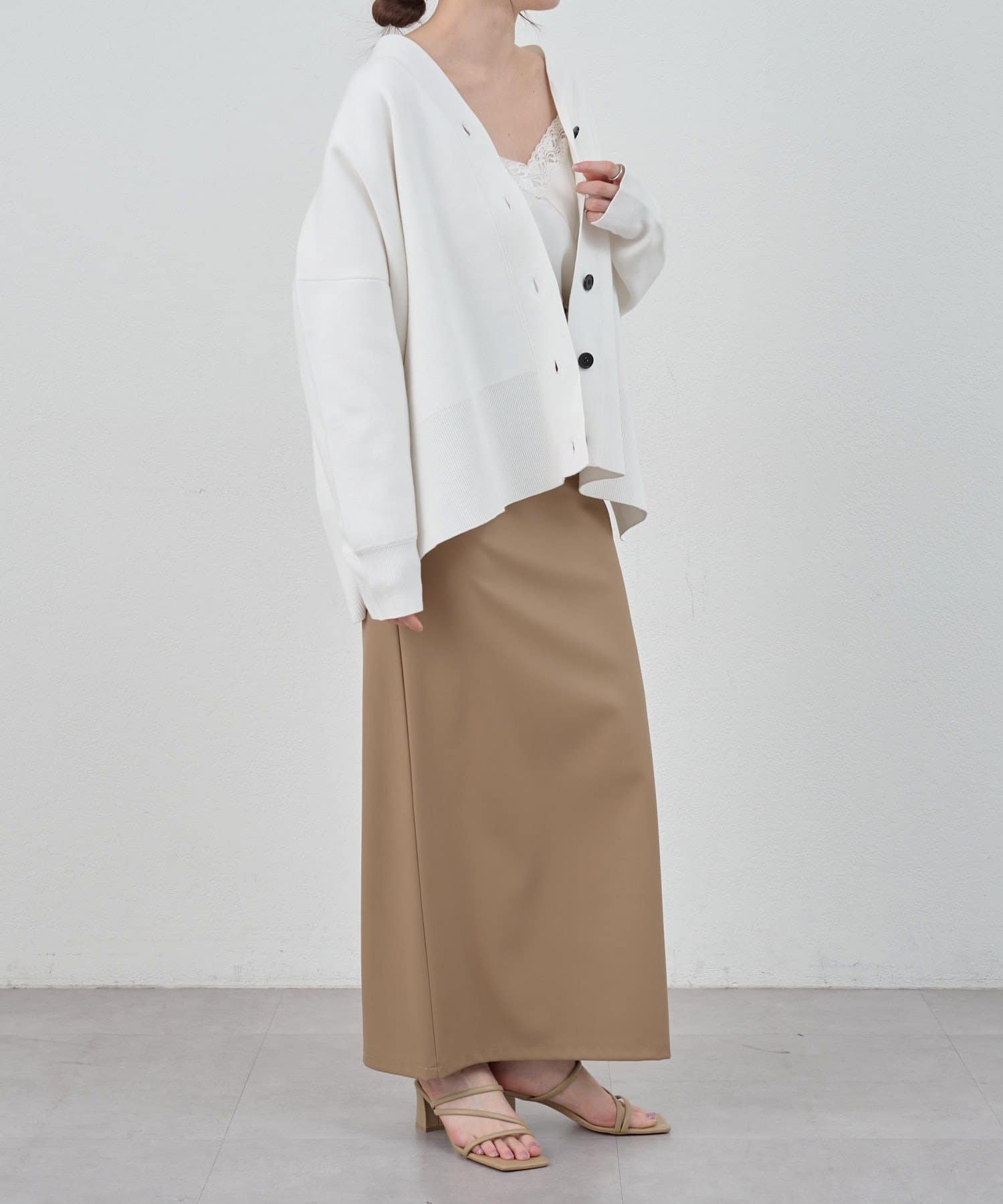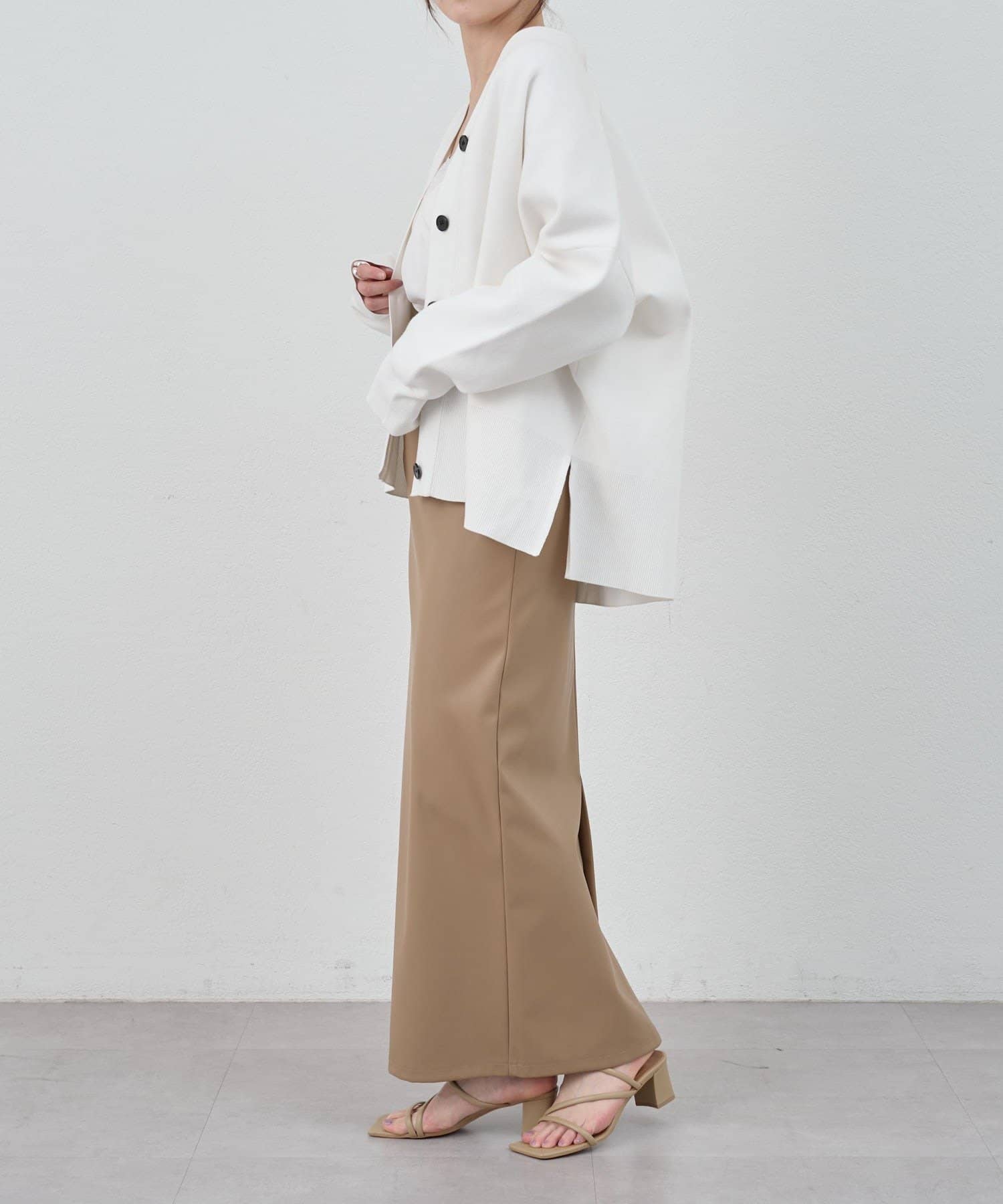 程よいハリがあり、フロントのボタンを留めてトップス風に着ていただくのもおすすめです。