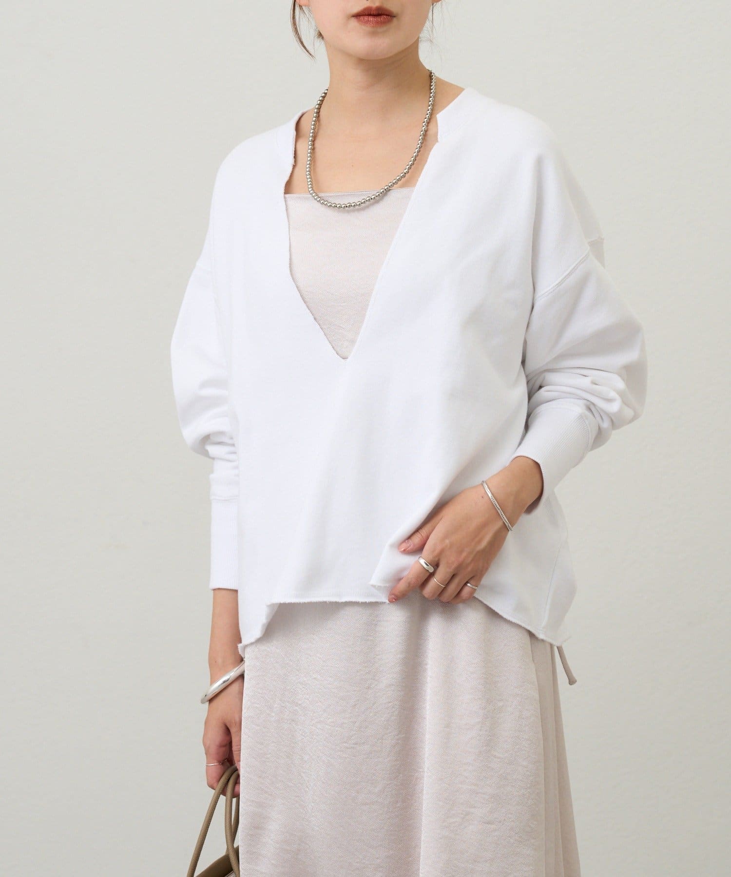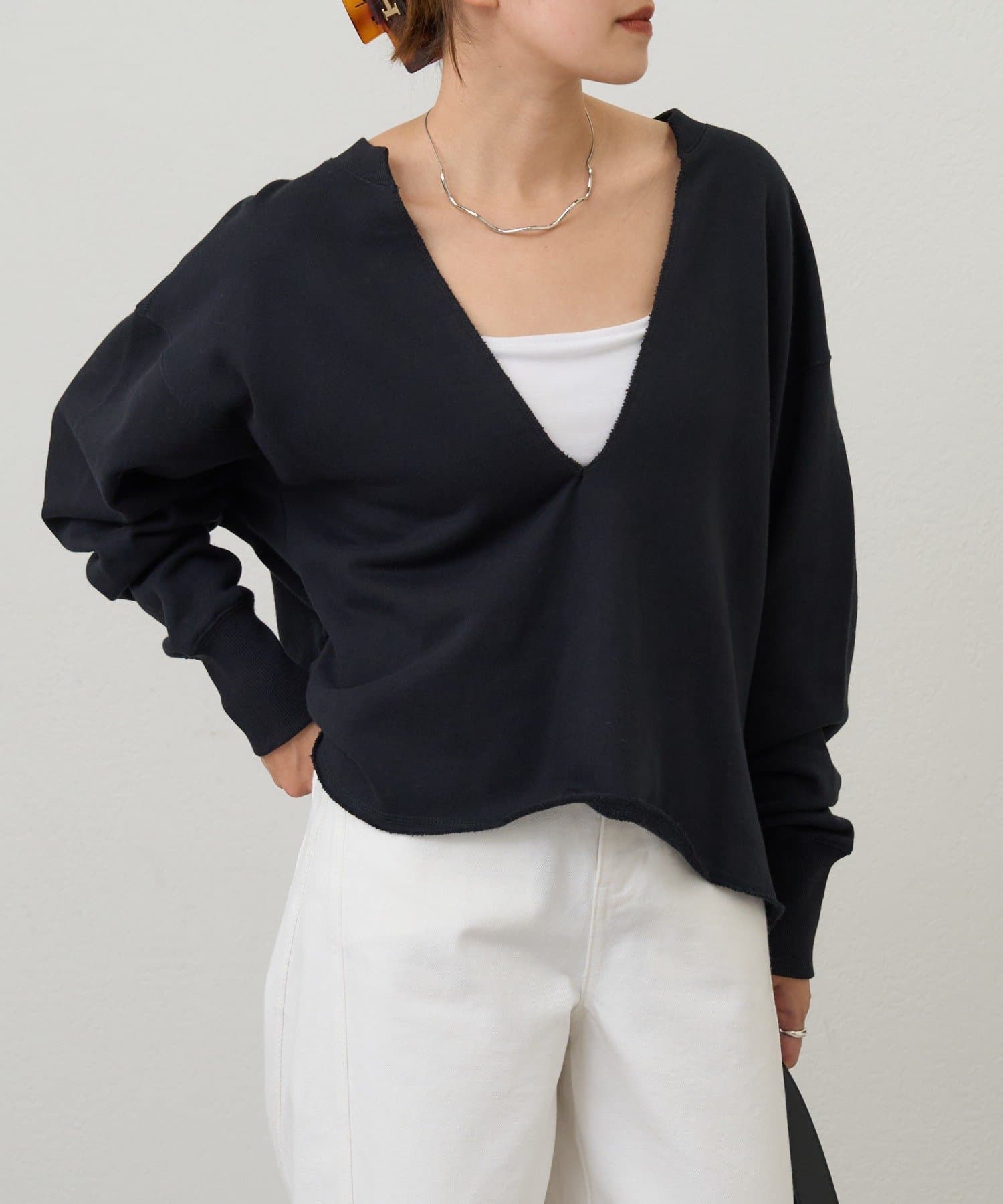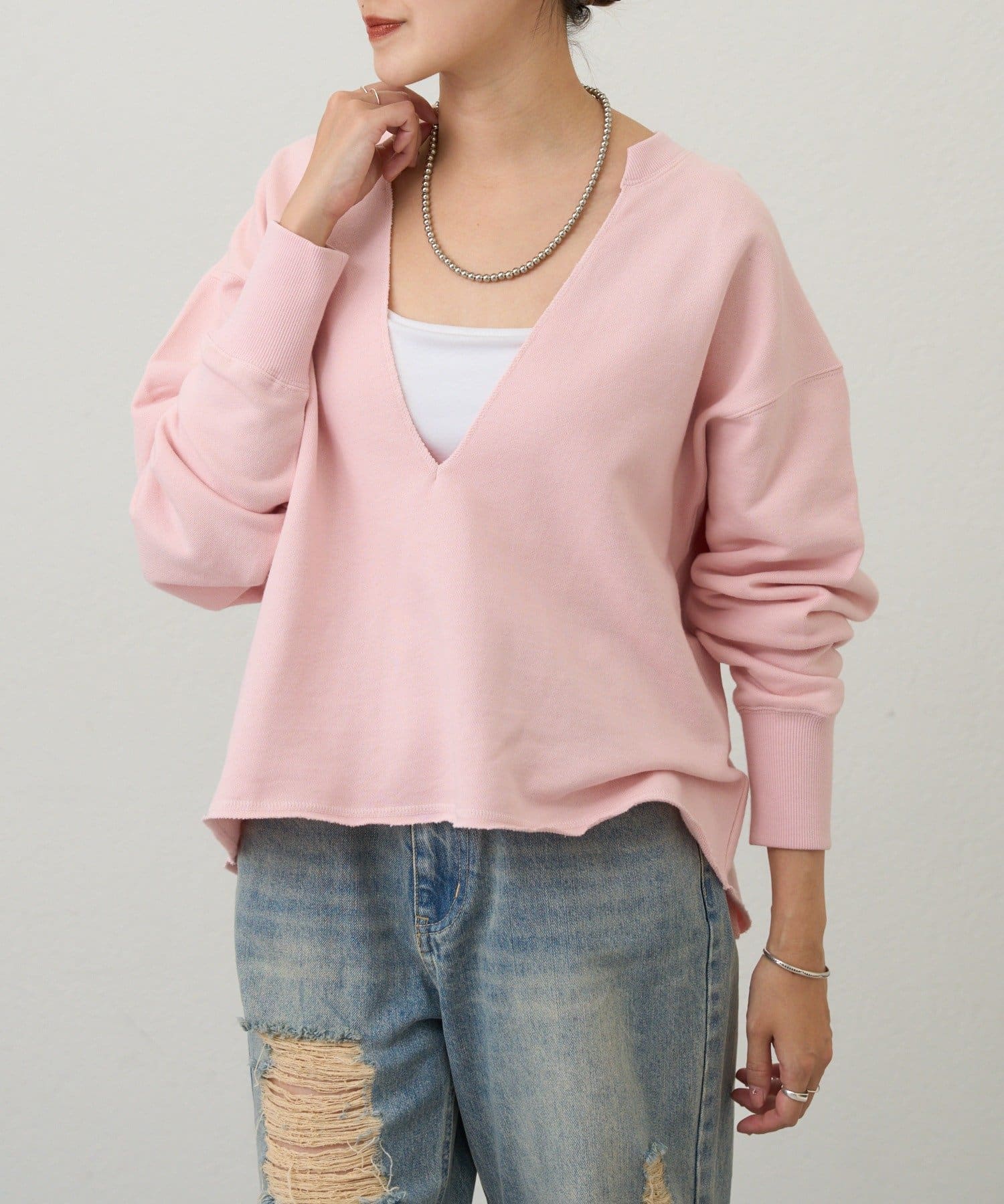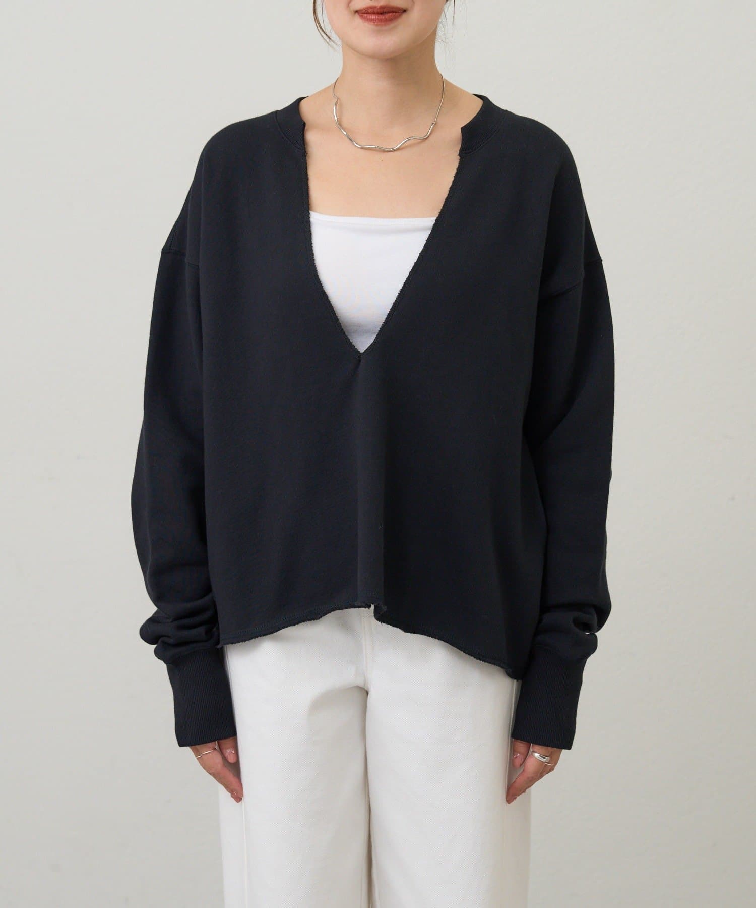 レイヤードも楽しめる深いVネック開きが特徴のスウェット。