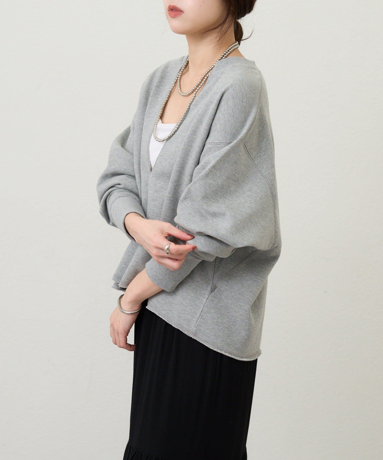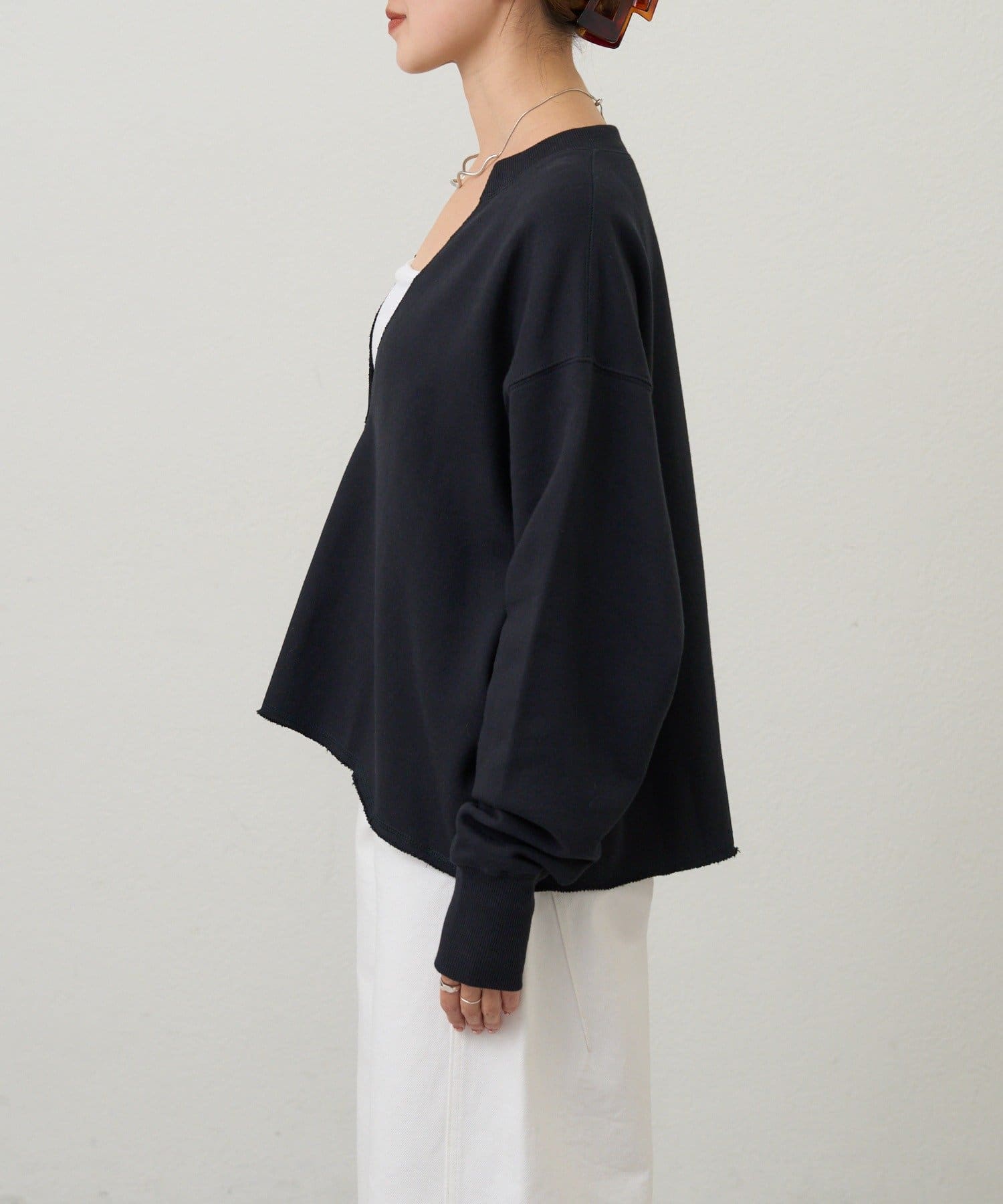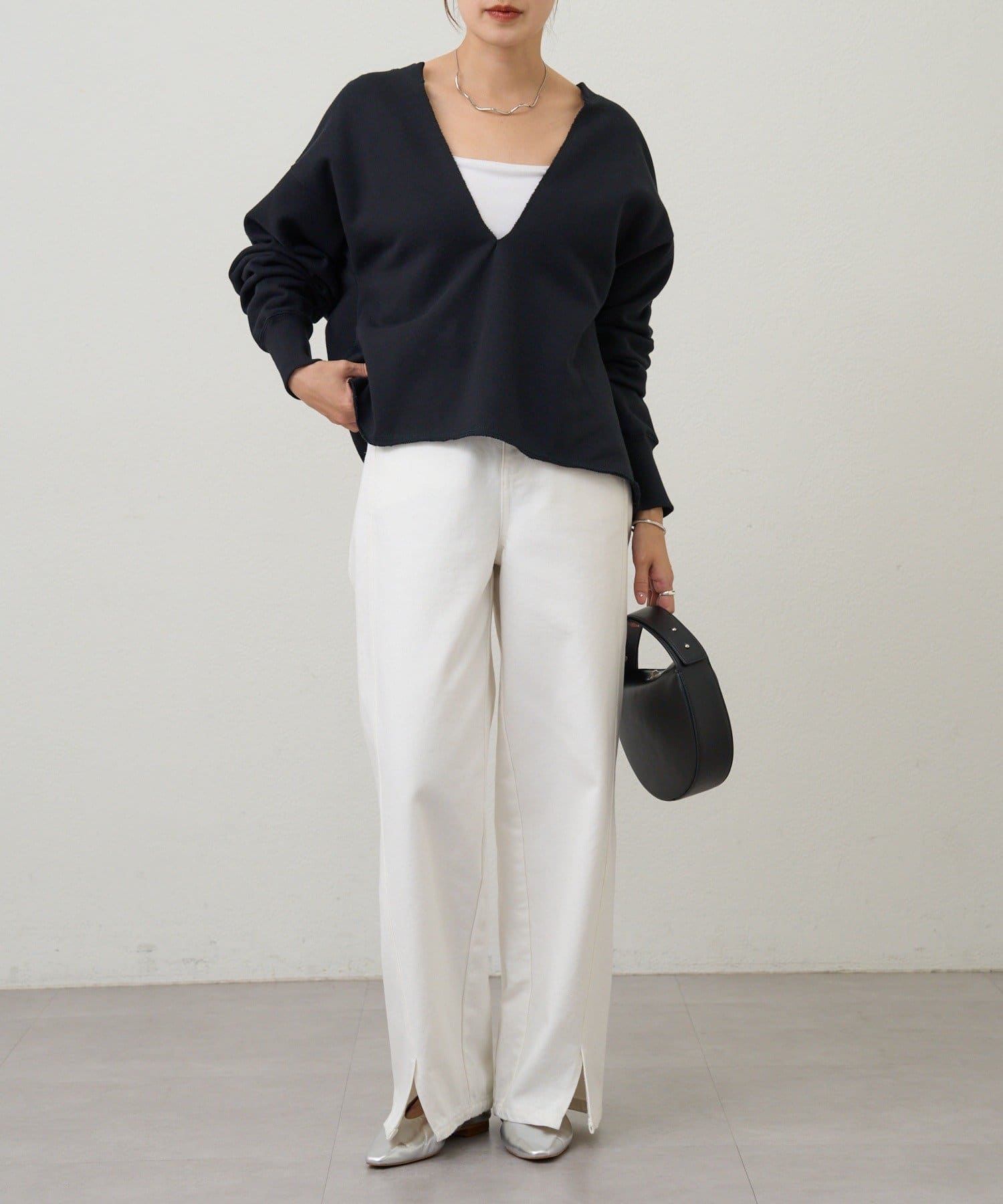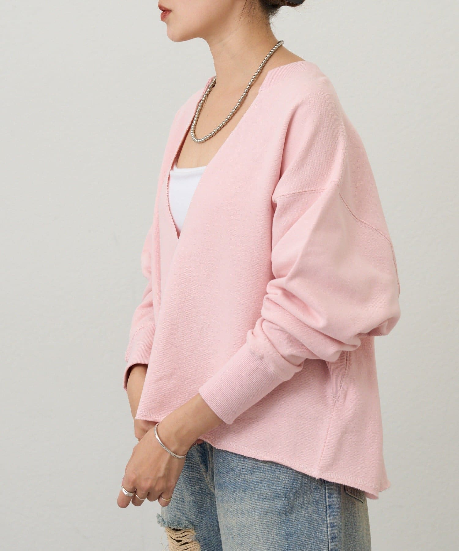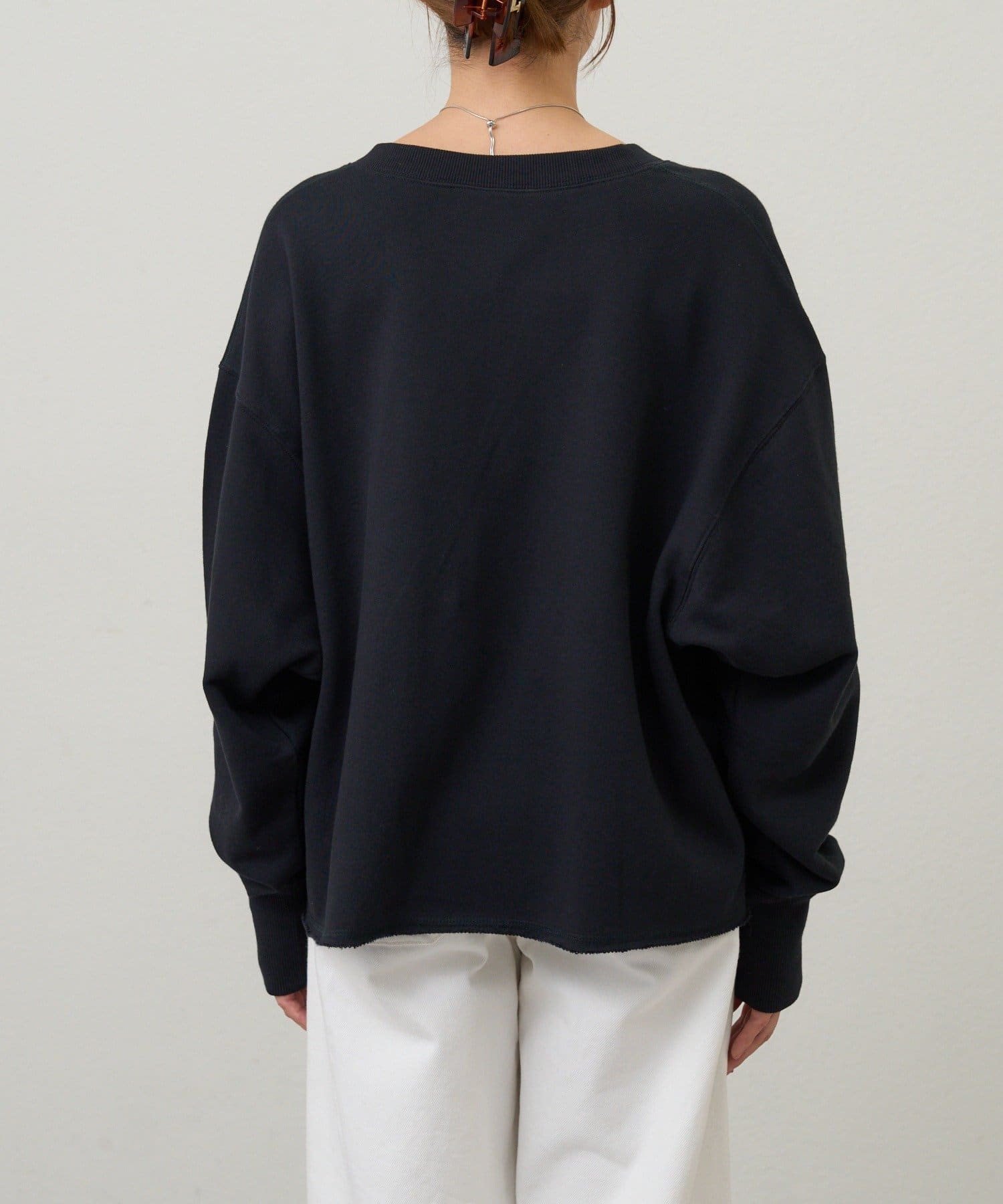 レイヤードも楽しめる深いVネック開きが特徴のスウェット。