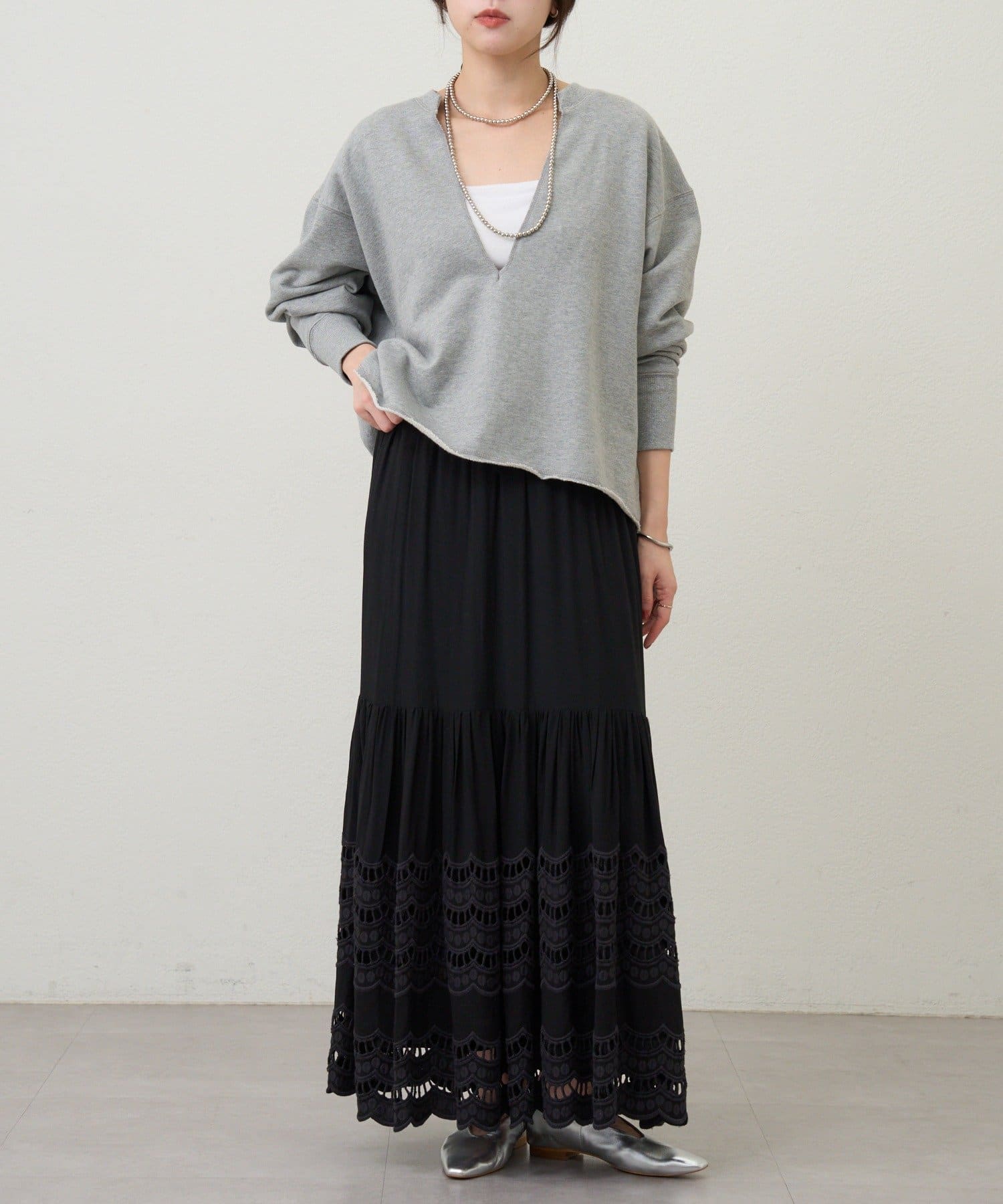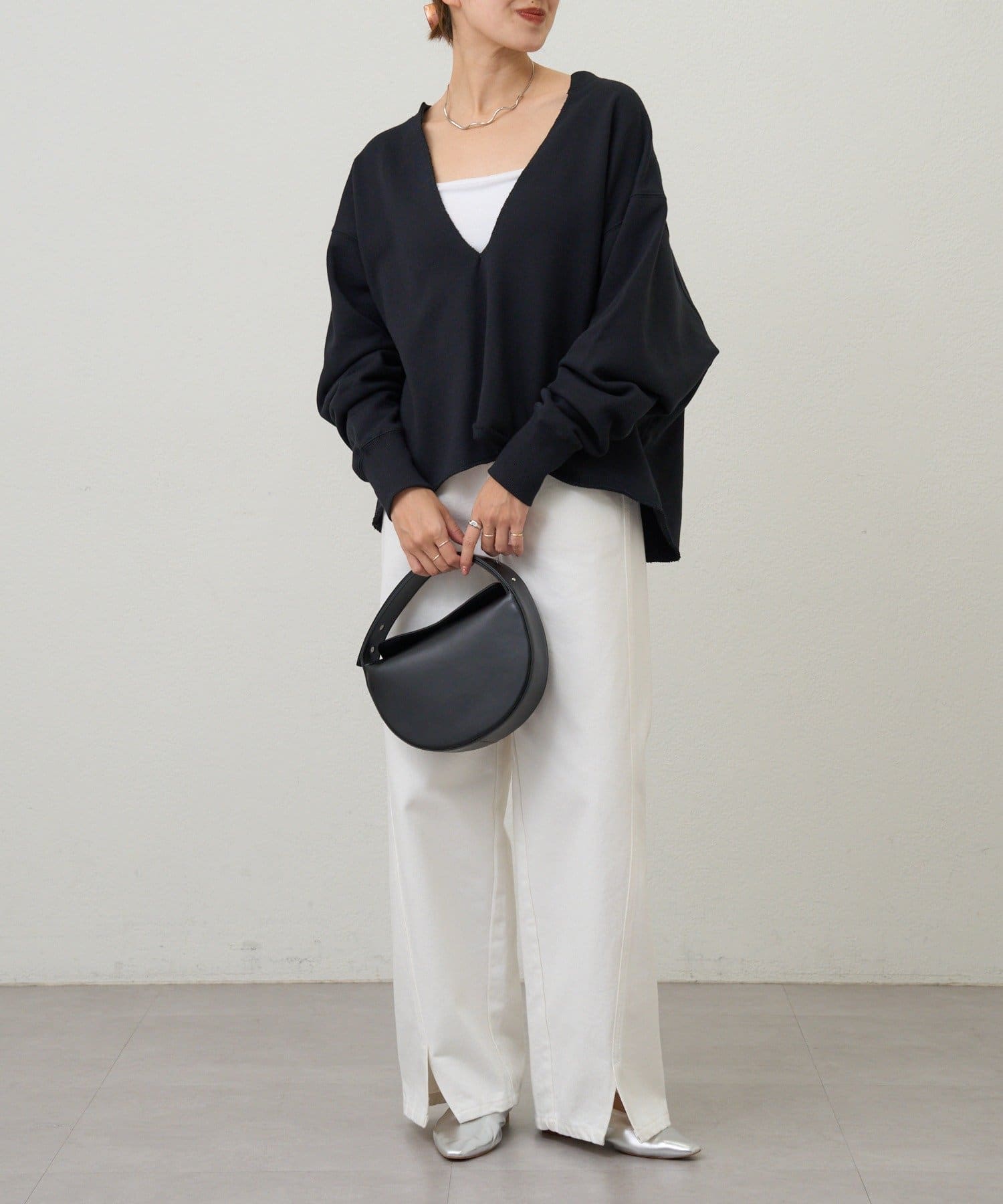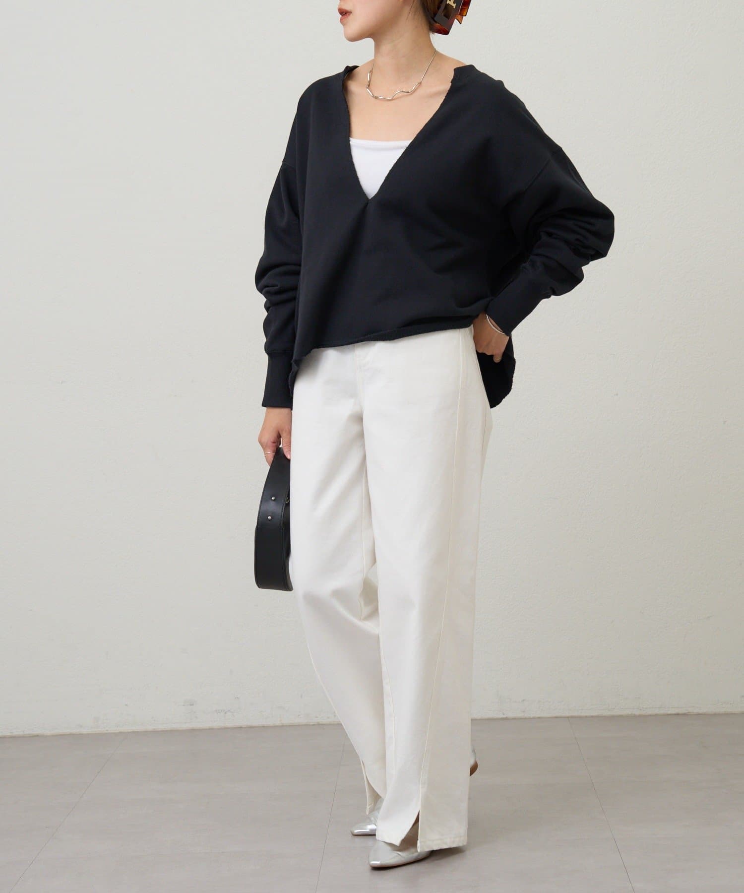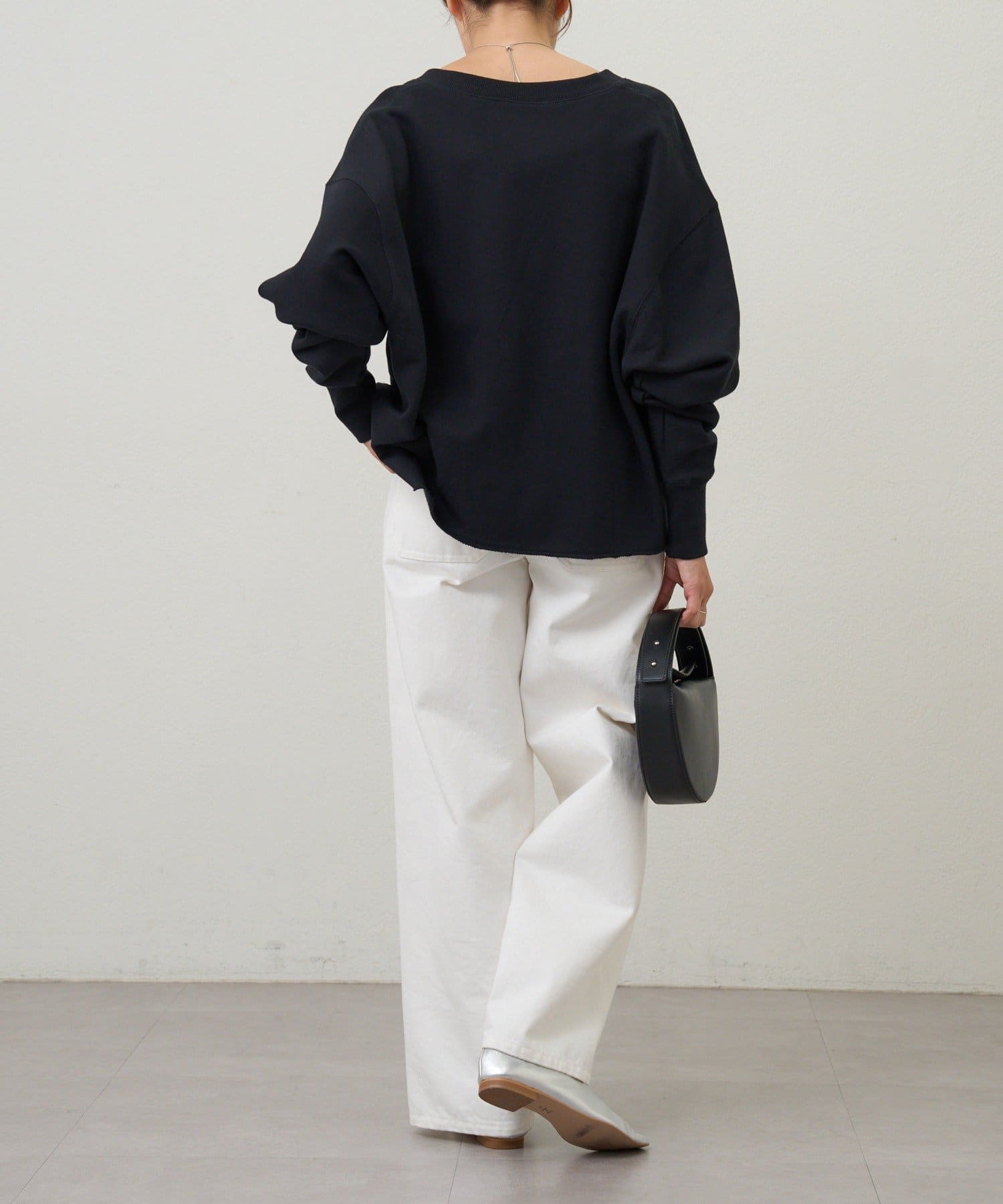 レイヤードも楽しめる深いVネック開きが特徴のスウェット。