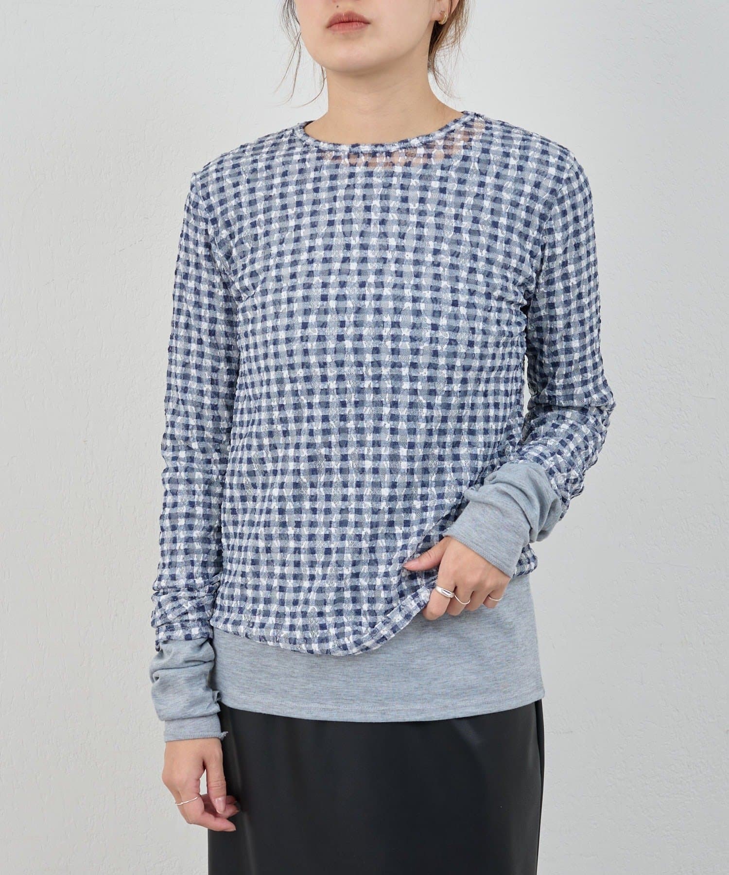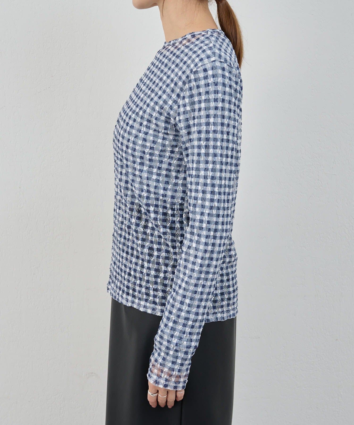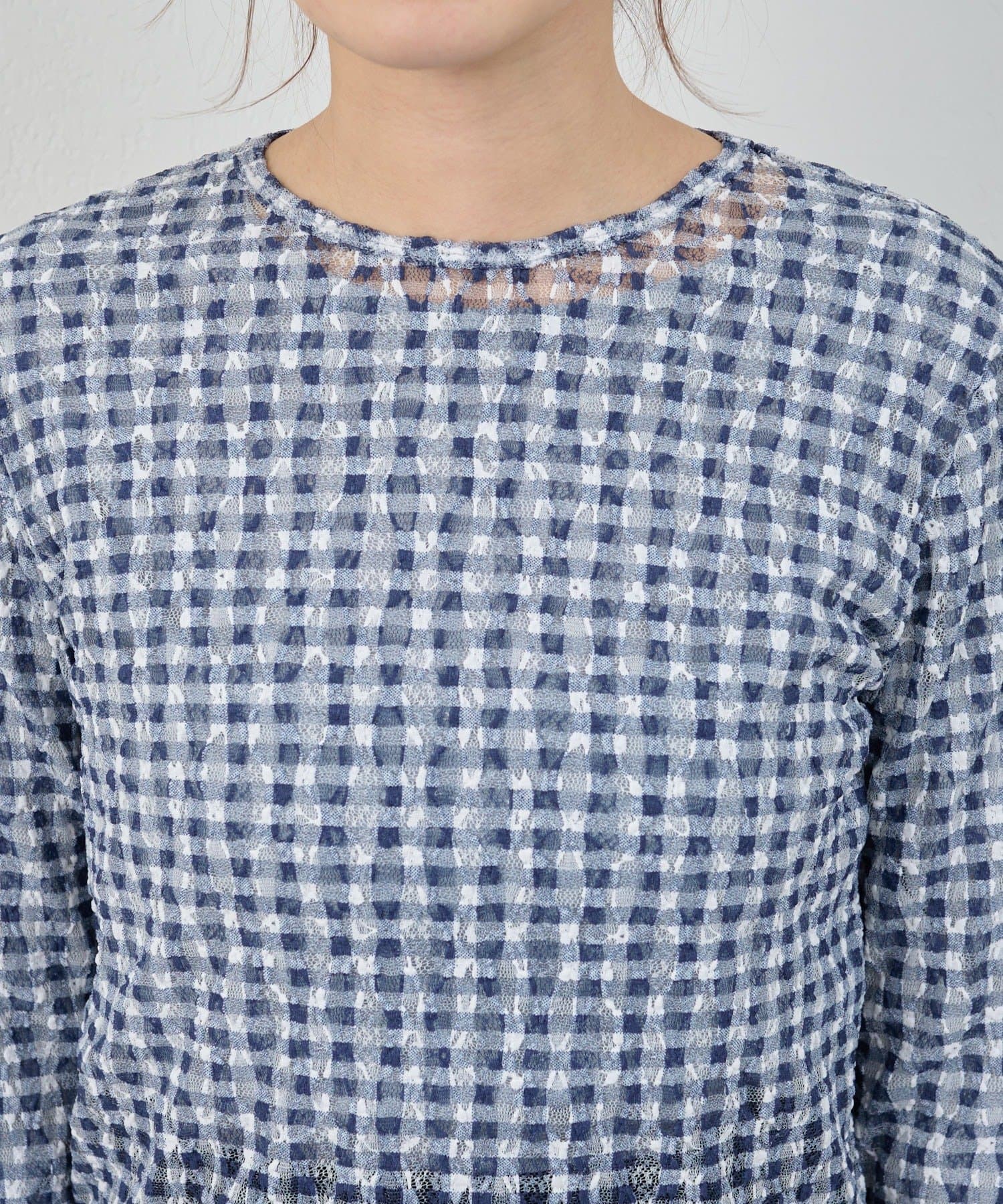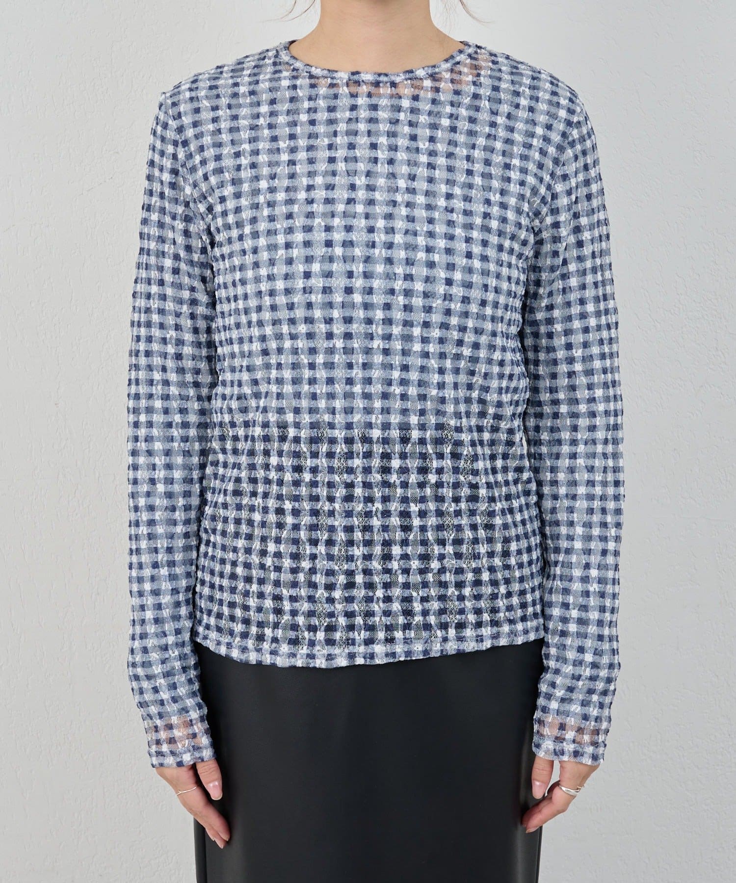 シアー感のある薄手素材にチェック柄をプリントしたカットソー。