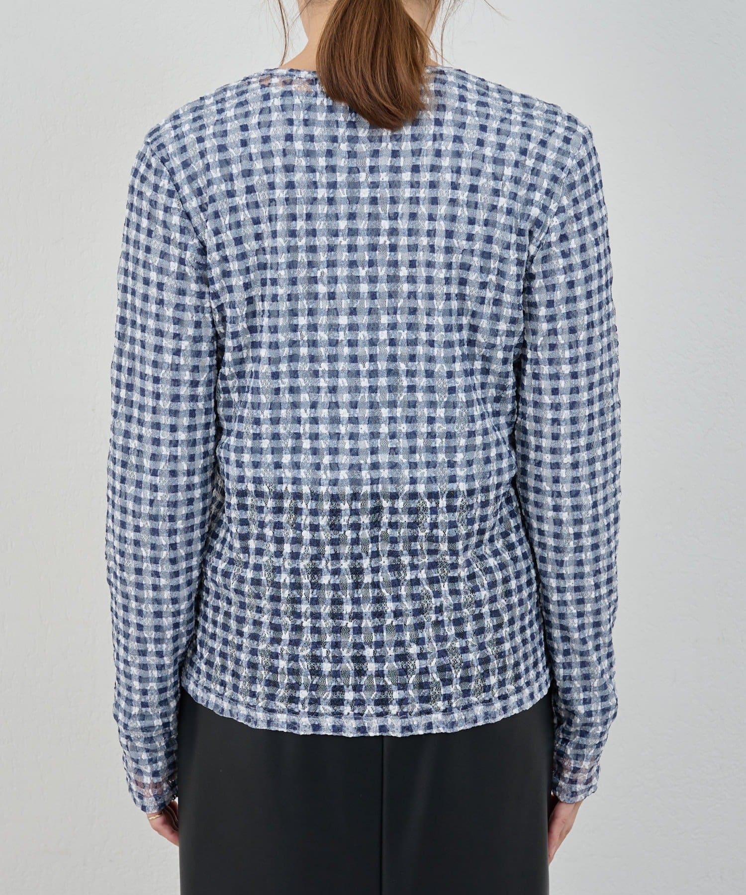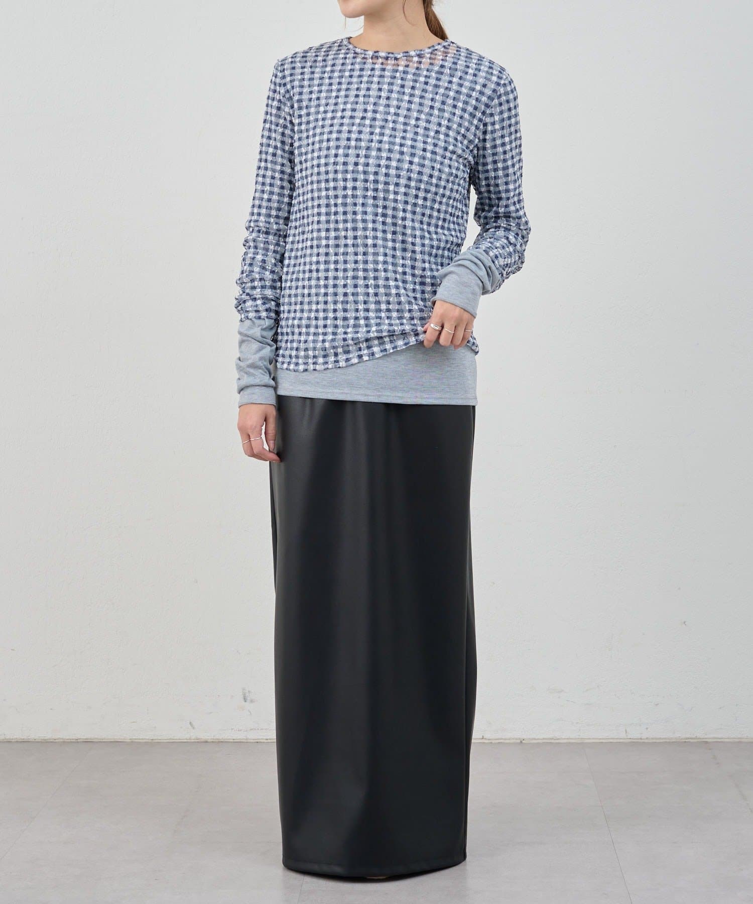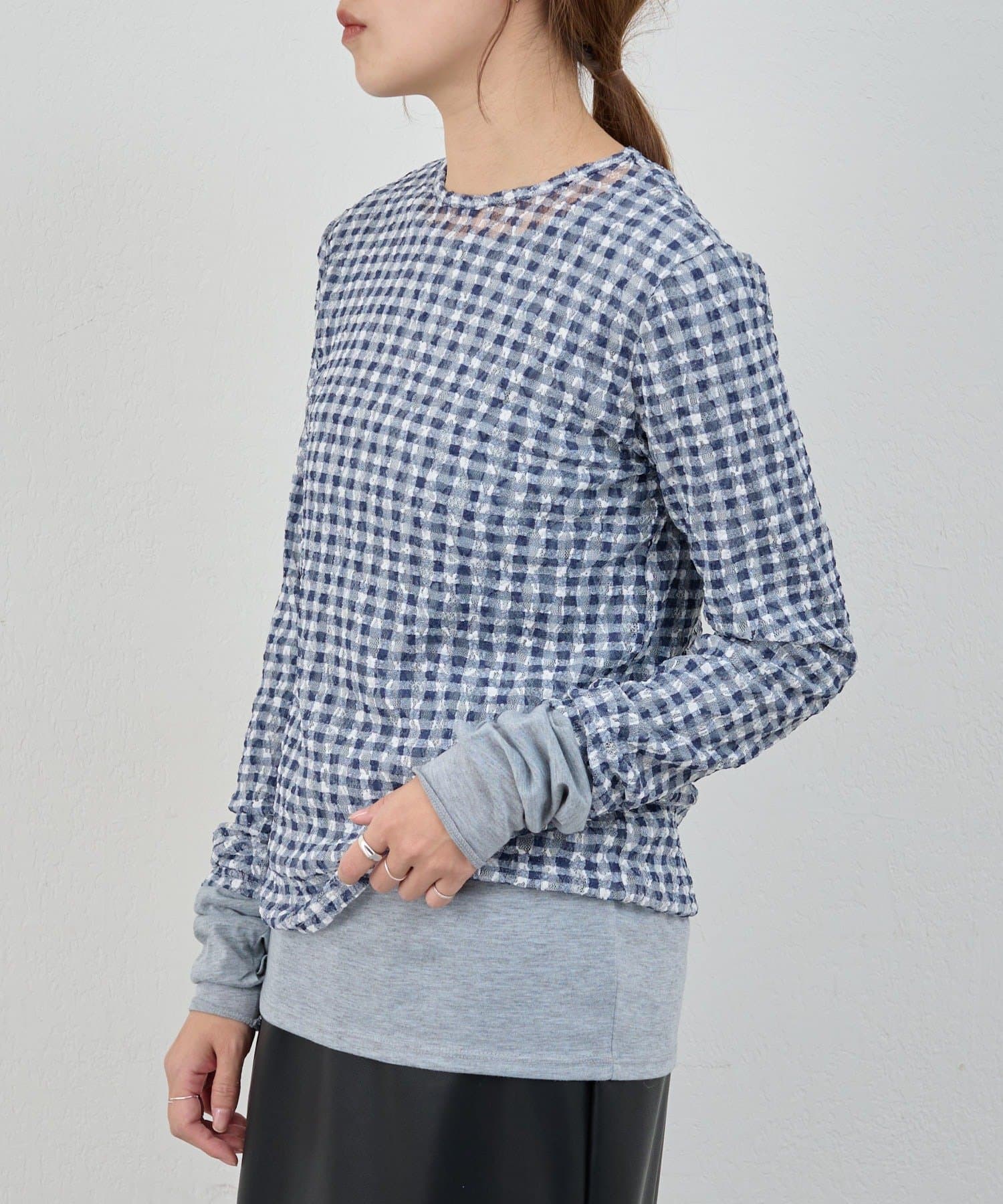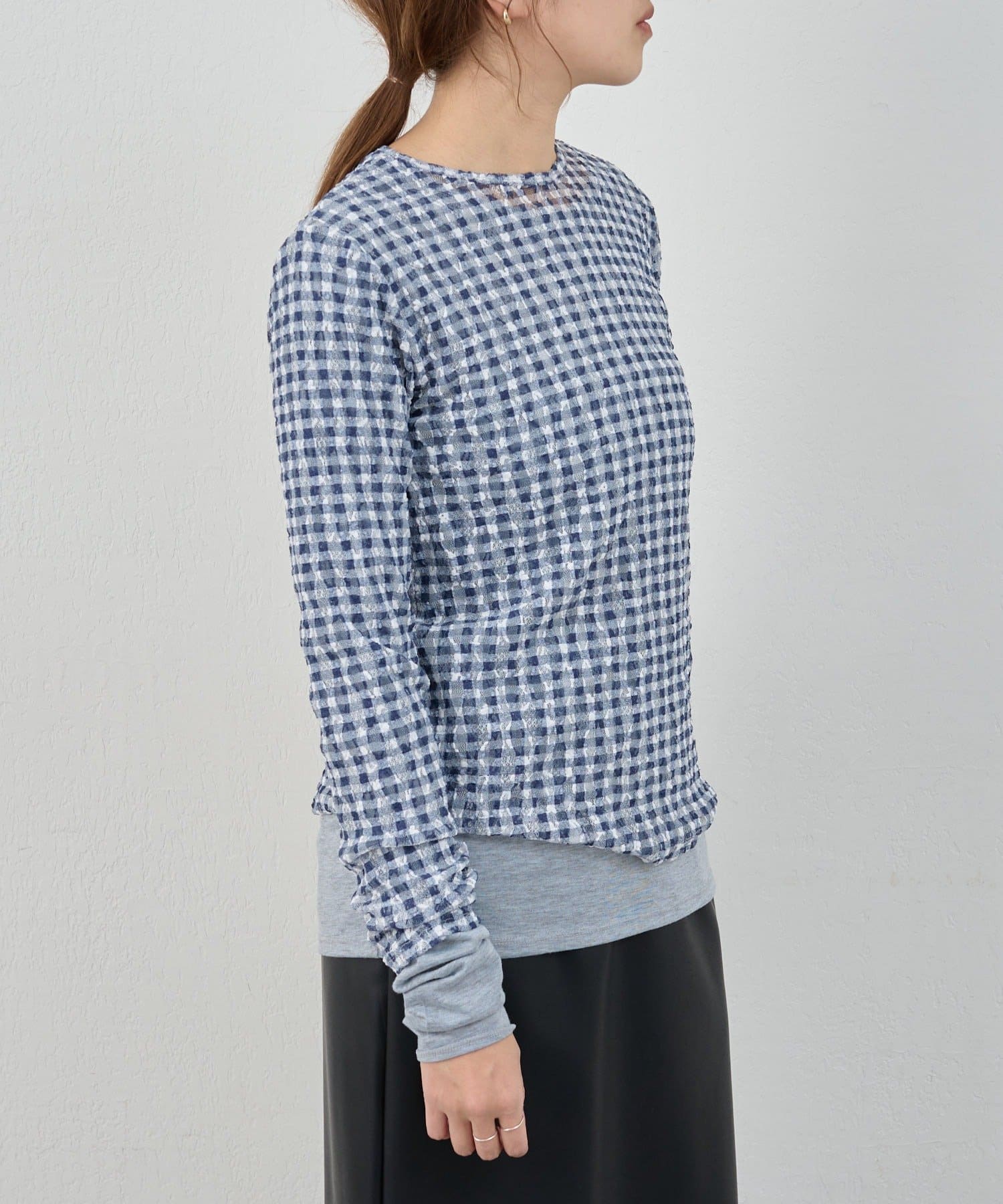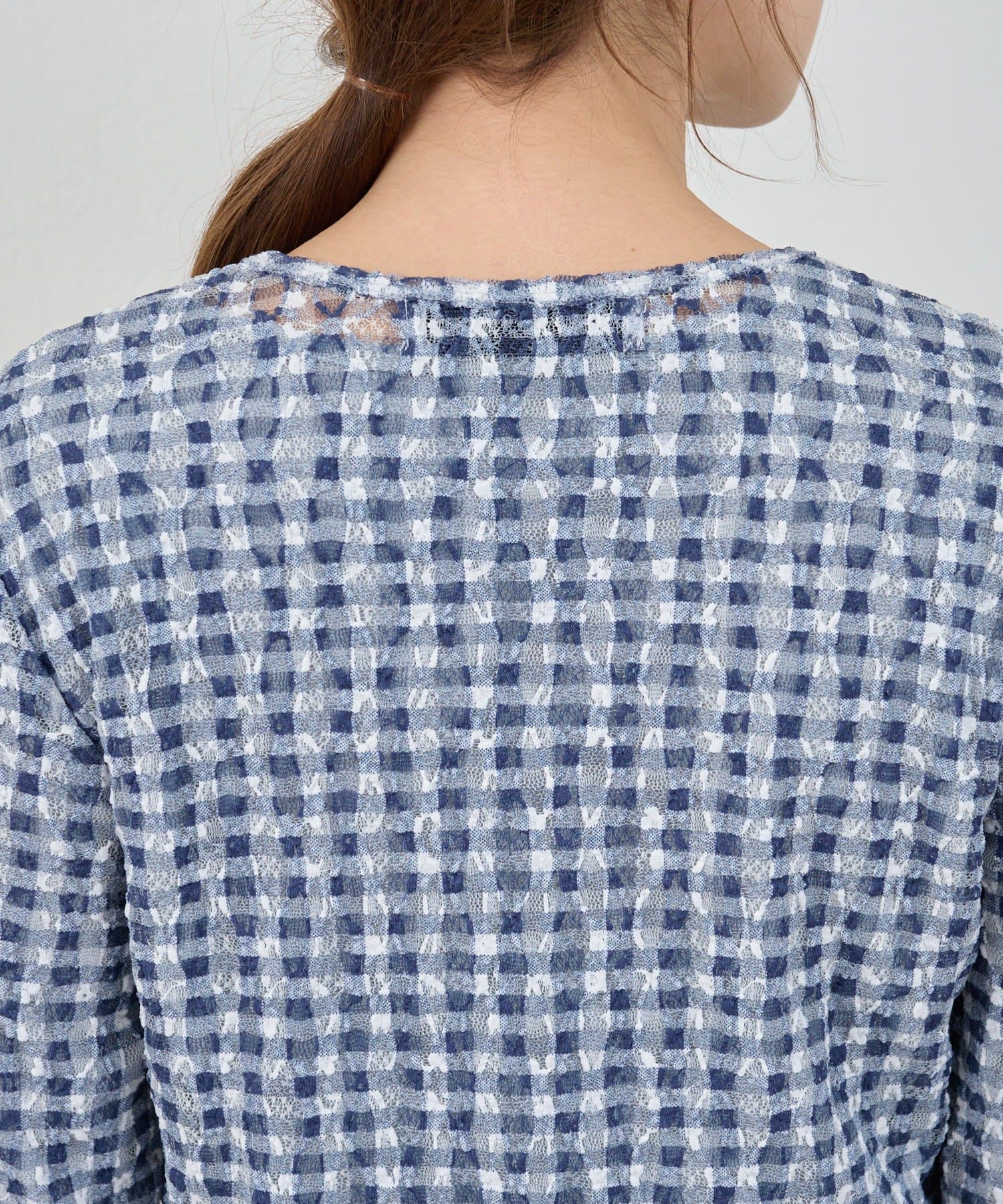シアー感のある薄手素材にチェック柄をプリントしたカットソー。