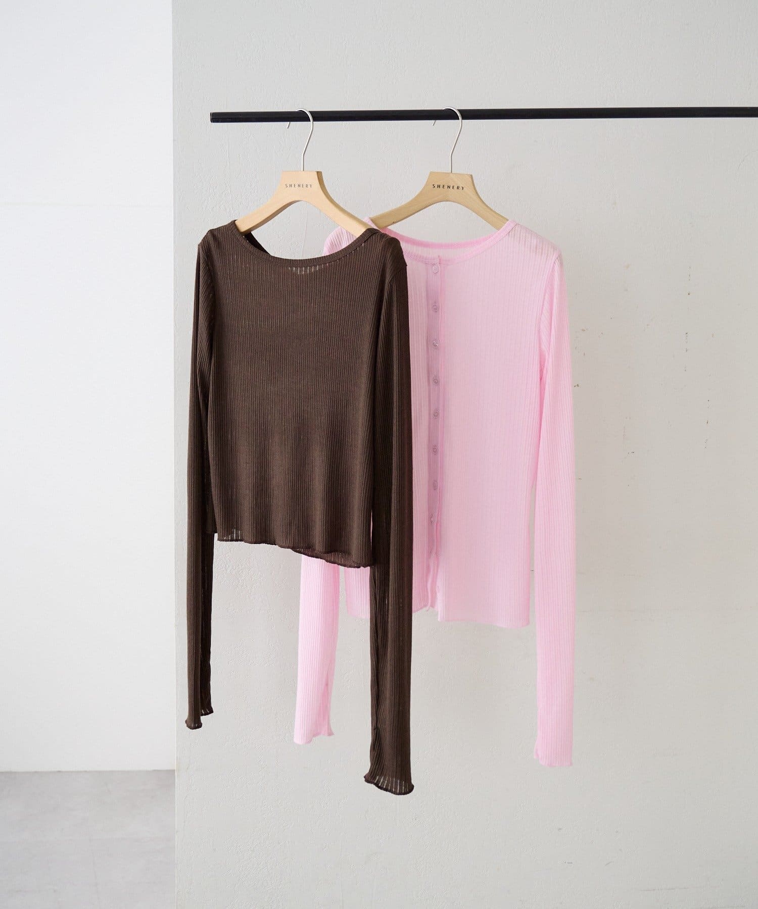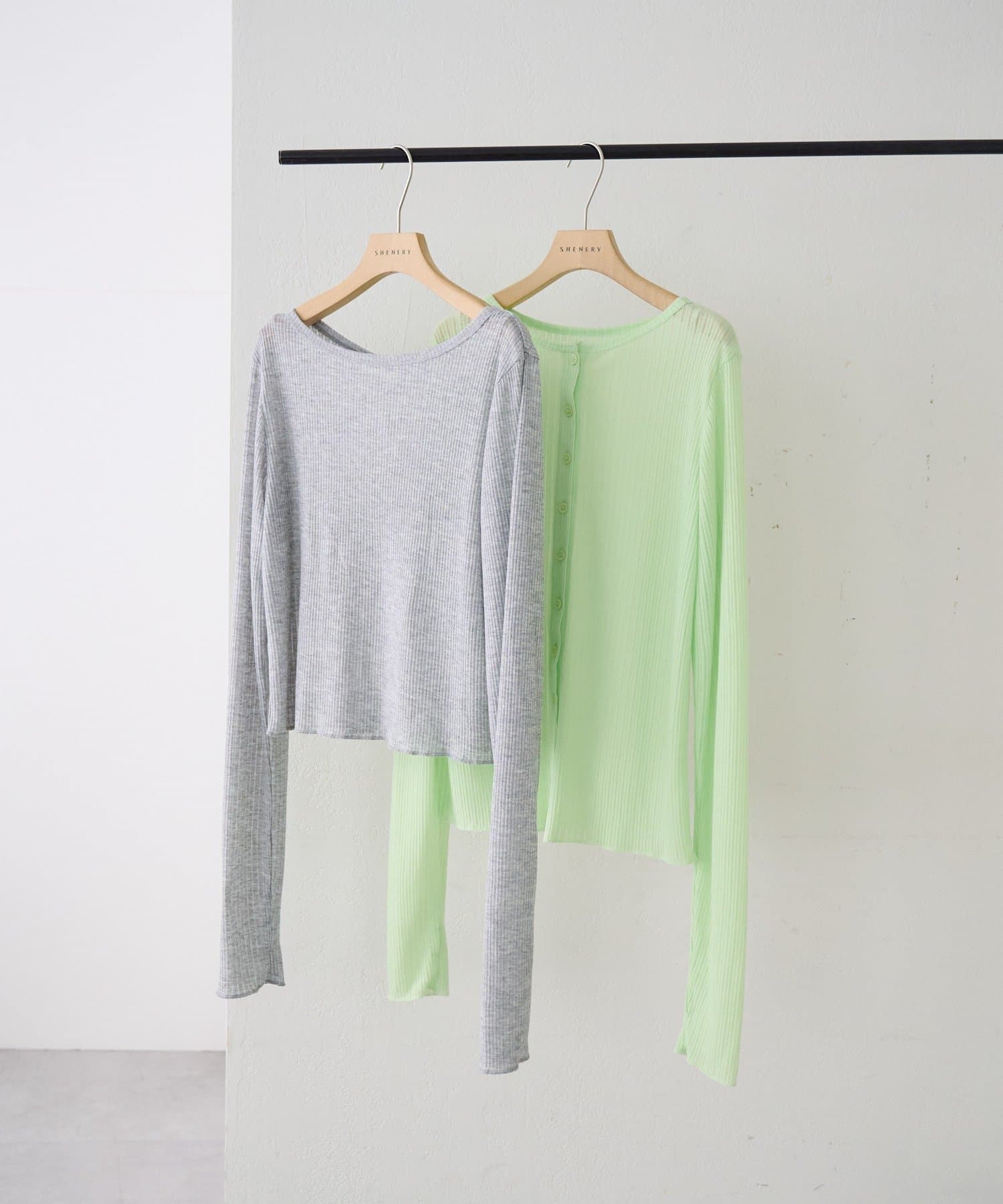 1枚はシンプルなクルーネックと浅いVネックの2way仕様。もう1枚はボタン開きデザインで袖も着丈も少し長めなので、重ねると裾や袖の配色を楽しんでいただけます。当然どちらも単品使いが可能。今年はレースもののインナーと重ねたり、タンクトップやビスチェ等を上に重ねるのもおすすめです。