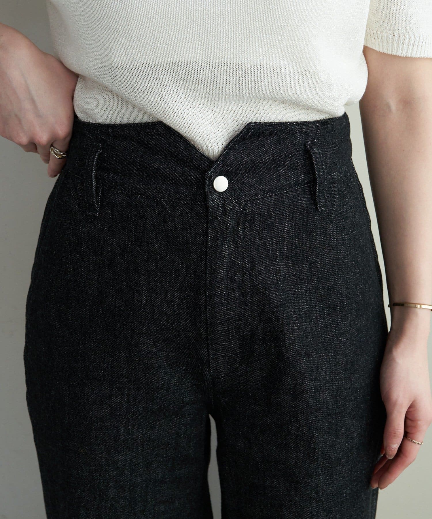 使用したのは11オンスのやや薄手ながらもしっかりとコシのある日本のデニム生地。柔軟加工を施しているので体に馴染んでいくのが早く、数回履いていただくだけでもクタッとした程よいこなれ感が出るのが特徴です。デニム特有の窮屈感や堅苦しさがなく、リラックスして着用できるのが評判のイージーデニムです。ウエストにはカーブベルトを付けており、ウエストがすっきりとして見える上に、締め付けも軽減されてより履きやすく感じていただけます。