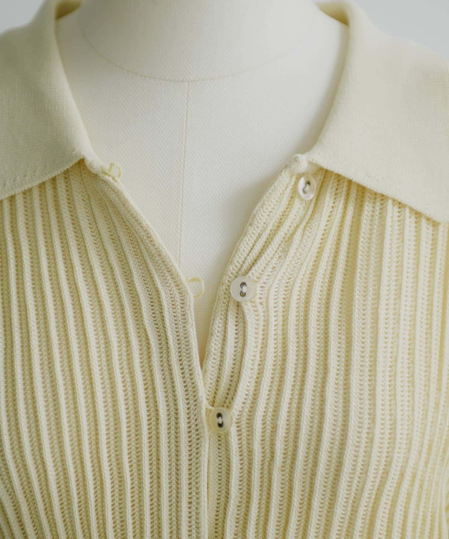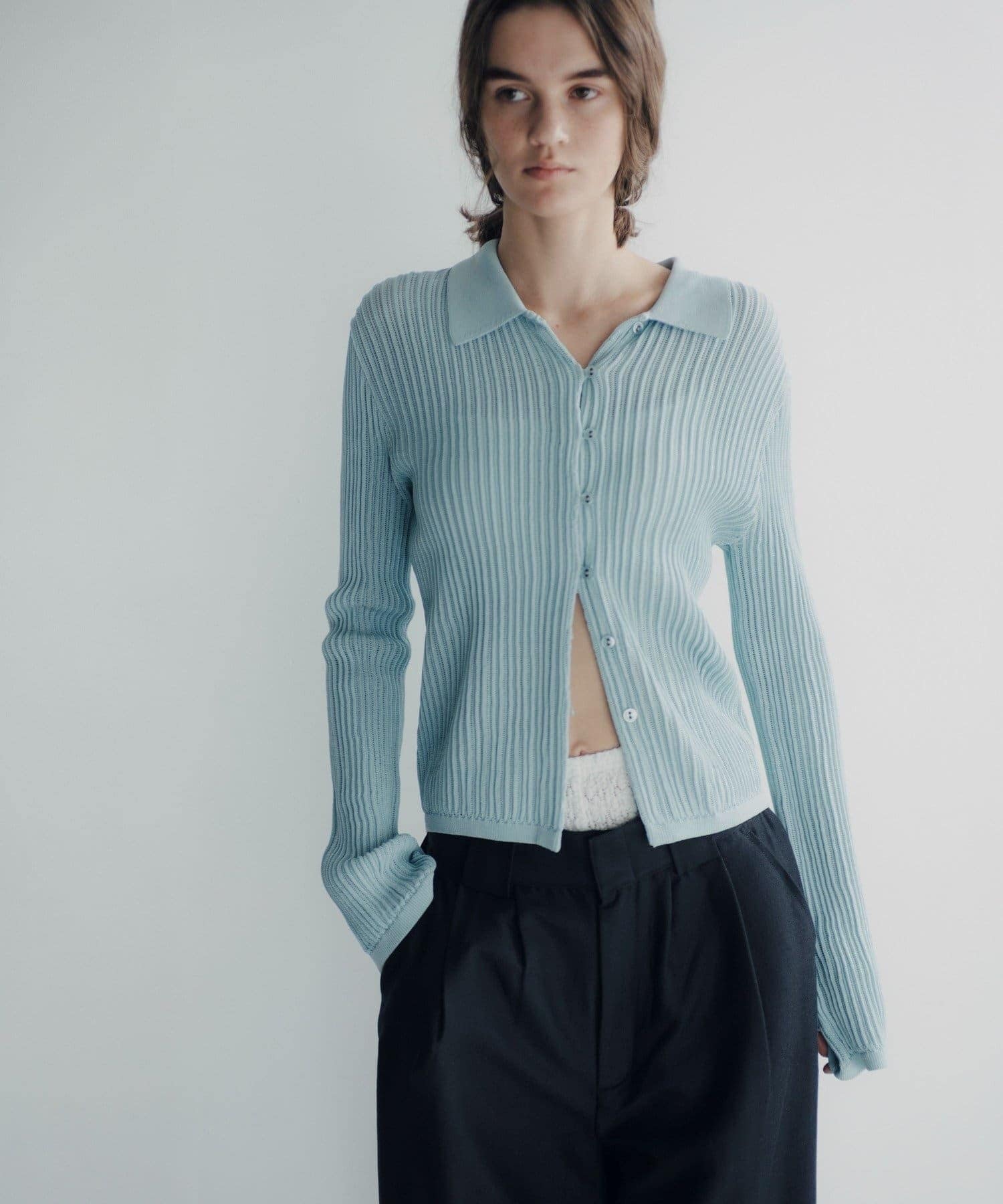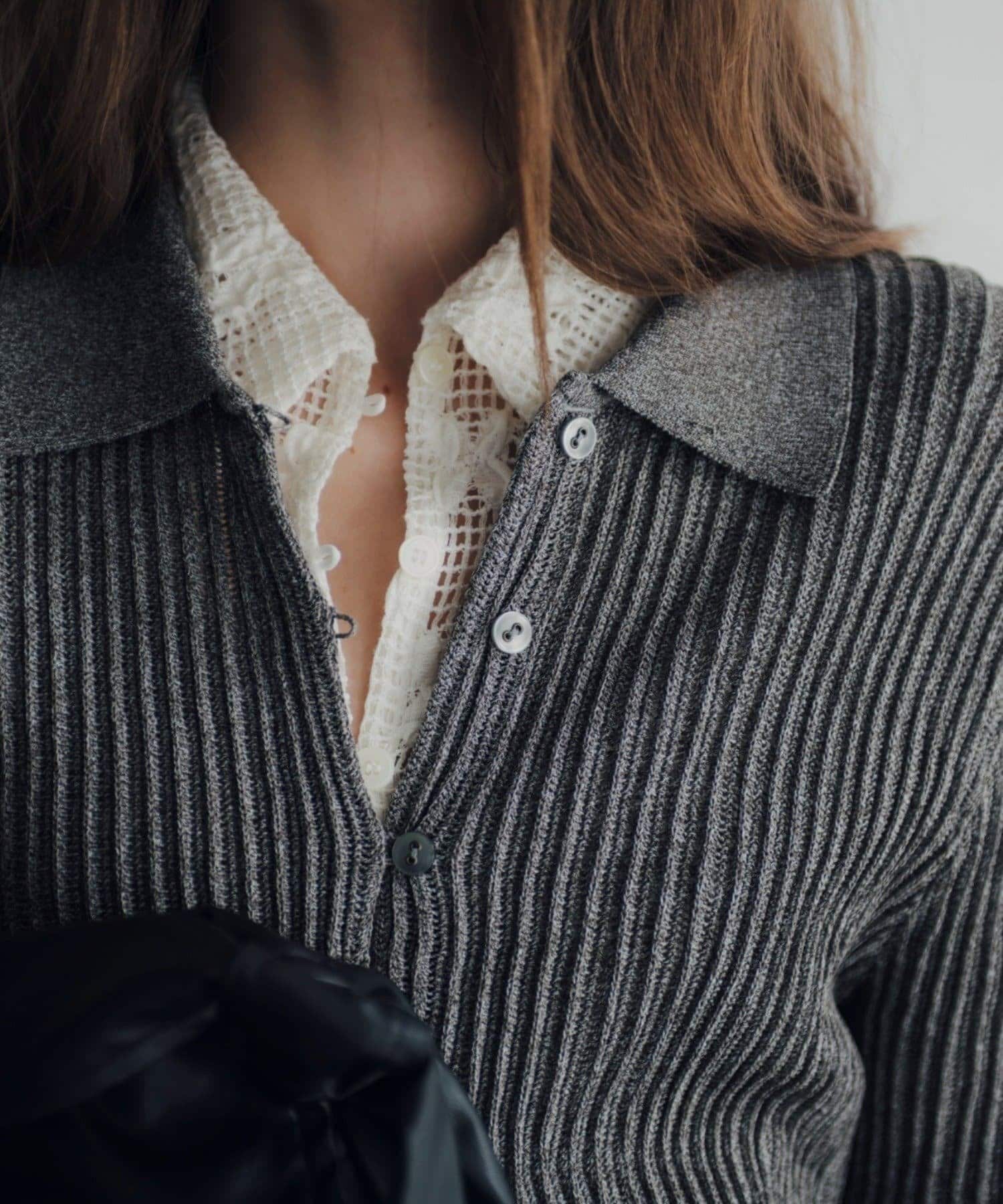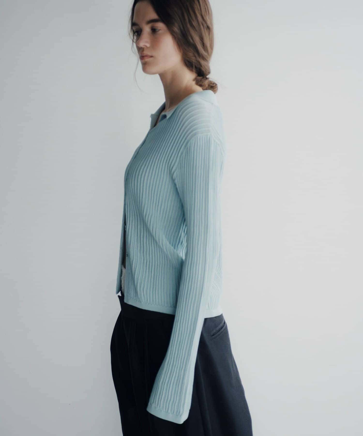 程良い透け感とシャリ味のある風合いが特徴の襟付きサマーニットカーディガン。凹凸感のあるリブの編地で、ボディラインが綺麗に補正される安心感のある1着です。通気性が良く、肌離れも良いので夏でも暑苦しくなく着用いただけます。特に襟物が気分な今シーズンは、1枚着はもちろん、ジャケットの中に着用したりインナーにレースものを重ねたり、さまざまなコーディネートで活躍する万能なアイテムです。