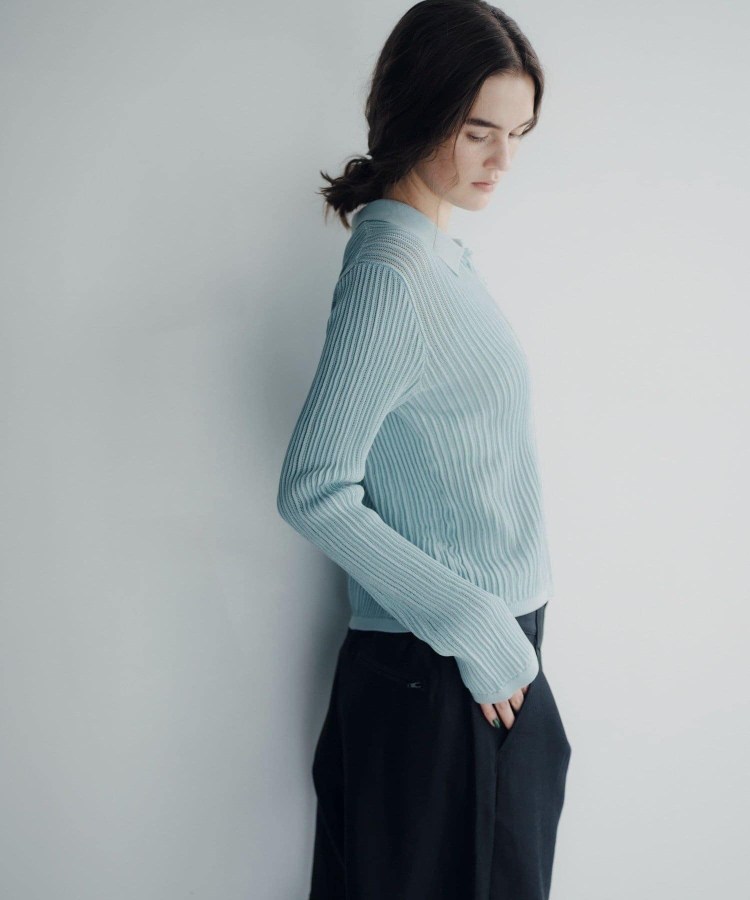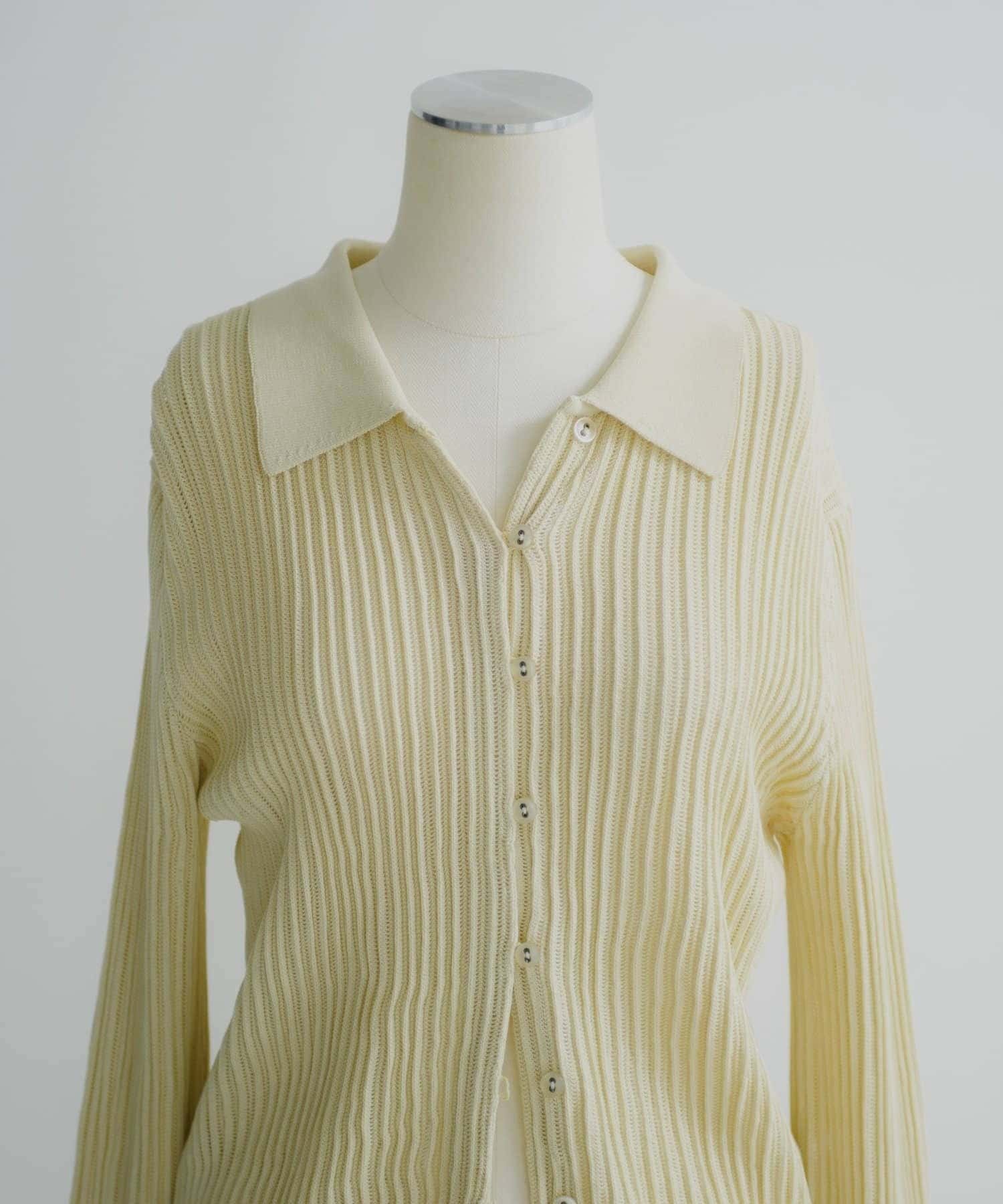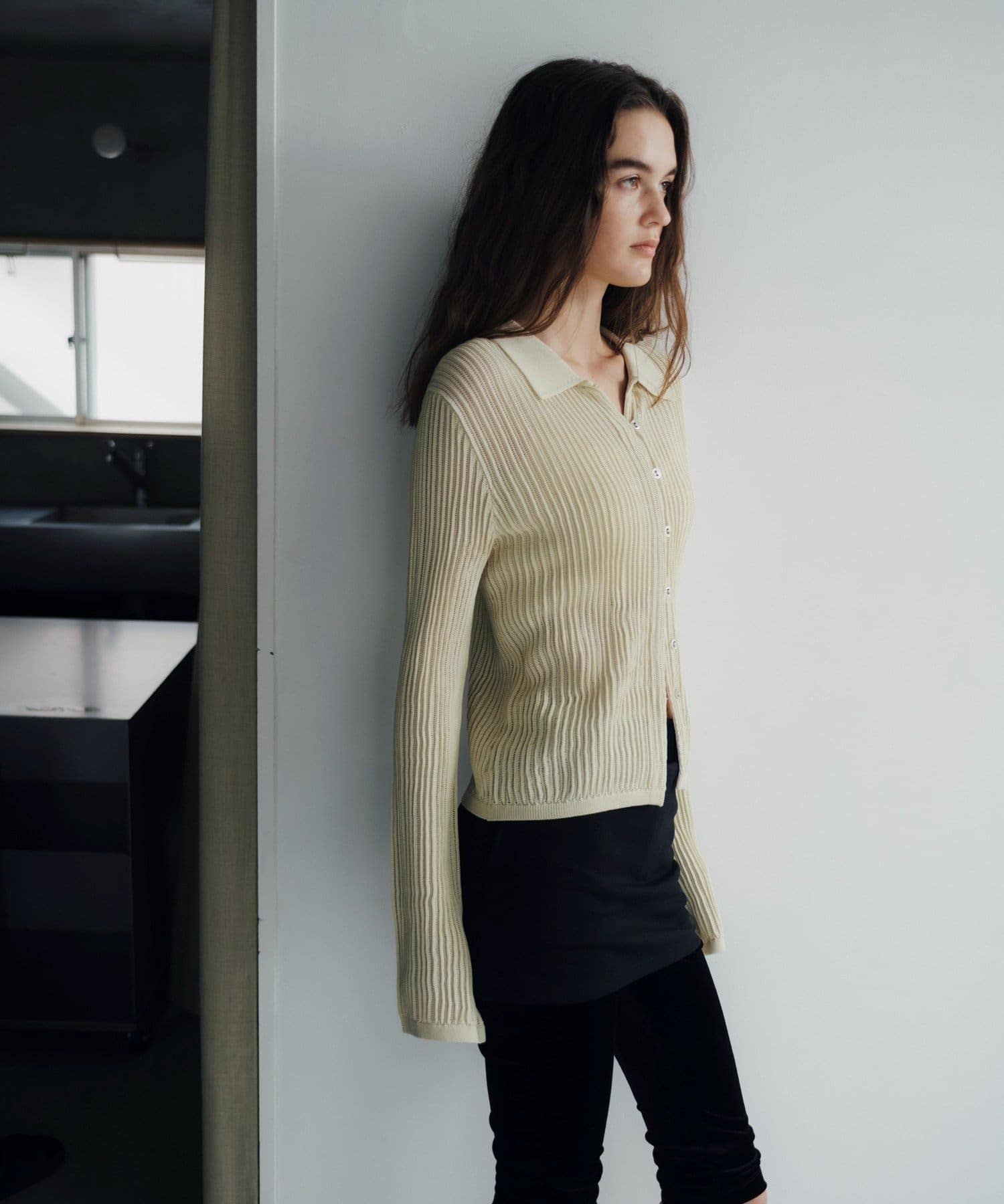 程良い透け感とシャリ味のある風合いが特徴の襟付きサマーニットカーディガン。凹凸感のあるリブの編地で、ボディラインが綺麗に補正される安心感のある1着です。通気性が良く、肌離れも良いので夏でも暑苦しくなく着用いただけます。特に襟物が気分な今シーズンは、1枚着はもちろん、ジャケットの中に着用したりインナーにレースものを重ねたり、さまざまなコーディネートで活躍する万能なアイテムです。